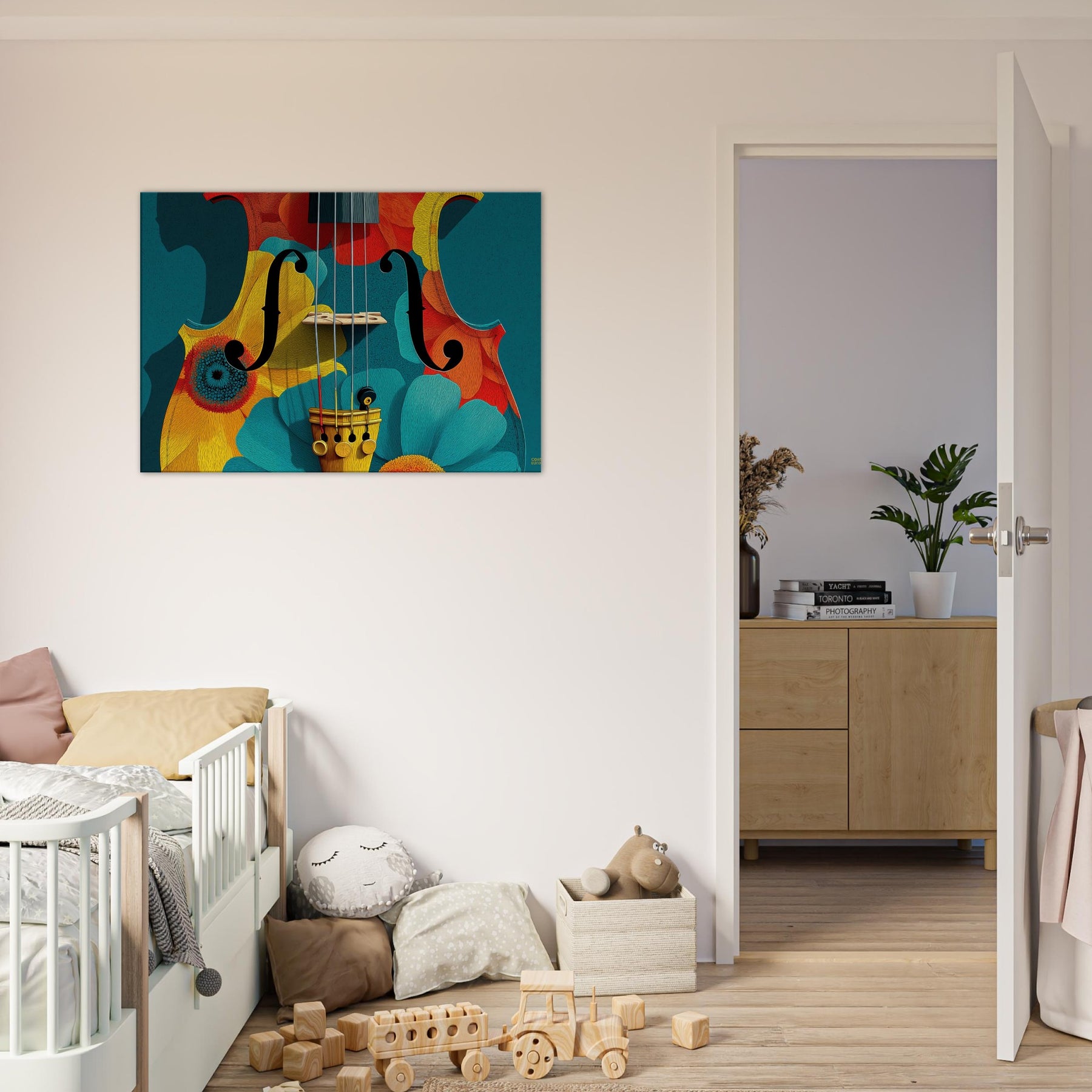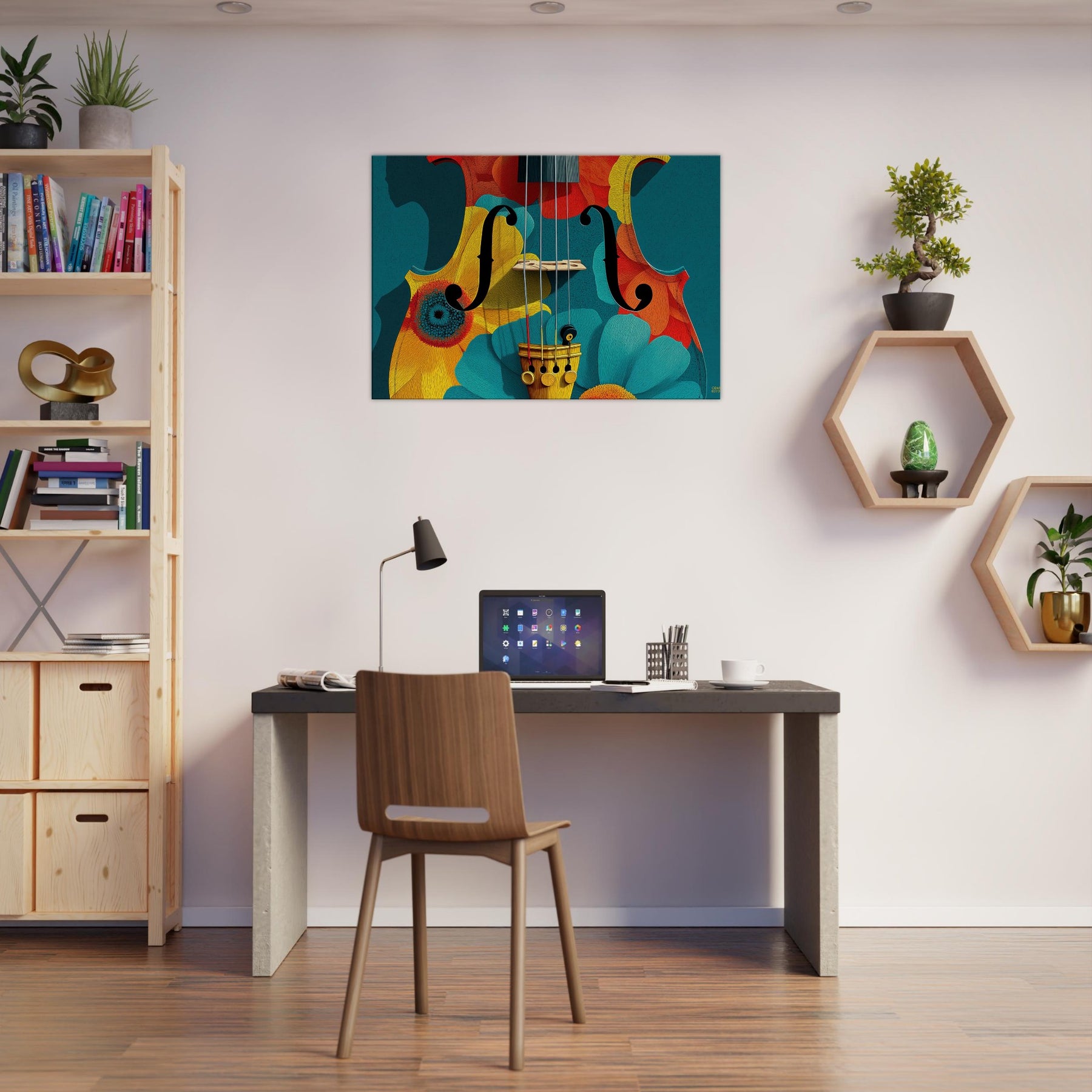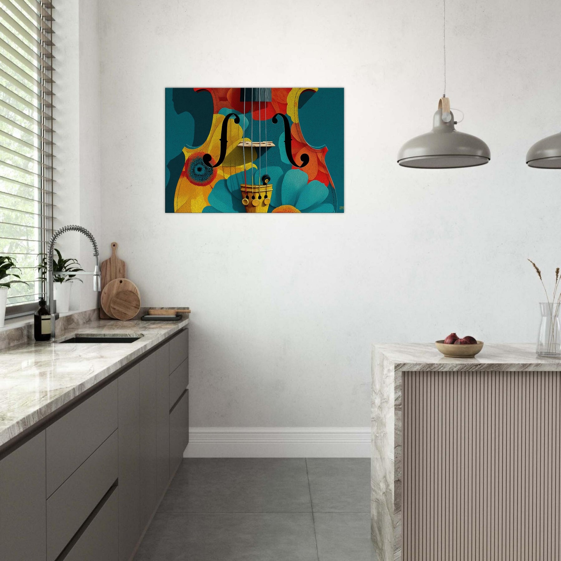 An abstract celebration of the violin, this wall art blends vibrant petals and bold lines to evoke music's pulse in a living space. The centerpiece violin silhouette anchors a visual symphony of color teal, gold, orange as if sound spills from the strings. It suggests quiet mornings, candlelit evenings, and conversations that drift like melody. Hang it in a bright living room to invite warmth, movement, and a touch of refined whimsy.