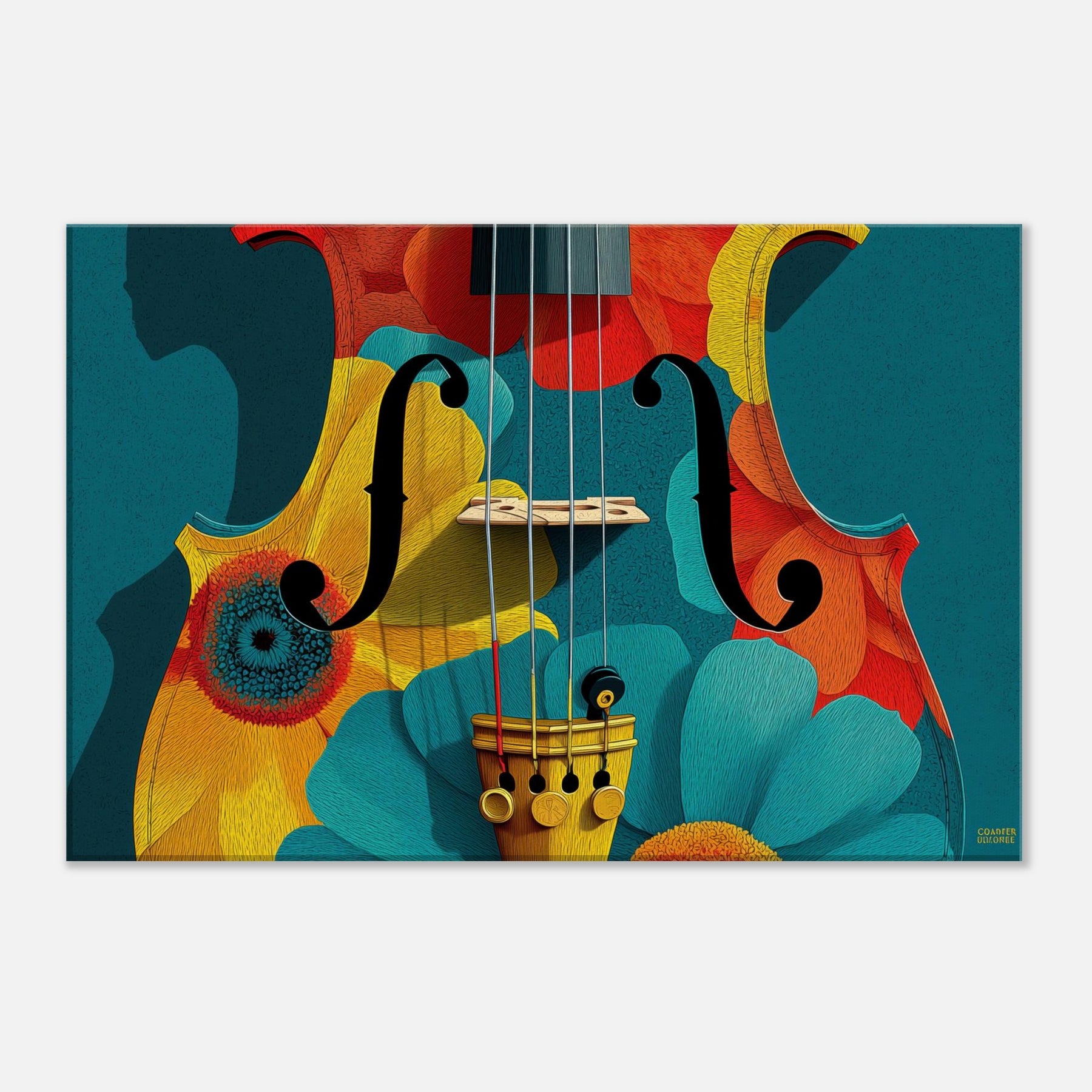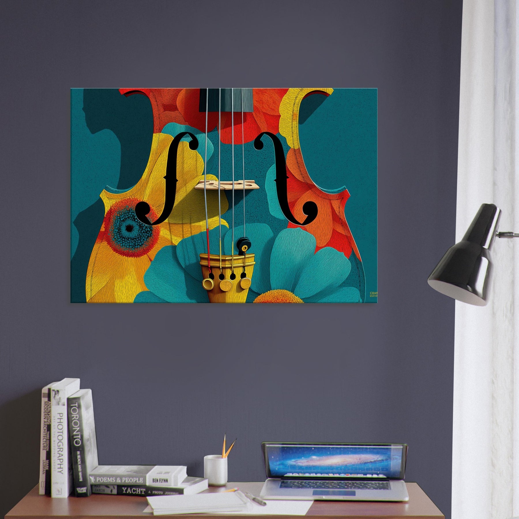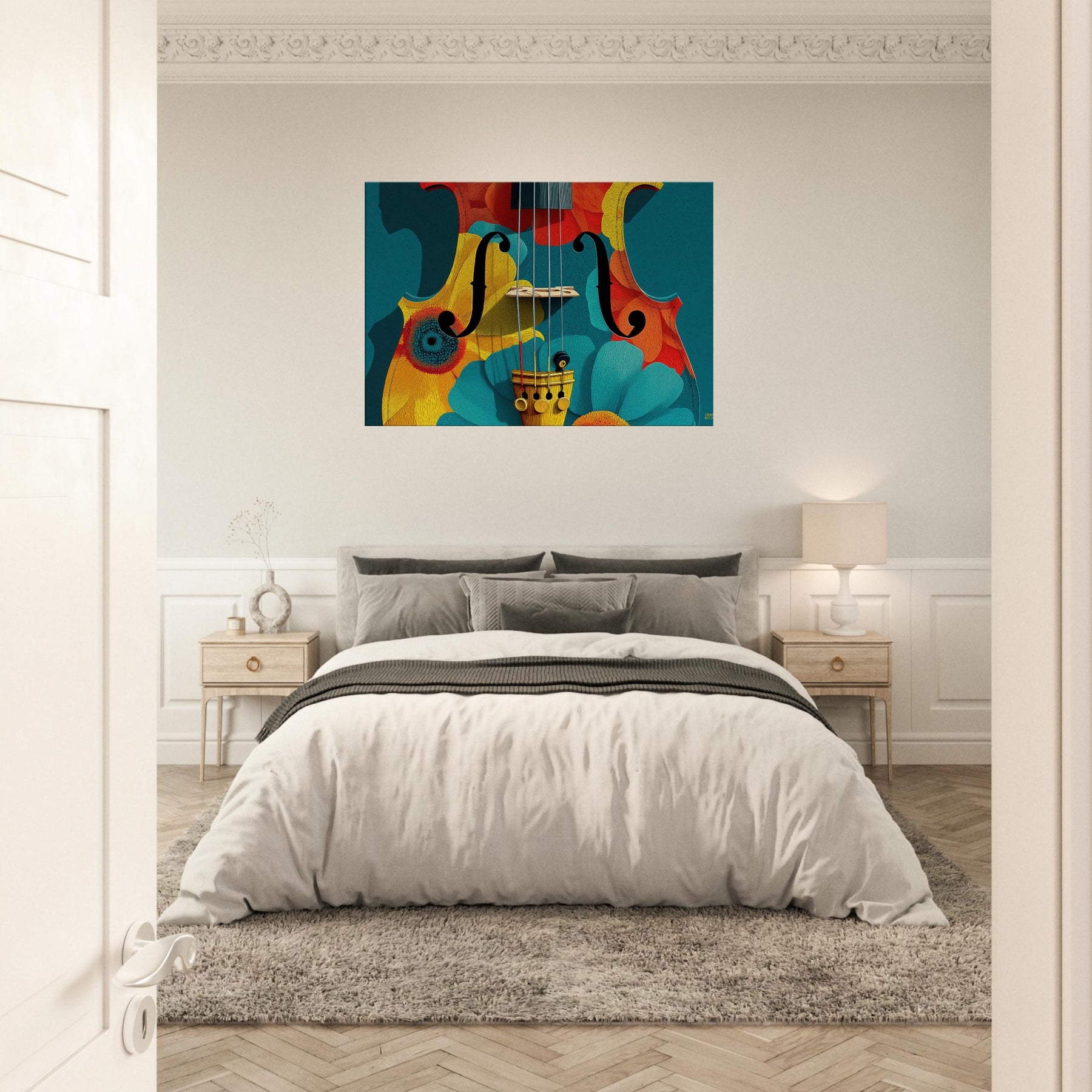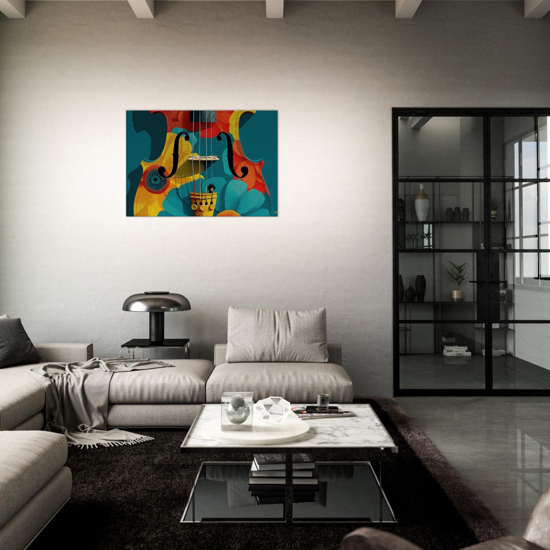 An abstract celebration of the violin, this wall art blends vibrant petals and bold lines to evoke music's pulse in a living space. The centerpiece violin silhouette anchors a visual symphony of color teal, gold, orange as if sound spills from the strings. It suggests quiet mornings, candlelit evenings, and conversations that drift like melody. Hang it in a bright living room to invite warmth, movement, and a touch of refined whimsy.