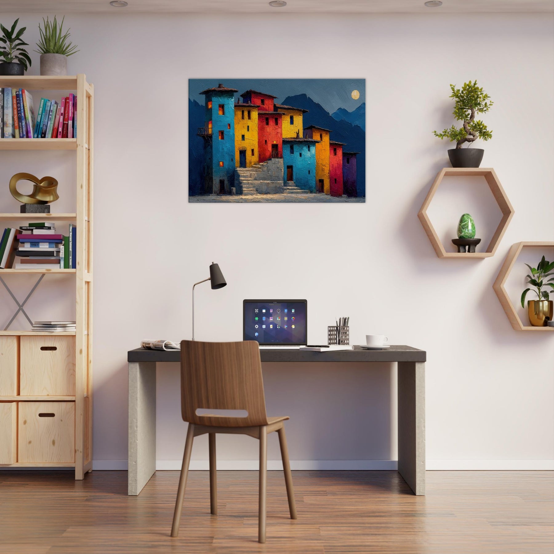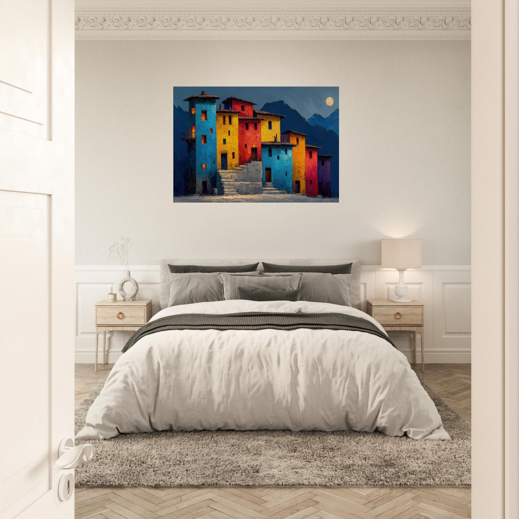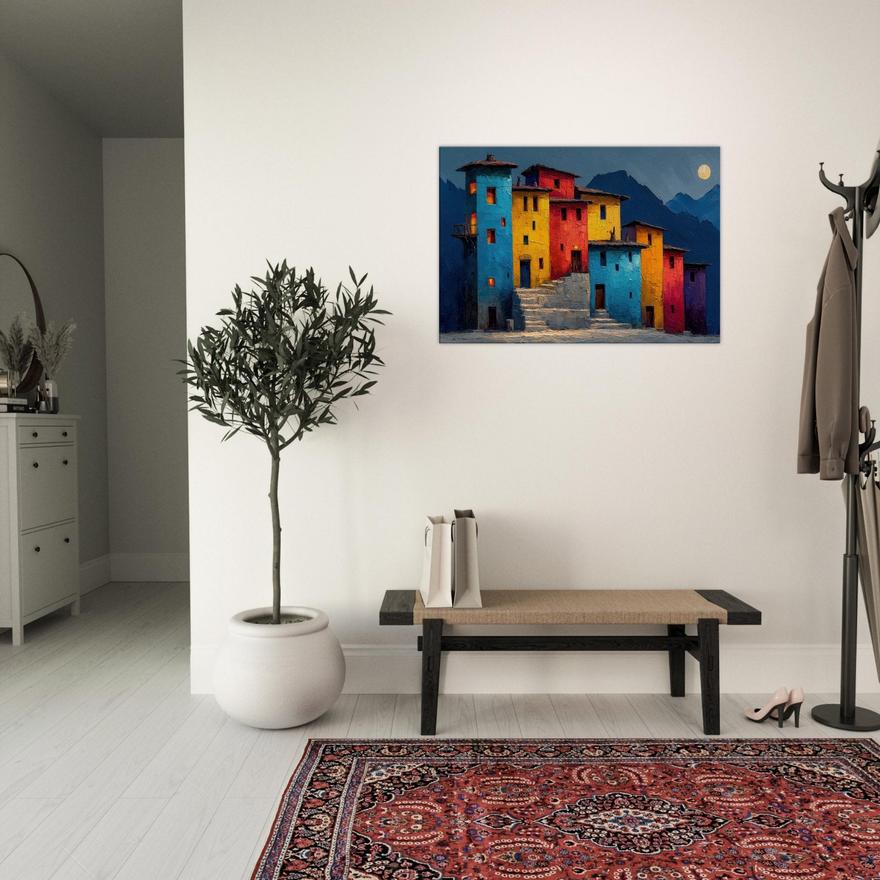 Let the Mountain Village rise in your living space as if waking from a dream: stacked turquoise, sunlit yellow, and ruby red houses along a stone stair. This abstract scene dissolves into texture and light, slipping warmth into evenings and a bold focal point by day. The atmosphere feels intimate yet expansive, like mountain air poured onto your walls. It invites conversation, sparks imagination, and gently elevates your decor with vibrant color, texture, and a sense of quiet adventure.