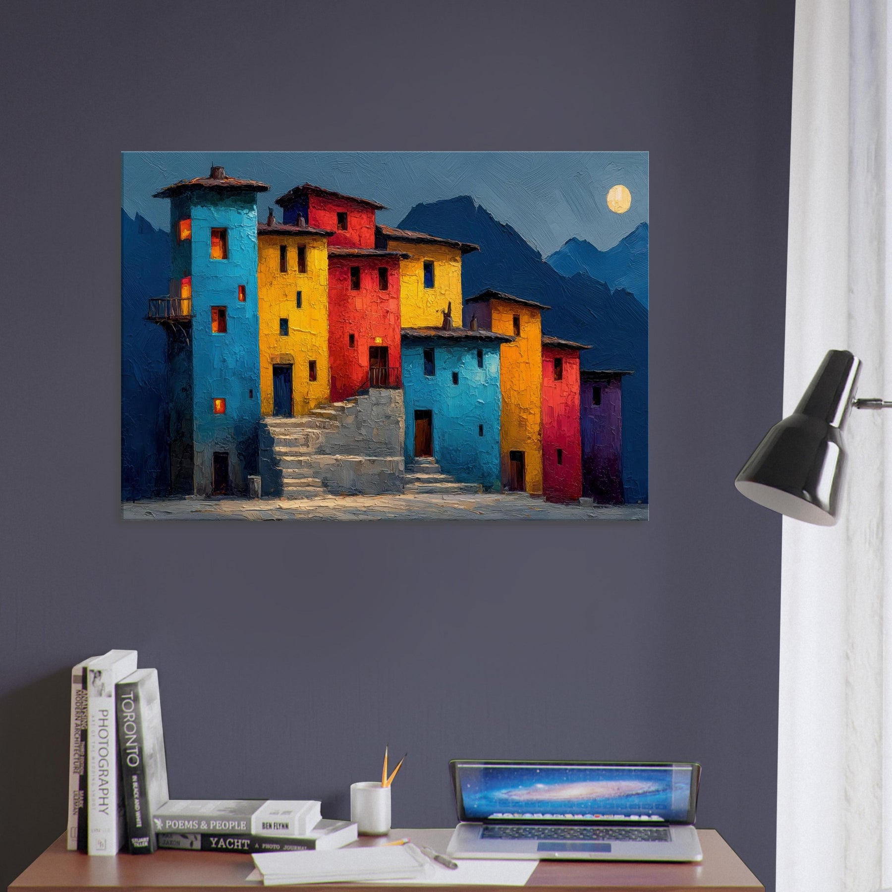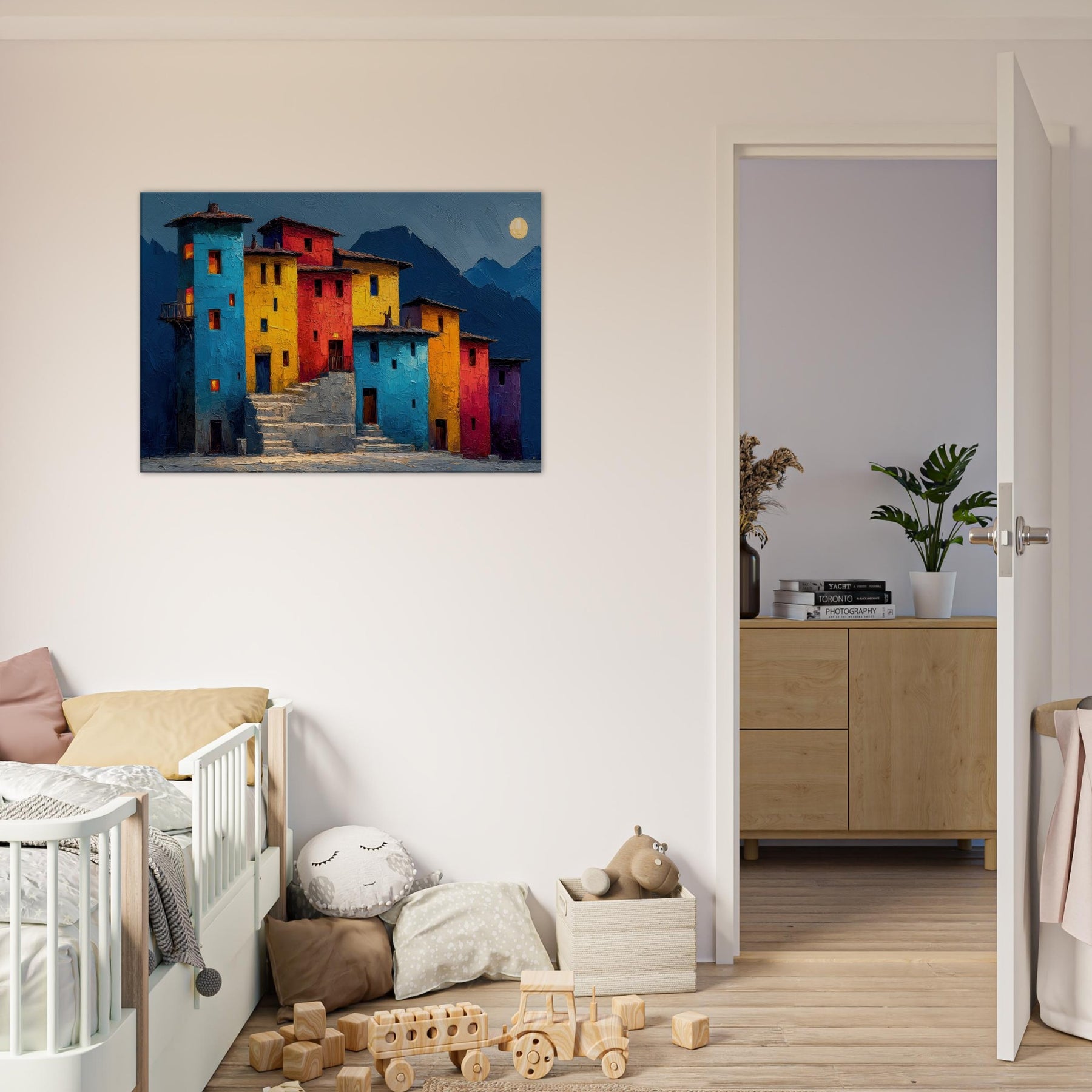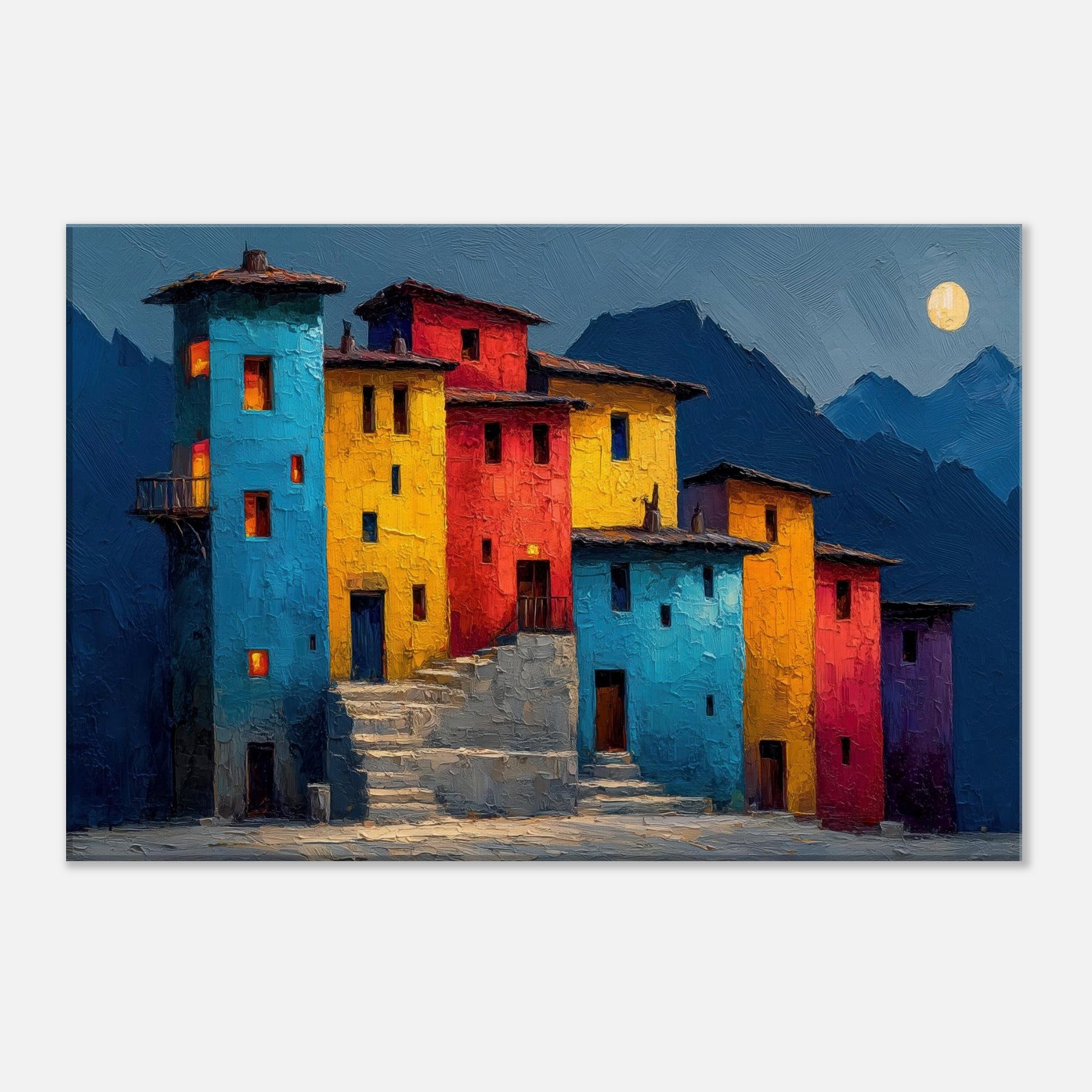 Let the Mountain Village rise in your living space as if waking from a dream: stacked turquoise, sunlit yellow, and ruby red houses along a stone stair. This abstract scene dissolves into texture and light, slipping warmth into evenings and a bold focal point by day. The atmosphere feels intimate yet expansive, like mountain air poured onto your walls. It invites conversation, sparks imagination, and gently elevates your decor with vibrant color, texture, and a sense of quiet adventure.