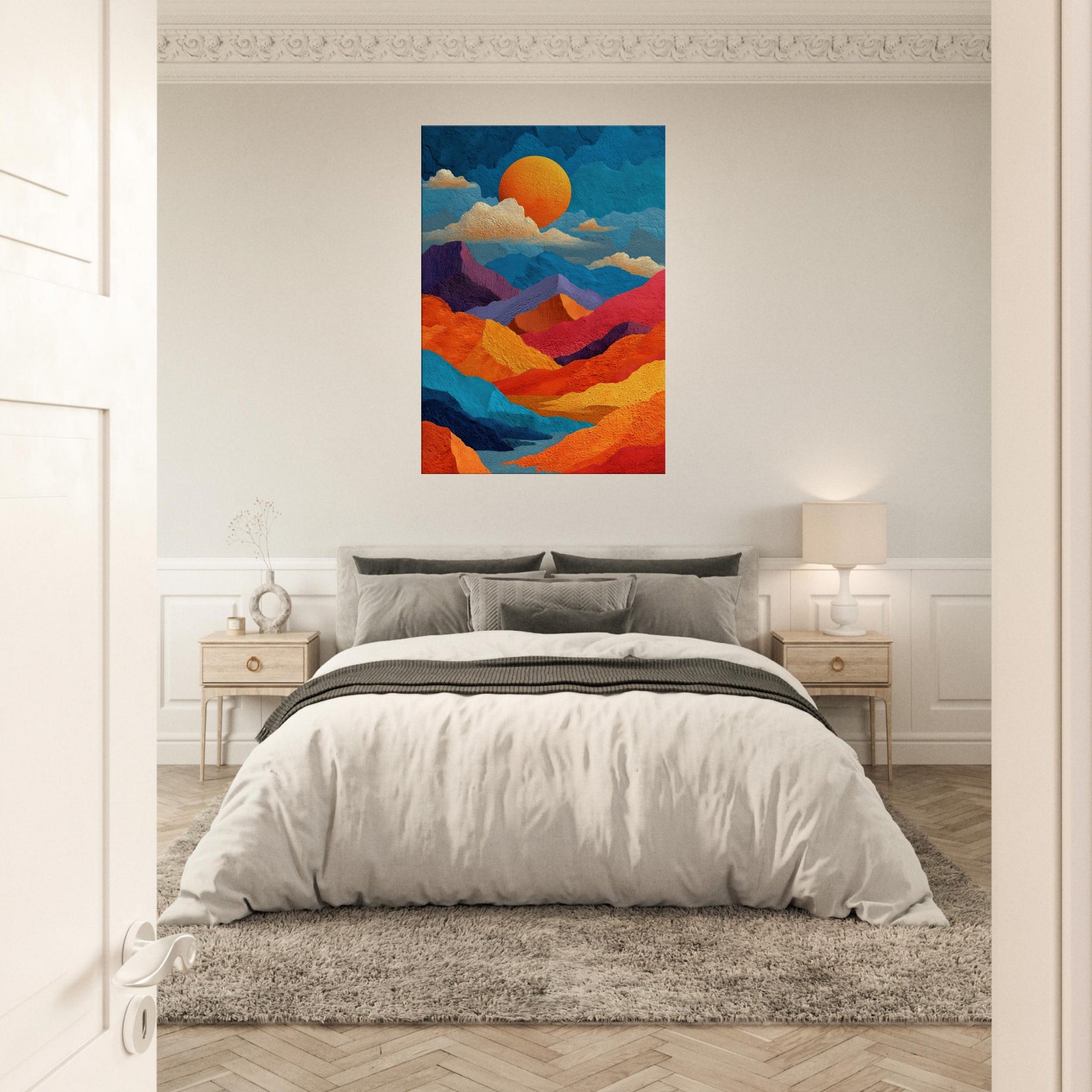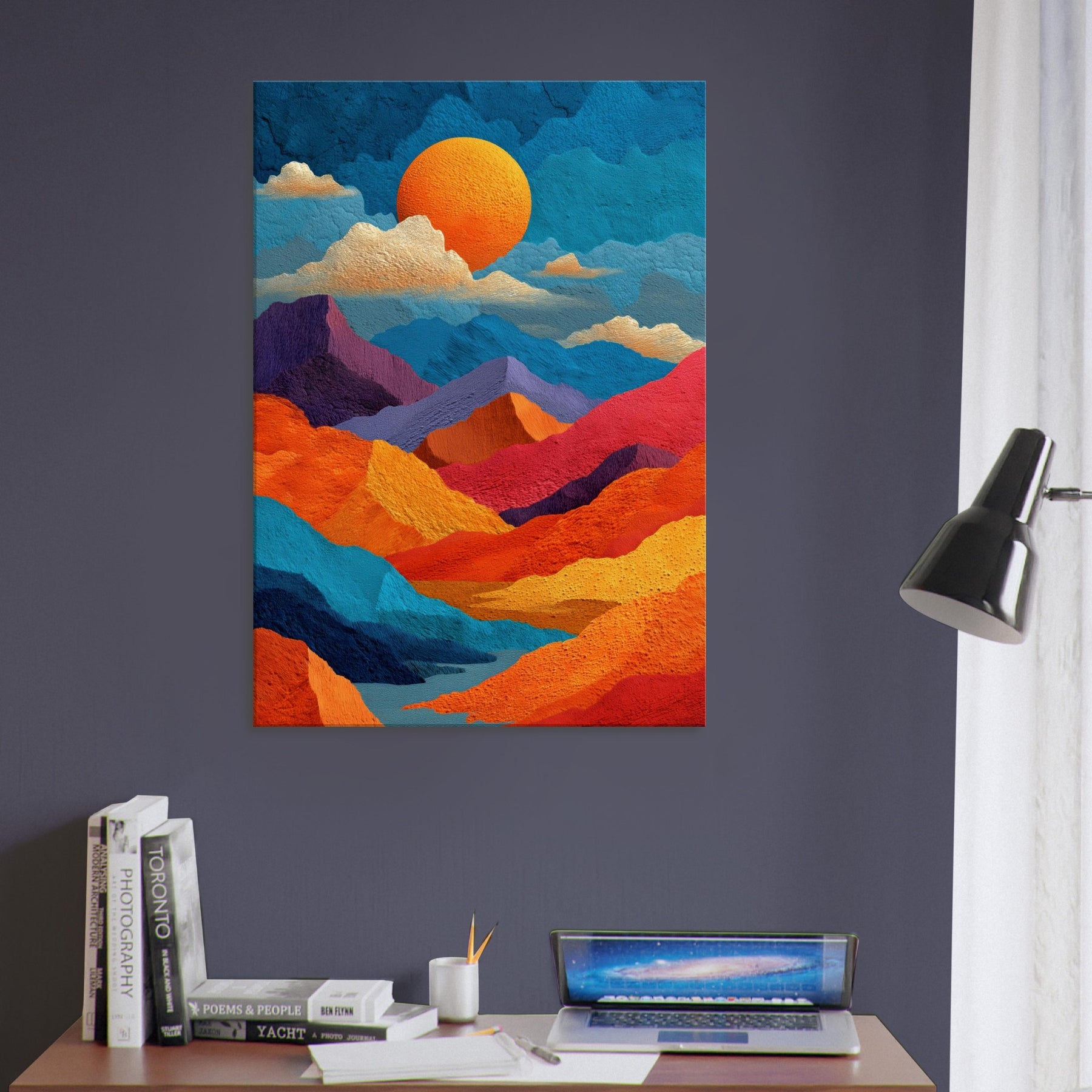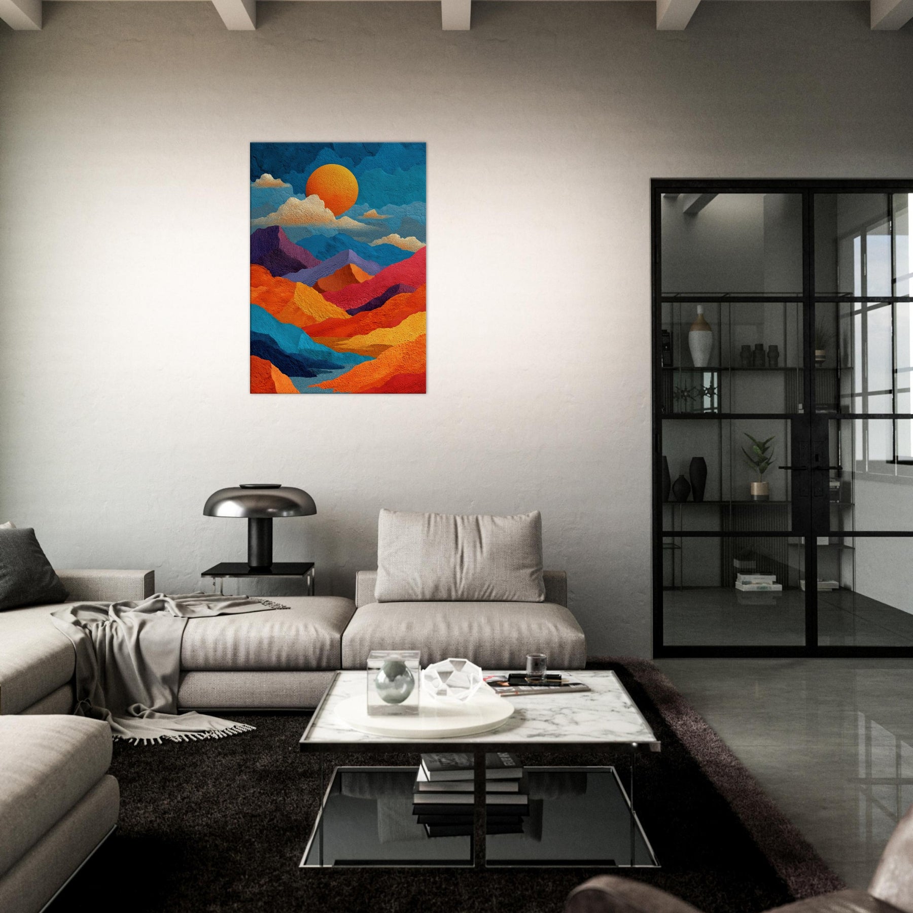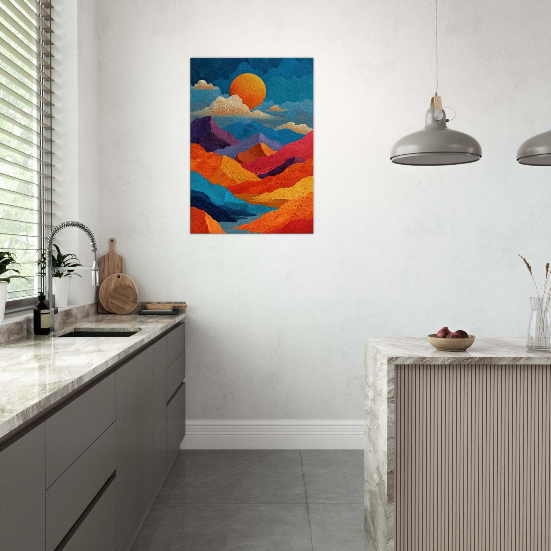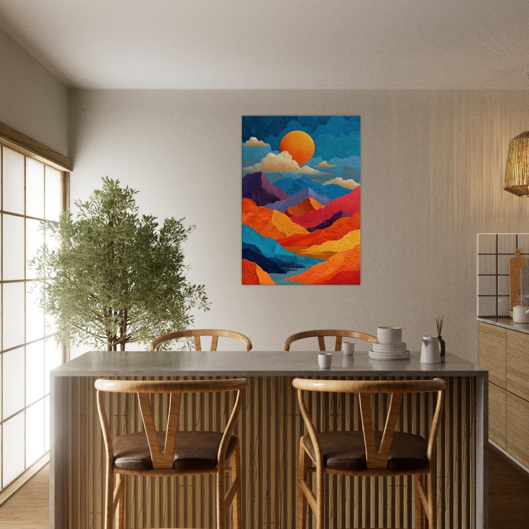Moon over Mountains (Minimal) rises in a quiet symphony of color and light. This abstract dissolves the horizon into molten layers of orange, pink, and electric blue, inviting a meditative breath into any room. The tactile texture suggests a hand formed terrain that glows with moon bright mystery, turning a living space into a sanctuary for reflection, conversation, and dreamlike evenings. Perfect above a sofa or in a hallway, it lends serenity and mystical depth without overpowering the space.