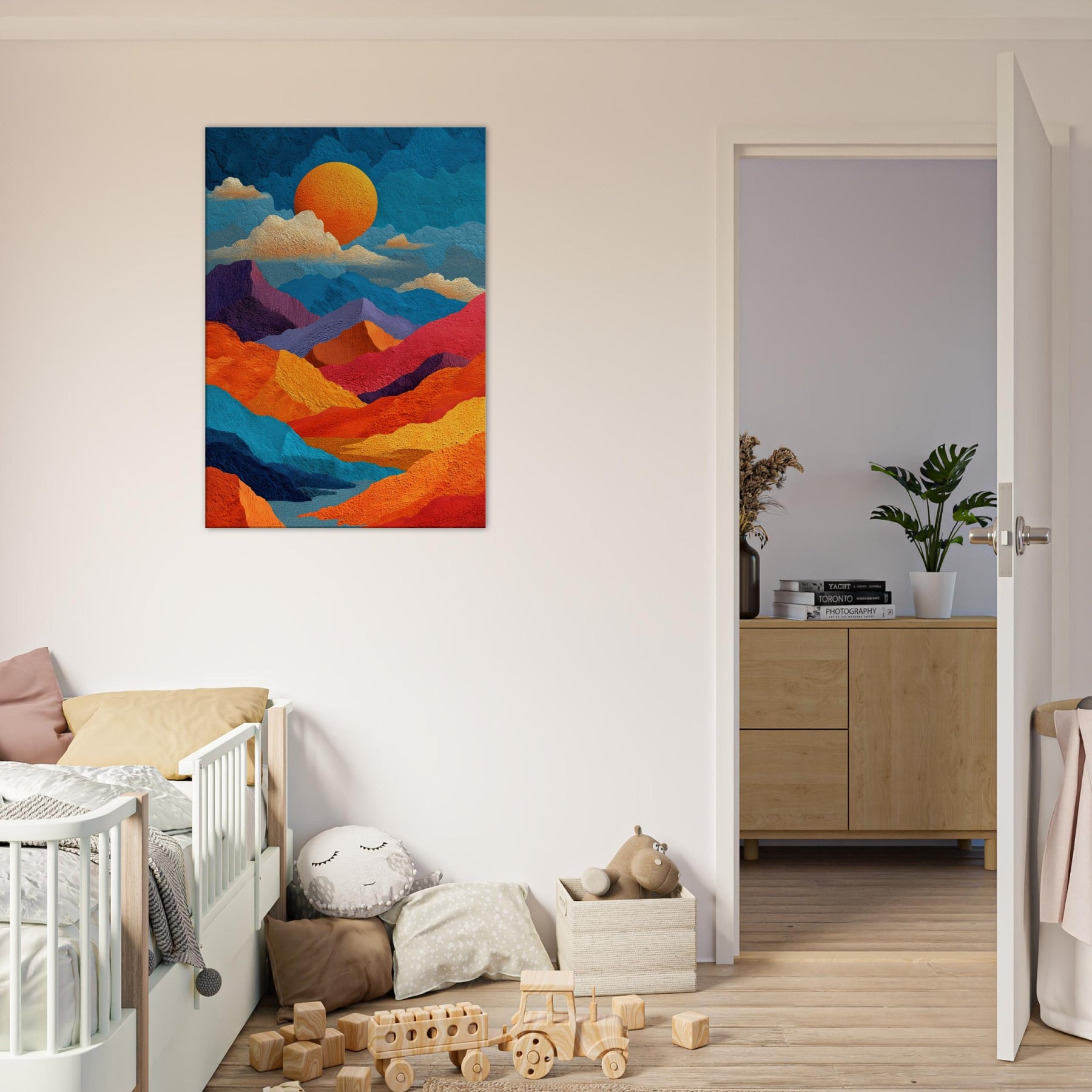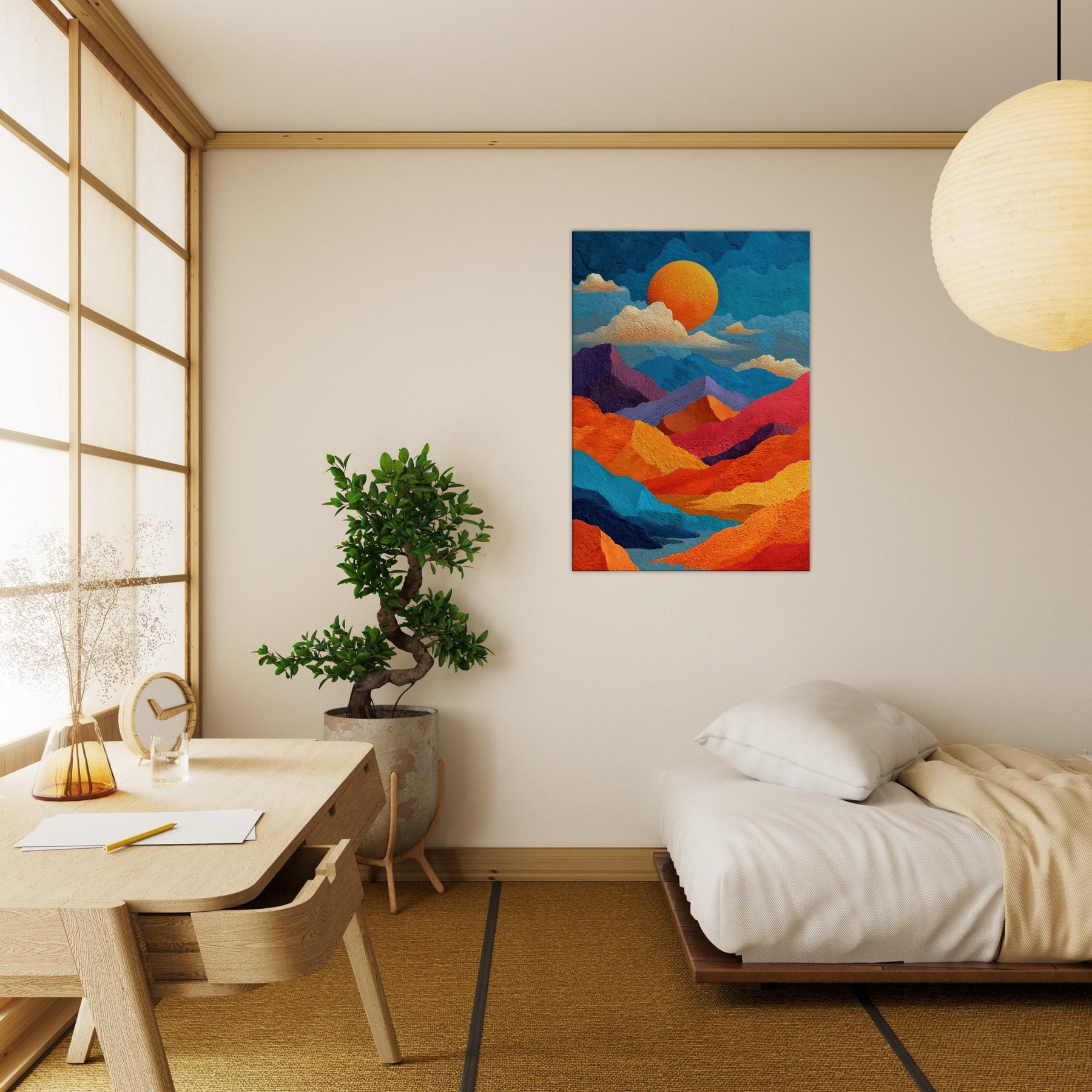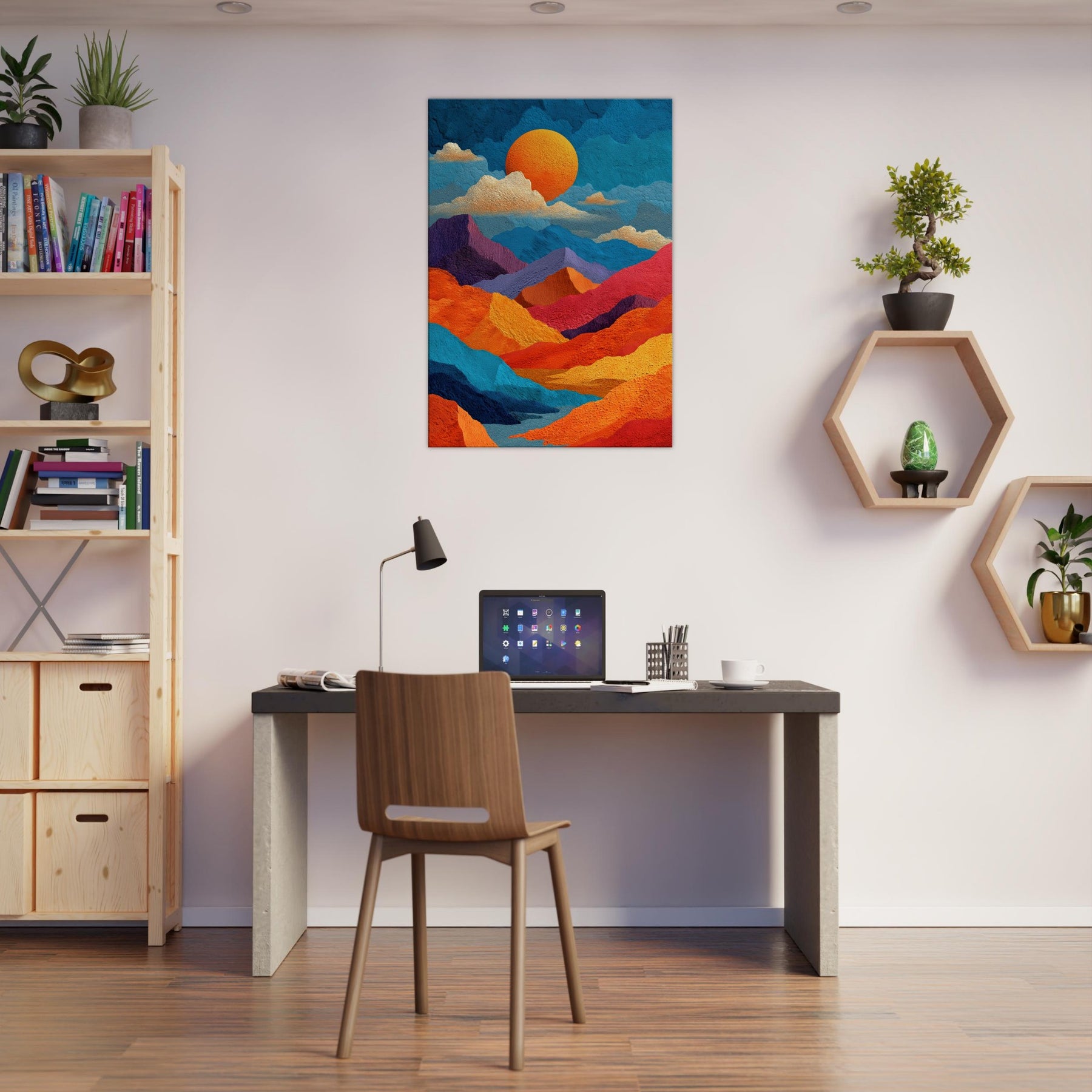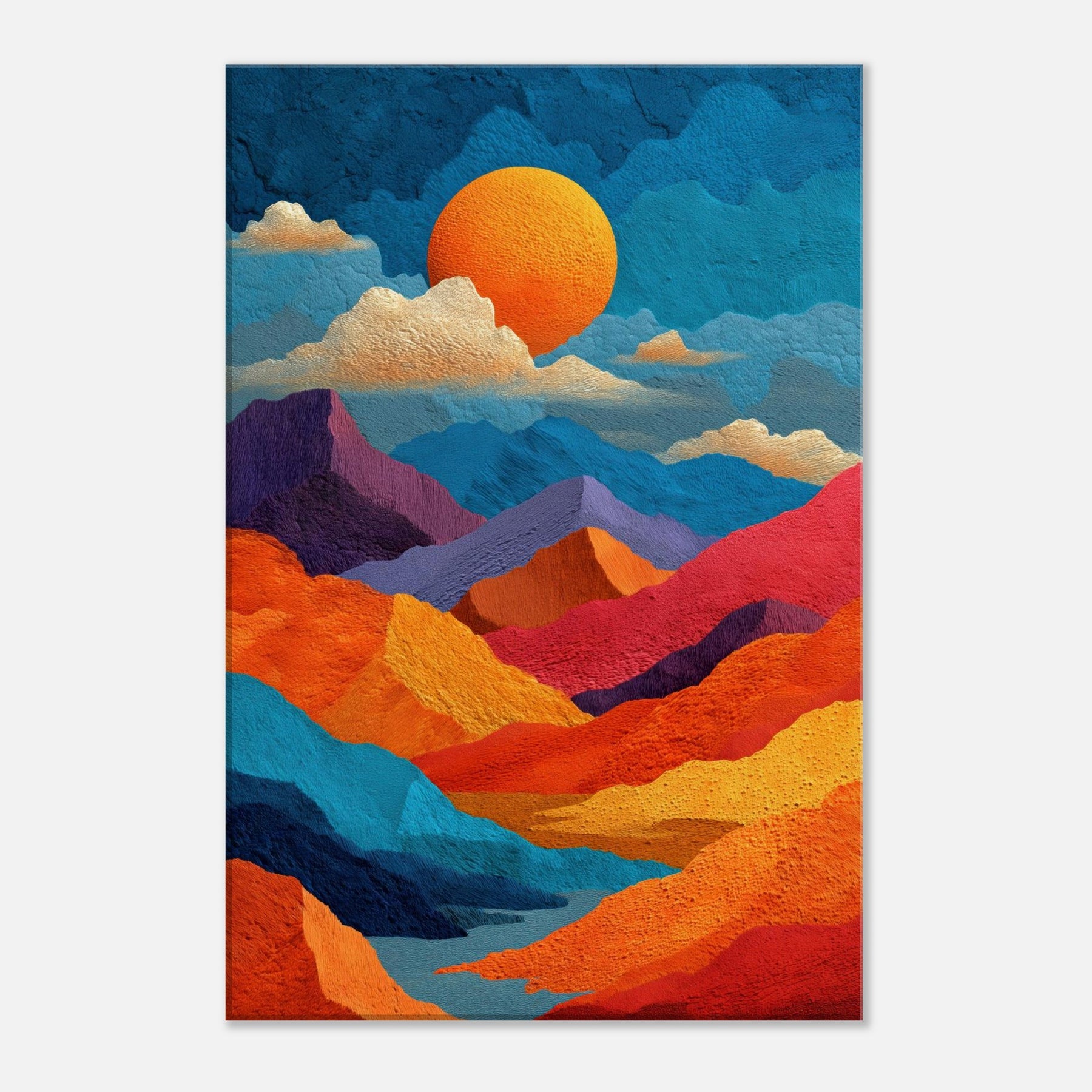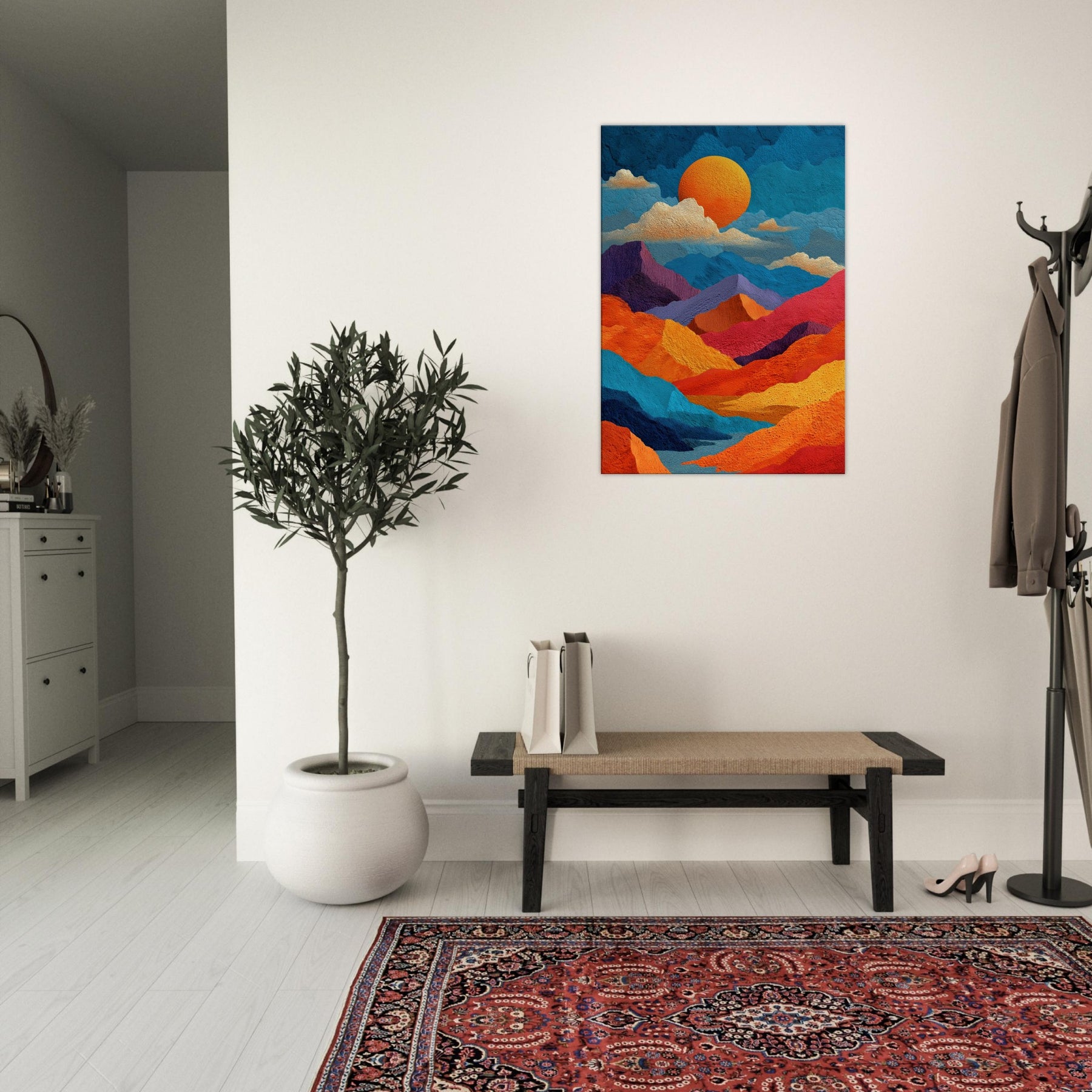 Moon over Mountains (Minimal) rises in a quiet symphony of color and light. This abstract dissolves the horizon into molten layers of orange, pink, and electric blue, inviting a meditative breath into any room. The tactile texture suggests a hand formed terrain that glows with moon bright mystery, turning a living space into a sanctuary for reflection, conversation, and dreamlike evenings. Perfect above a sofa or in a hallway, it lends serenity and mystical depth without overpowering the space.