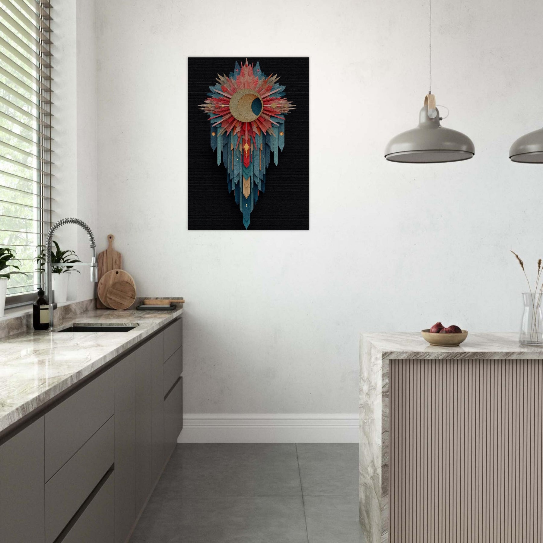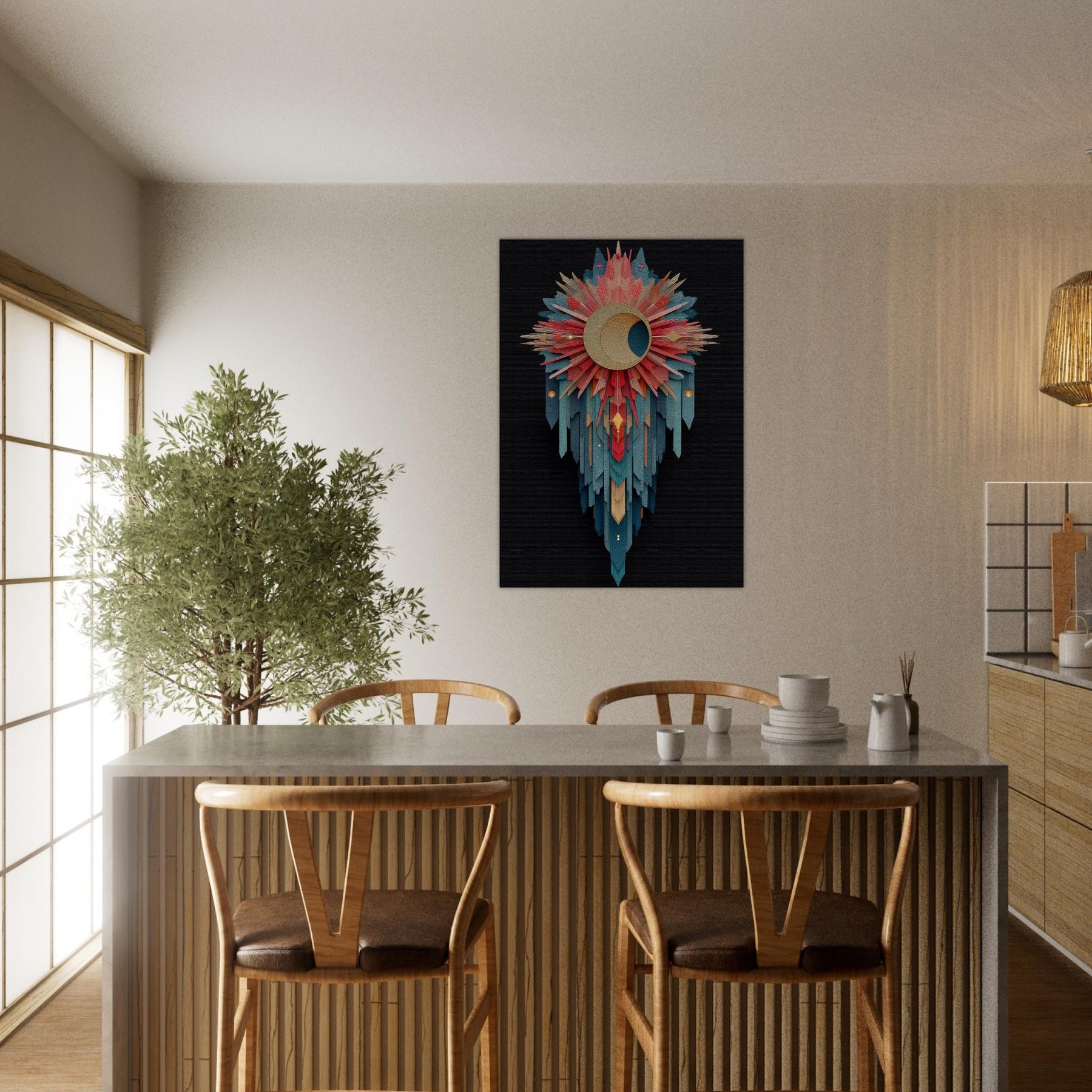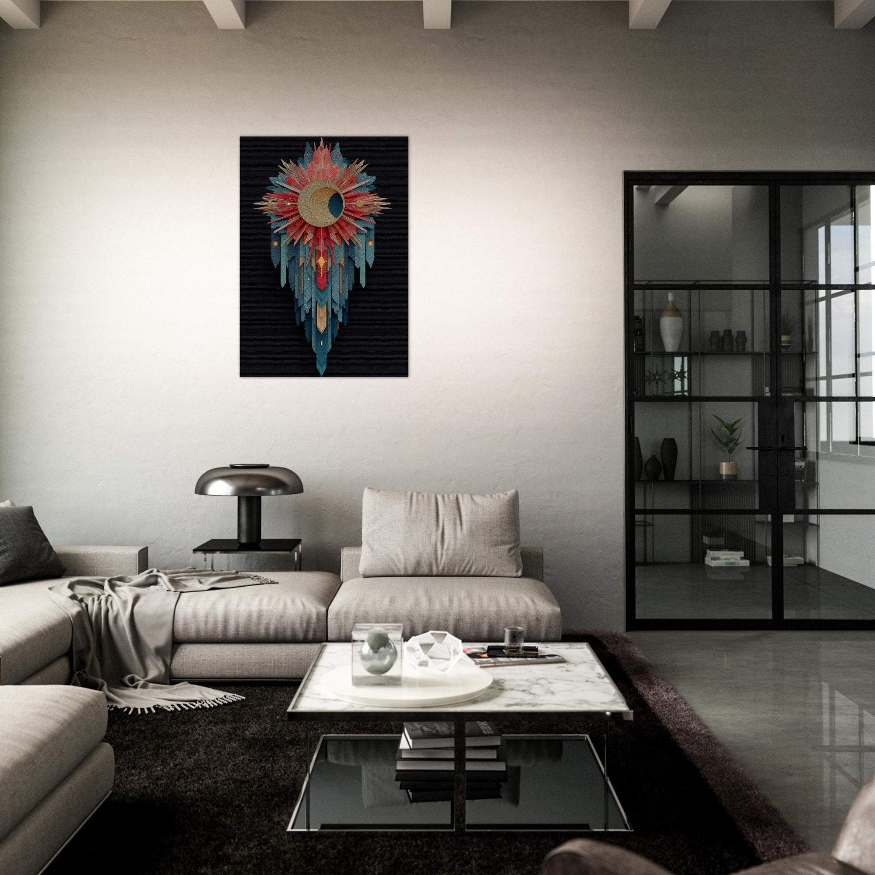 Moonrise Prism invites the viewer into a nocturnal cathedral of color. Radiating shards cradle a central crescent, blending gold with sapphire and coral to conjure a mystical aura that shifts with light. The piece feels like a quiet vigil cool air of twilight, the Moon's soft pulse, and the memory of moonlit tides. Placed in a living room, it becomes a focal, meditative anchor that elongates wall space and invites calm, introspective conversations.