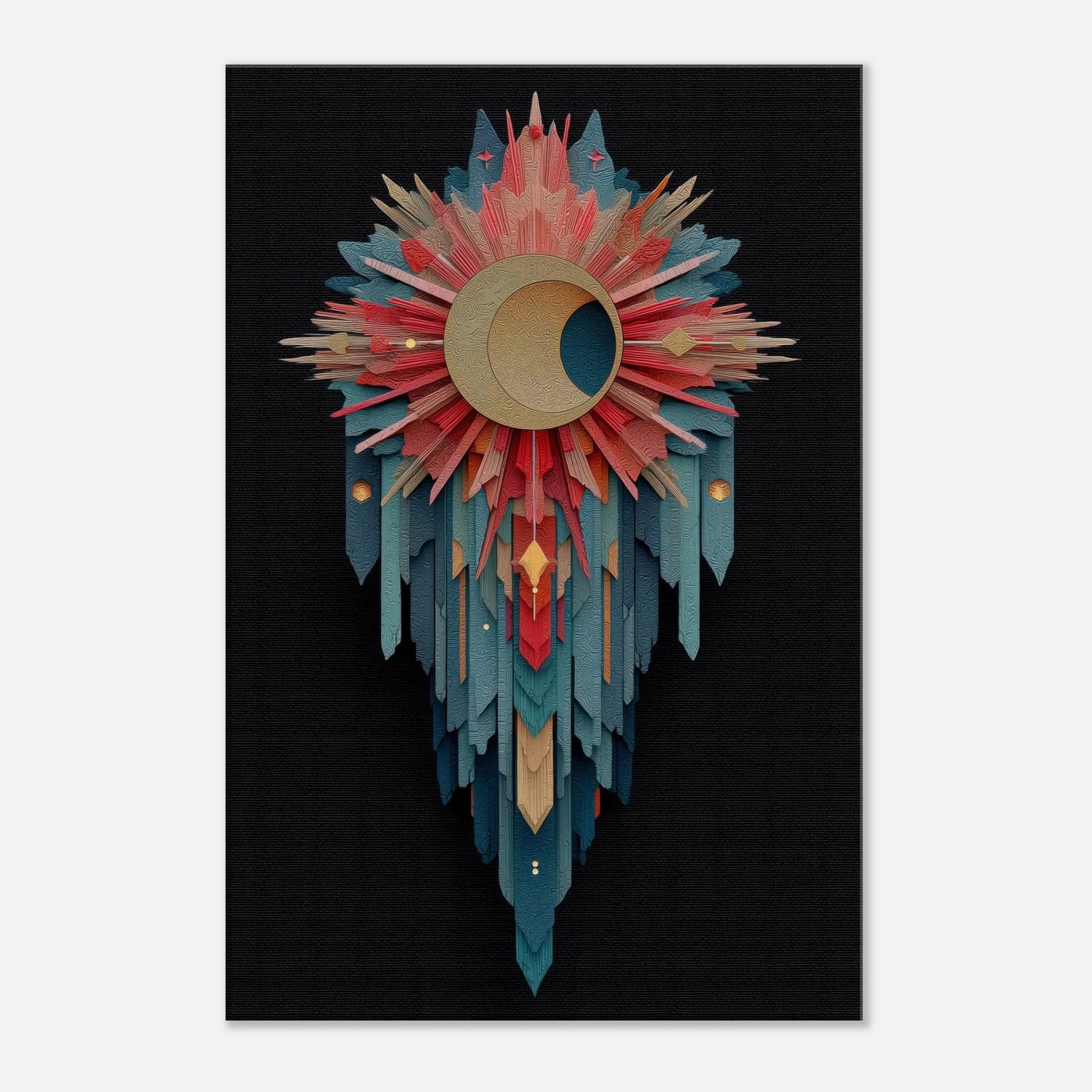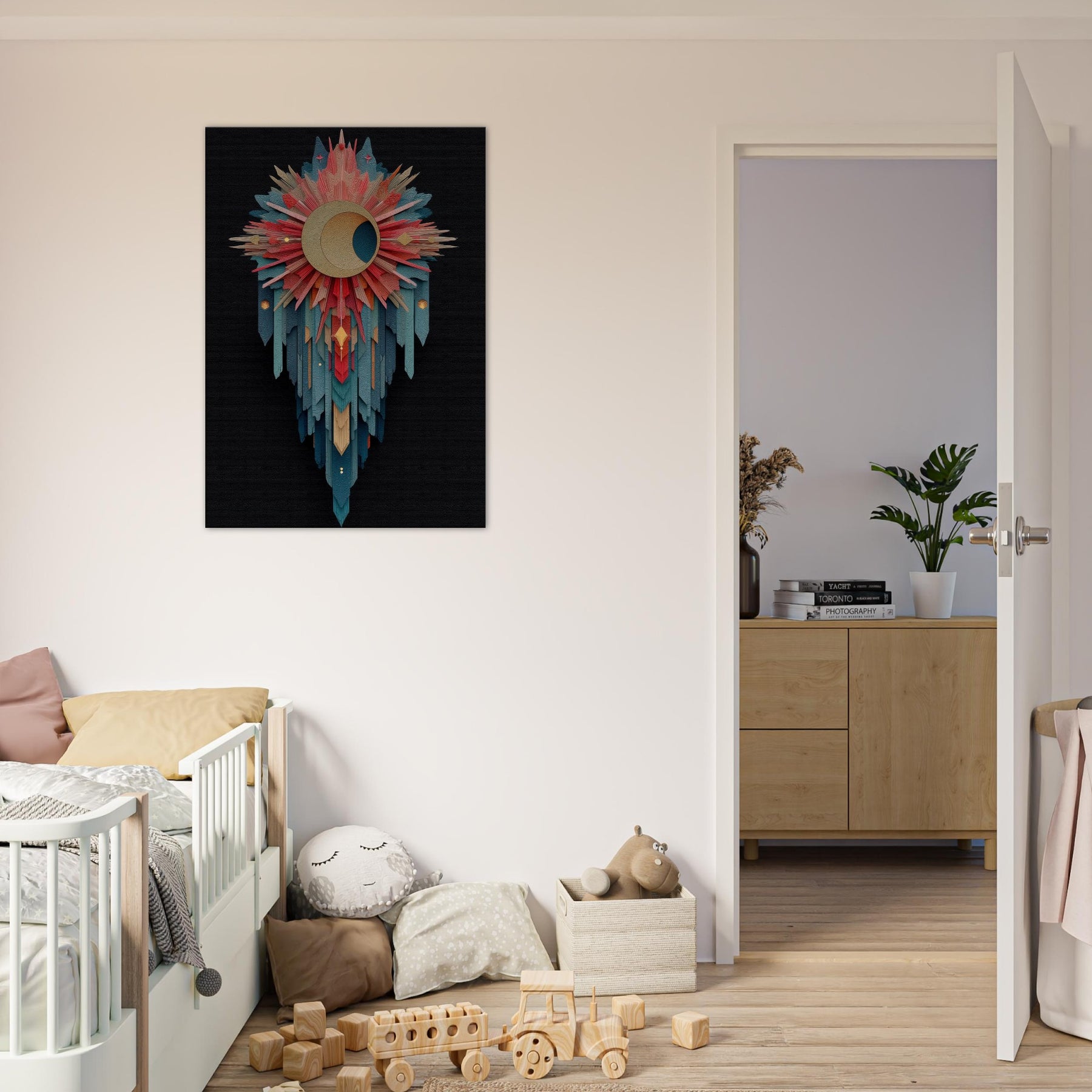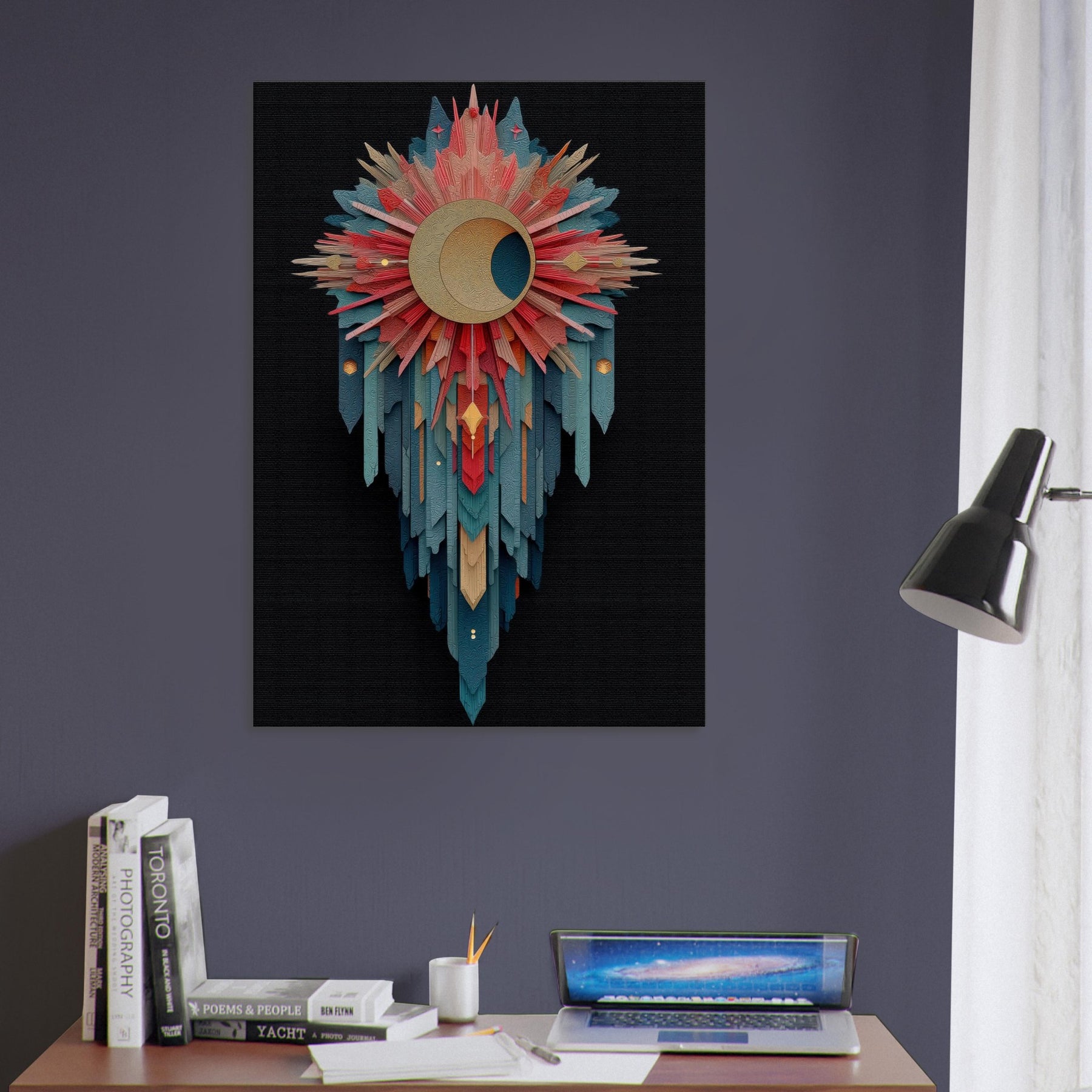 Moonrise Prism invites the viewer into a nocturnal cathedral of color. Radiating shards cradle a central crescent, blending gold with sapphire and coral to conjure a mystical aura that shifts with light. The piece feels like a quiet vigil cool air of twilight, the Moon's soft pulse, and the memory of moonlit tides. Placed in a living room, it becomes a focal, meditative anchor that elongates wall space and invites calm, introspective conversations.