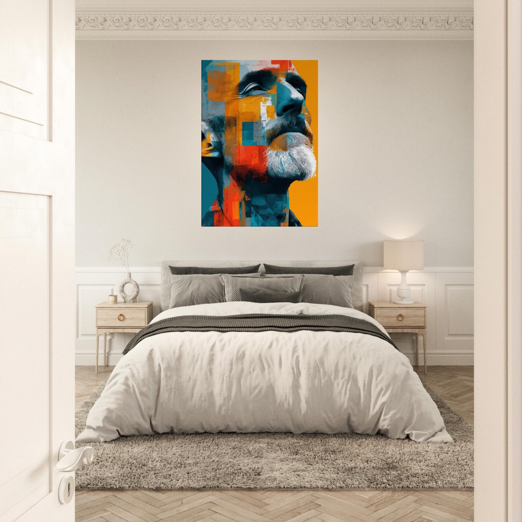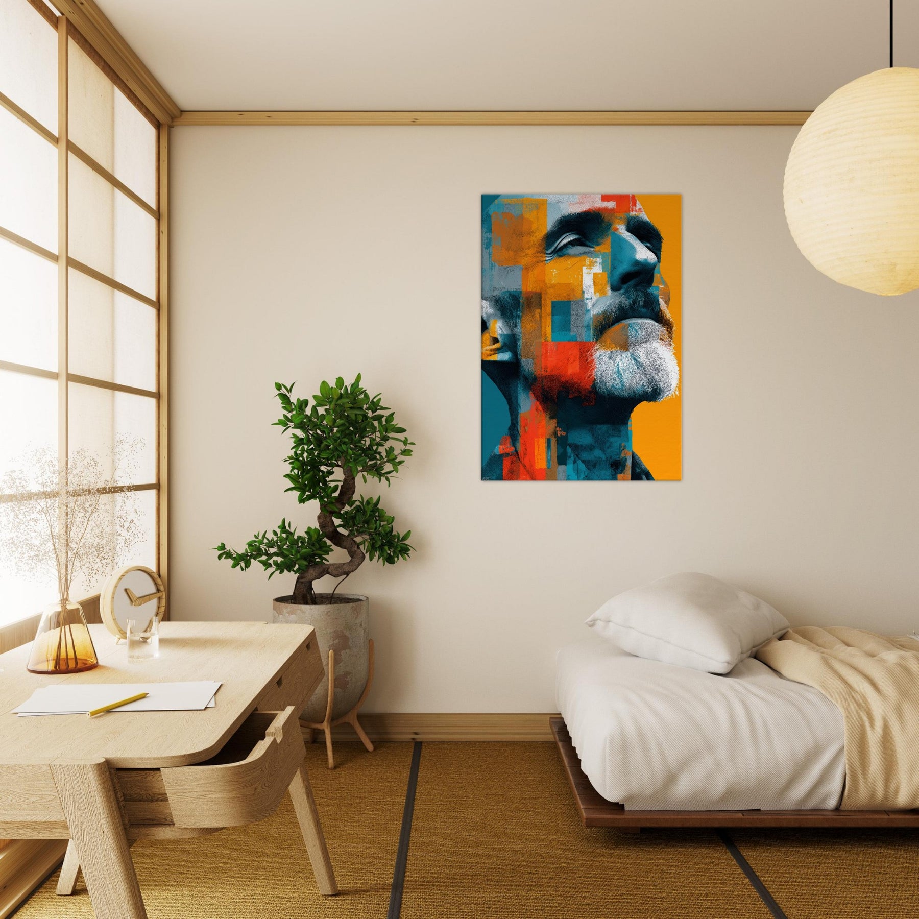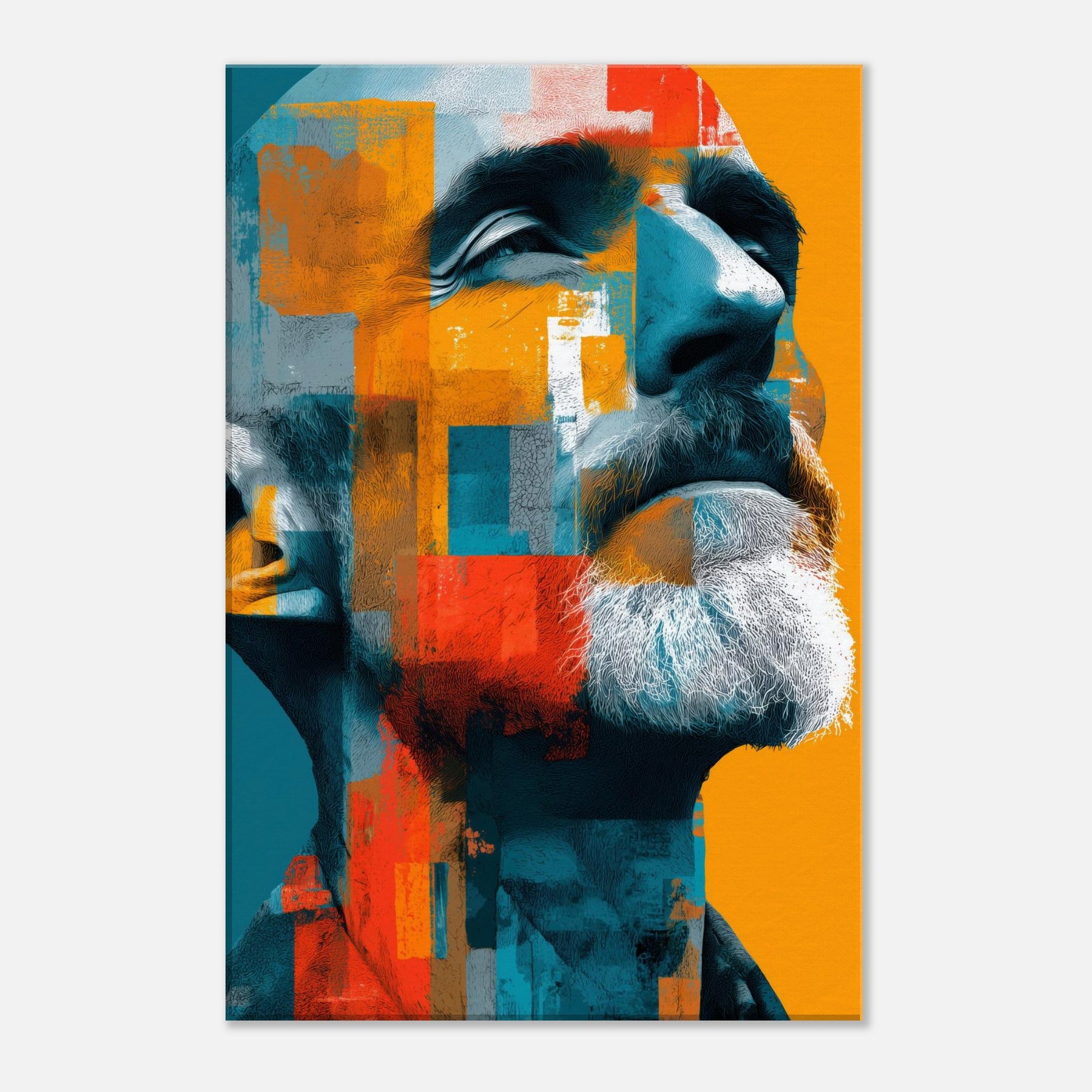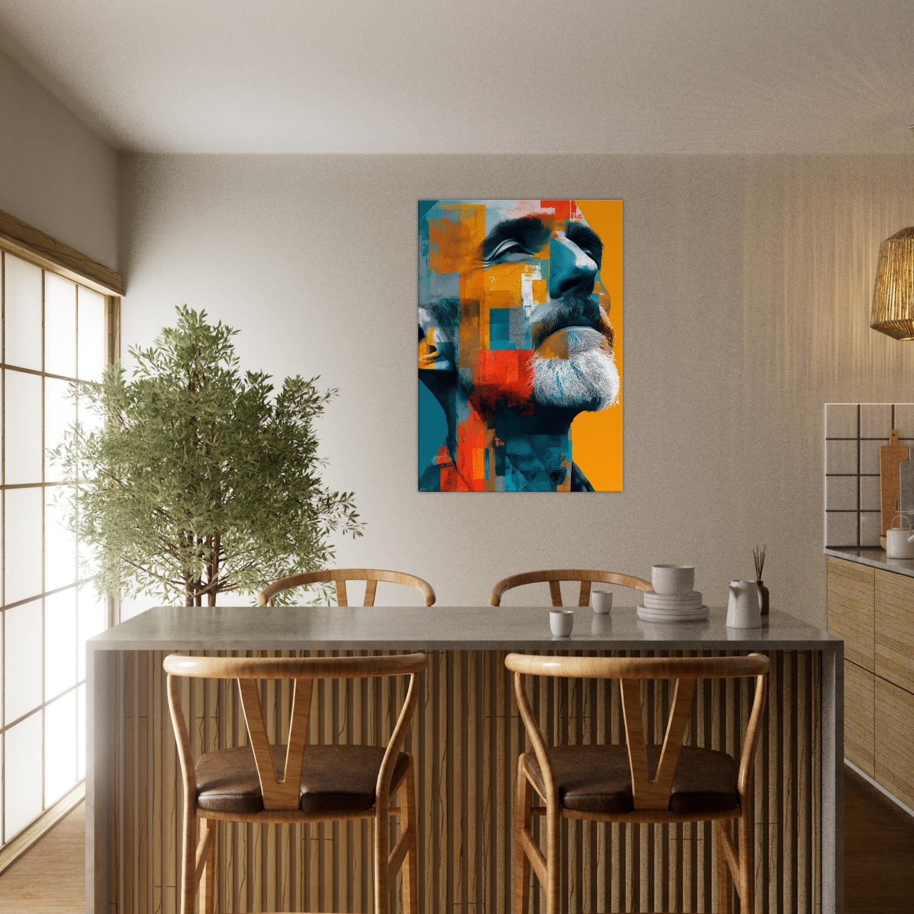 Male (Bearded, Tribal, Bald) steps into your room as a quiet, magnetic presence. The abstract mosaic wraps the face in turquoise, saffron, and clay, amplifying dignity and inner warmth. You'll sense light play across the beard, contours of the jaw, and a gaze that invites, then forgives, your attention. Ideal for a living room or study, this piece shifts with the light, turning walls into a canvas of mood, memory, and modern humanity.