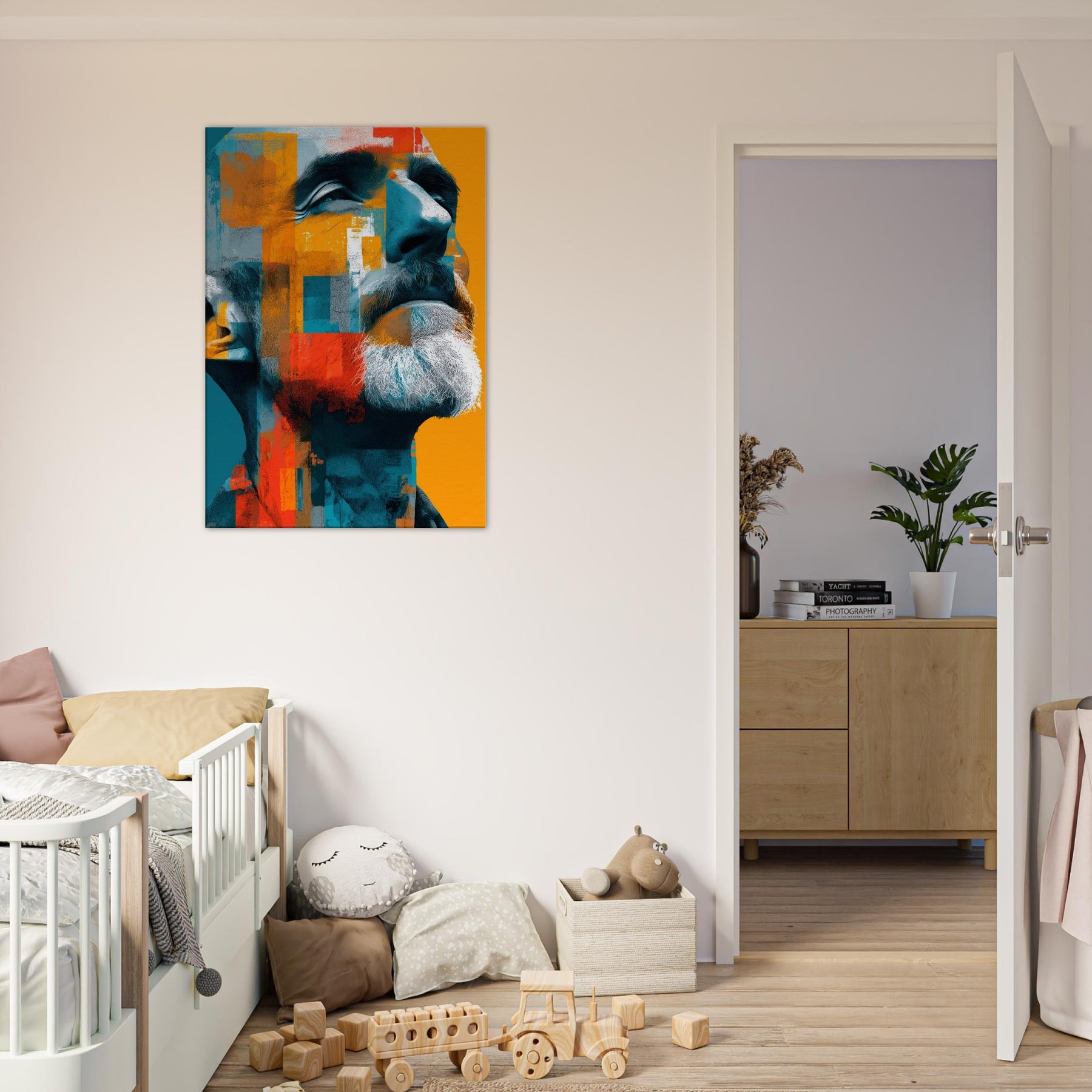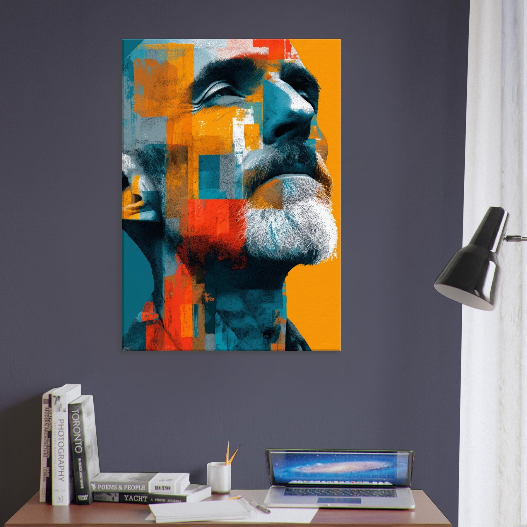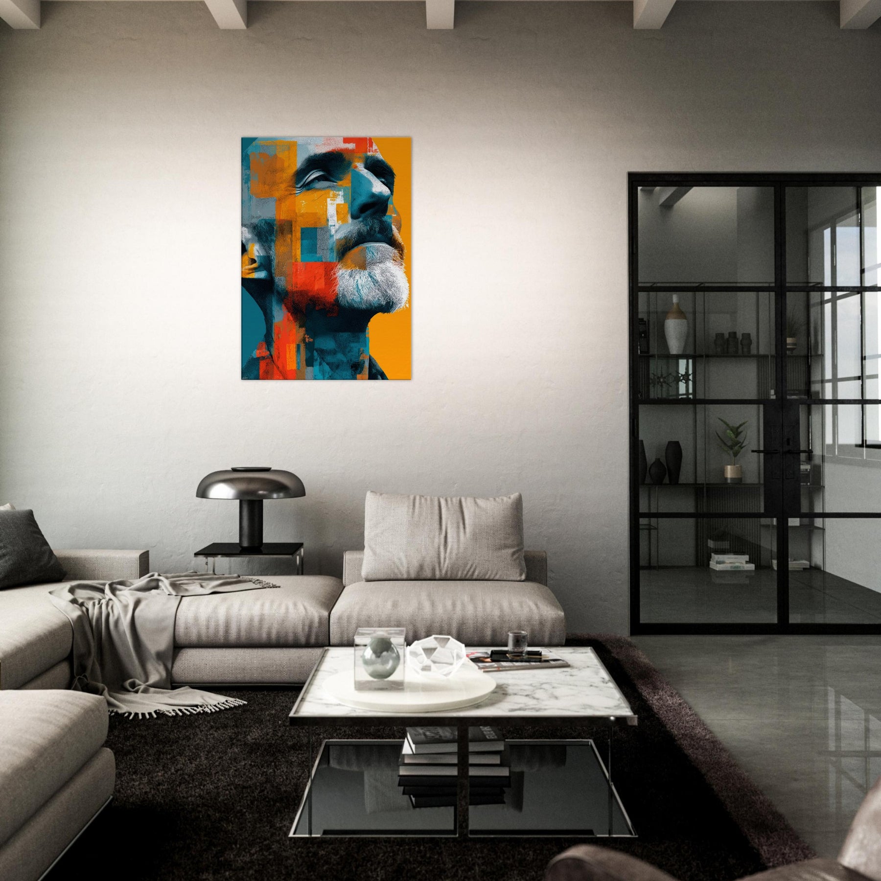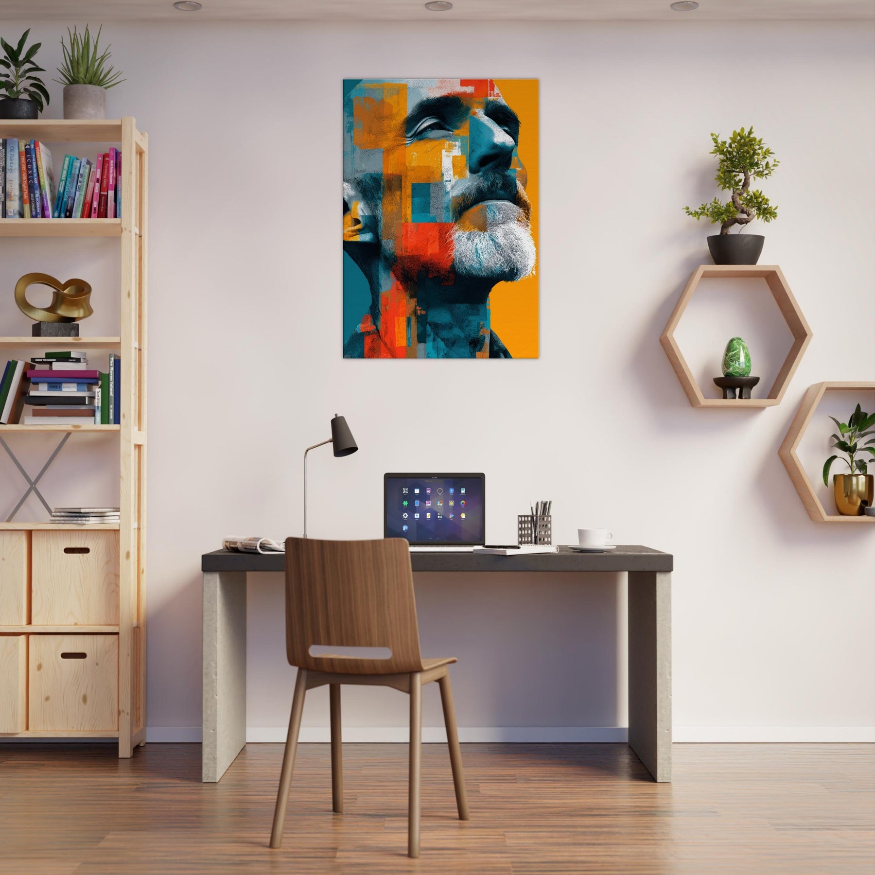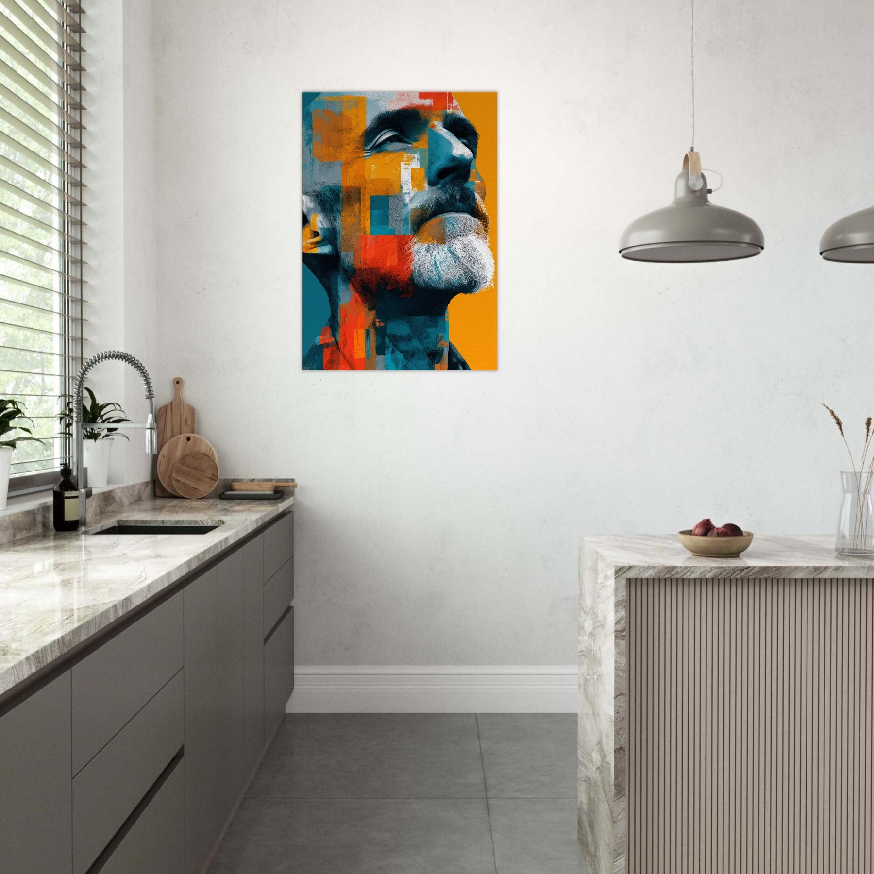 Male (Bearded, Tribal, Bald) steps into your room as a quiet, magnetic presence. The abstract mosaic wraps the face in turquoise, saffron, and clay, amplifying dignity and inner warmth. You'll sense light play across the beard, contours of the jaw, and a gaze that invites, then forgives, your attention. Ideal for a living room or study, this piece shifts with the light, turning walls into a canvas of mood, memory, and modern humanity.