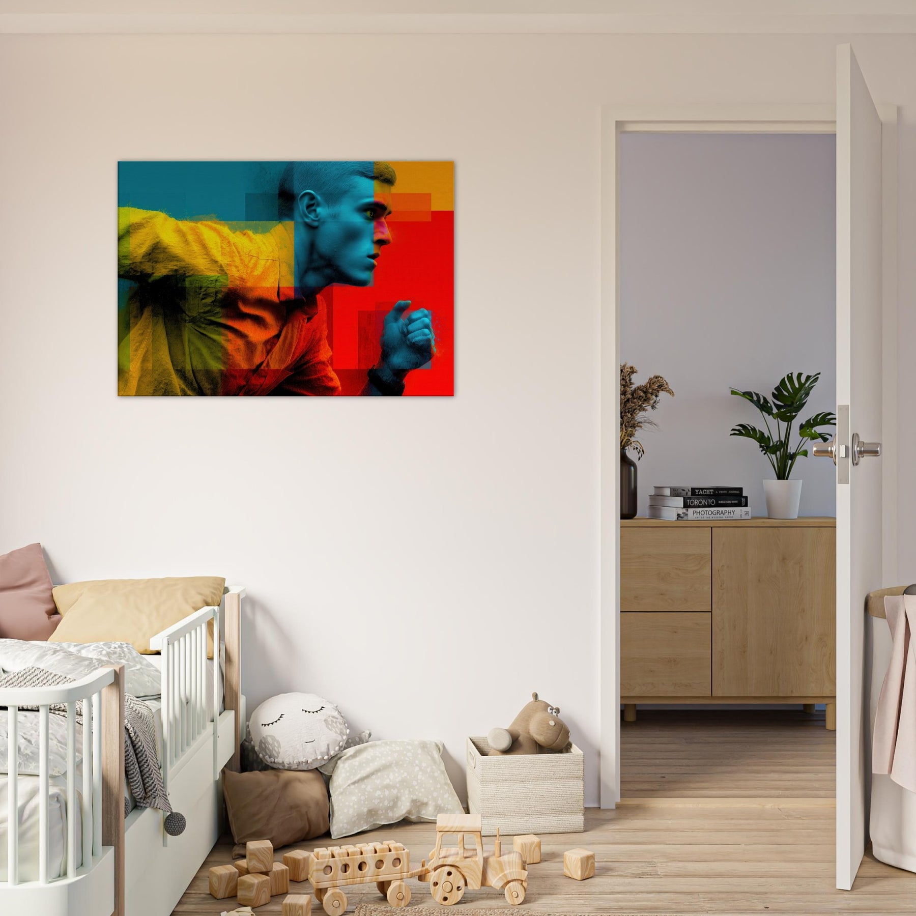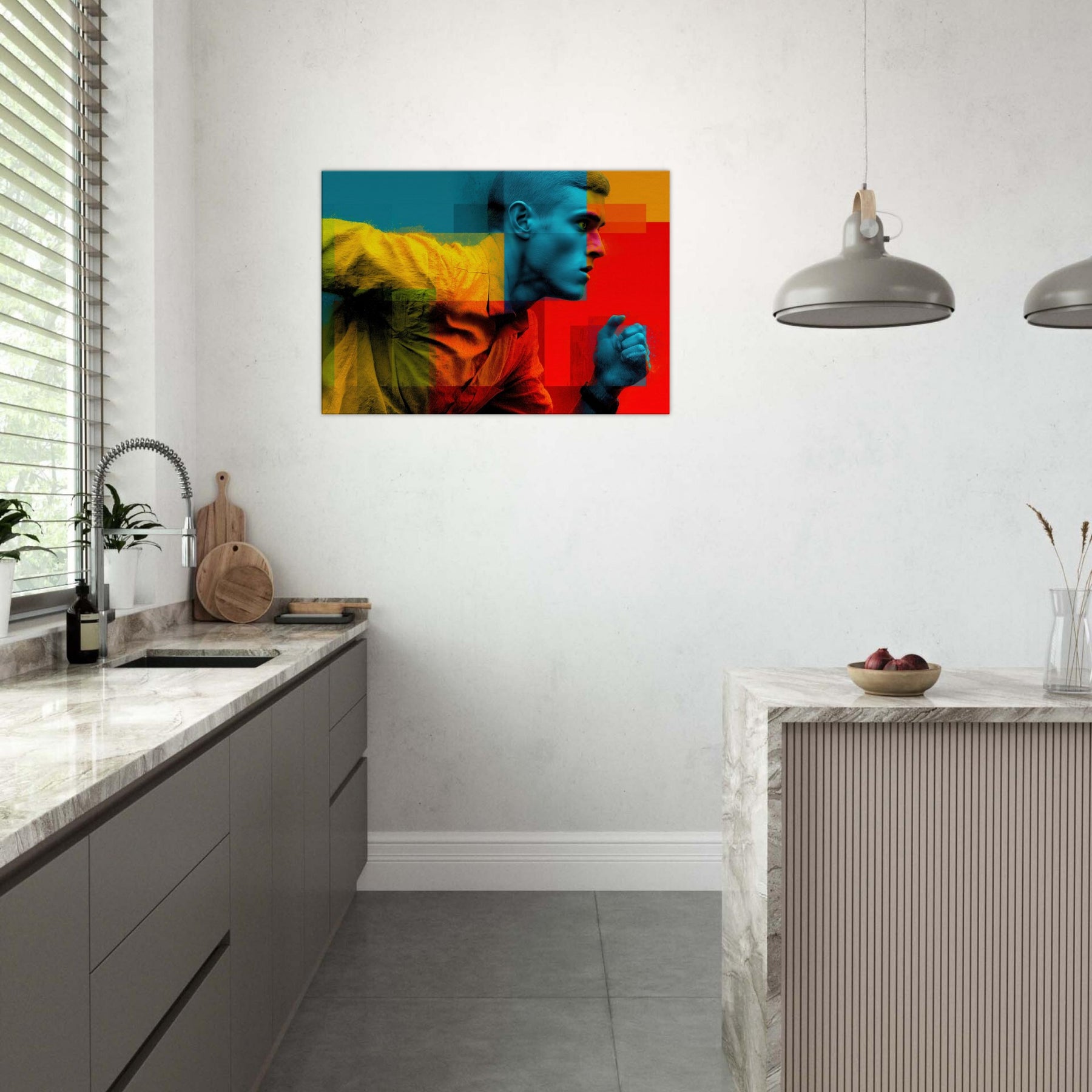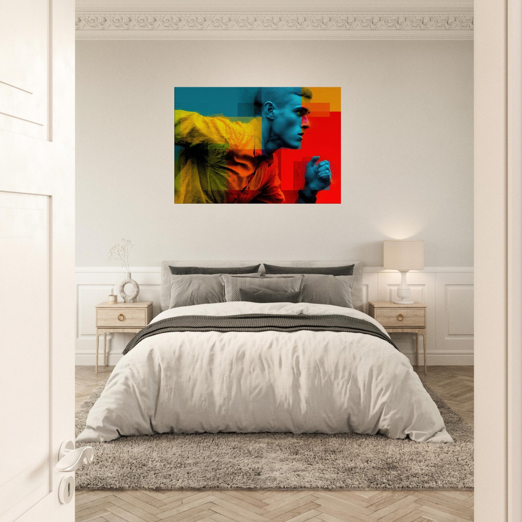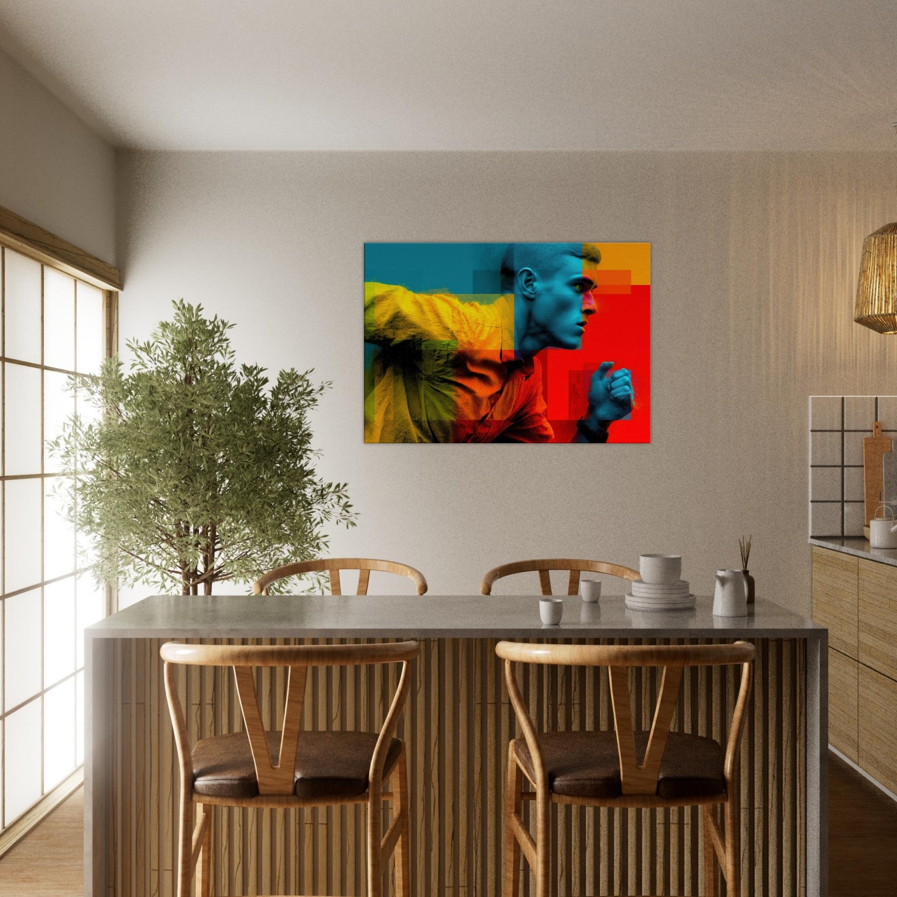 Immerse your space in a stream of color and motion. This abstract study of a Runner in Motion blends electric blues, sunlit yellows, and molten reds into a single, breathing image that shifts with the light. The layered blocks and crisp contours evoke speed, focus, and anticipation as if the room itself could lean forward. Hang it in a living area or workspace to cue energy and clarity, turning walls into a kinetic conversation piece that awakens mood and imagination.