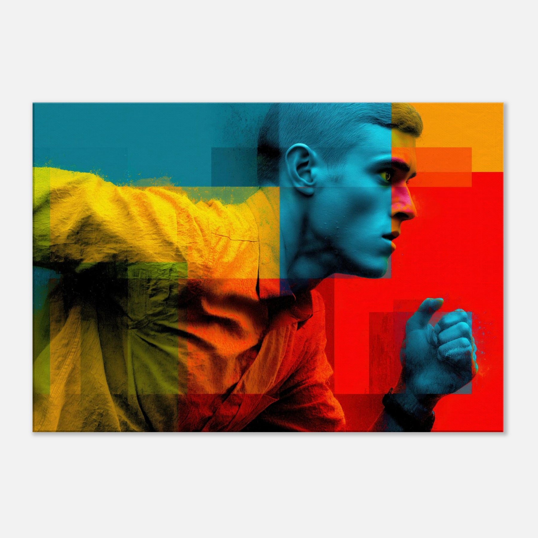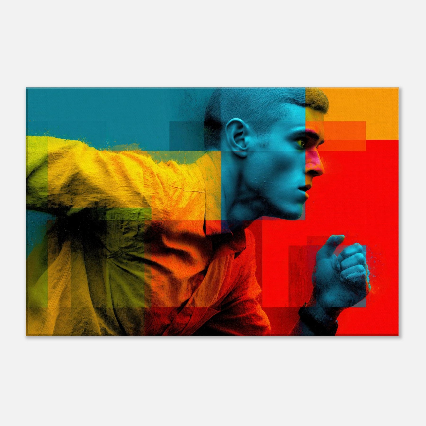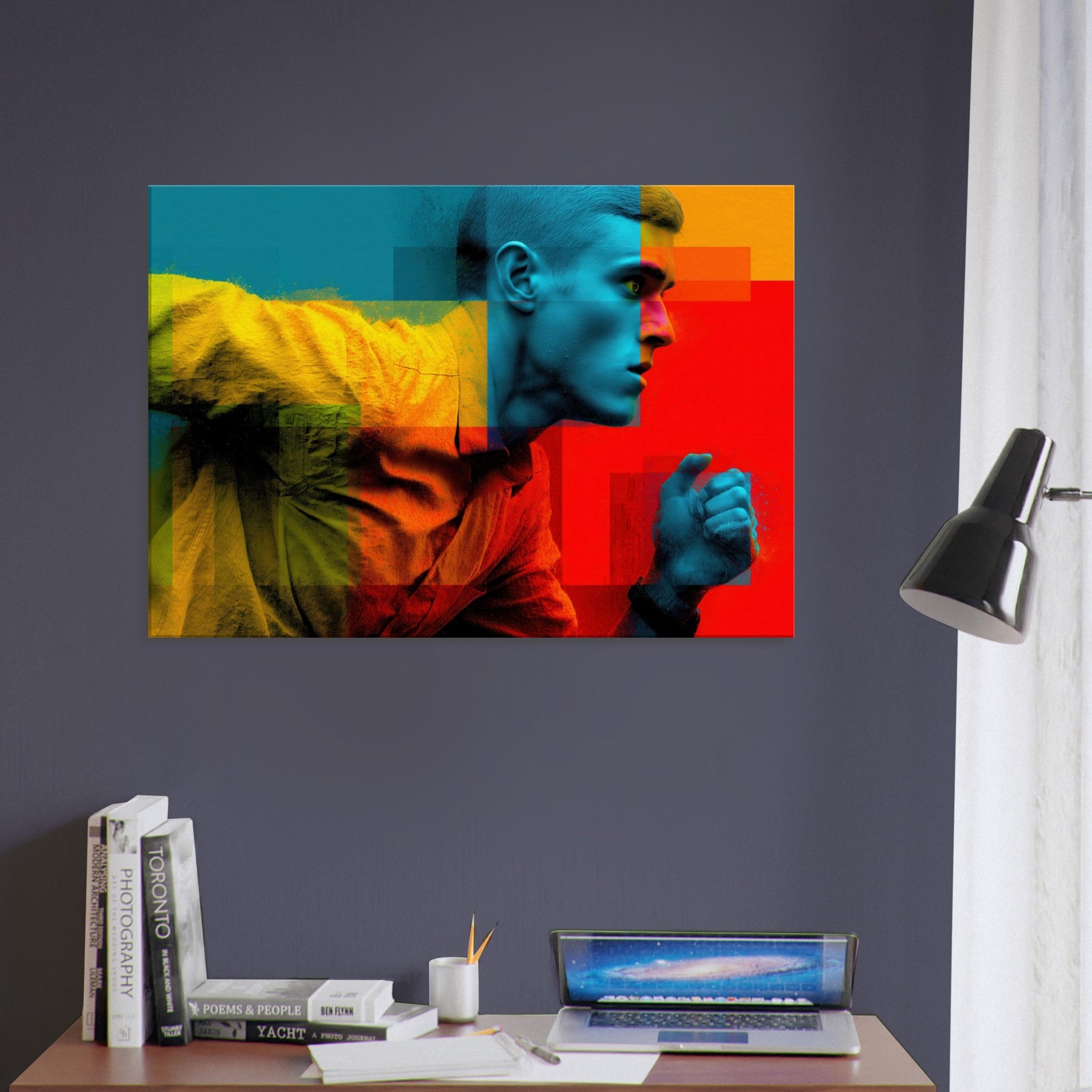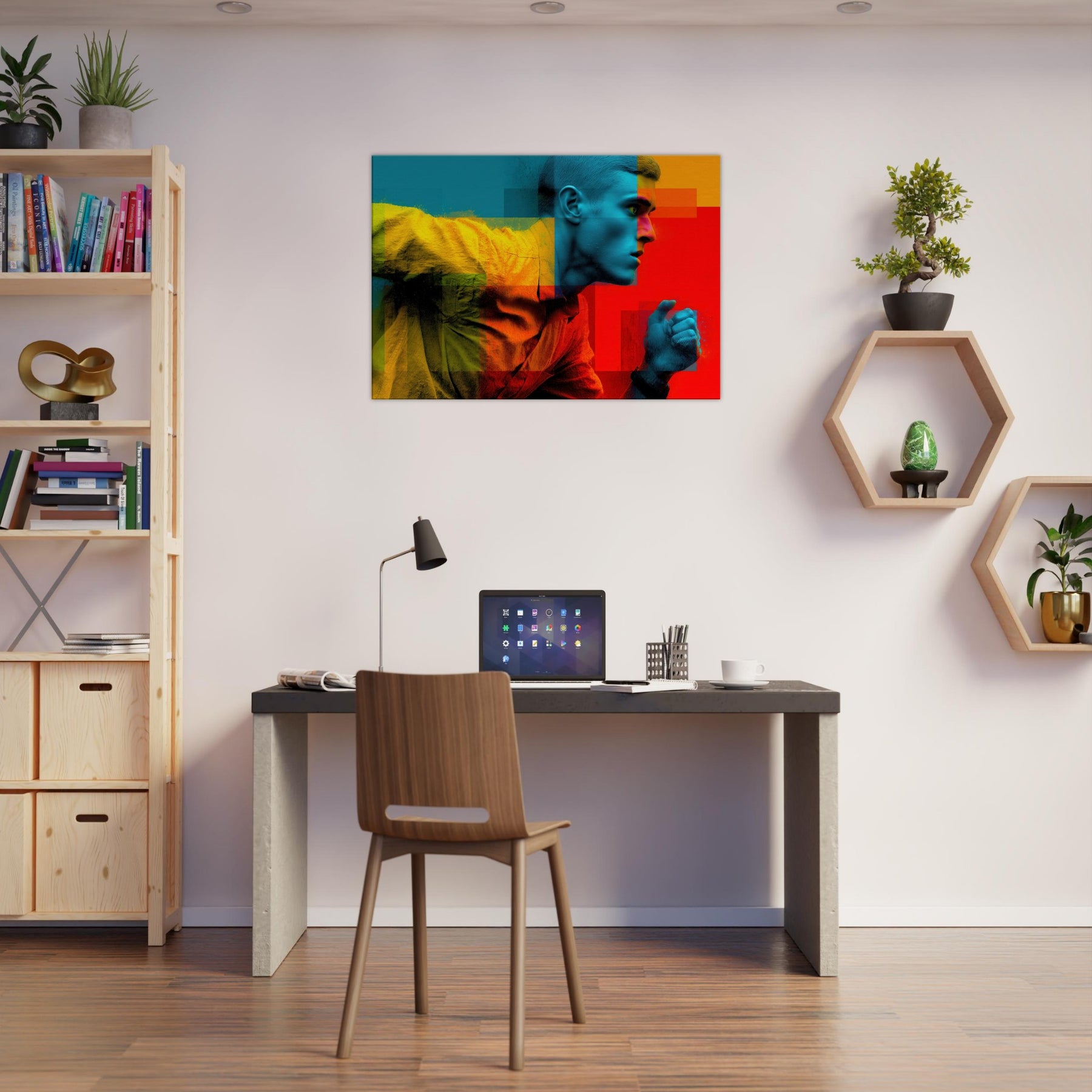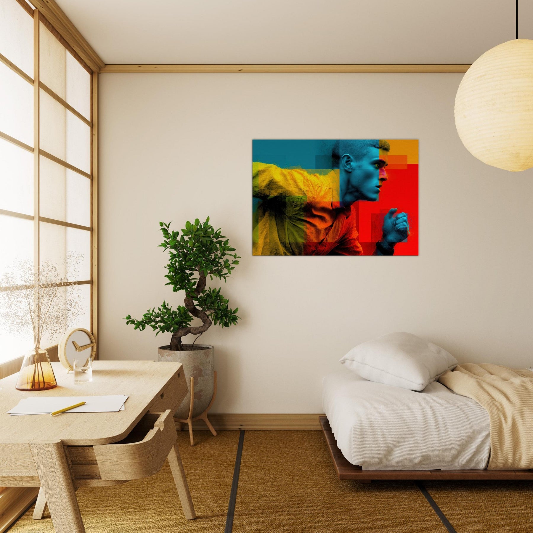 Immerse your space in a stream of color and motion. This abstract study of a Runner in Motion blends electric blues, sunlit yellows, and molten reds into a single, breathing image that shifts with the light. The layered blocks and crisp contours evoke speed, focus, and anticipation as if the room itself could lean forward. Hang it in a living area or workspace to cue energy and clarity, turning walls into a kinetic conversation piece that awakens mood and imagination.