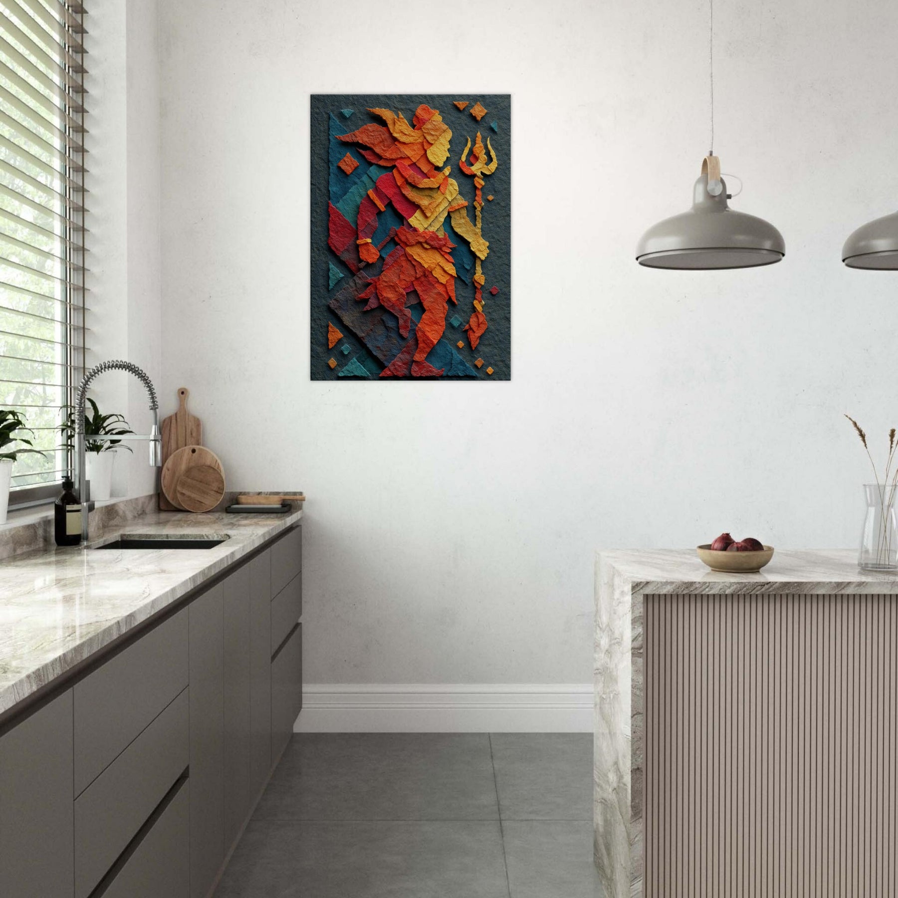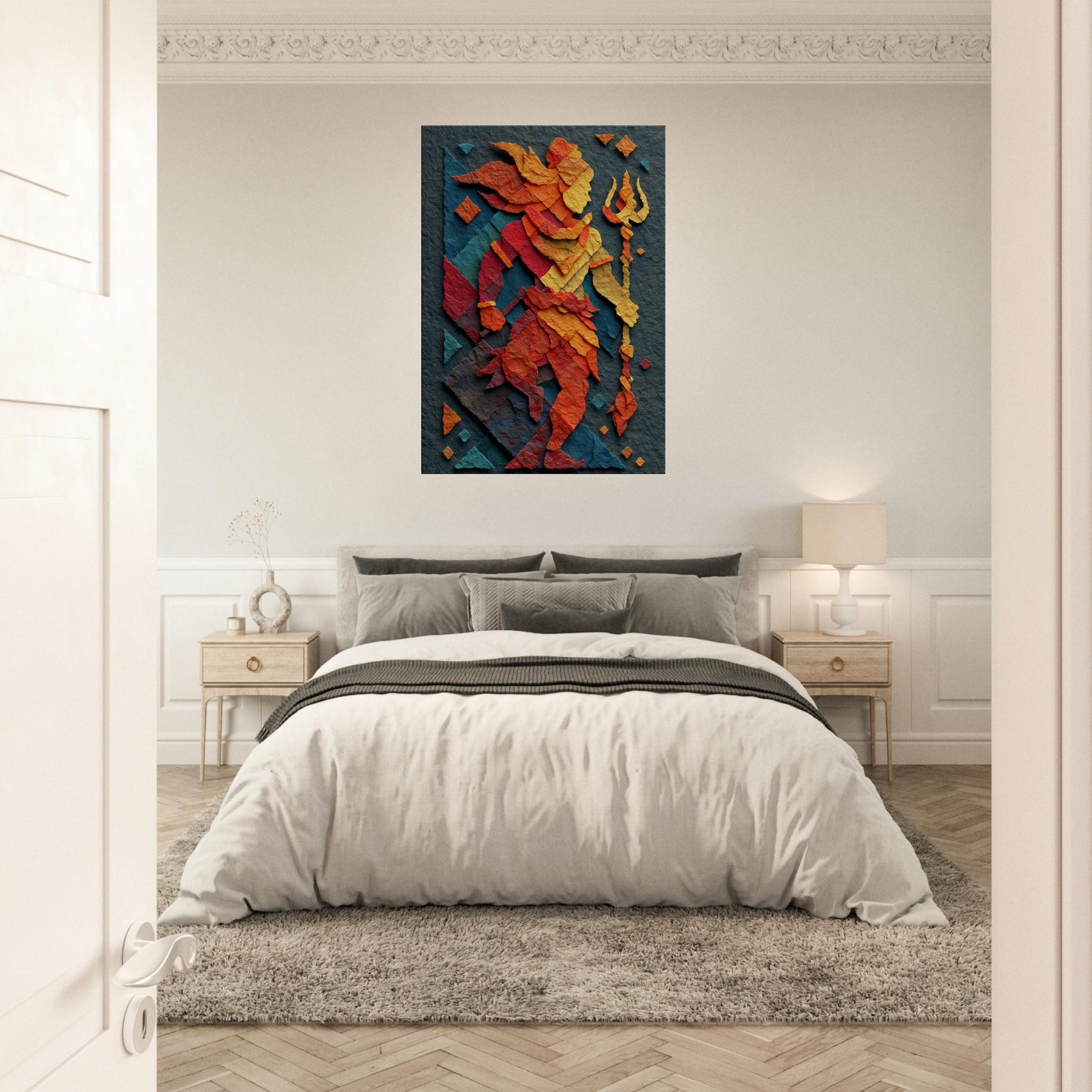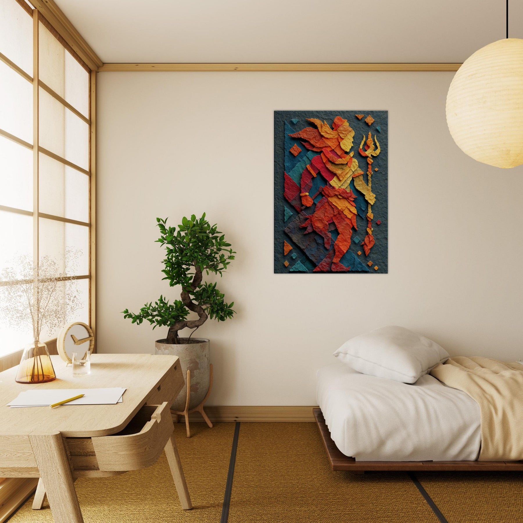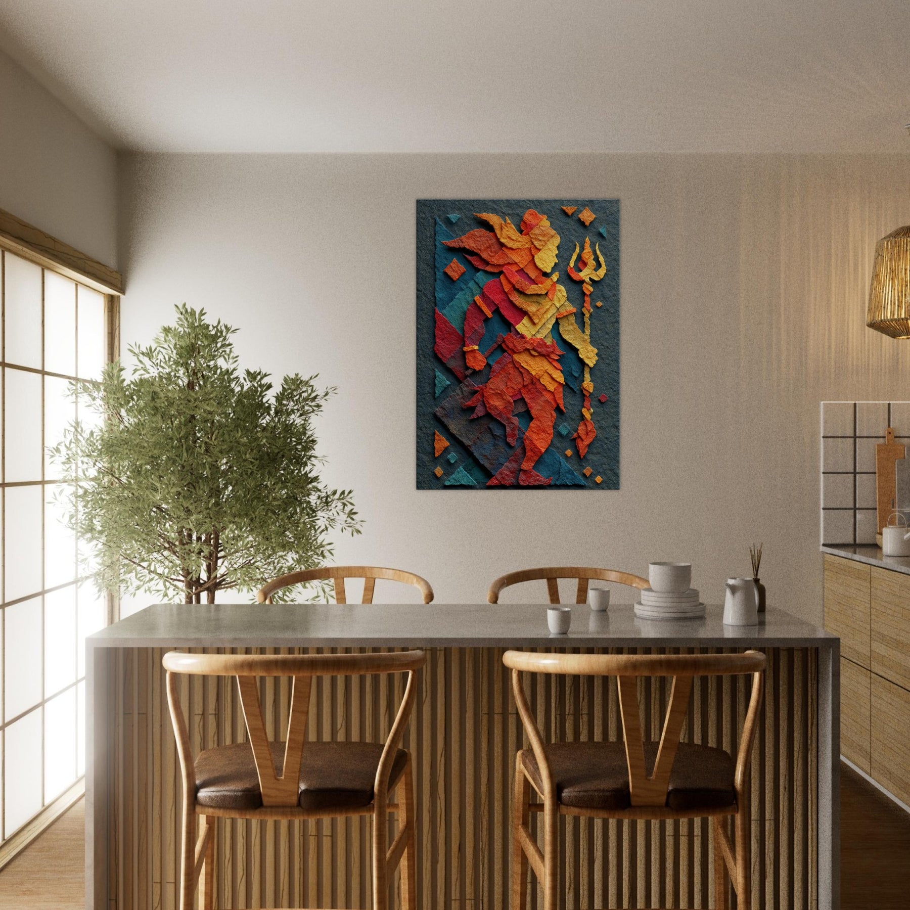 A shimmering, mosaic impression of the cosmic dancer Shiva Nataraja crafted from sun warmed fragments that scatter and fuse into a radiant aura of motion. The piece radiates warmth and depth, like a sunset traveling across the wall. It invites quiet contemplation in a living room or meditation nook, turning light into energy and space into myth. Texture and rhythm awaken the senses, making this mystical artwork feel alive and inviting.