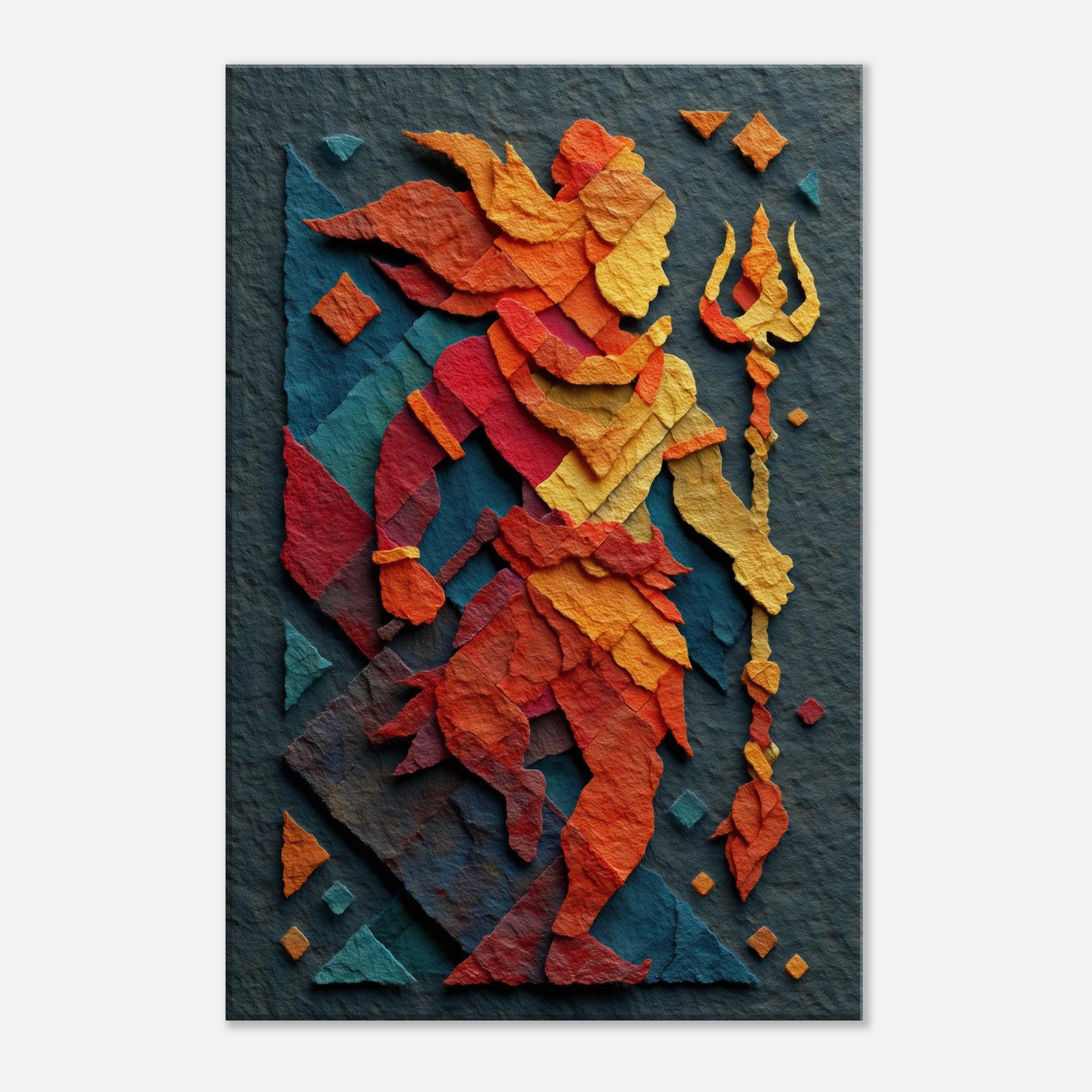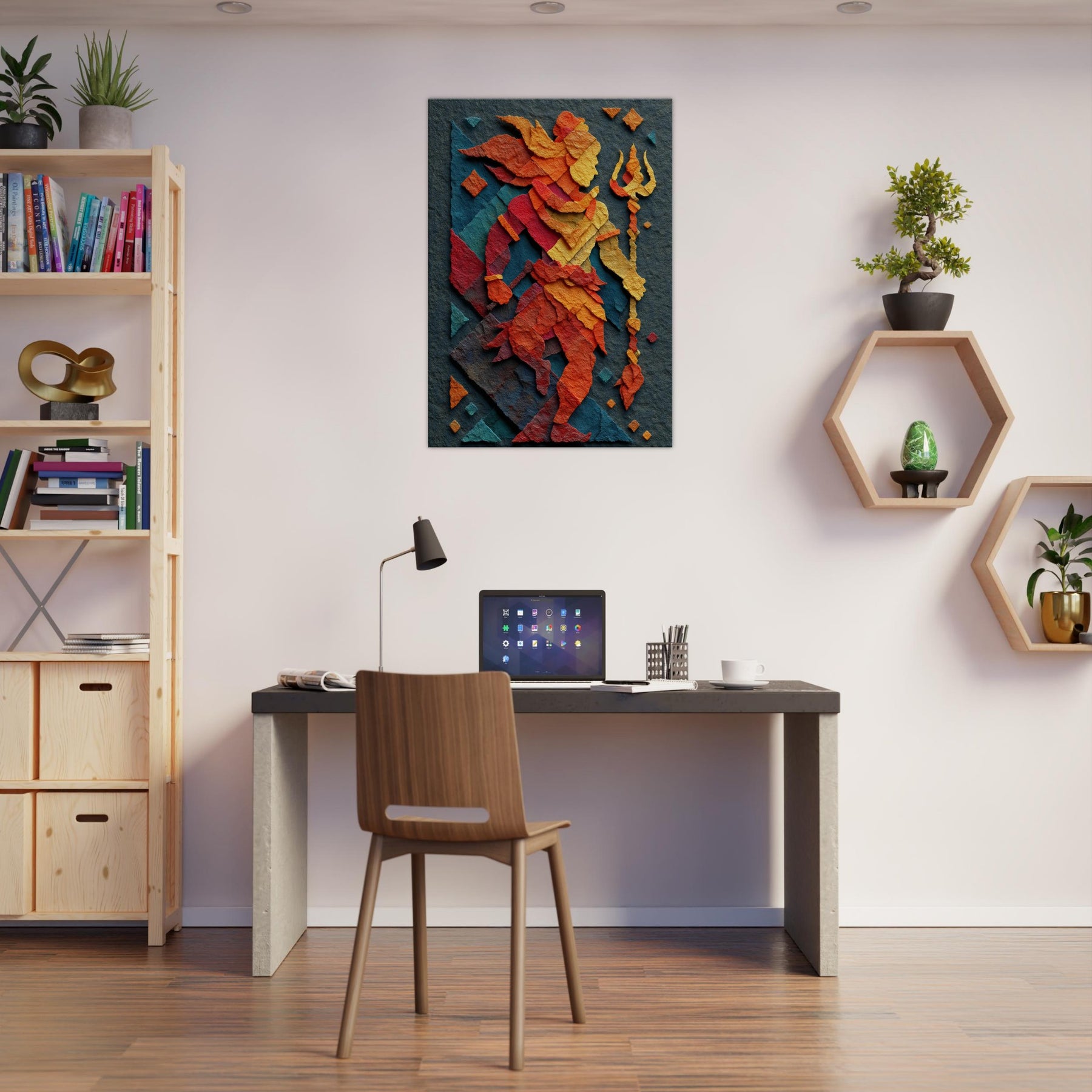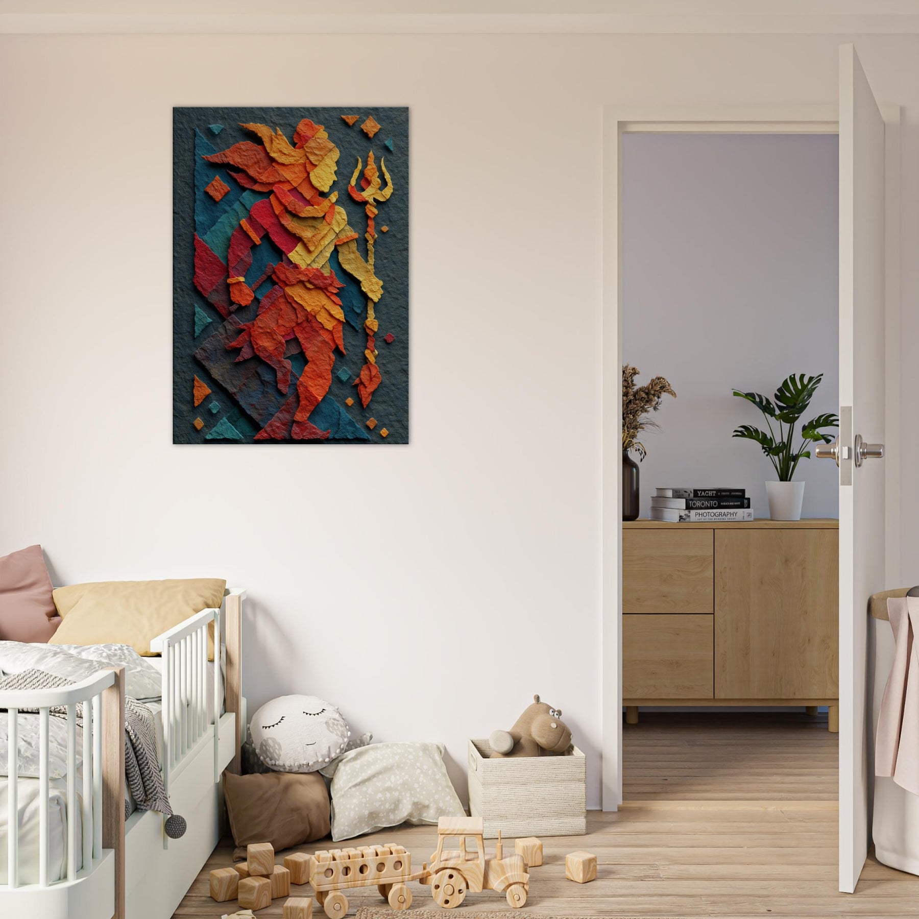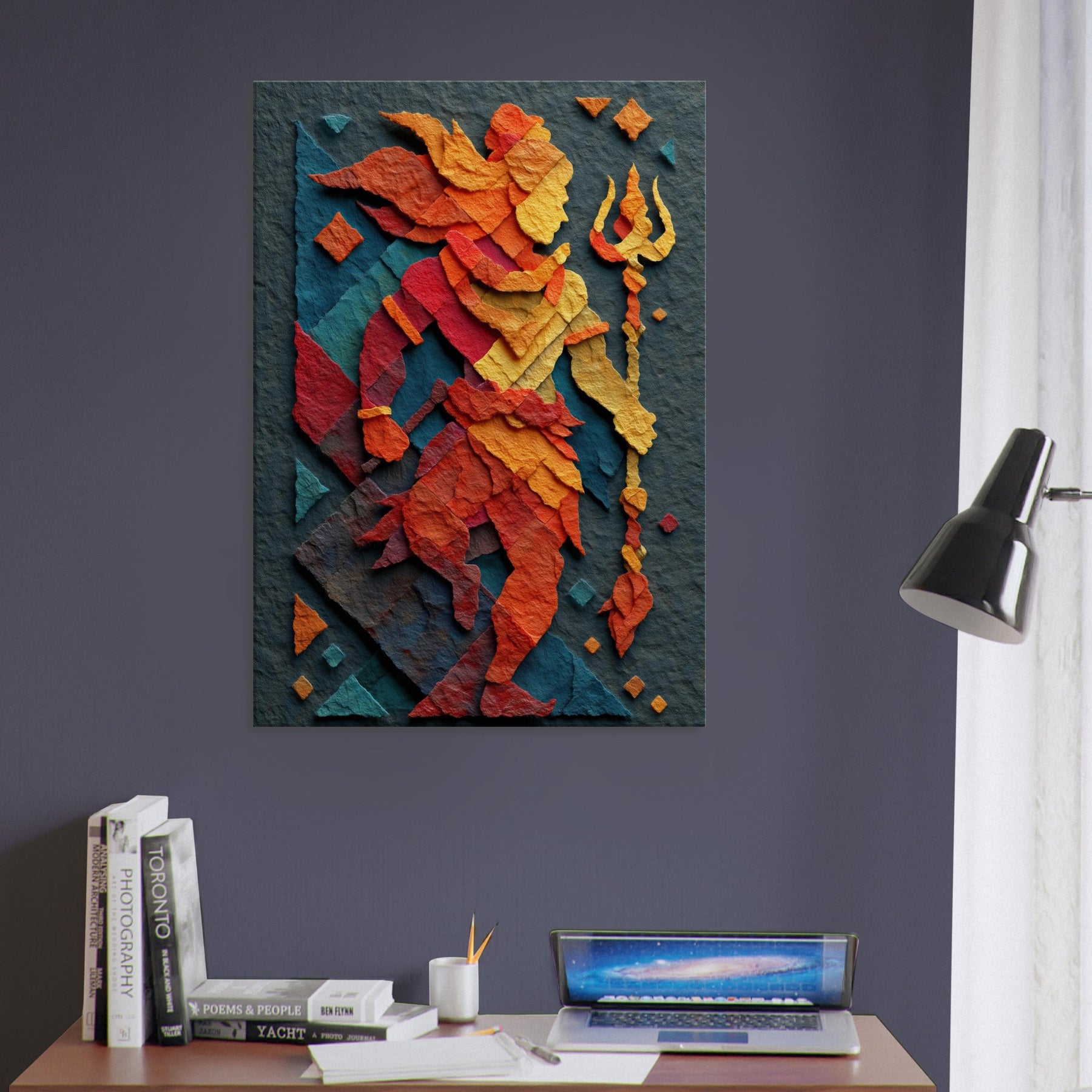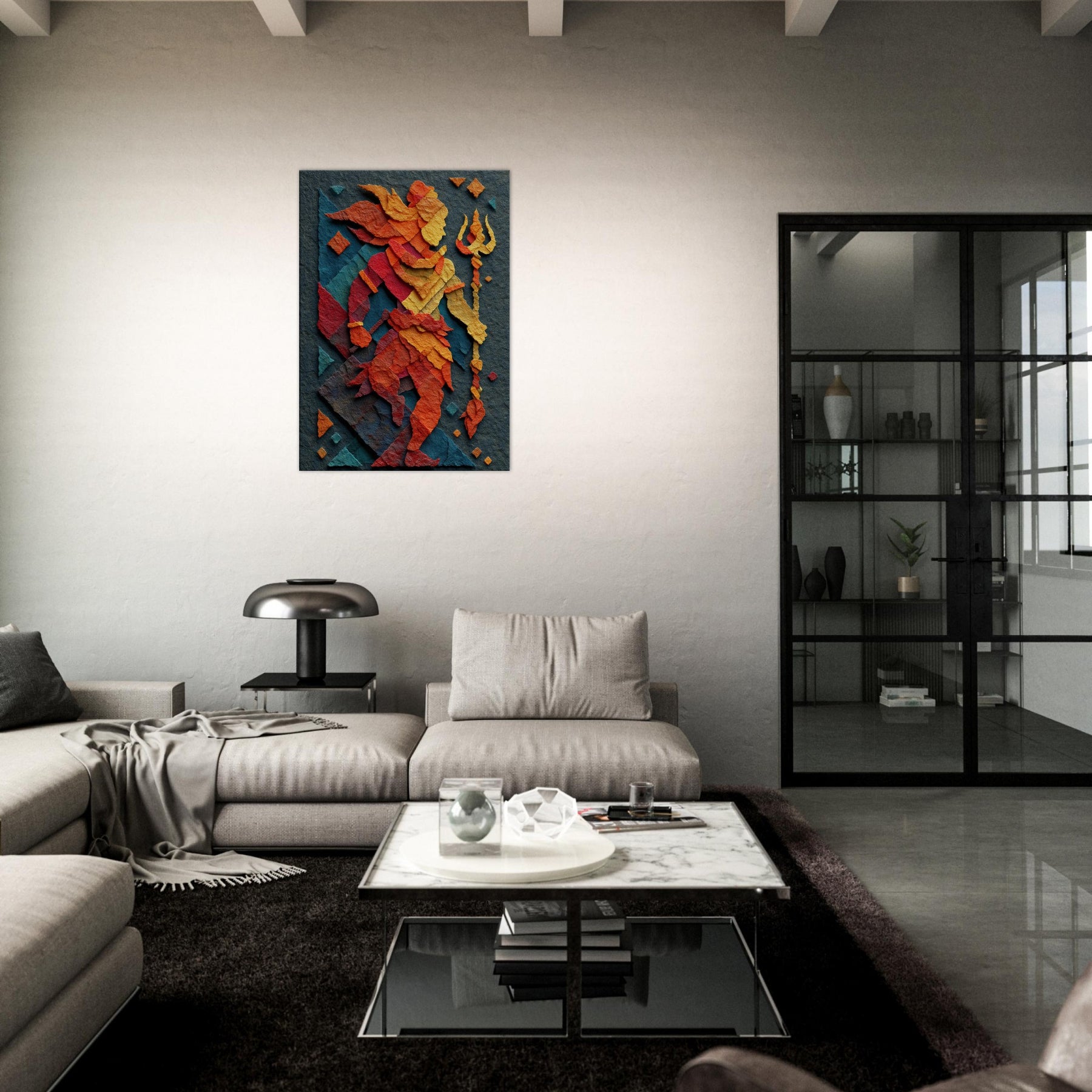 A shimmering, mosaic impression of the cosmic dancer Shiva Nataraja crafted from sun warmed fragments that scatter and fuse into a radiant aura of motion. The piece radiates warmth and depth, like a sunset traveling across the wall. It invites quiet contemplation in a living room or meditation nook, turning light into energy and space into myth. Texture and rhythm awaken the senses, making this mystical artwork feel alive and inviting.