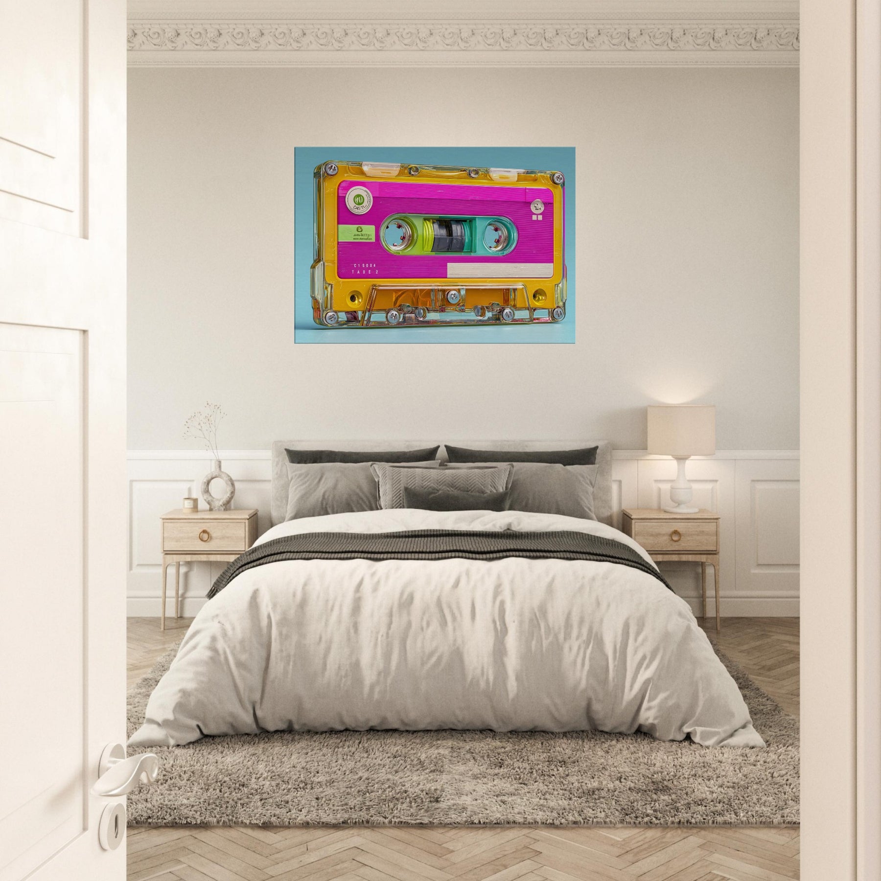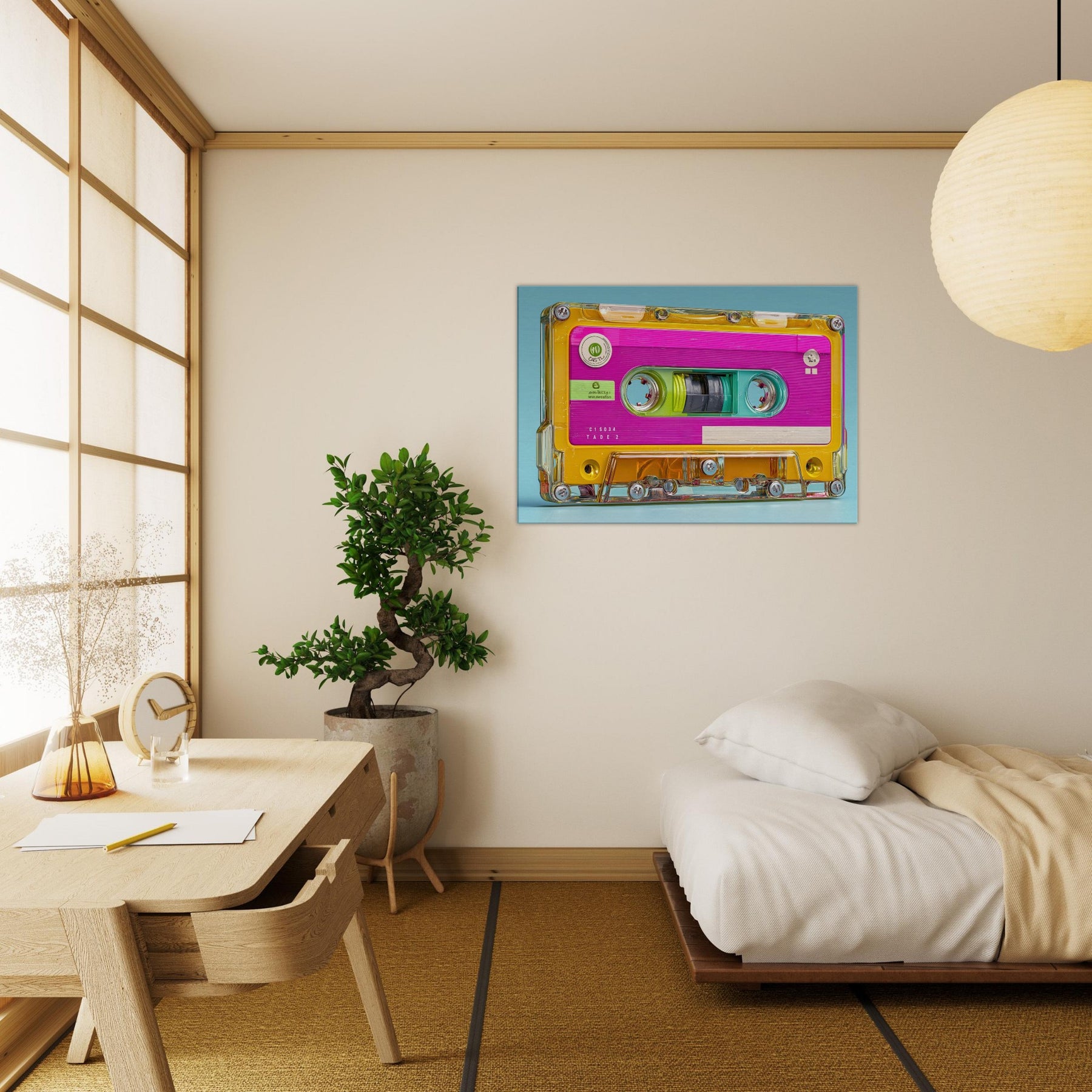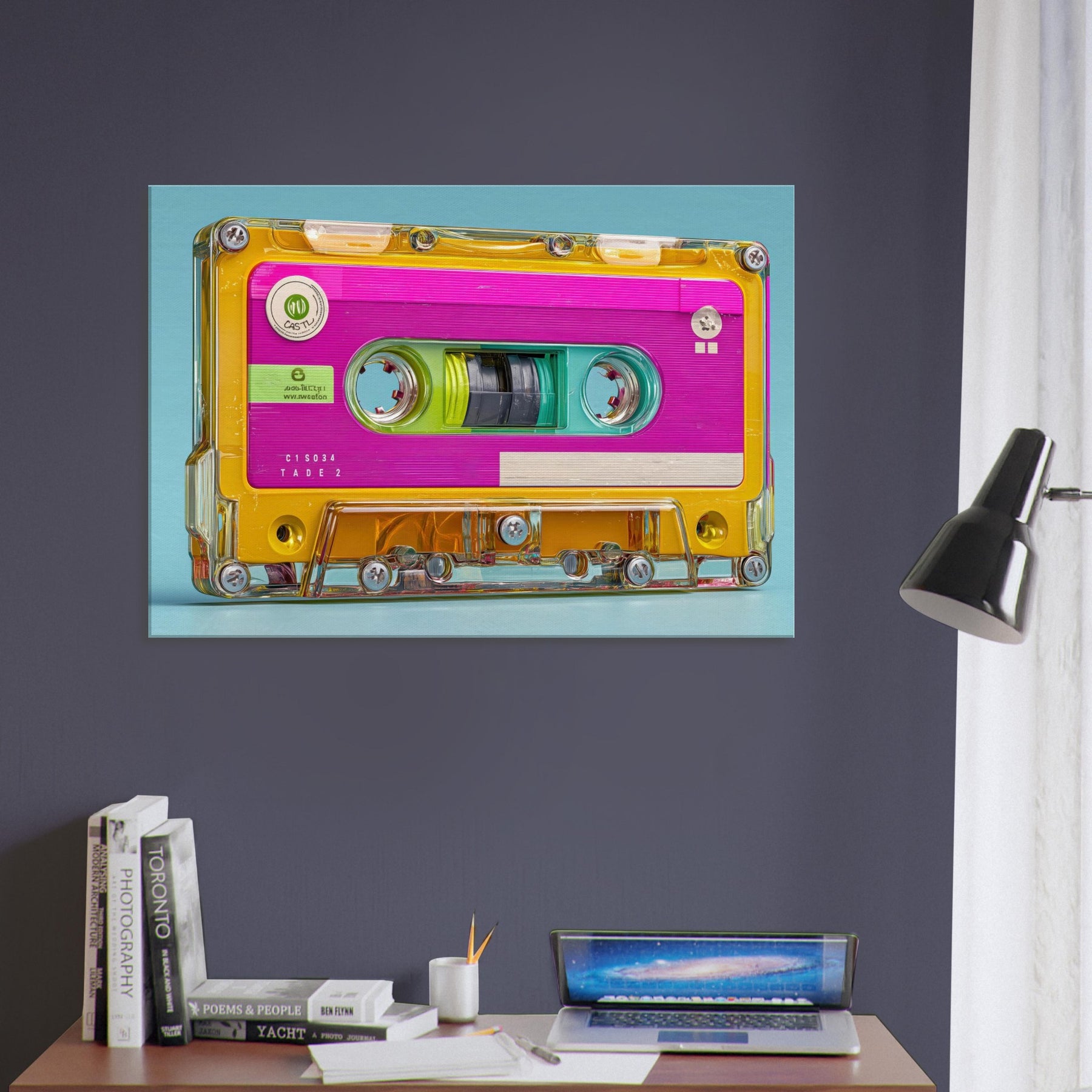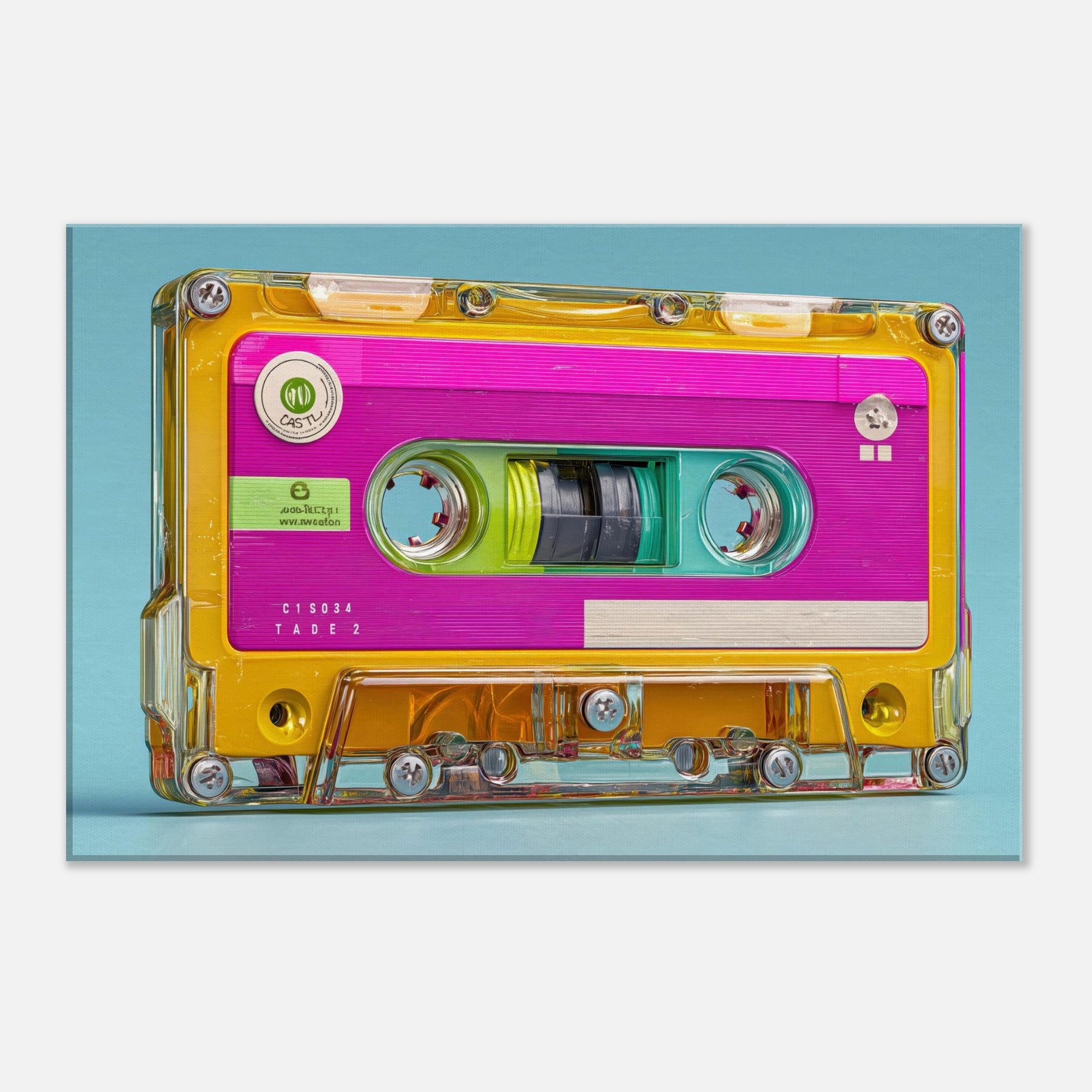 Let the Cassette Tape come alive in brilliant color, a playful collision of nostalgia and whimsy. This abstract interpretation glows with neon pinks, turquoise blues, and sunny yellows, inviting the eye to drift along its glossy contours. It quiets a busy room with a gentle hum of memory, turning a wall into a sensory corner where sound, texture, and light mingle. Perfect for living rooms or studios seeking warmth, energy, and a dash of retro poetry.