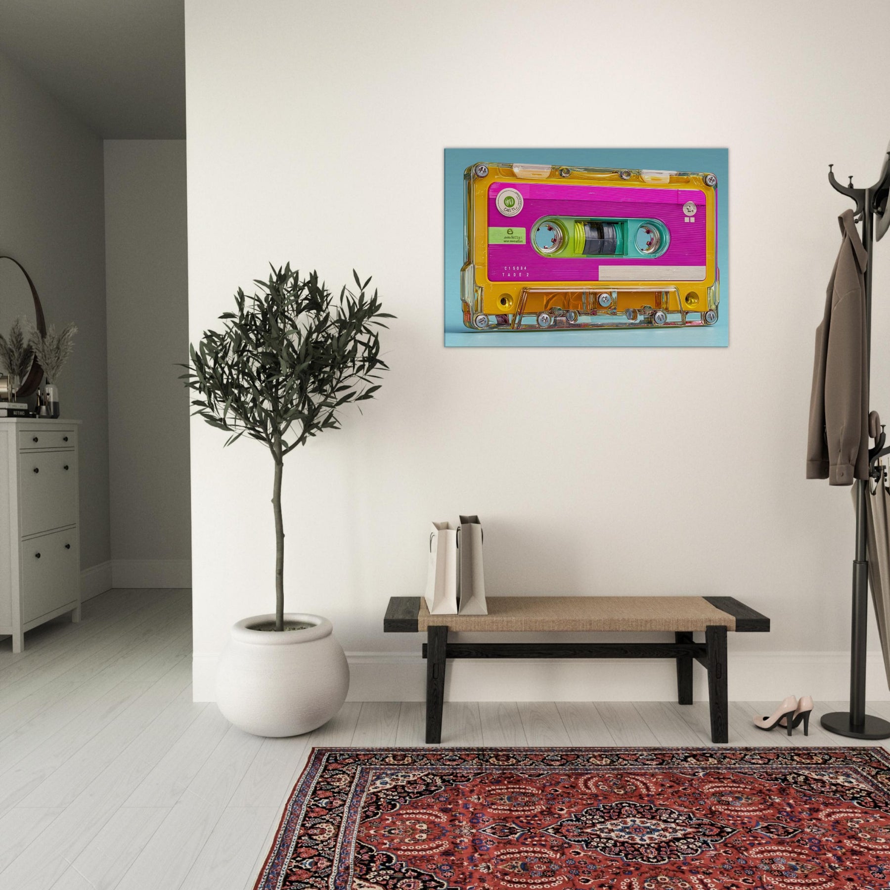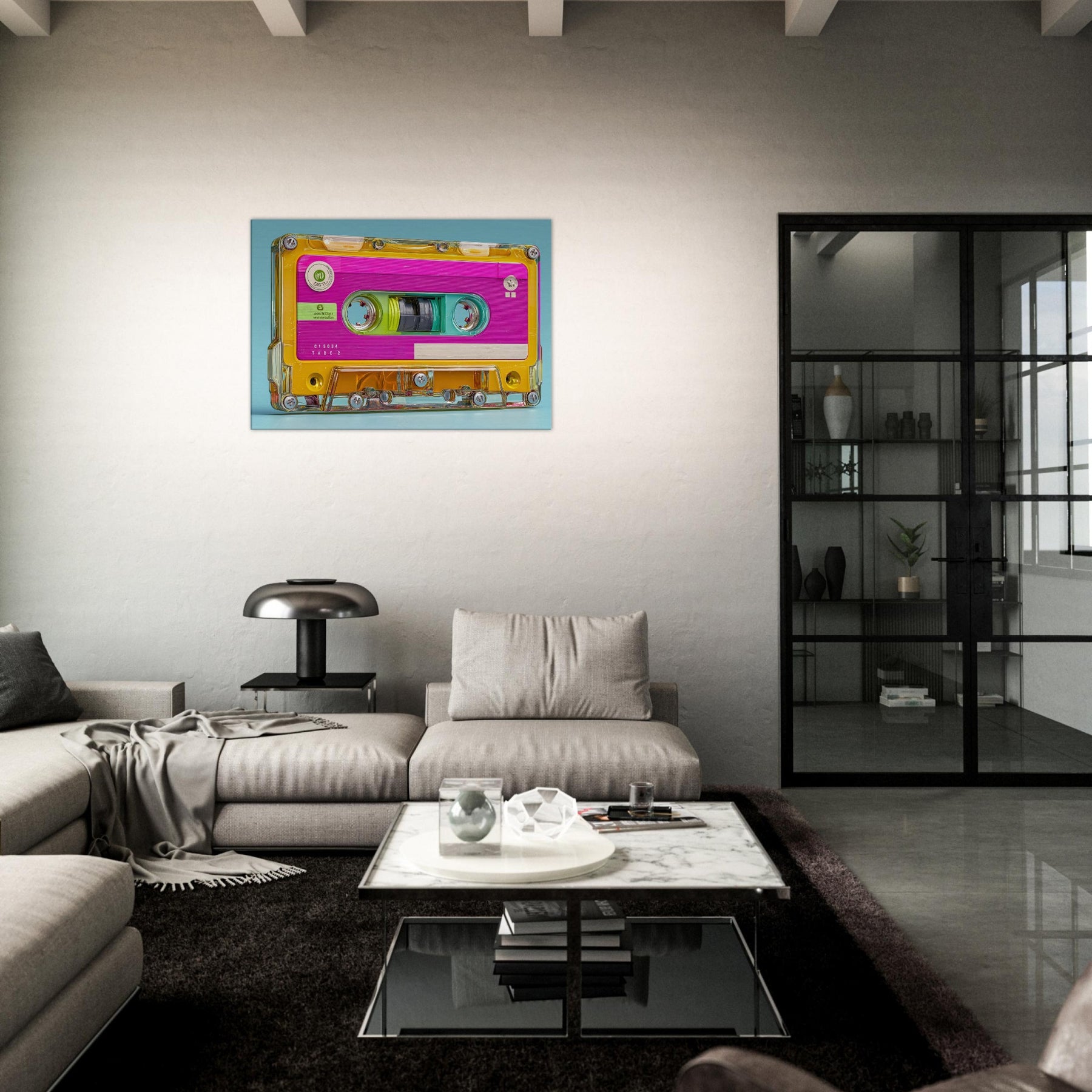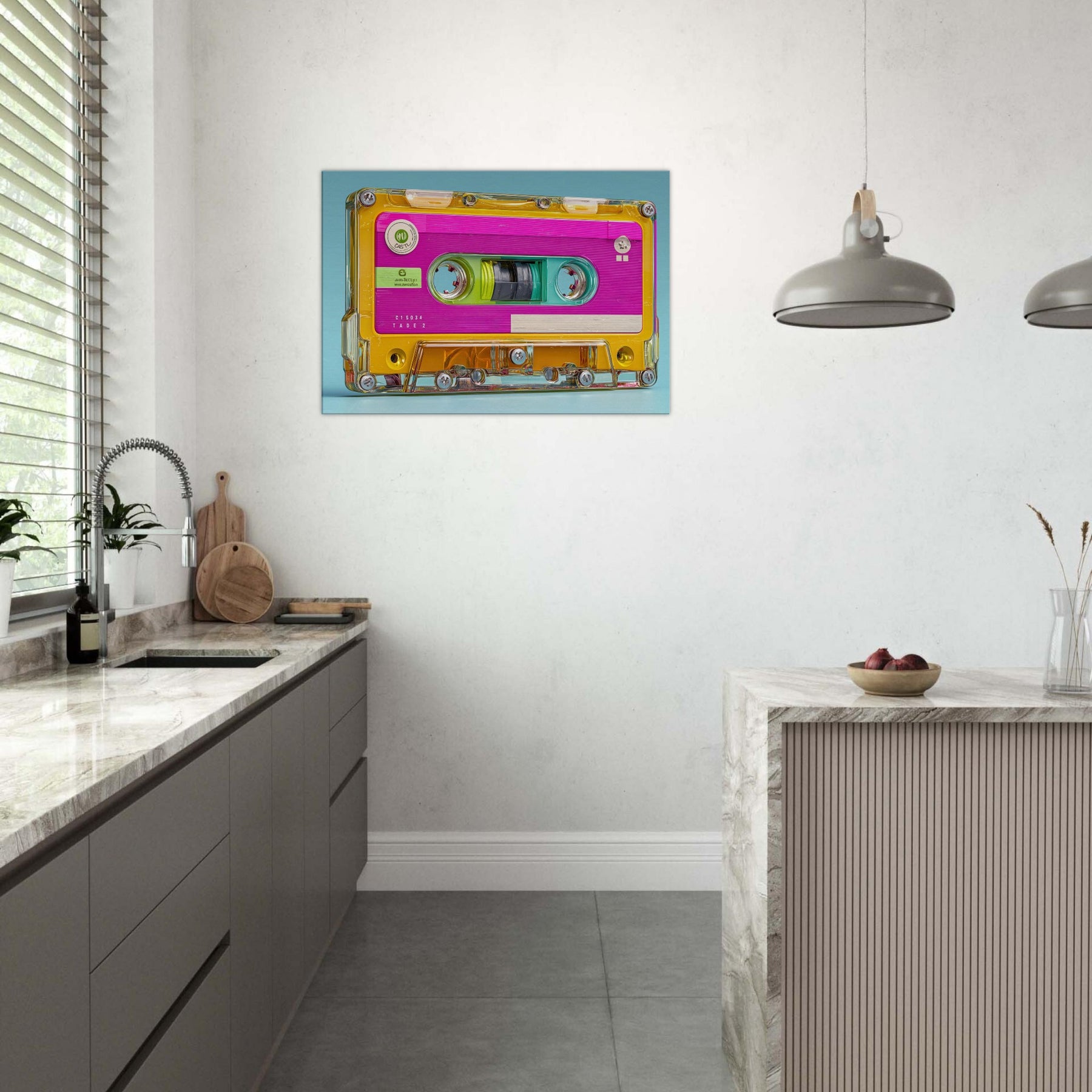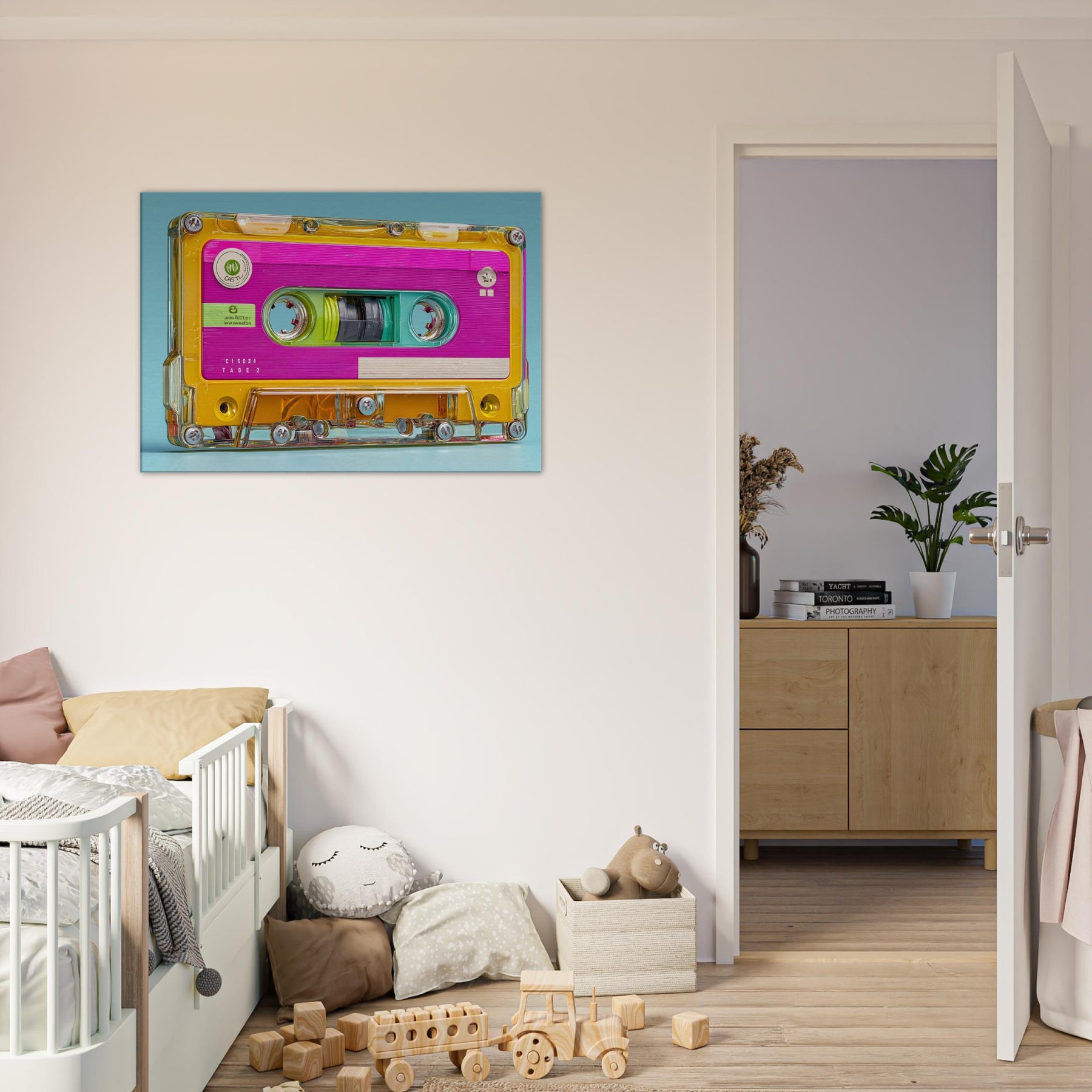 Let the Cassette Tape come alive in brilliant color, a playful collision of nostalgia and whimsy. This abstract interpretation glows with neon pinks, turquoise blues, and sunny yellows, inviting the eye to drift along its glossy contours. It quiets a busy room with a gentle hum of memory, turning a wall into a sensory corner where sound, texture, and light mingle. Perfect for living rooms or studios seeking warmth, energy, and a dash of retro poetry.