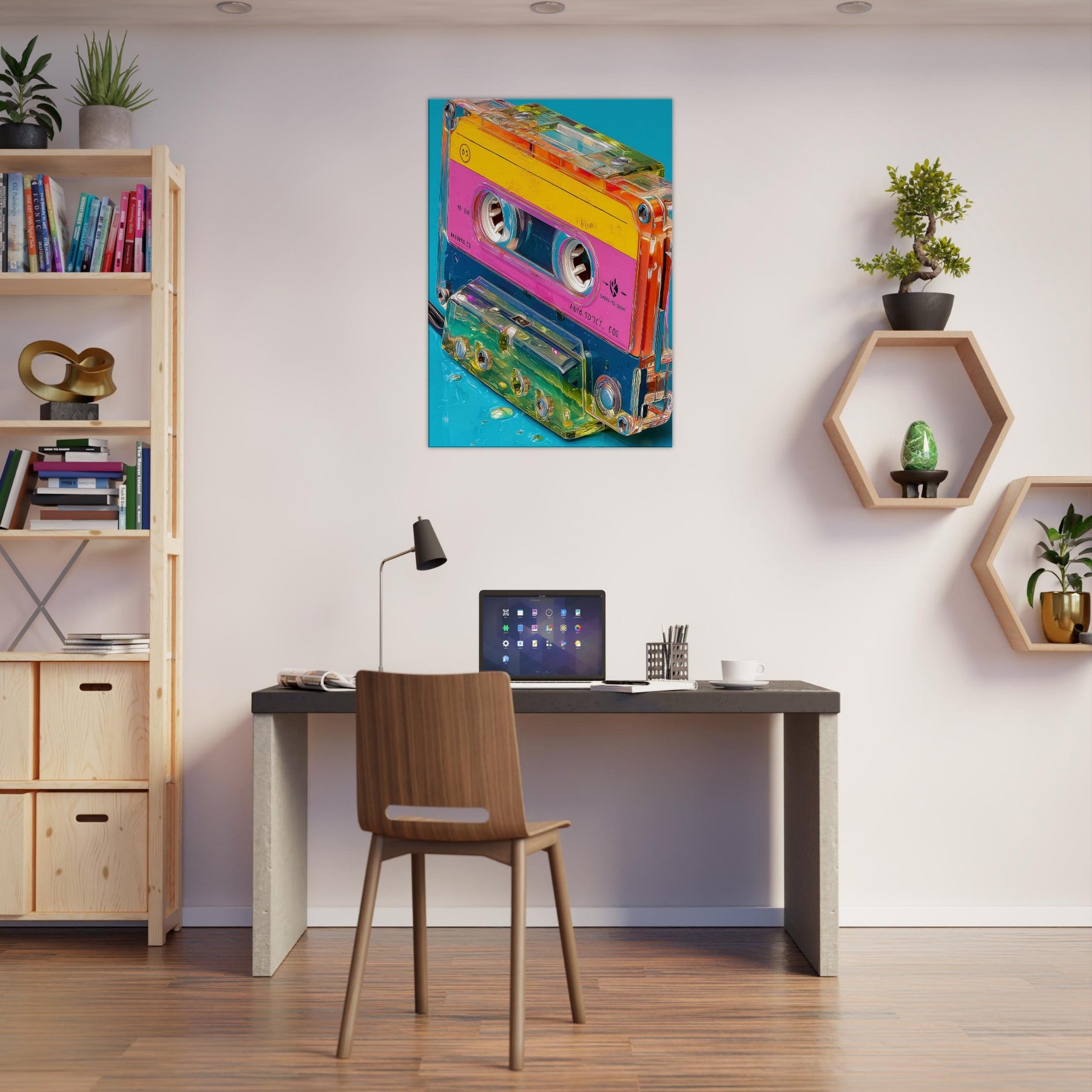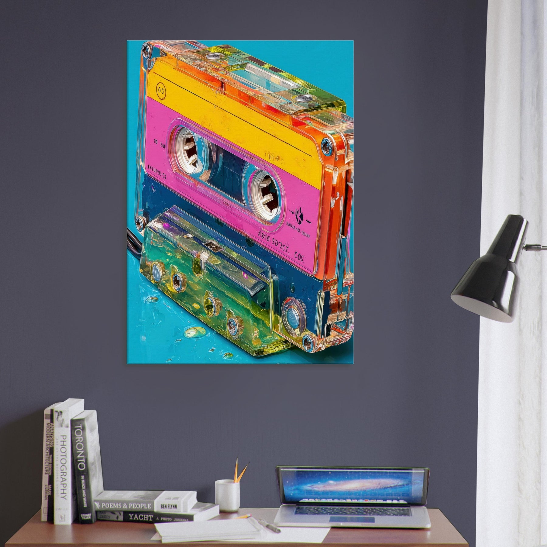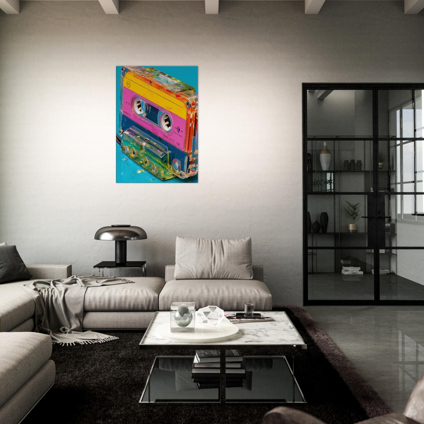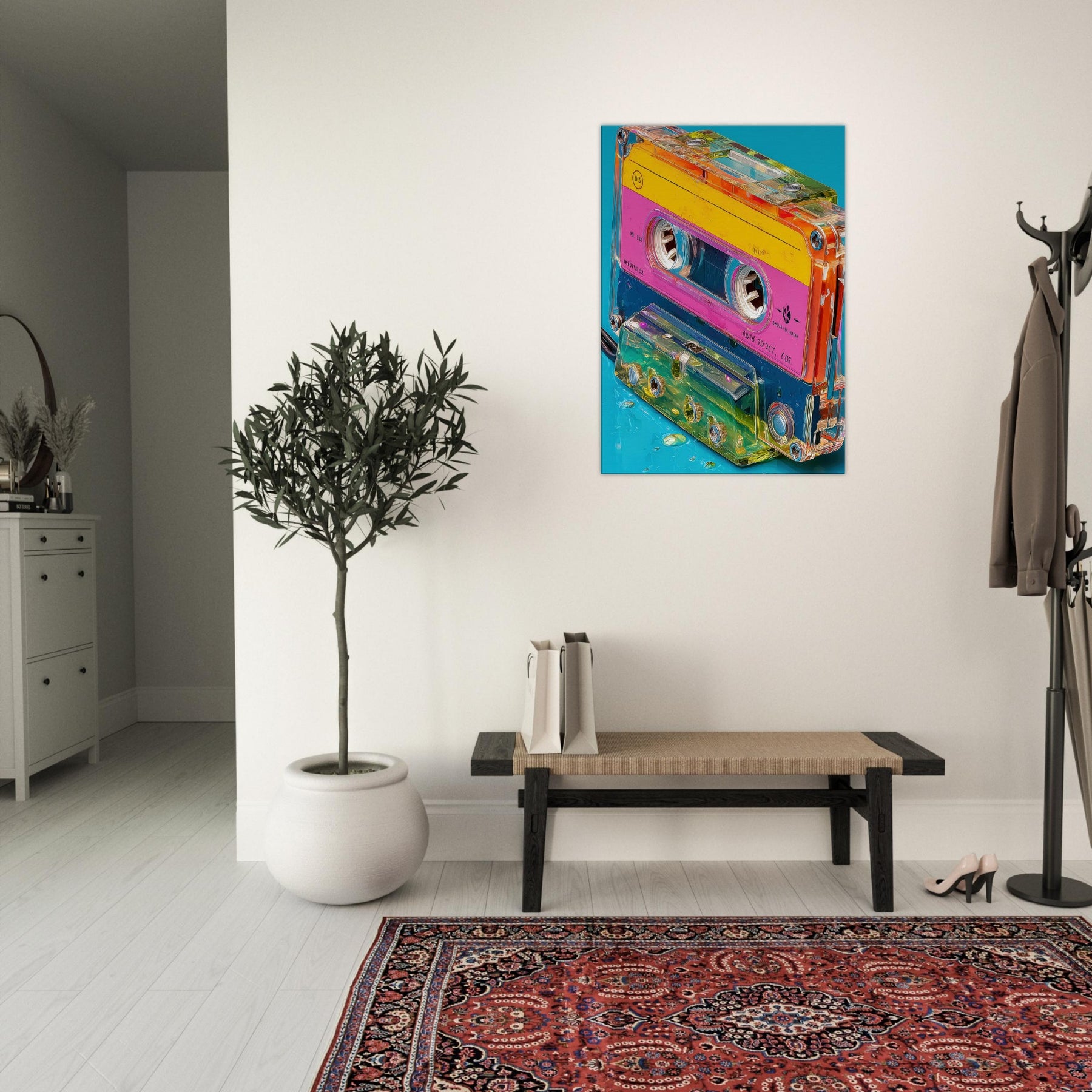 Cassette Tape unfolds into an electric dream, a kinetic field of color and light that invites you to listen with your eyes. This abstract composition turns a retro icon into a living room companion: the glossy ribbons of hue pulse with energy, the air thick with museum friendly nostalgia. Perfect above a sofa or in a sunny hallway, it shifts with the day’s moods, enriching textures, reflections, and quiet moments of contemplation.