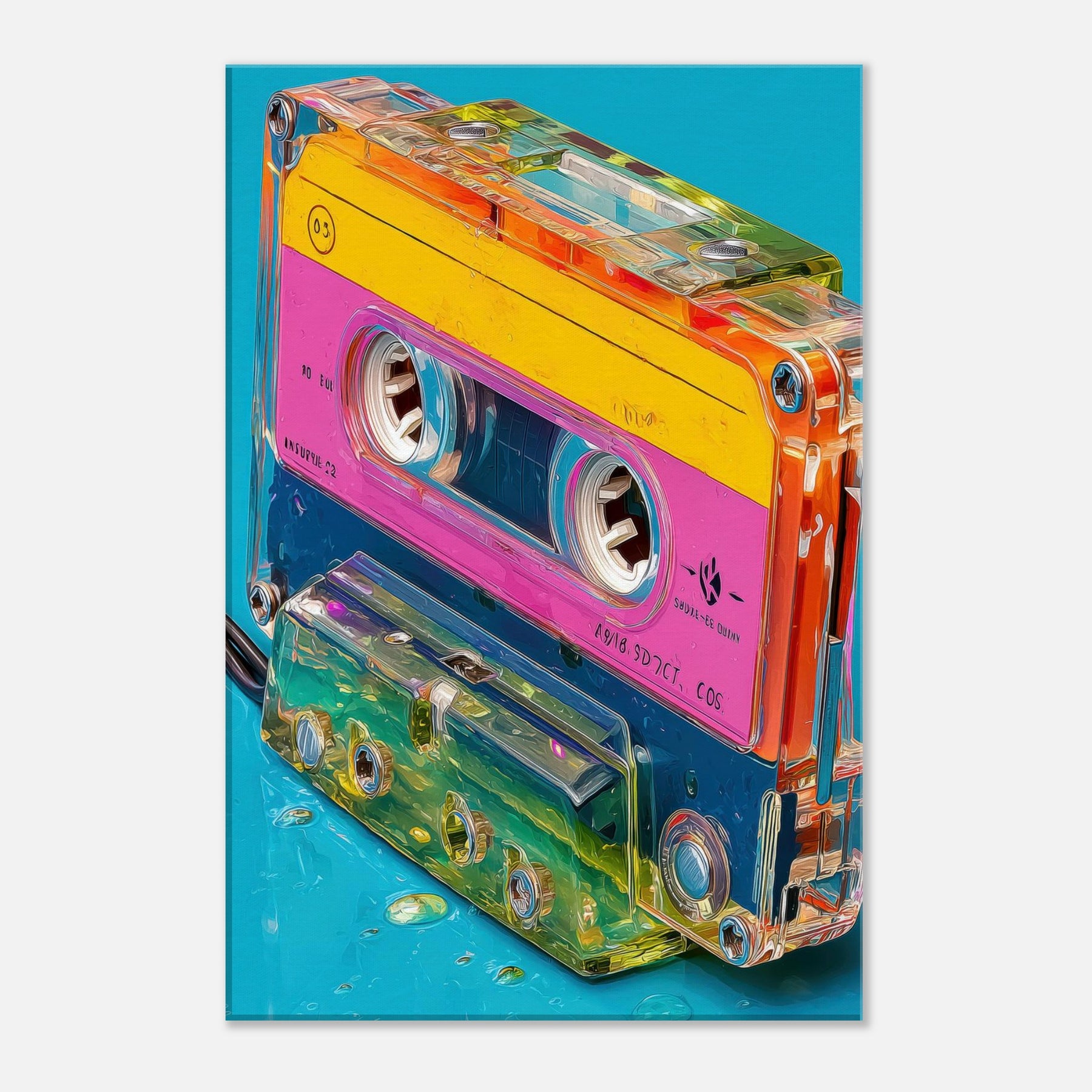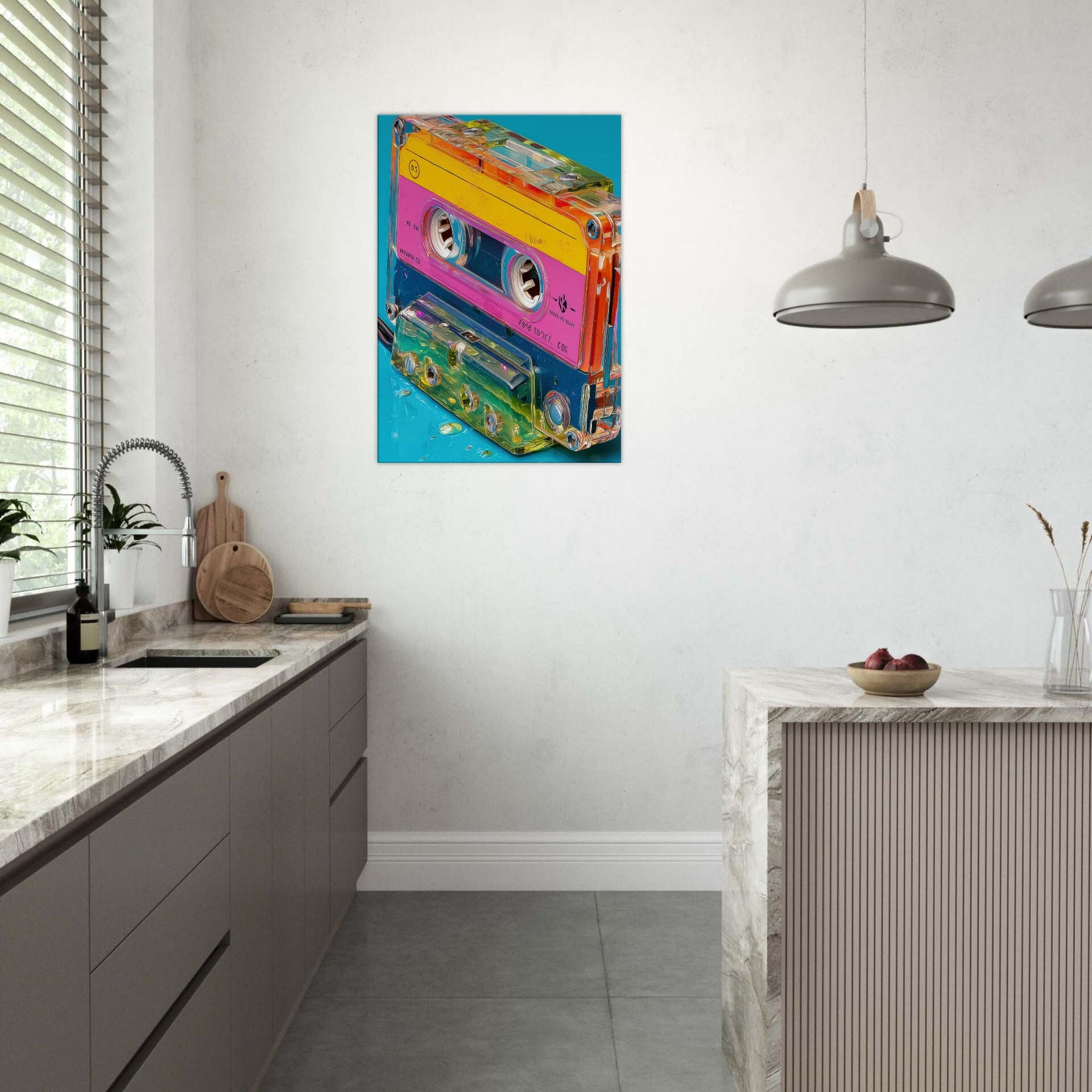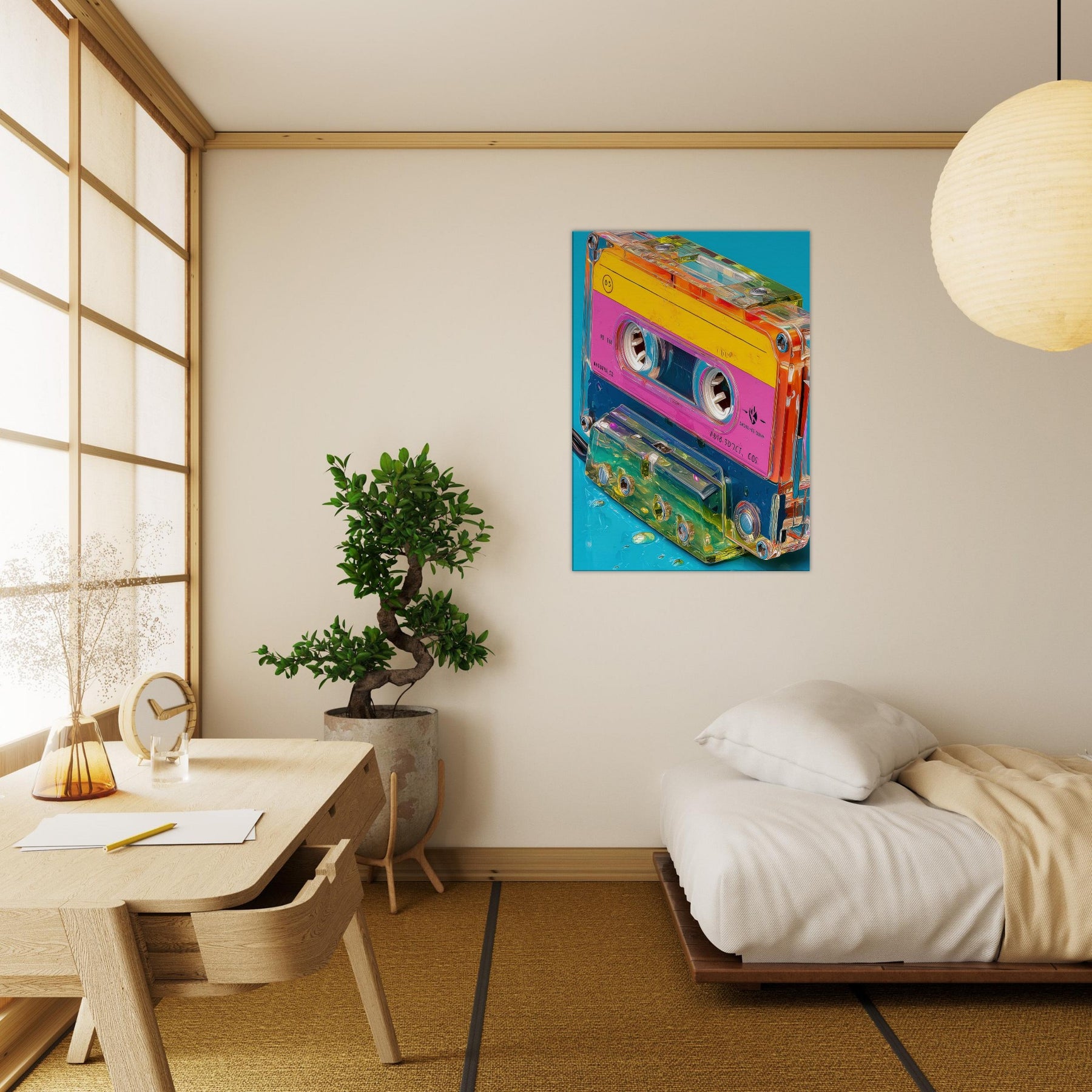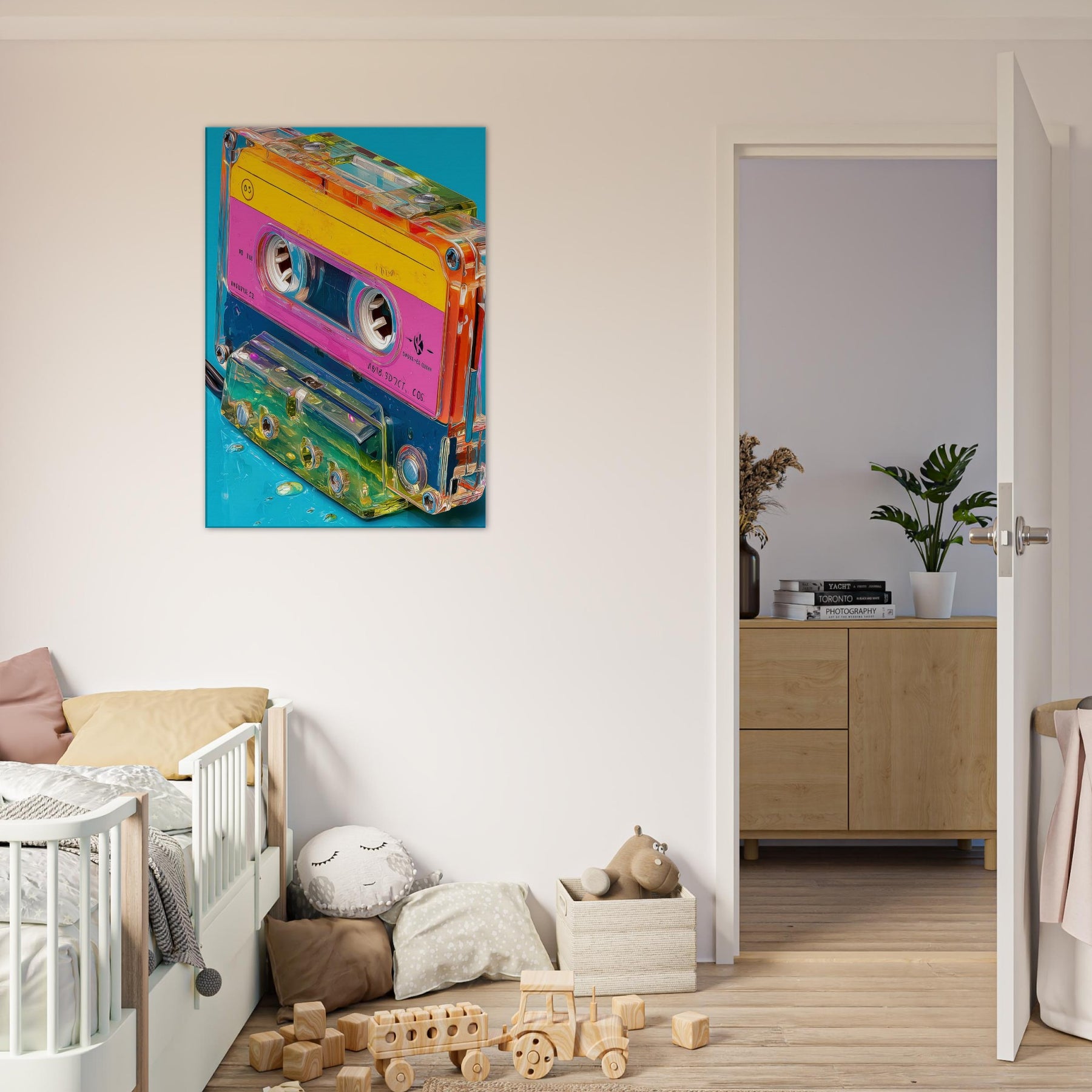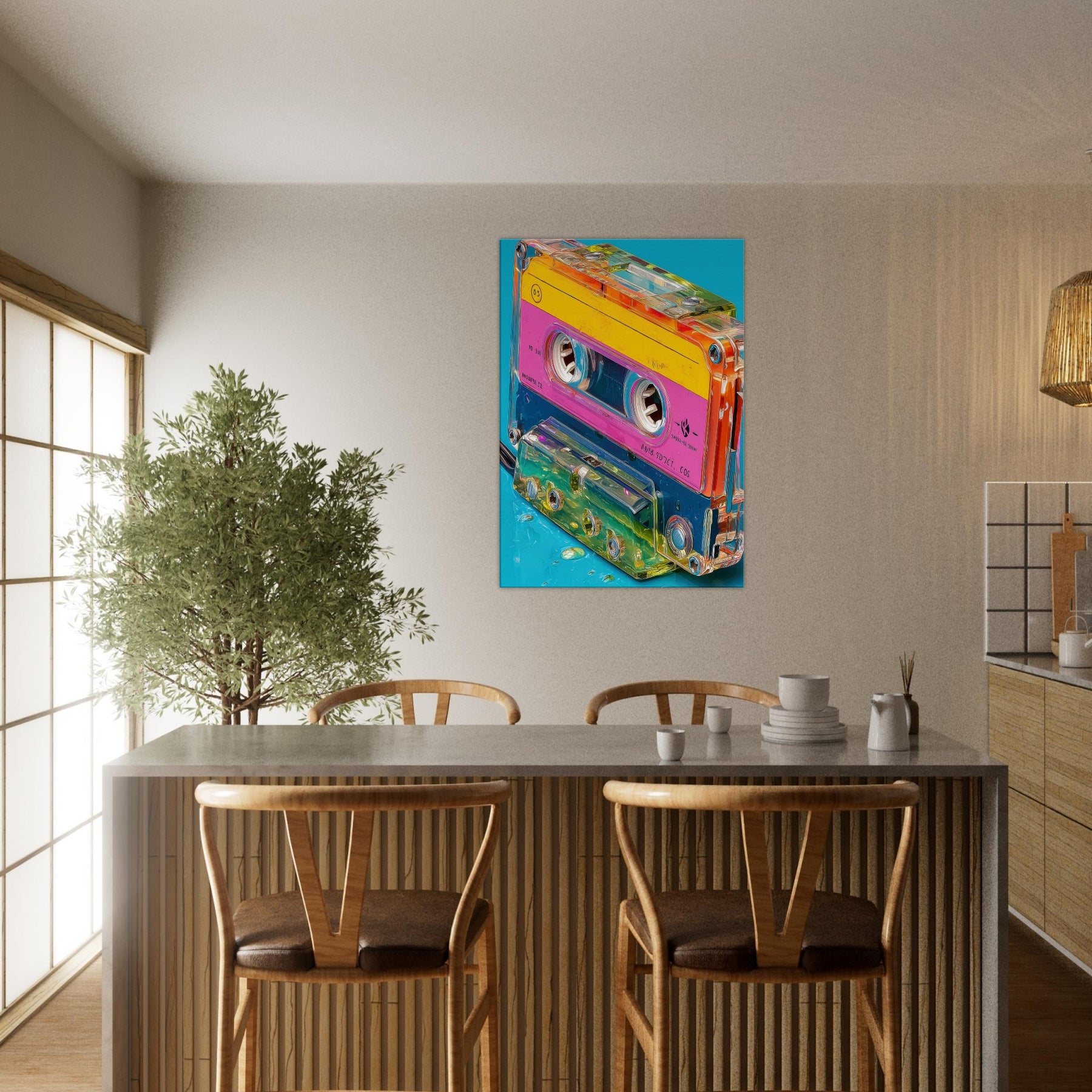 Cassette Tape unfolds into an electric dream, a kinetic field of color and light that invites you to listen with your eyes. This abstract composition turns a retro icon into a living room companion: the glossy ribbons of hue pulse with energy, the air thick with museum friendly nostalgia. Perfect above a sofa or in a sunny hallway, it shifts with the day’s moods, enriching textures, reflections, and quiet moments of contemplation.