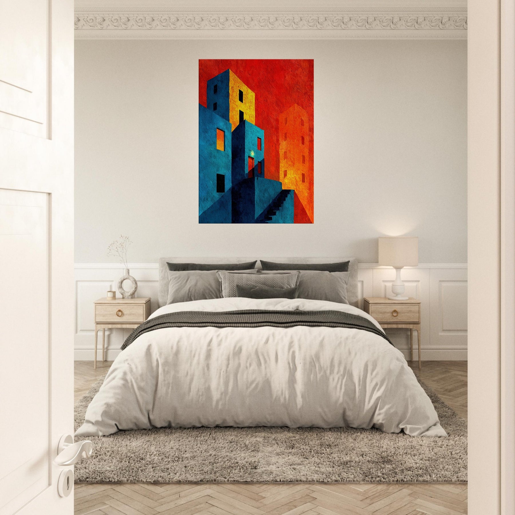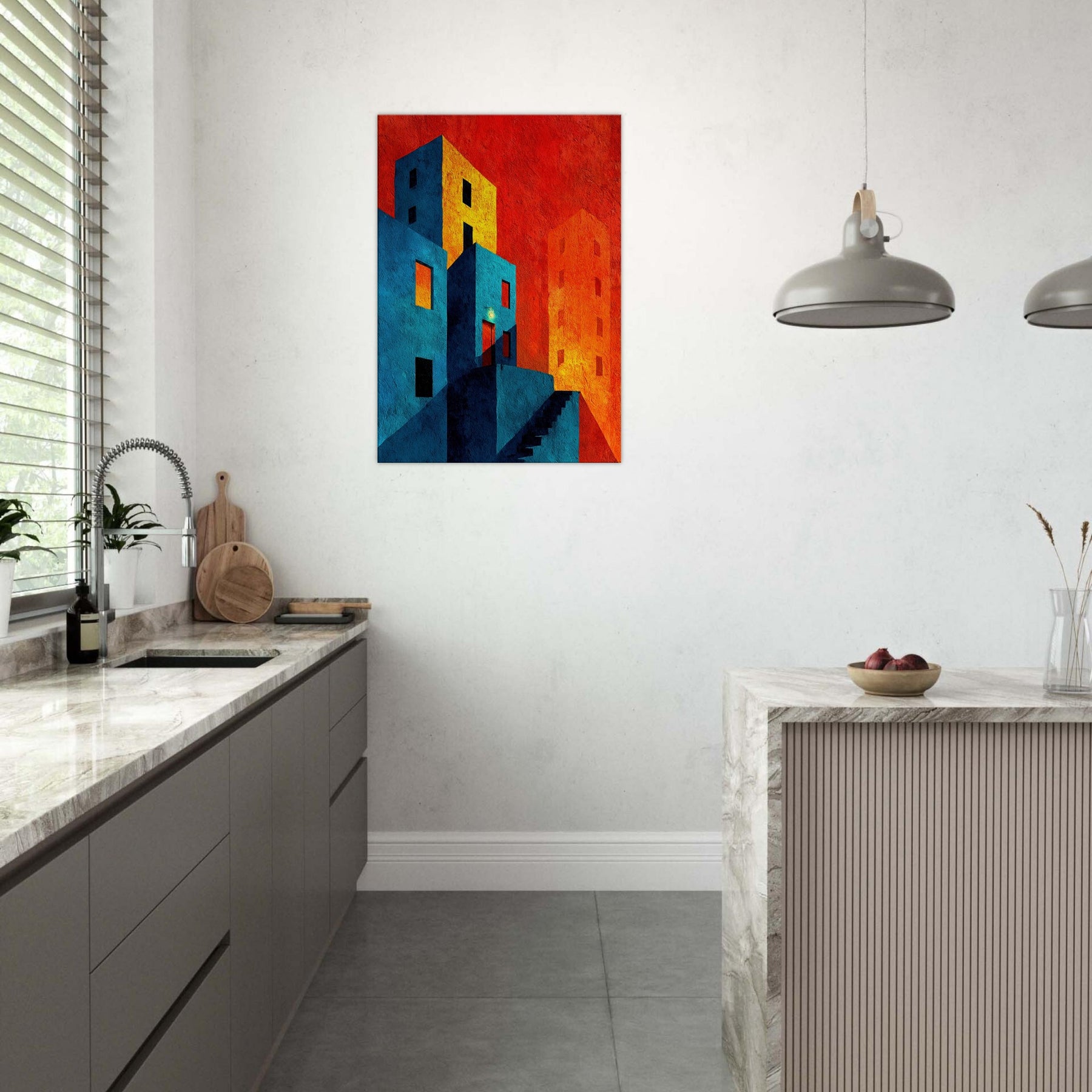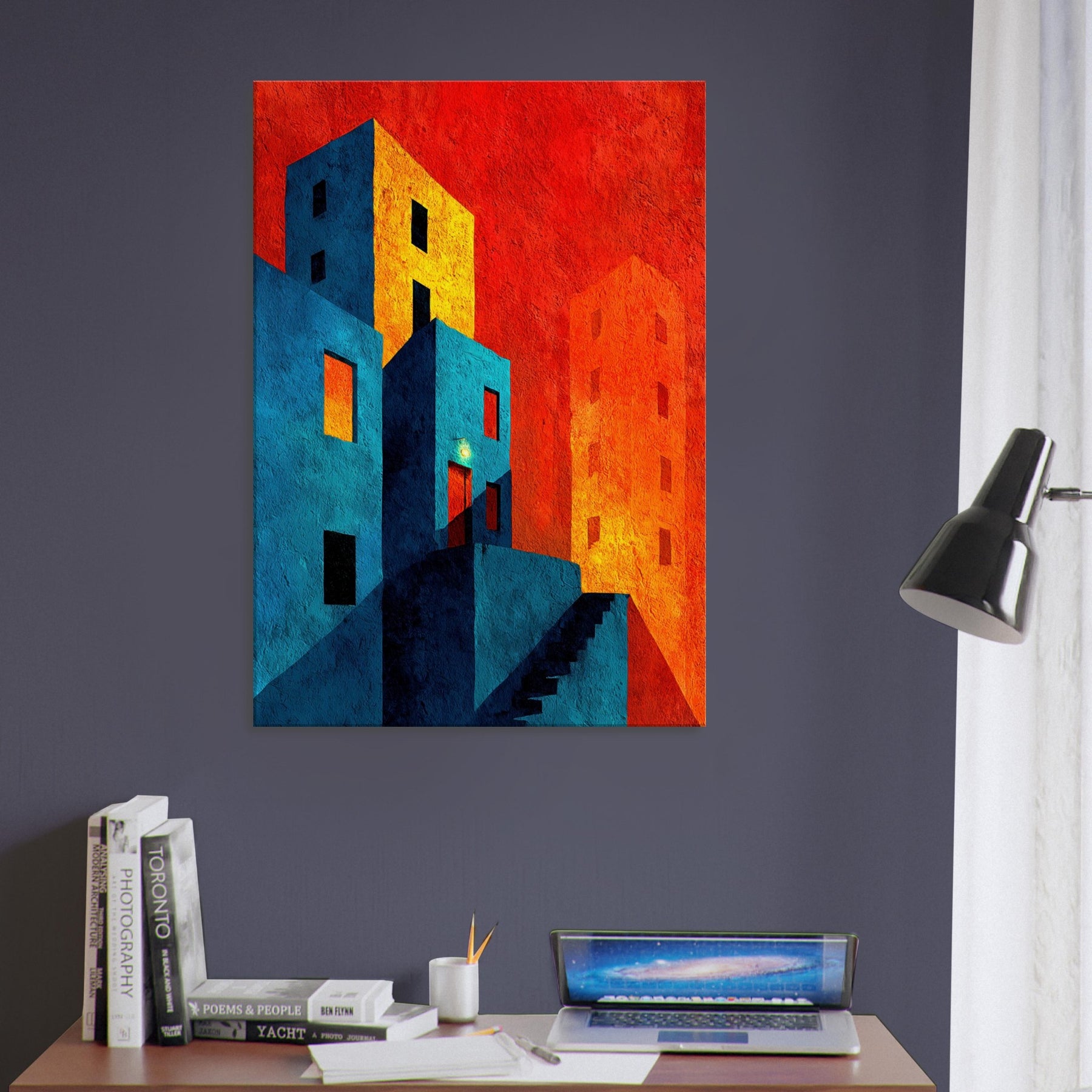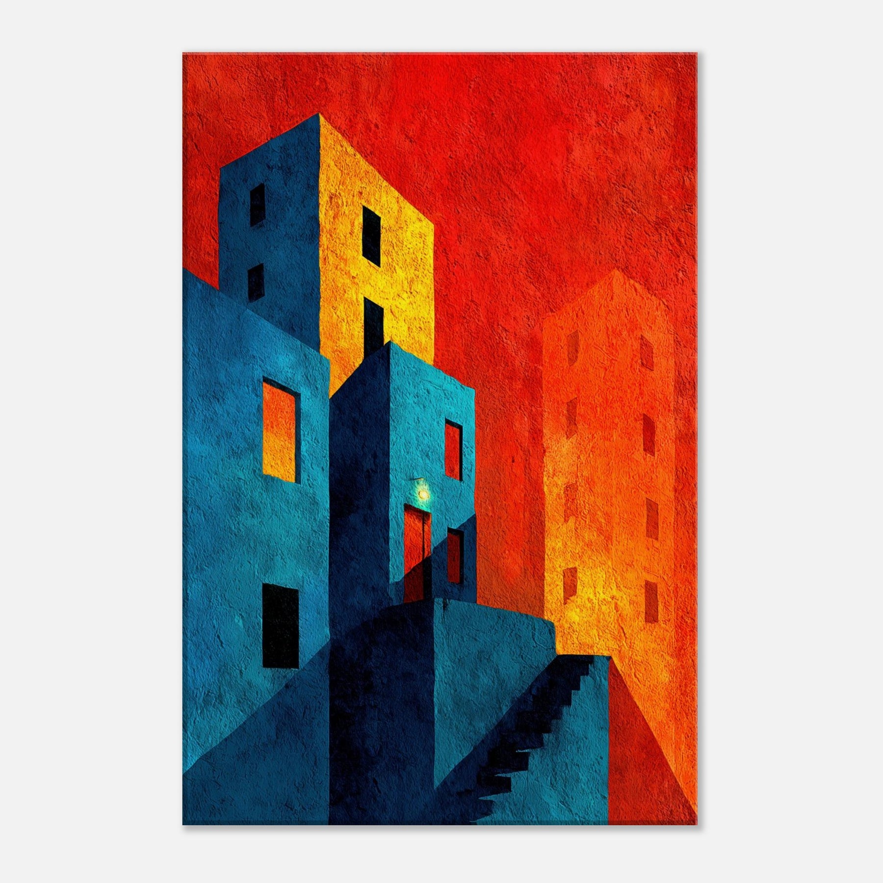 Let New York unfold beyond your wall in a collision of color and form. This abstract cityscape bathes in electric blues and warm tangerine, where stairways become riverbeds of light and windows glow like distant stars. The piece invites quiet contemplation in a bustling world, wrapping your living space in a tactile memory of neon nights and urban rhythms. Hang it where conversation slows and the room learns to breathe an artful horizon that feels both intimate and expansive, anchoring your home in optimistic energy.