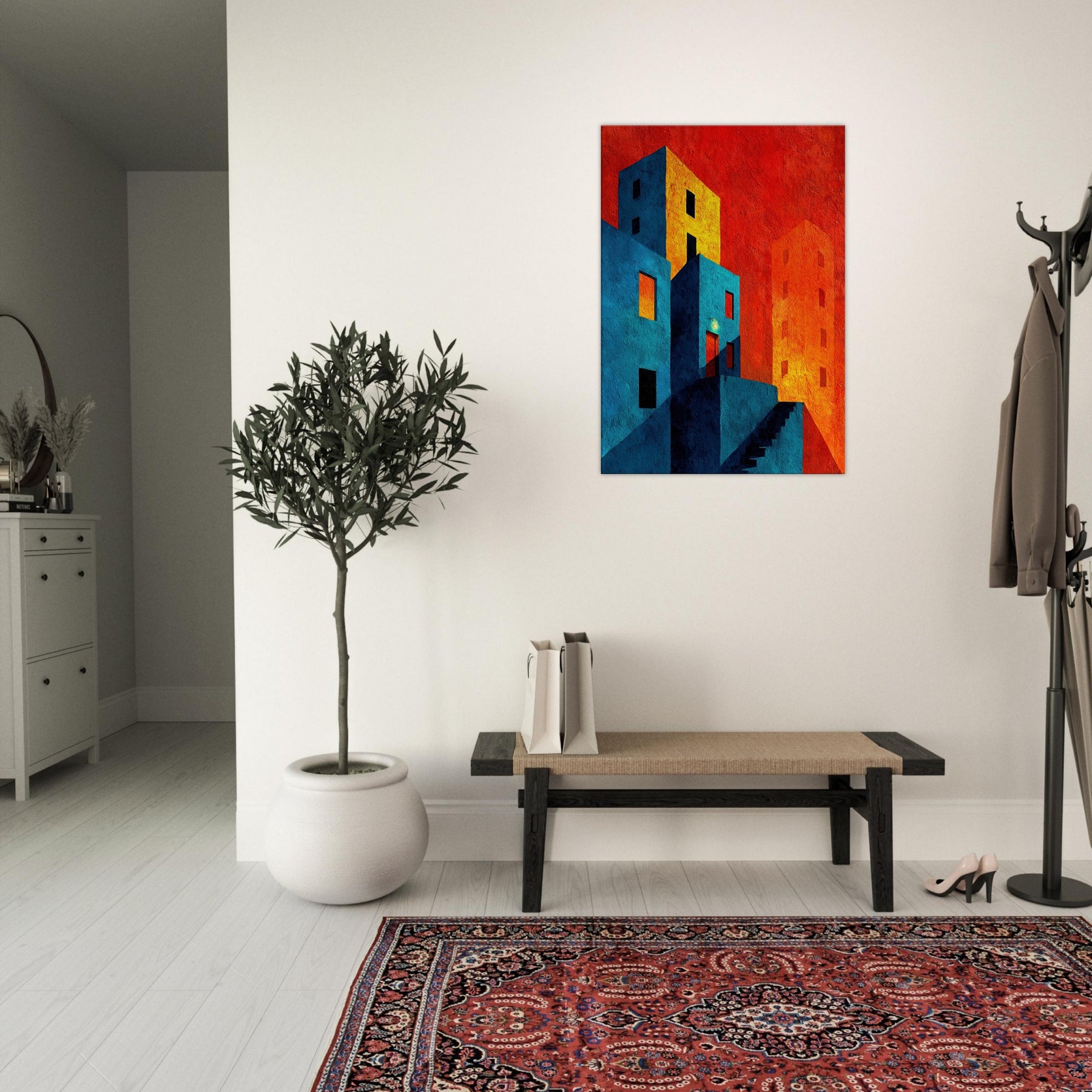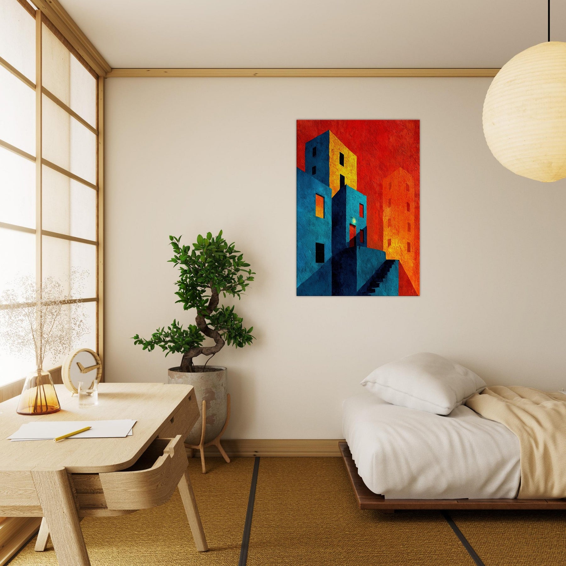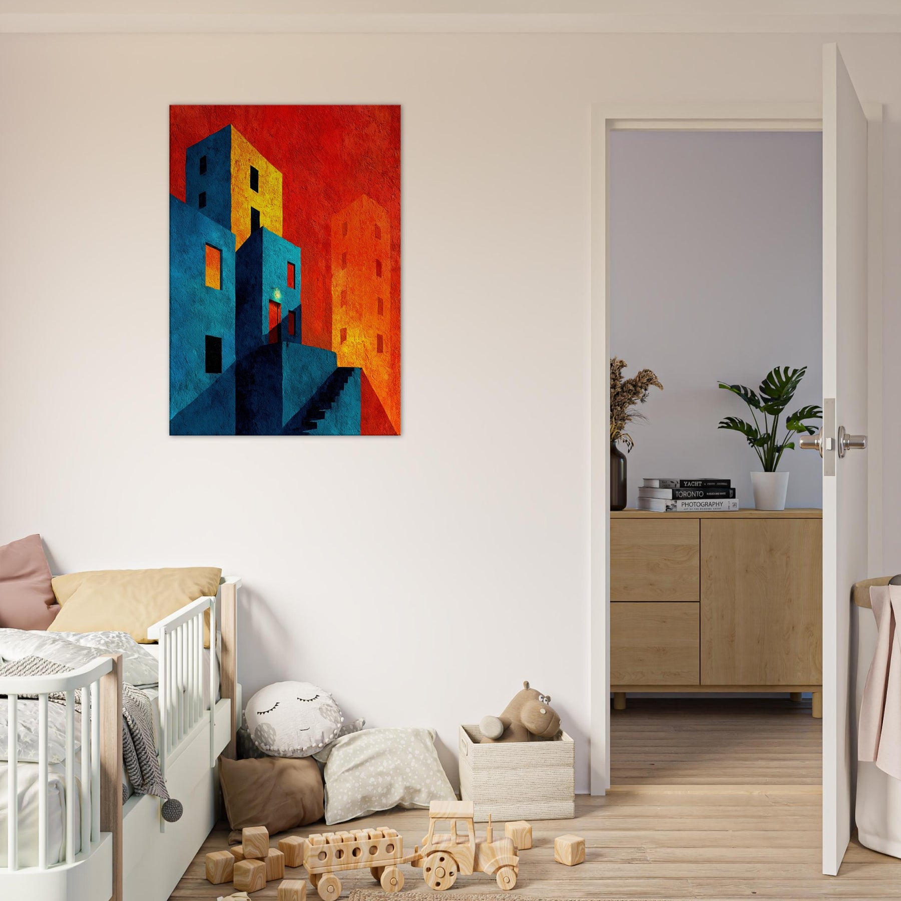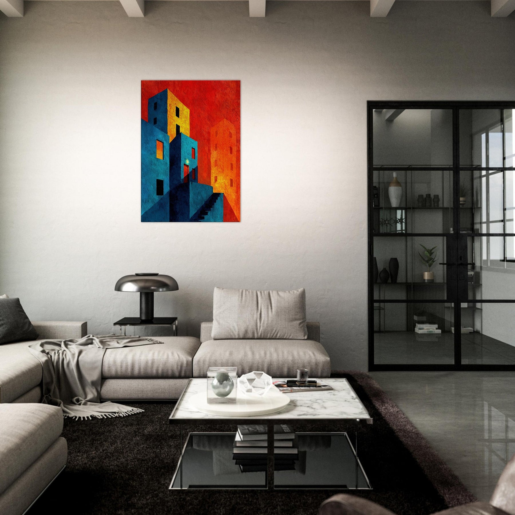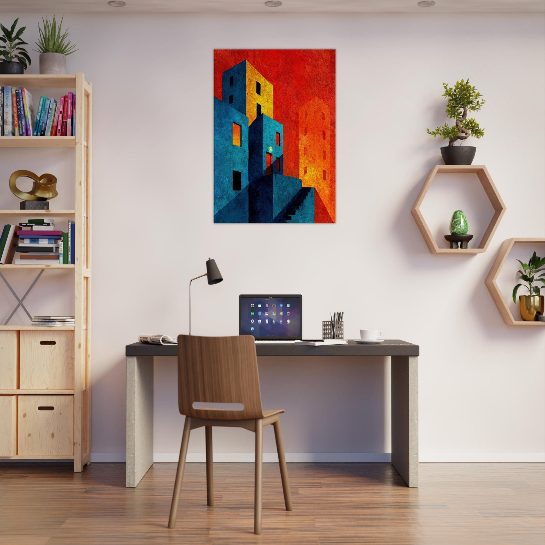Let New York unfold beyond your wall in a collision of color and form. This abstract cityscape bathes in electric blues and warm tangerine, where stairways become riverbeds of light and windows glow like distant stars. The piece invites quiet contemplation in a bustling world, wrapping your living space in a tactile memory of neon nights and urban rhythms. Hang it where conversation slows and the room learns to breathe an artful horizon that feels both intimate and expansive, anchoring your home in optimistic energy.