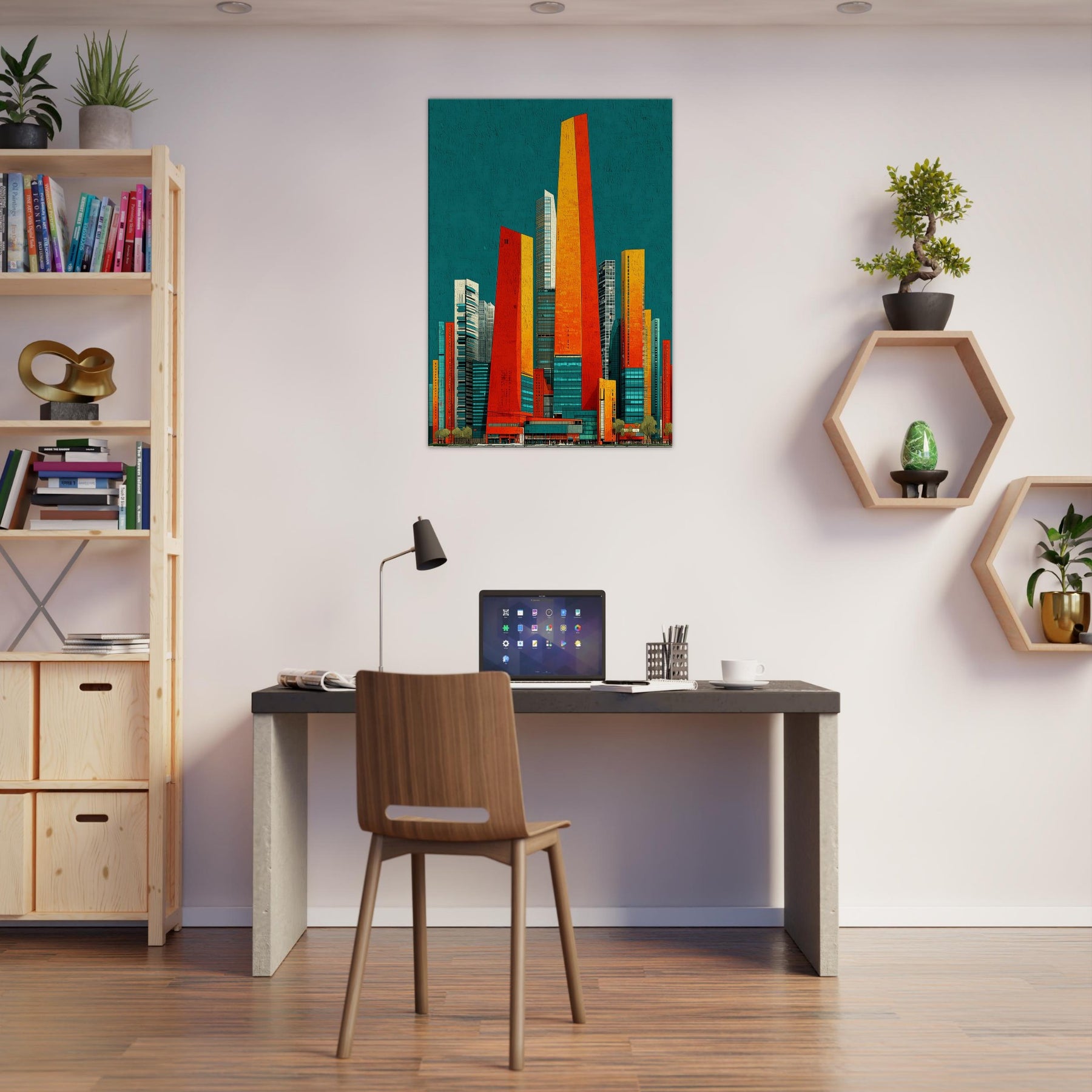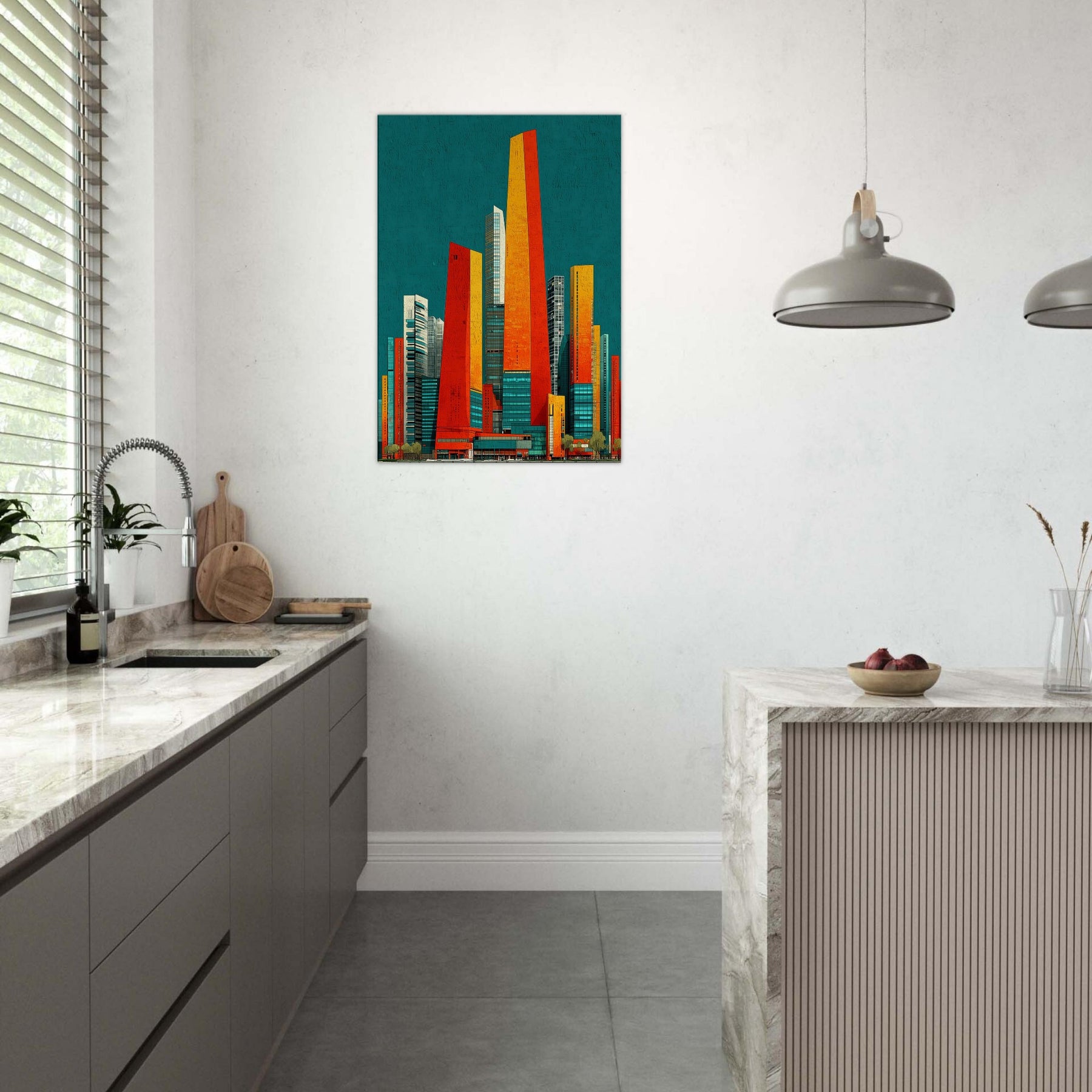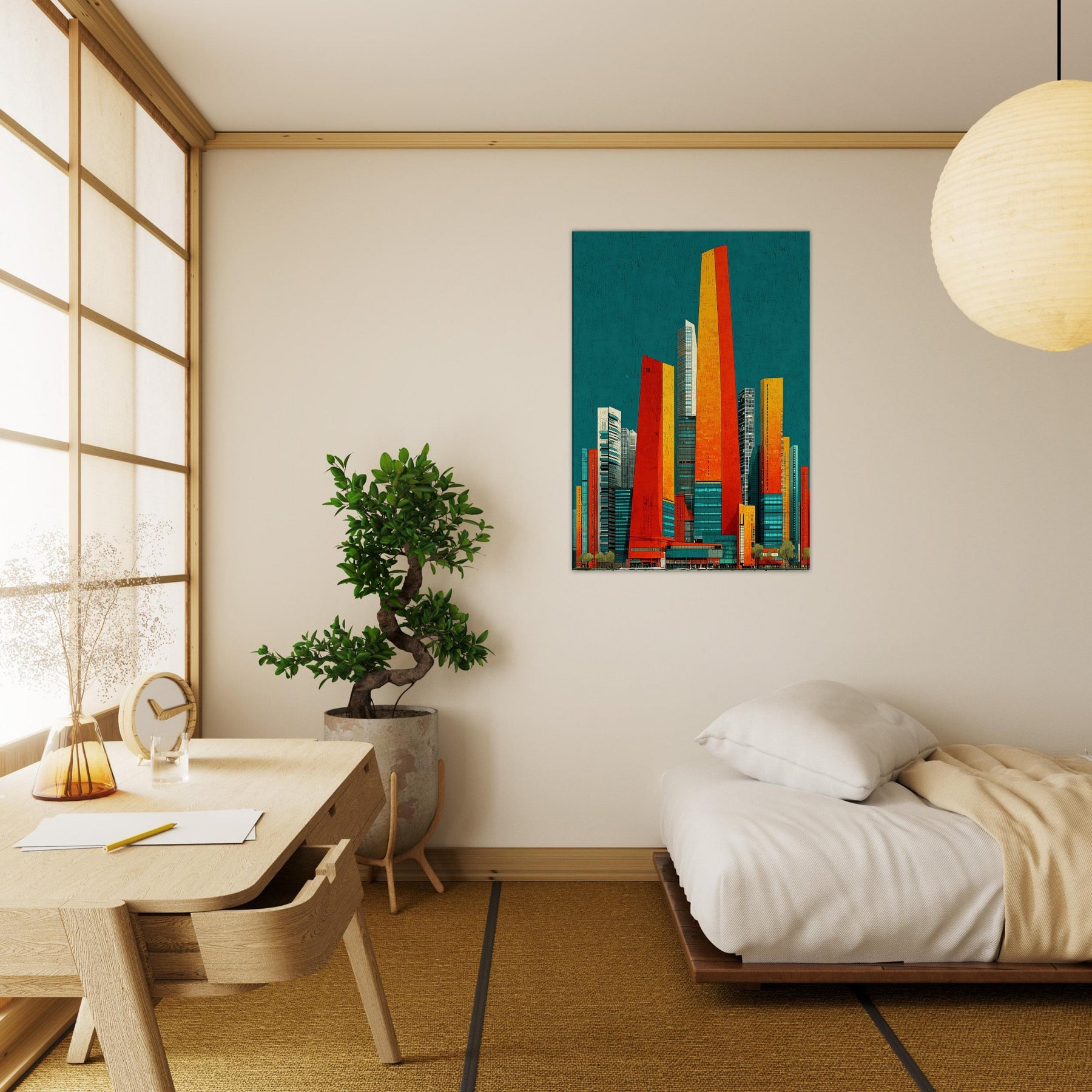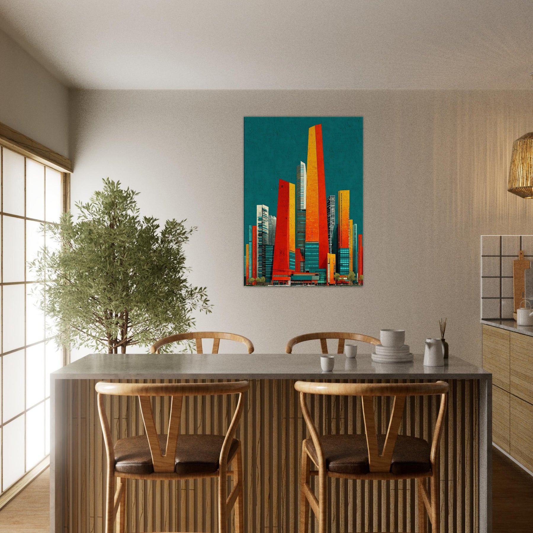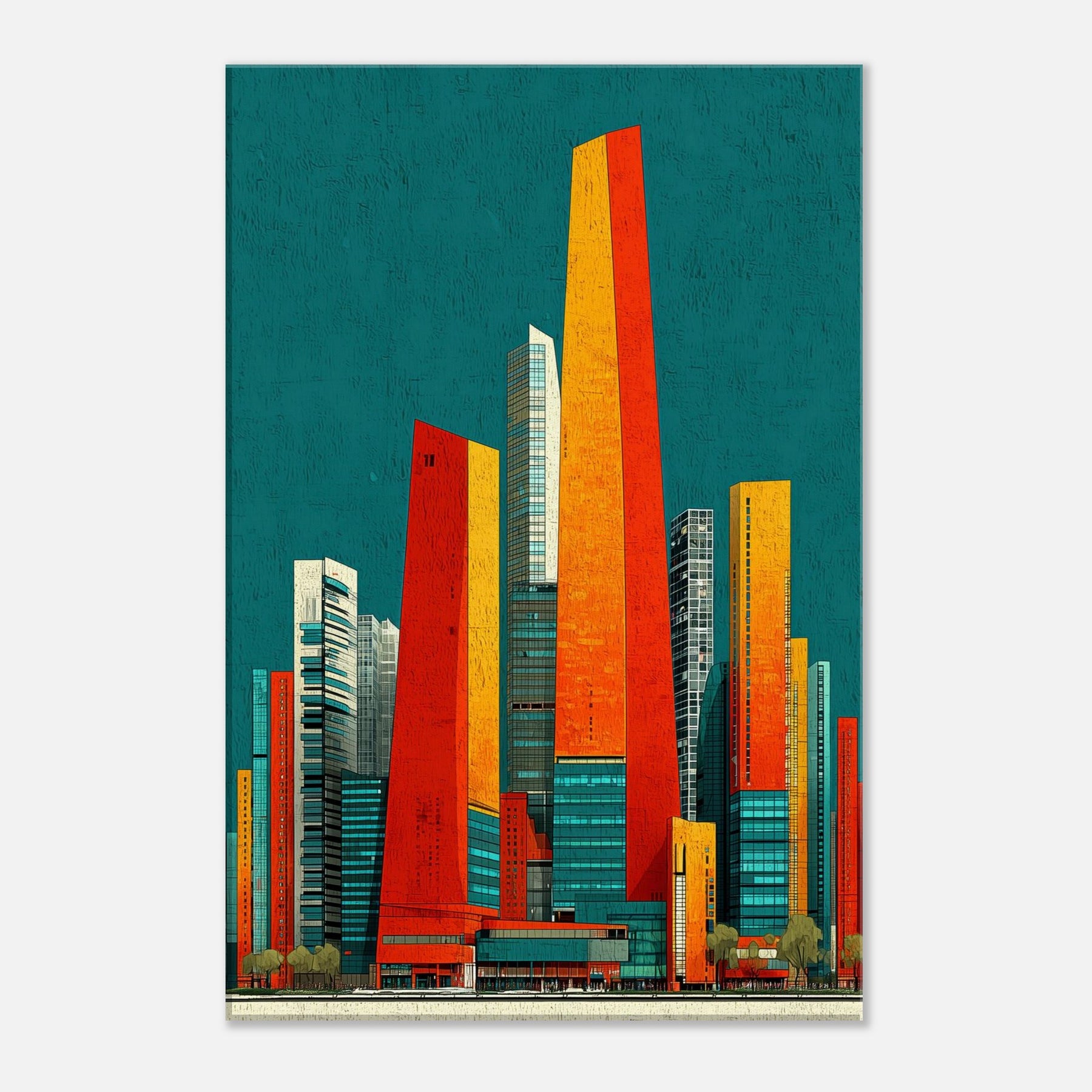 Seoul rises in your living room as a luminous skyline distilled into ribbons of orange, red, and sunlit gold. The teal backdrop hums with city night, a balance of warmth and breathless space. Its abstract geometry evokes steel, glass, and movement, inviting touch and imagination. Hang it in a living area or office and watch the room shimmer with energy, depth, and ritual. A statement piece that enhances atmosphere, guiding conversation and making every moment feel newly urban and alive.
