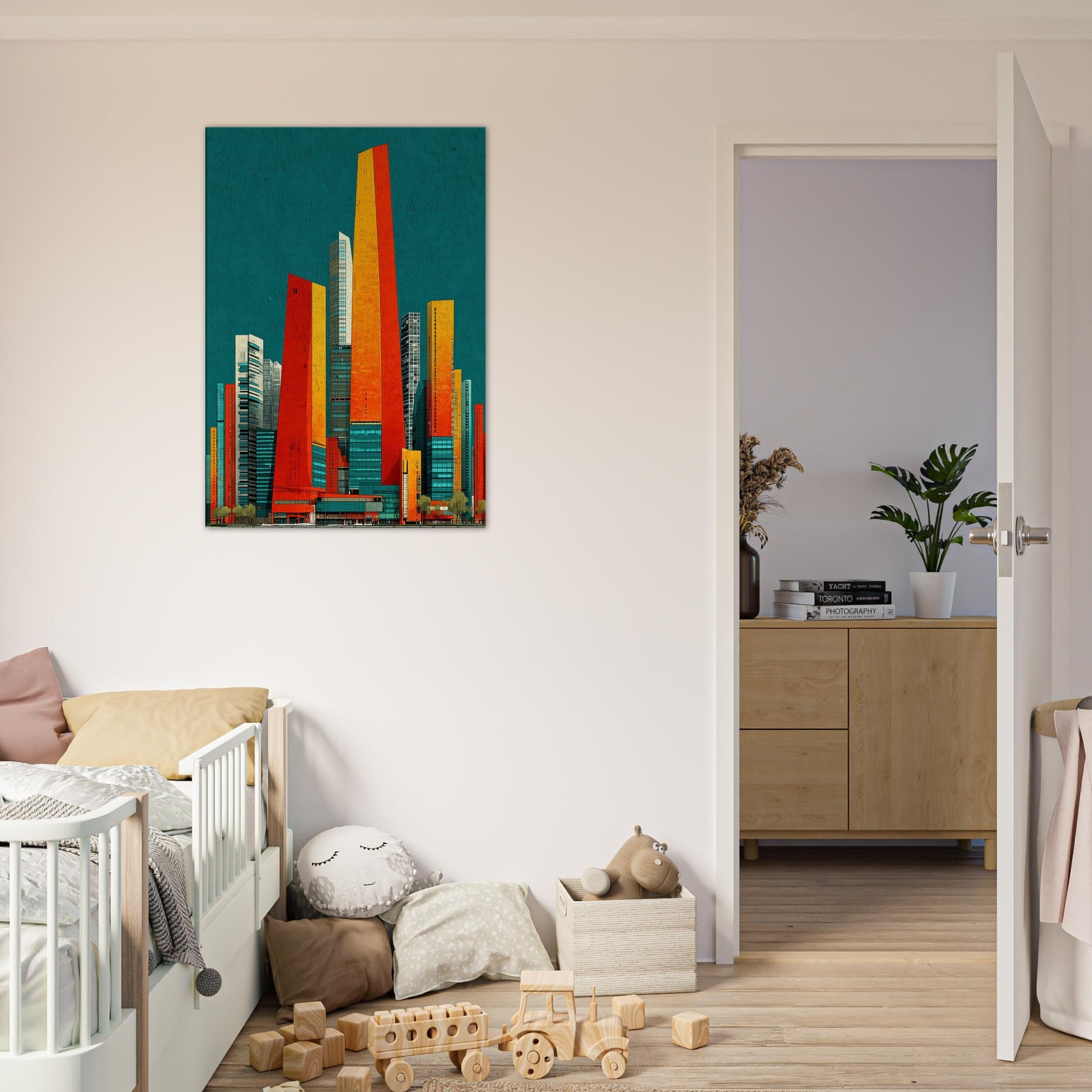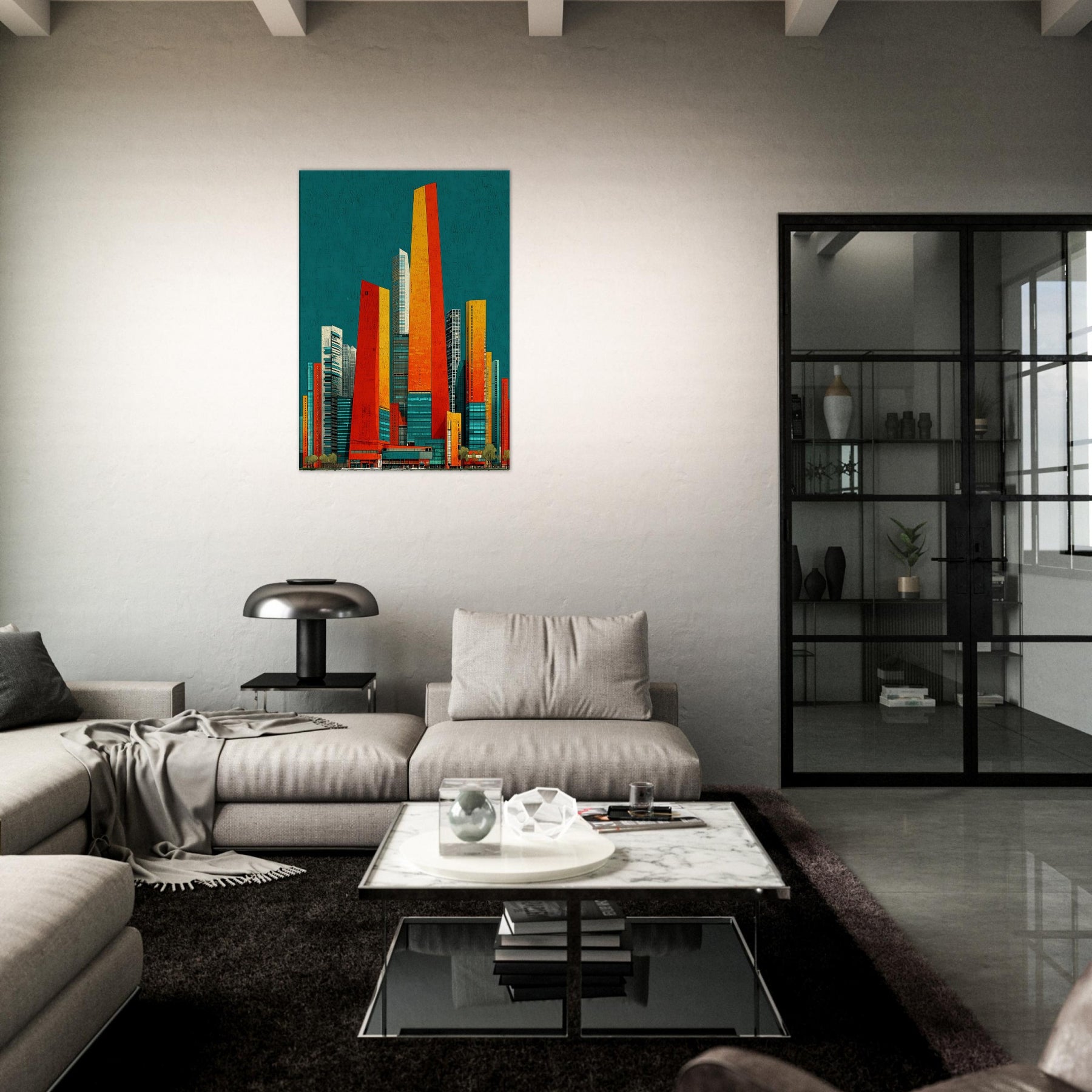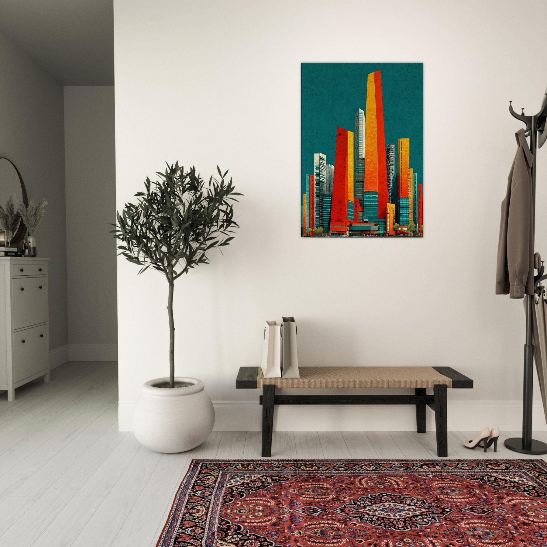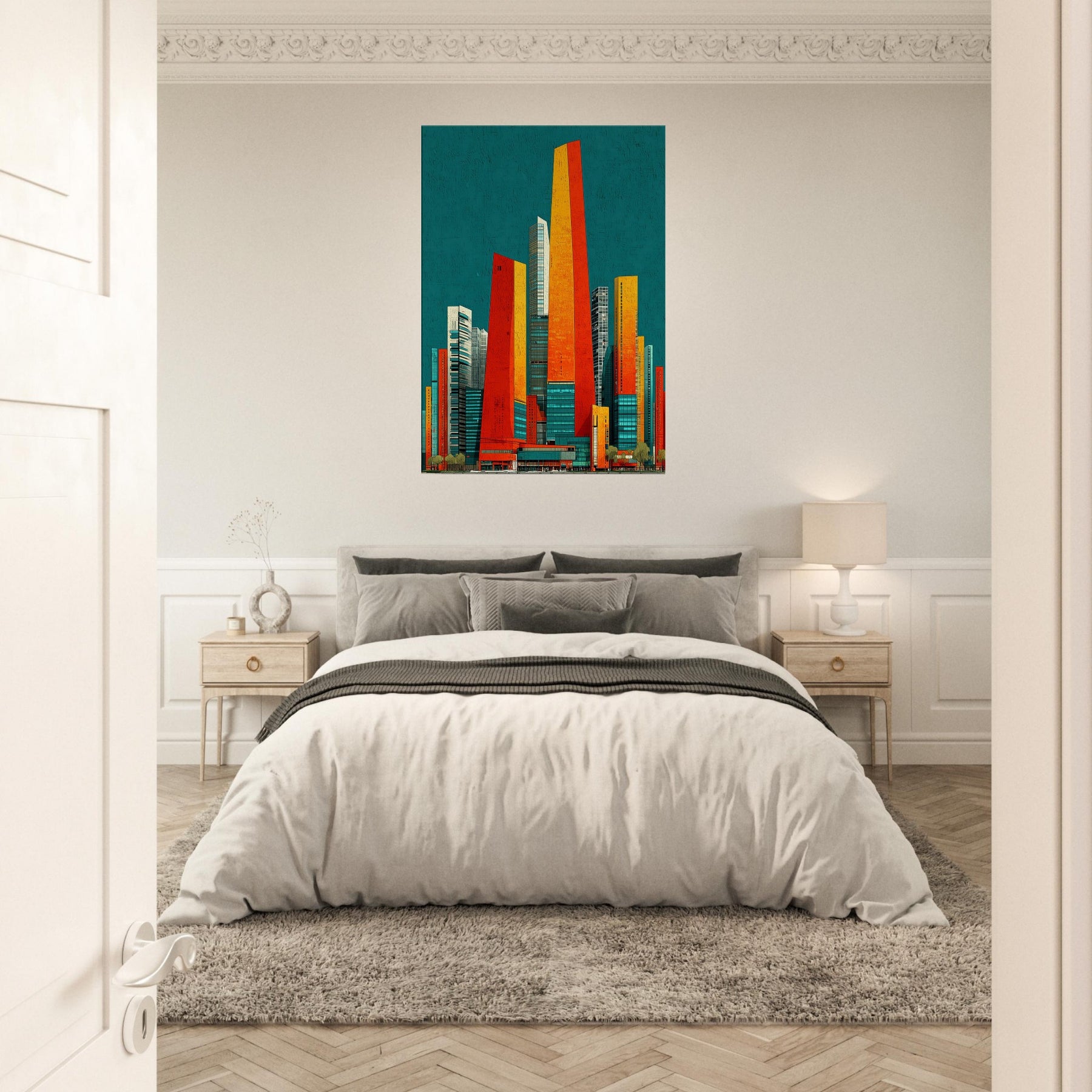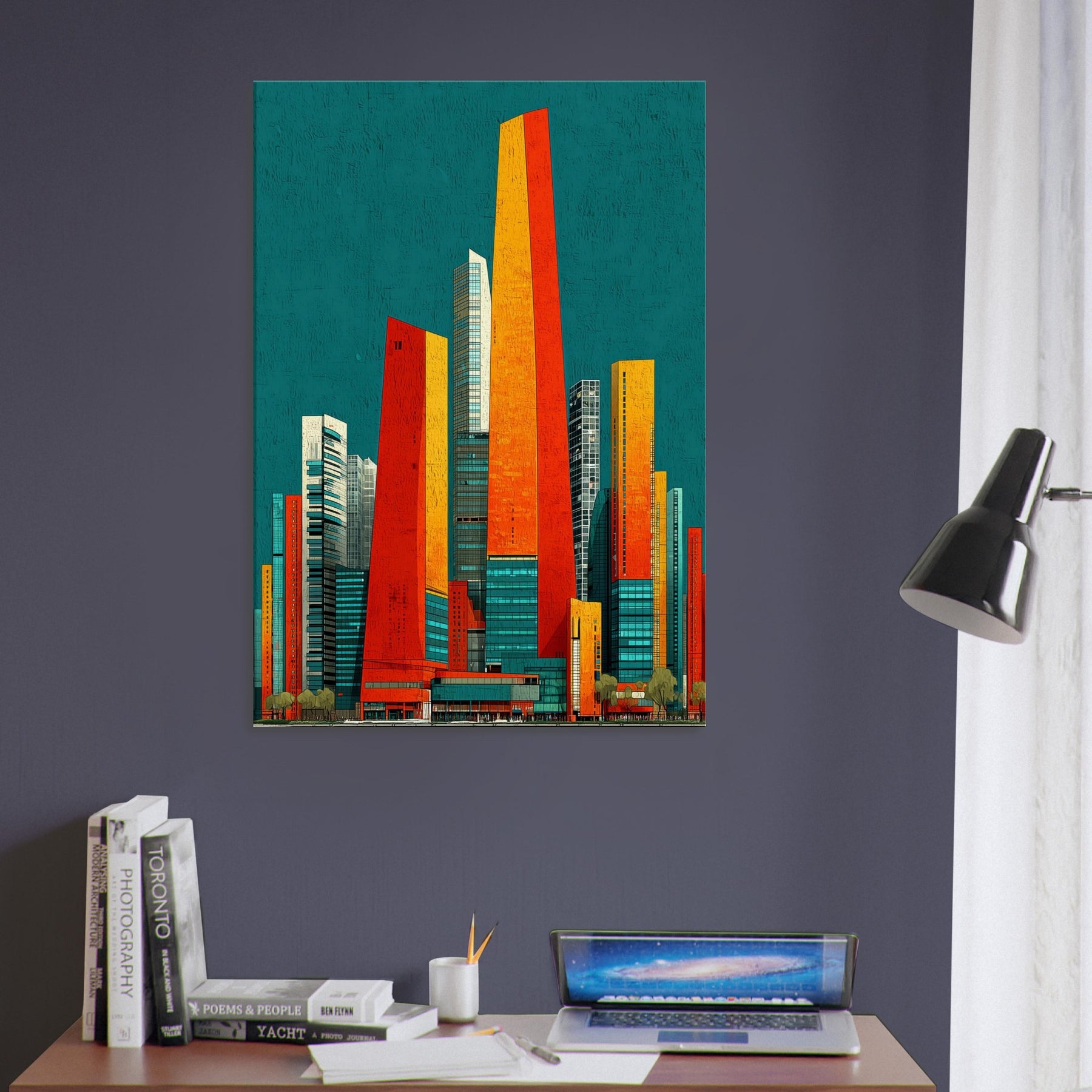 Seoul rises in your living room as a luminous skyline distilled into ribbons of orange, red, and sunlit gold. The teal backdrop hums with city night, a balance of warmth and breathless space. Its abstract geometry evokes steel, glass, and movement, inviting touch and imagination. Hang it in a living area or office and watch the room shimmer with energy, depth, and ritual. A statement piece that enhances atmosphere, guiding conversation and making every moment feel newly urban and alive.