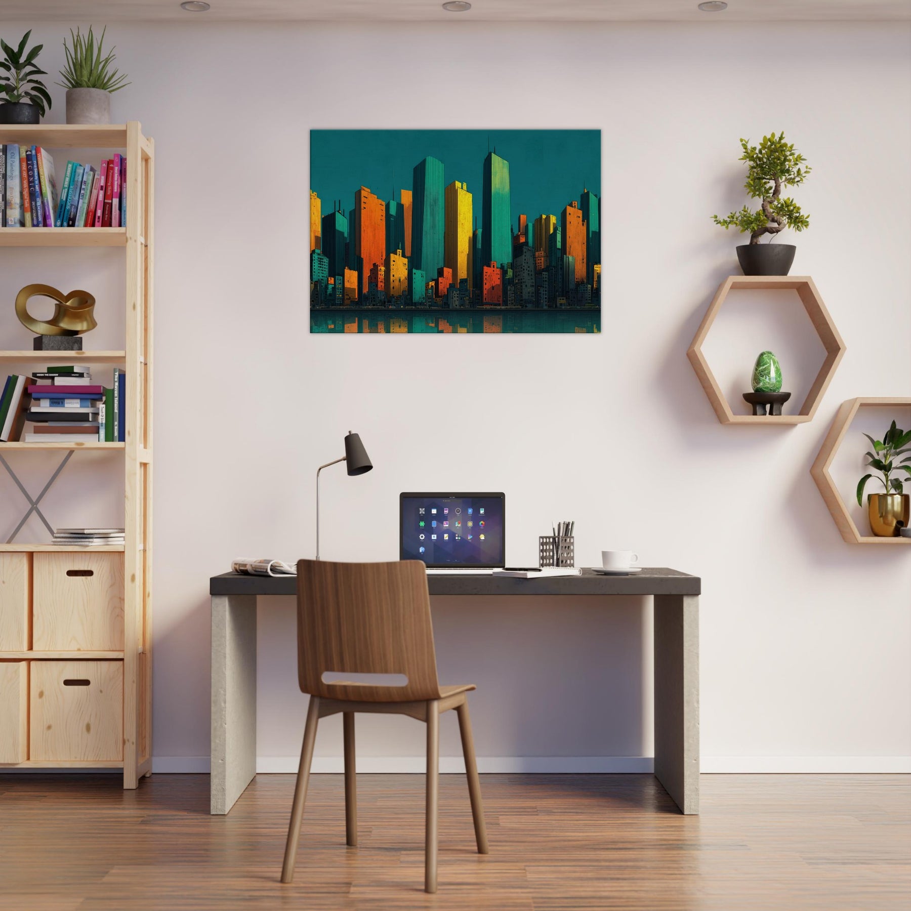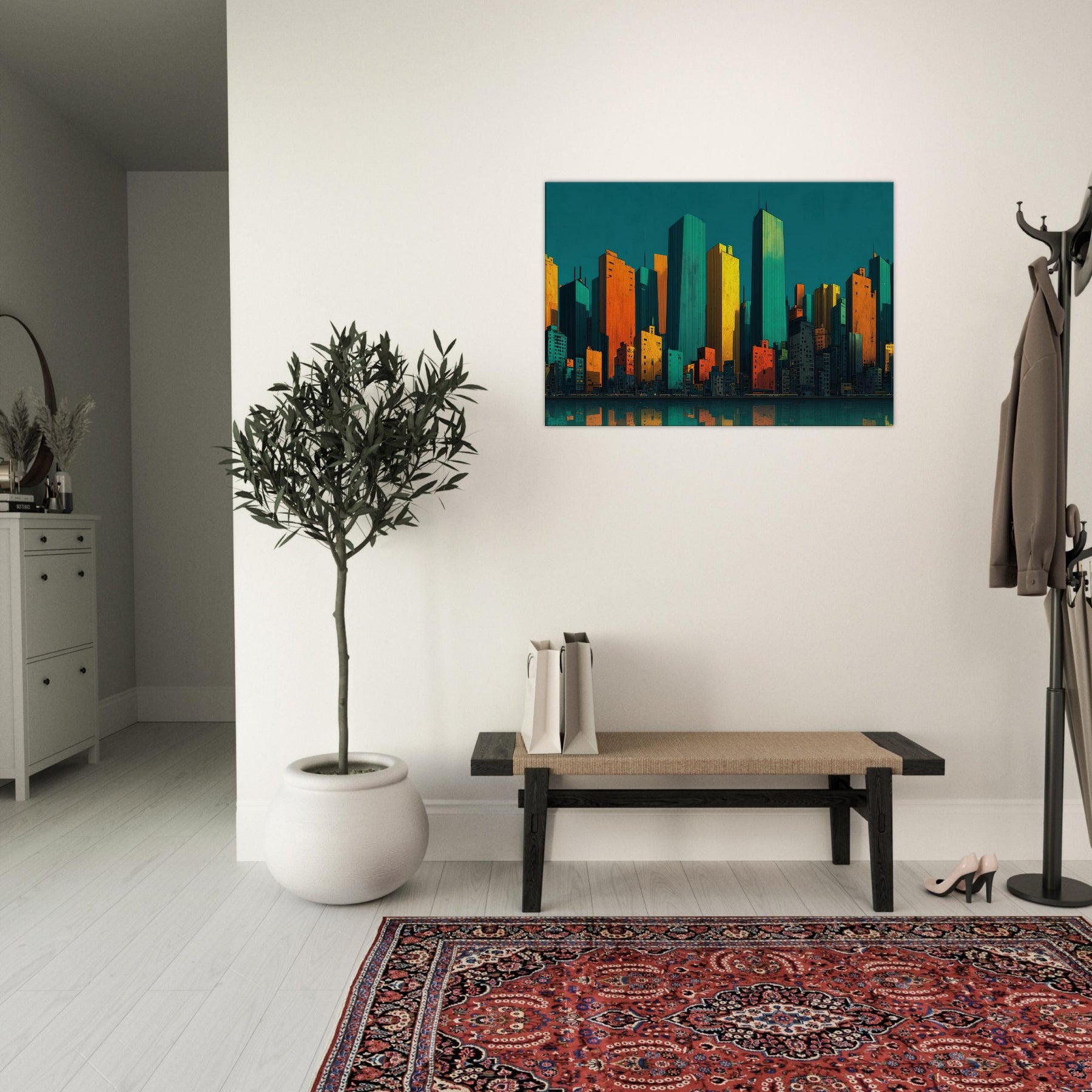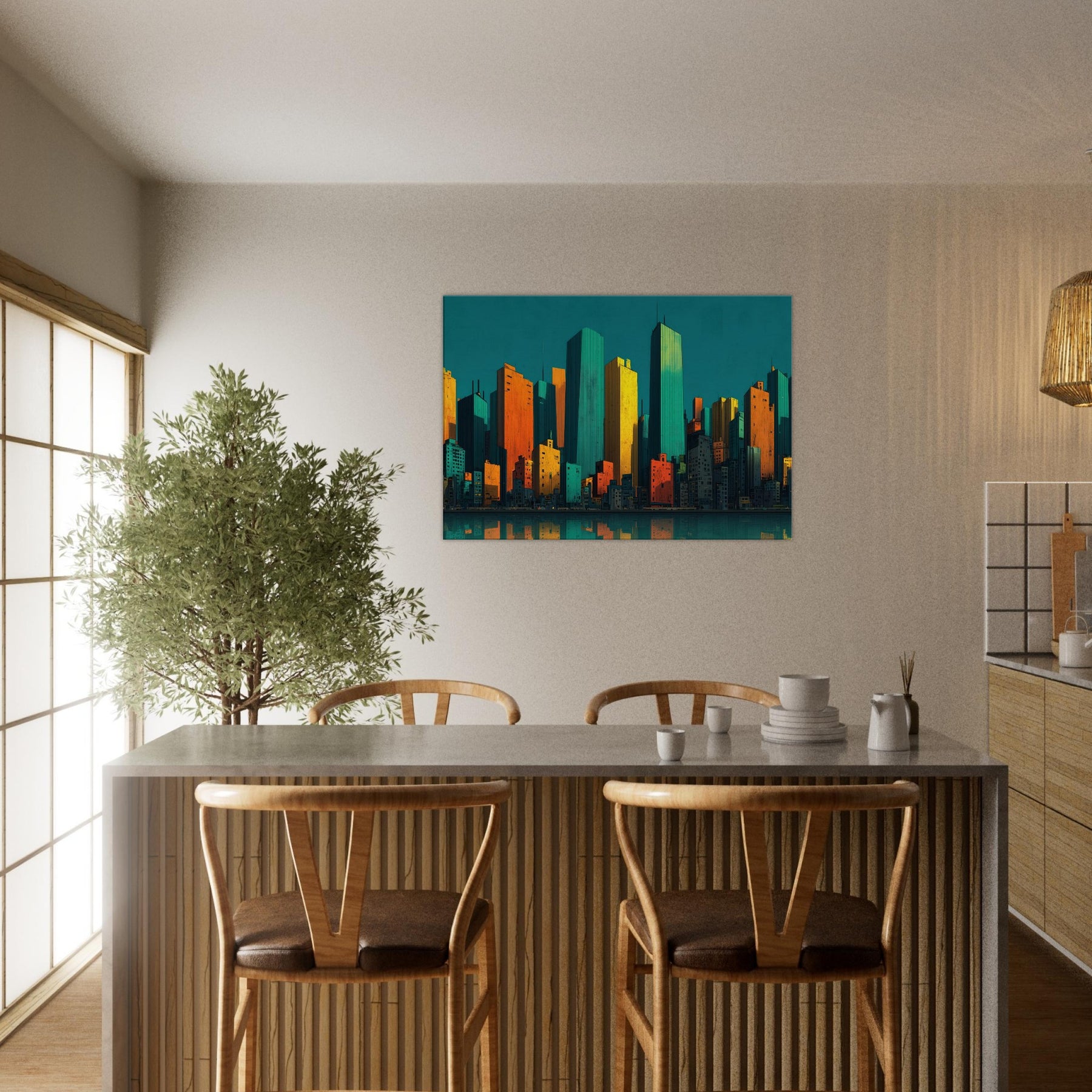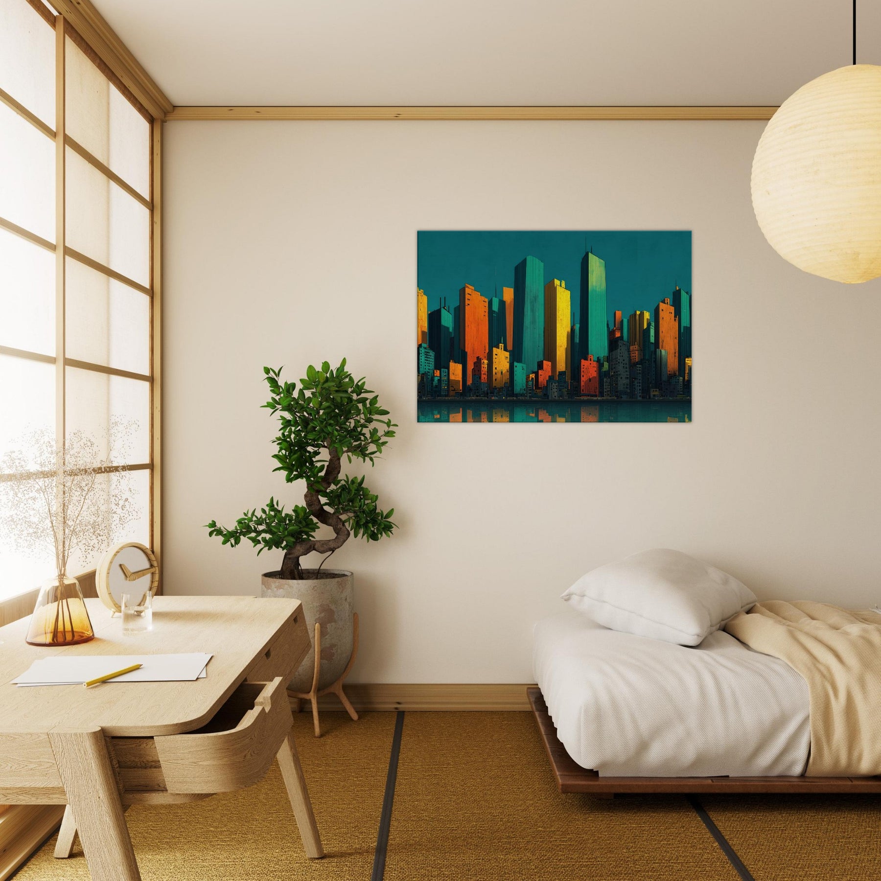 Seoul unfolds in luminous bands of color, where towers rise like prisms and the night breathes with an electric hum. This abstract cityscape captures the pulse of a metropolis at dusk: teal rivers of sky, molten orange sunlit glass, and shadows that whisper of hidden courtyards. The piece invites contemplation, turning a wall into a vista that swells with energy yet remains soothing. Hang it in a living room or hallway to spark conversation and illuminate everyday moments with urban poetry.