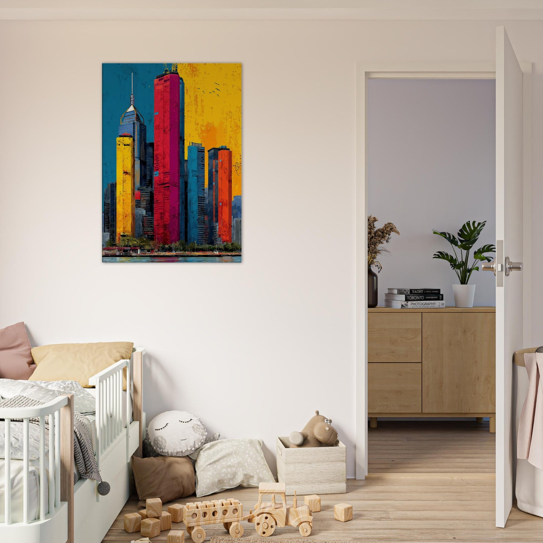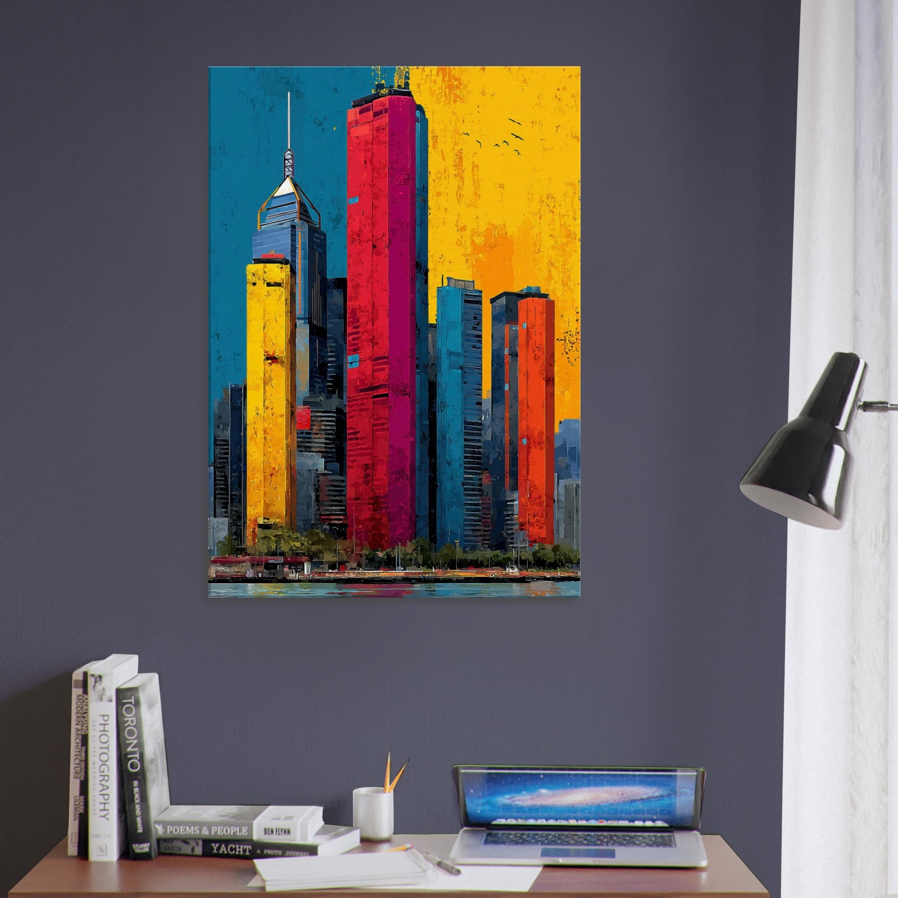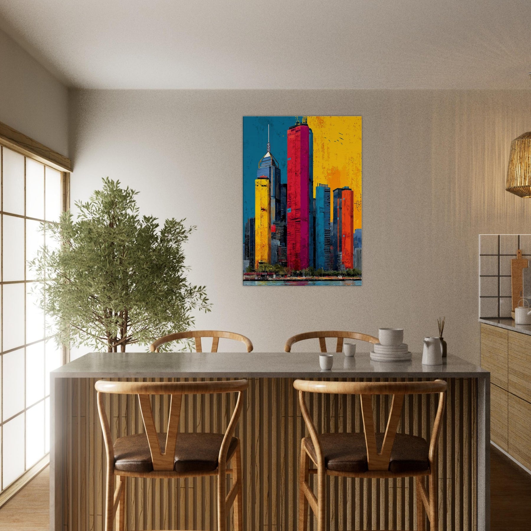 An electric skyline unfurls across the canvas, where Hong Kong rises in bold blocks of color and light. The abstraction breathes with harbor breeze and midnight rain, turning towers into rhythmic strokes that shimmer along the wall. This piece invites the room to glow with energy a tactile, almost musical presence that anchors conversations and lends a cosmopolitan mood to living spaces. Whether above a sofa or beside a desk, it whispers of night markets, sea winds, and a city always in motion.