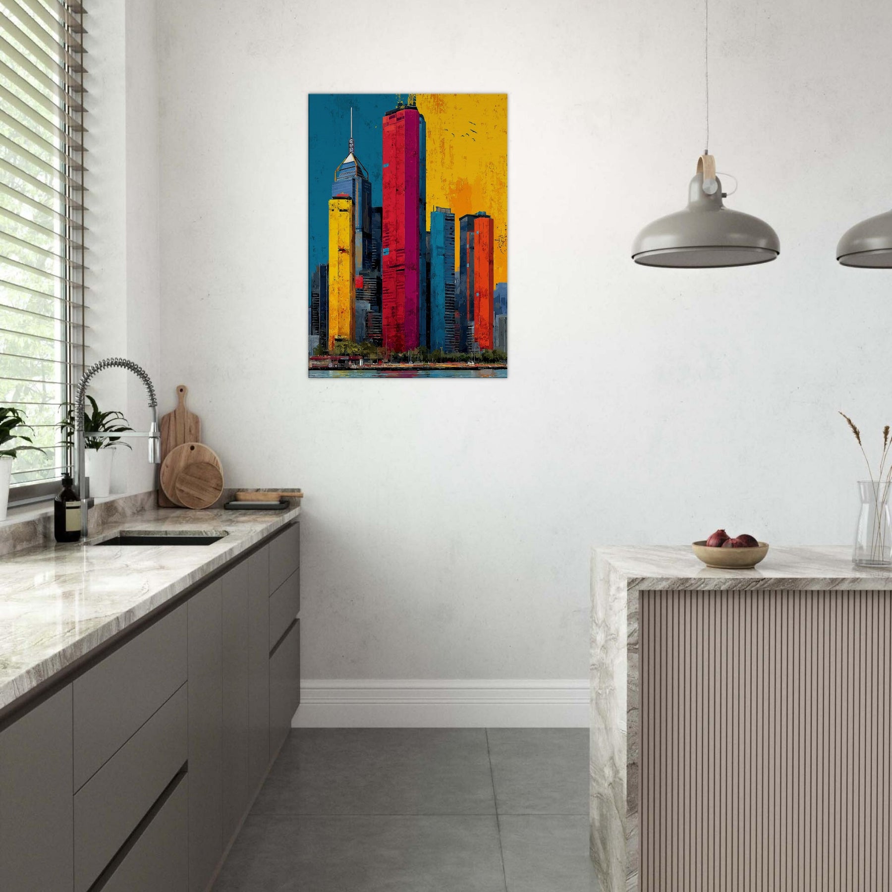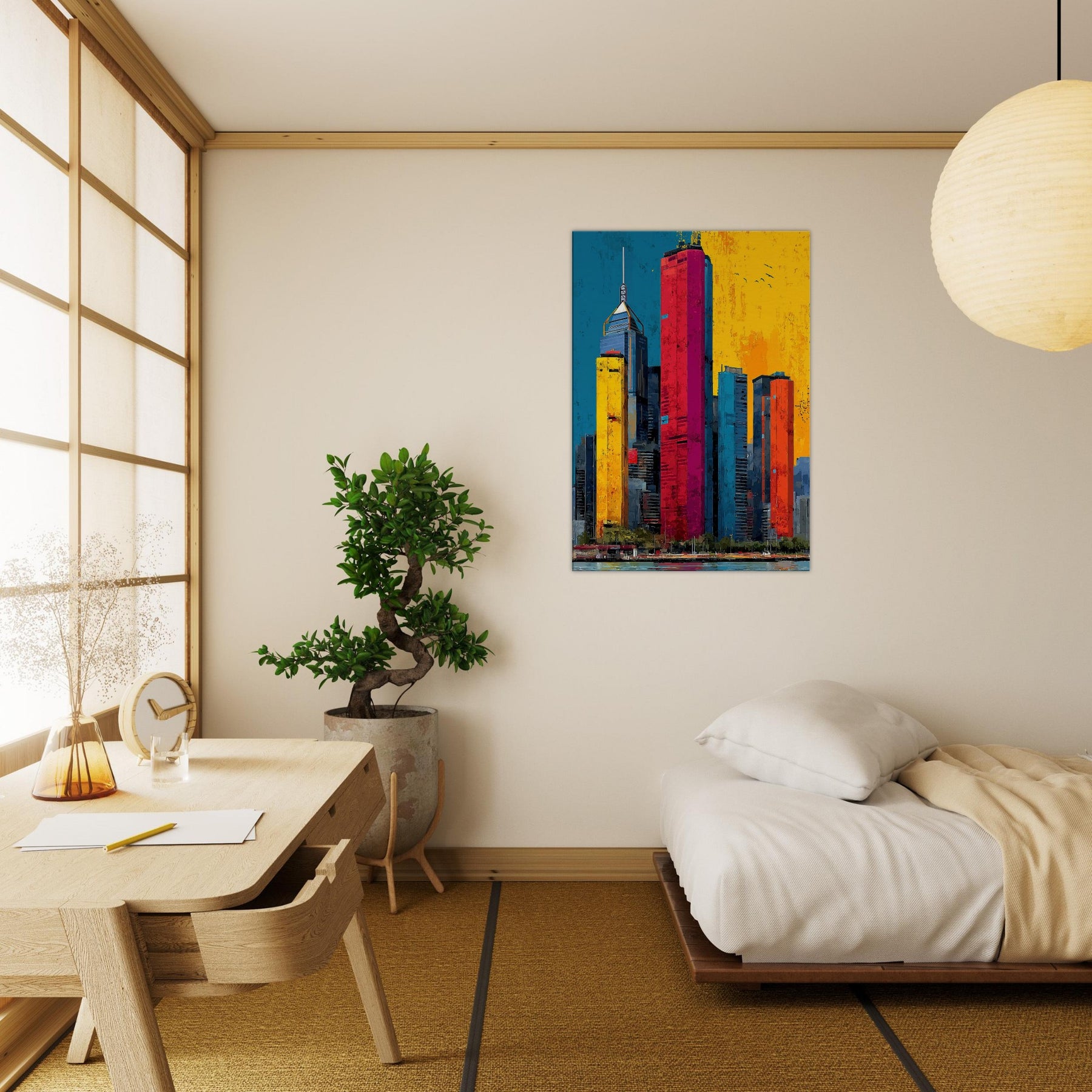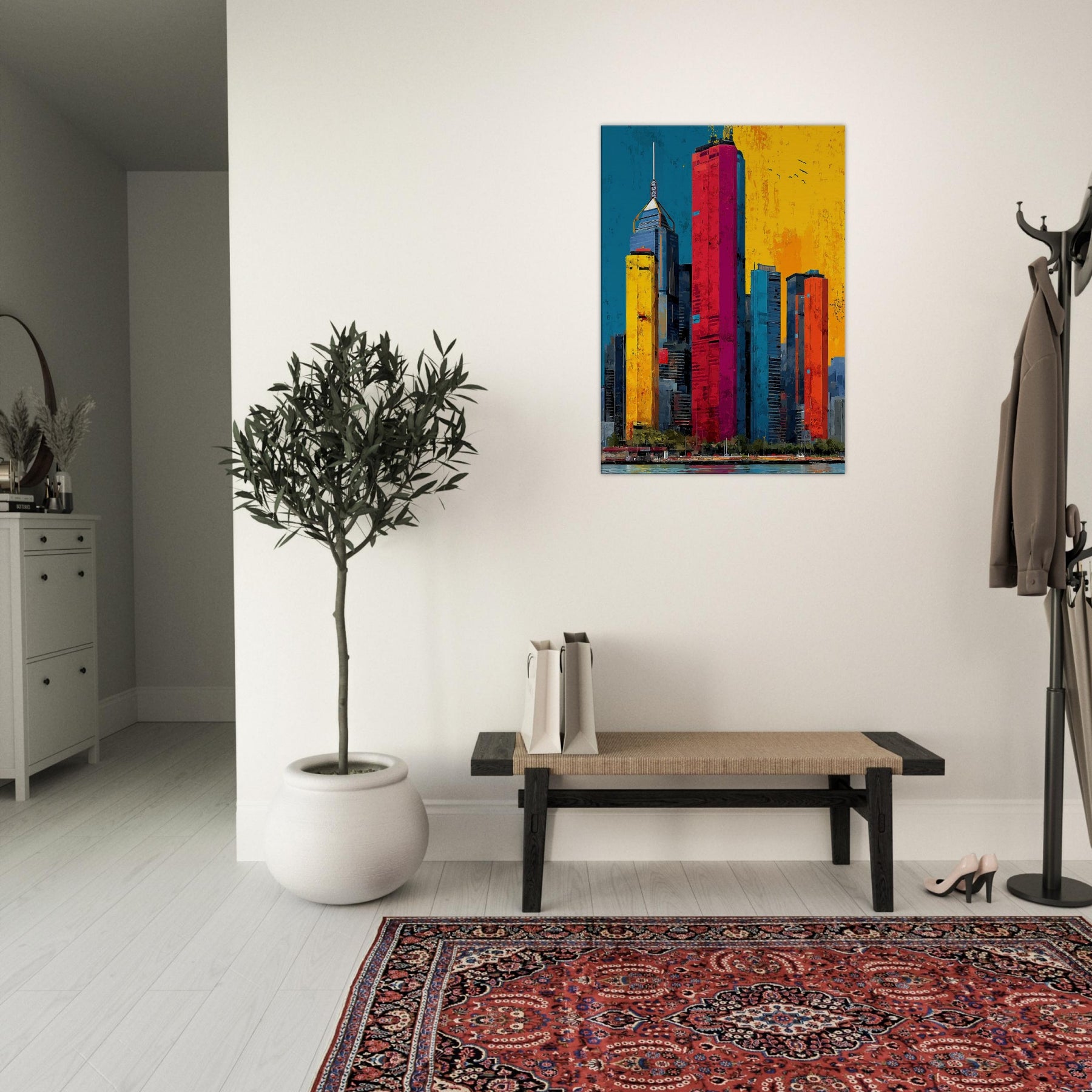 An electric skyline unfurls across the canvas, where Hong Kong rises in bold blocks of color and light. The abstraction breathes with harbor breeze and midnight rain, turning towers into rhythmic strokes that shimmer along the wall. This piece invites the room to glow with energy a tactile, almost musical presence that anchors conversations and lends a cosmopolitan mood to living spaces. Whether above a sofa or beside a desk, it whispers of night markets, sea winds, and a city always in motion.