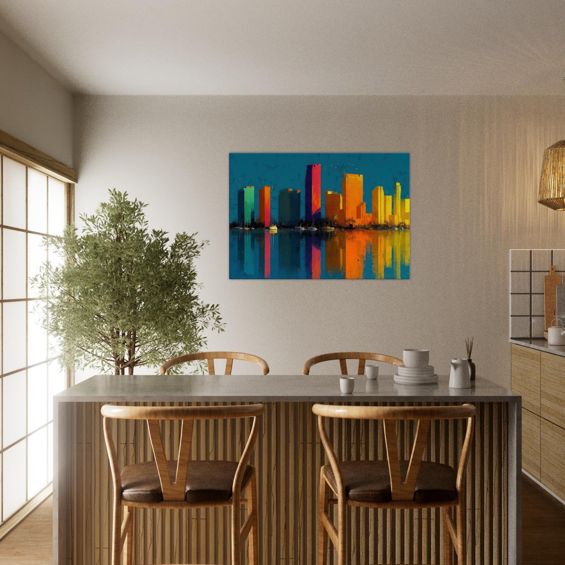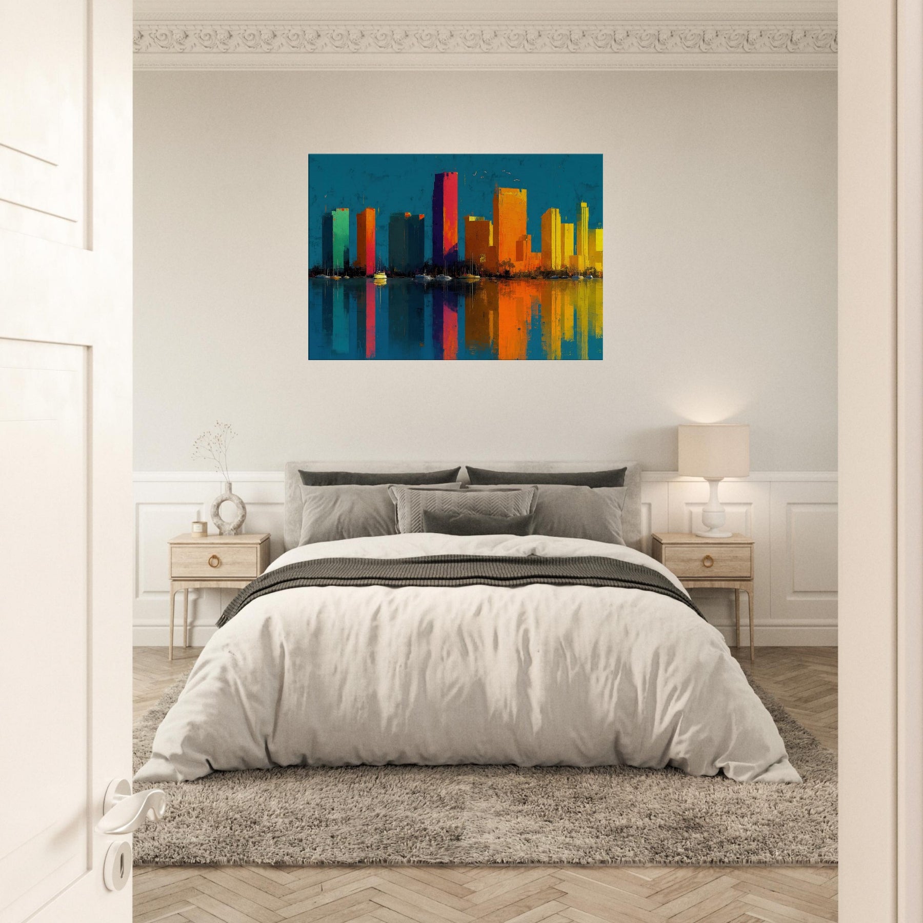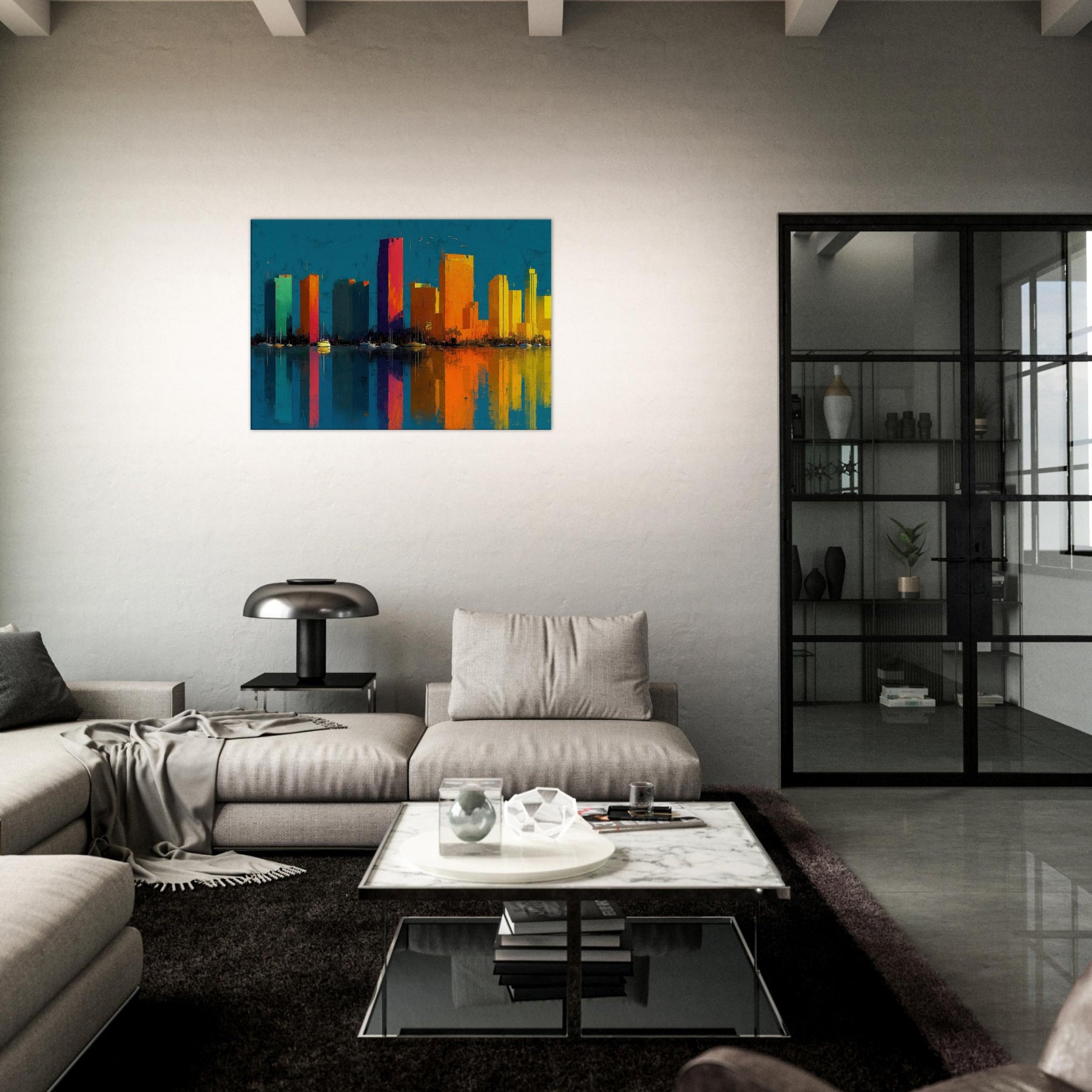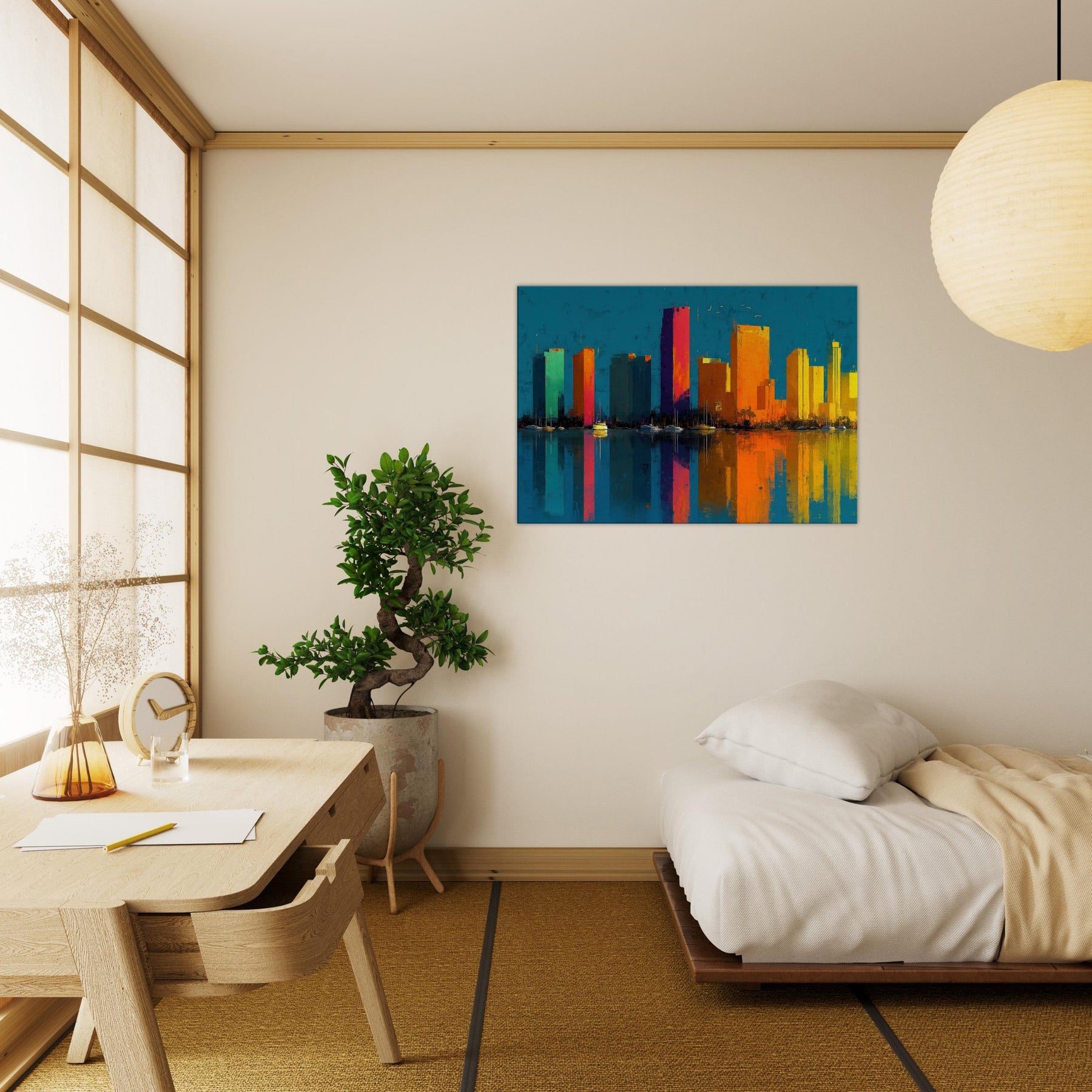 An electric Miami dreamscape unfolds in bold blocks of color and sweeping silhouettes. The abstract skyline rises from a calm, glassy shore, pulsing with sunset hues that glow across the room. It invites the warmth of tropical light, the rhythm of water lapping at the docks, and a playful, contemporary energy. Perfect for living rooms or offices, this piece enhances atmosphere with sensual contrast, creating depth and optimism in everyday moments.