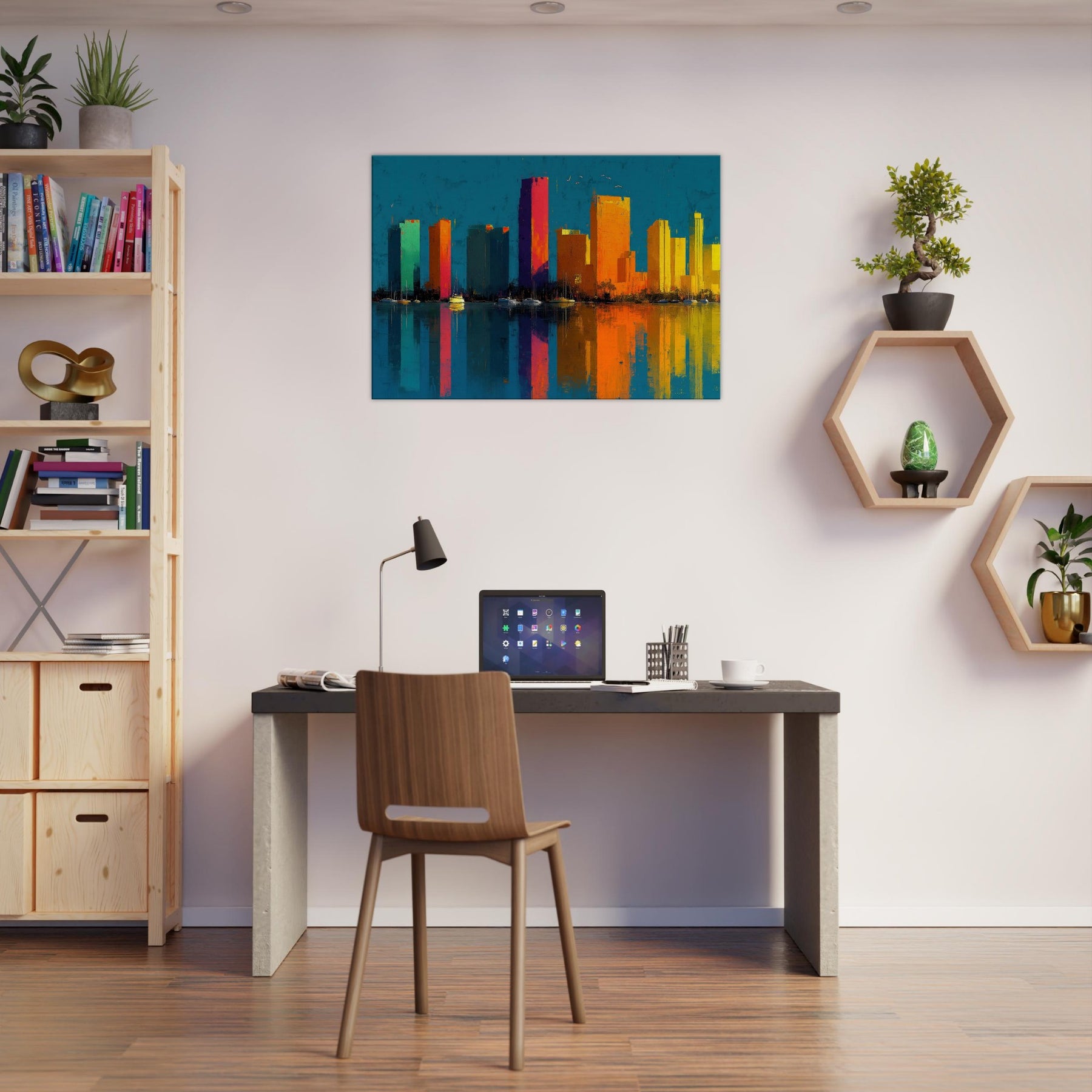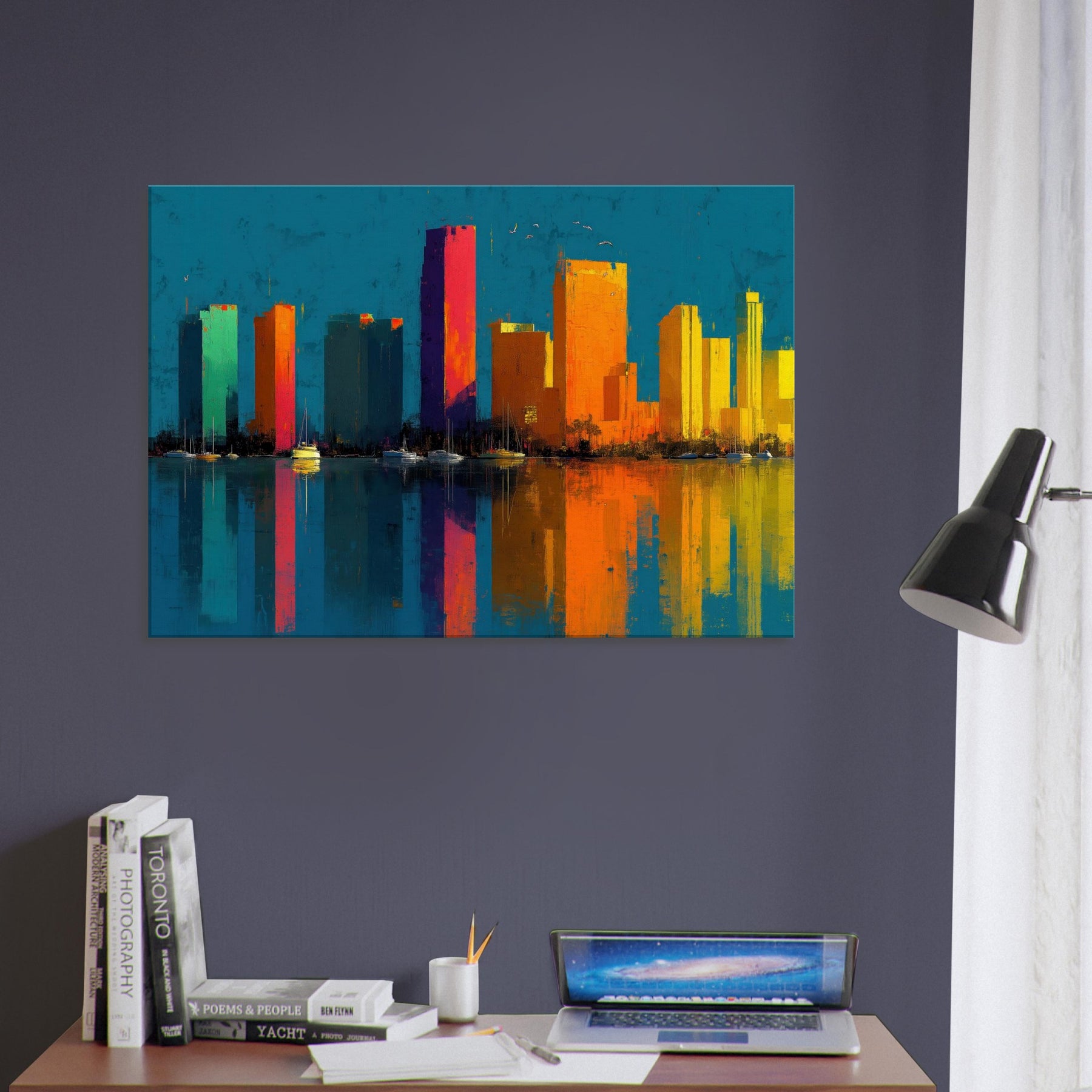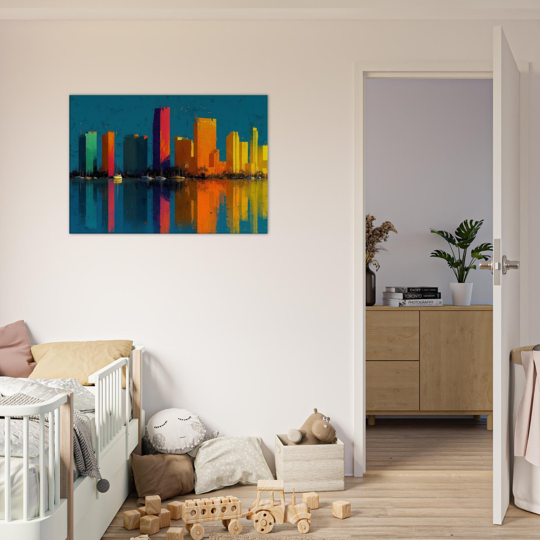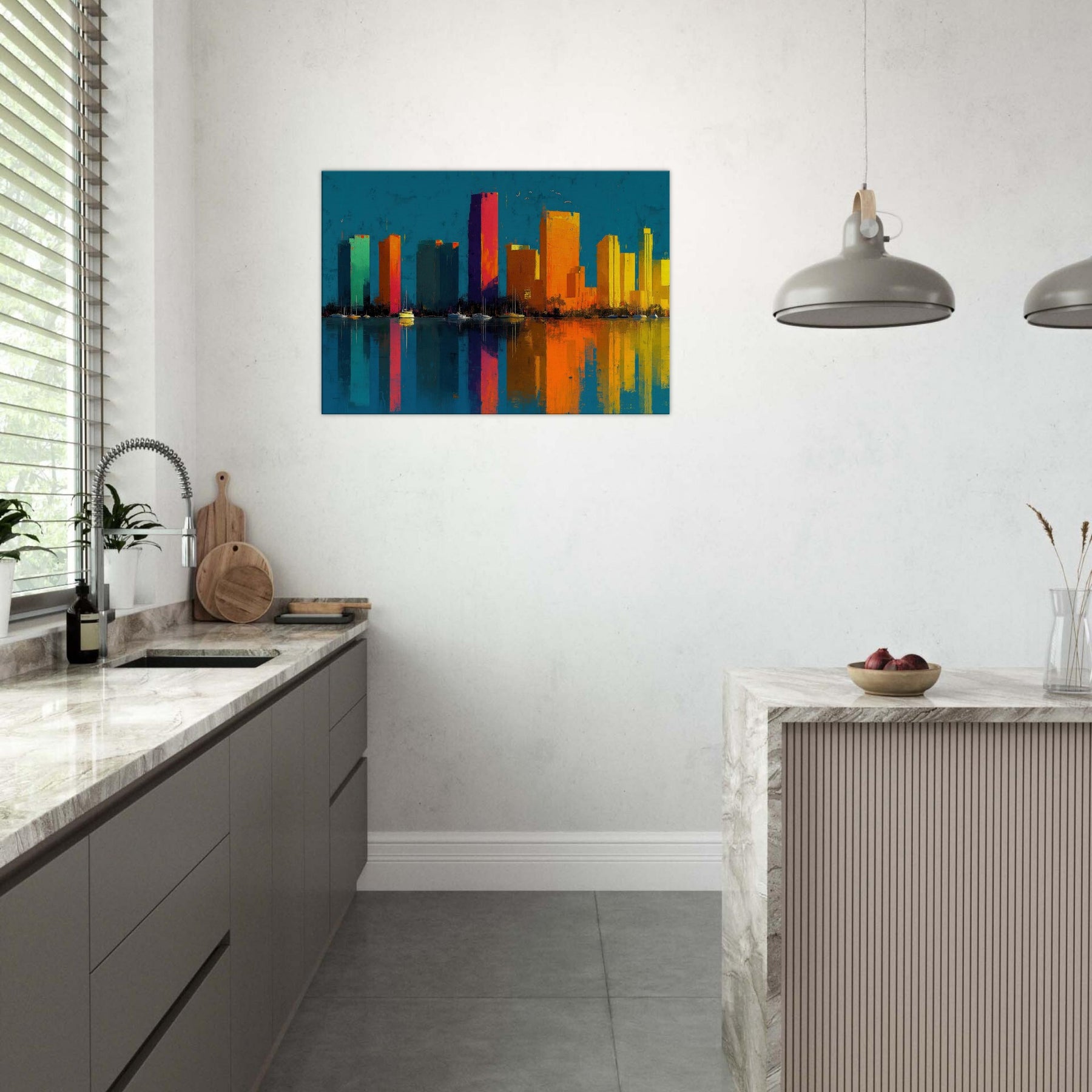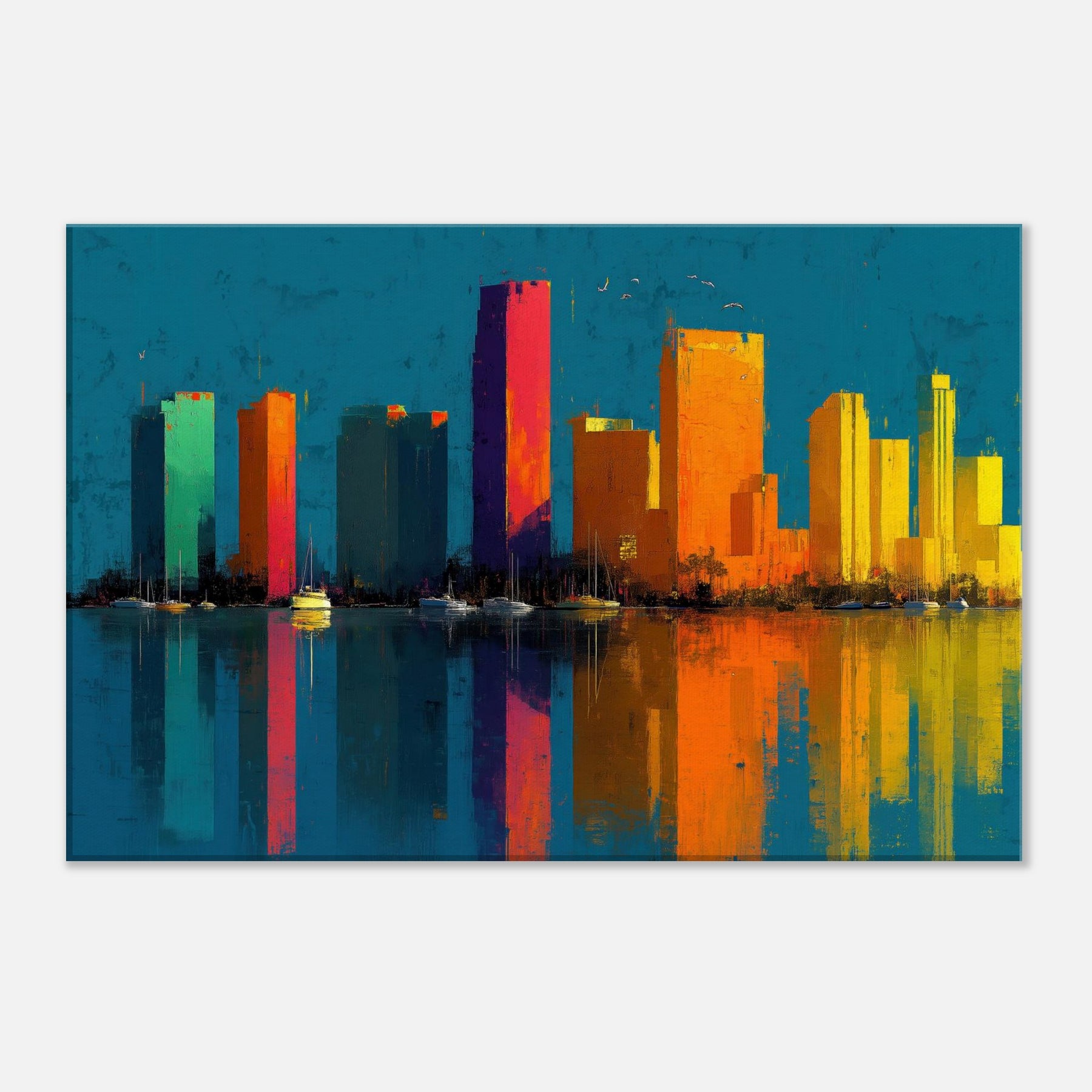 An electric Miami dreamscape unfolds in bold blocks of color and sweeping silhouettes. The abstract skyline rises from a calm, glassy shore, pulsing with sunset hues that glow across the room. It invites the warmth of tropical light, the rhythm of water lapping at the docks, and a playful, contemporary energy. Perfect for living rooms or offices, this piece enhances atmosphere with sensual contrast, creating depth and optimism in everyday moments.