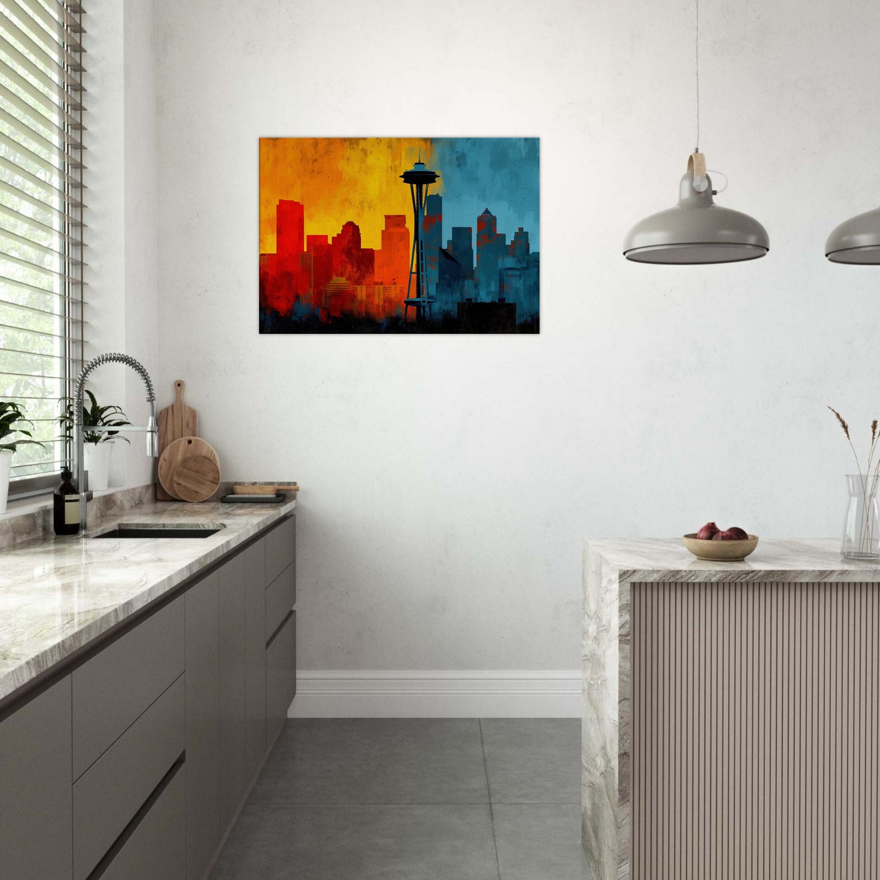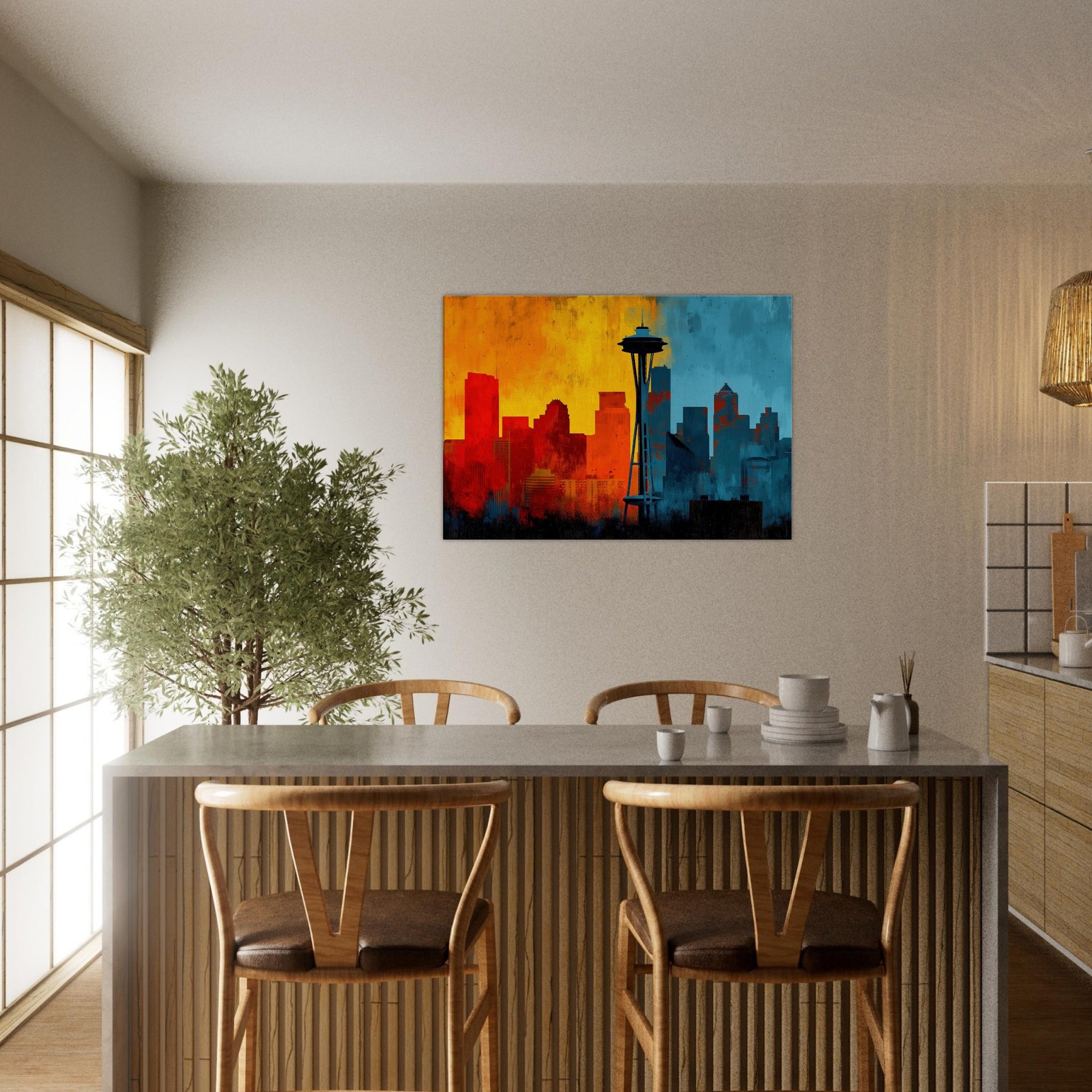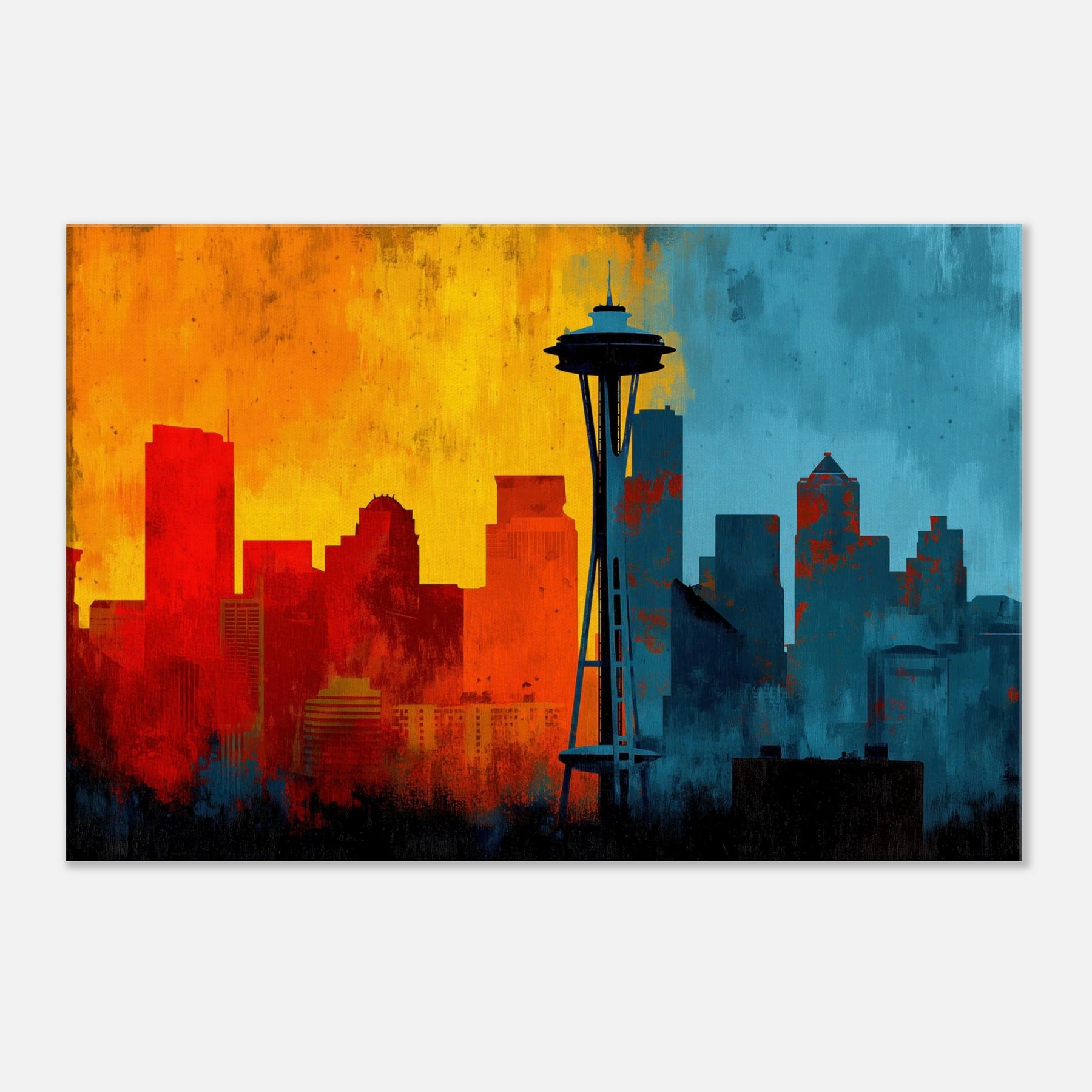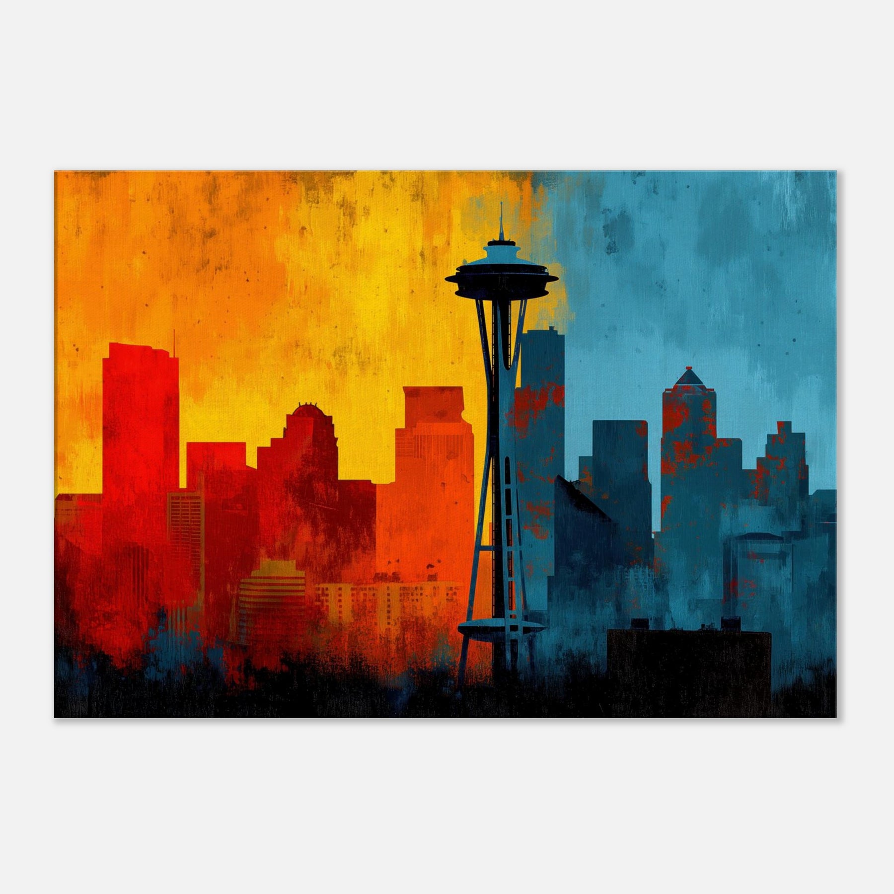 Experience the pulse of Seattle rendered in an abstract, wind swept silhouette. This painting invites warmth and urban breath into your living space, where sunrise oranges mingle with twilight blues across a skyline that feels both distant and intimate. The skyline's bold contrast becomes a chorus of mood cozy evenings, bright conversations, quiet mornings. Let this piece anchor a lounge or study, its layered textures and luminous gradient evoking horizons you return to after every city day.