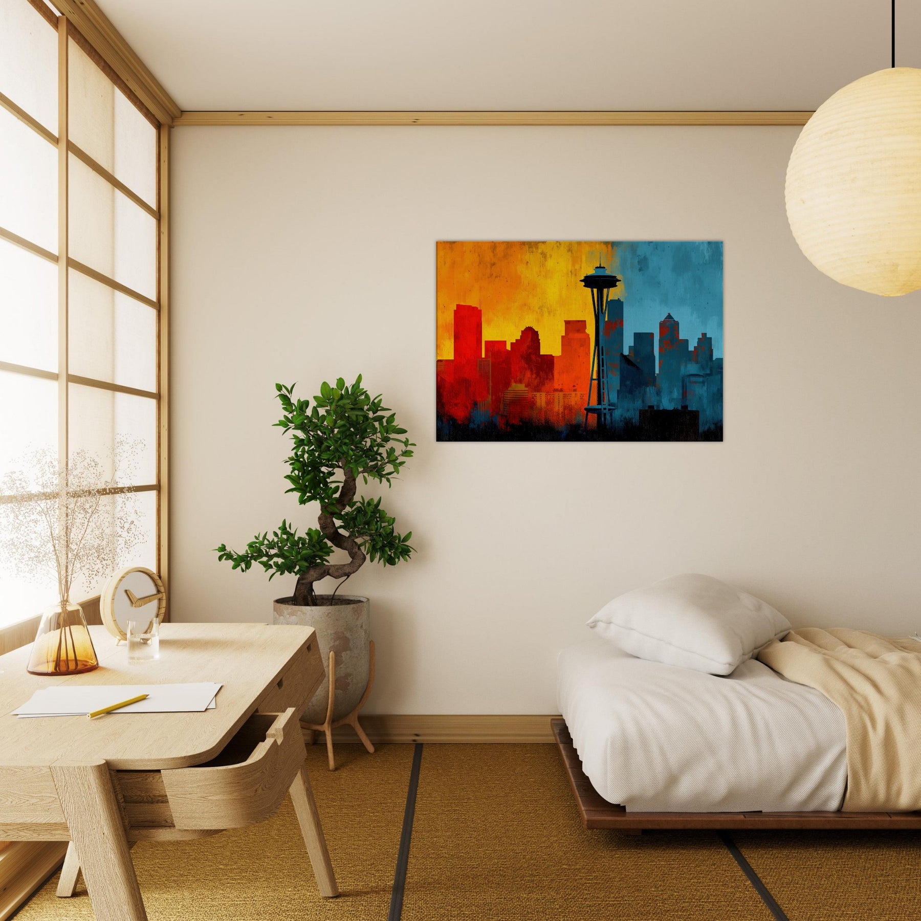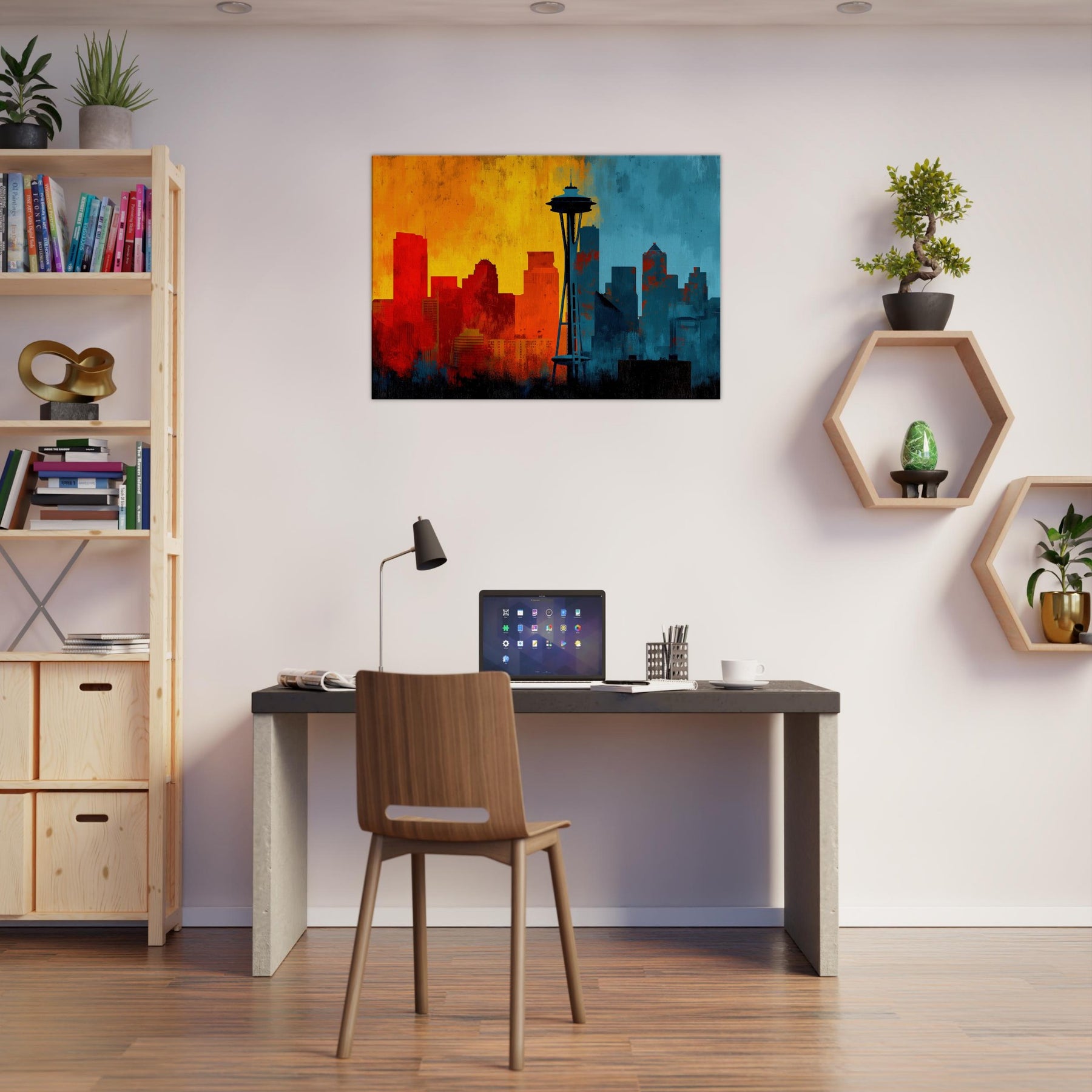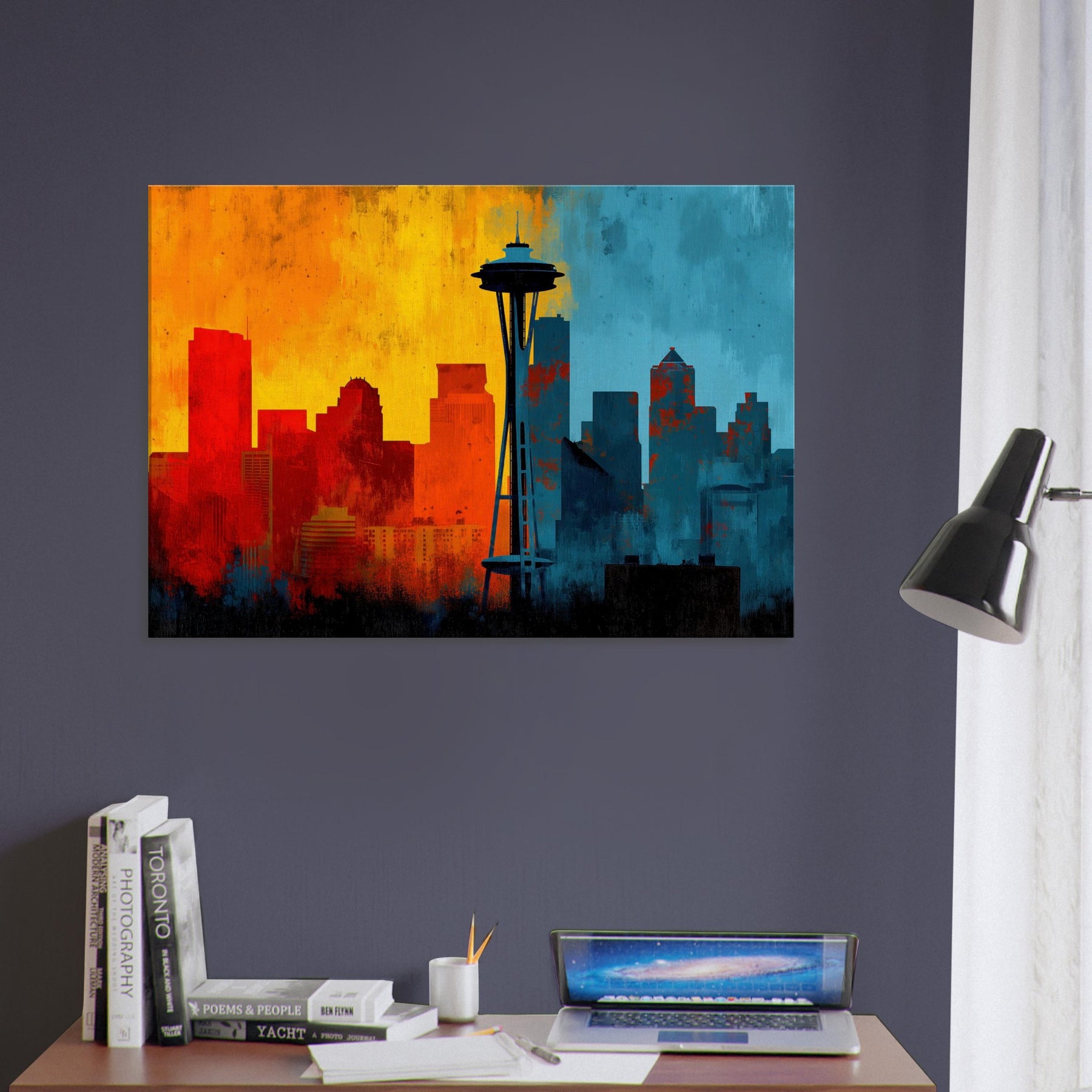 Experience the pulse of Seattle rendered in an abstract, wind swept silhouette. This painting invites warmth and urban breath into your living space, where sunrise oranges mingle with twilight blues across a skyline that feels both distant and intimate. The skyline's bold contrast becomes a chorus of mood cozy evenings, bright conversations, quiet mornings. Let this piece anchor a lounge or study, its layered textures and luminous gradient evoking horizons you return to after every city day.