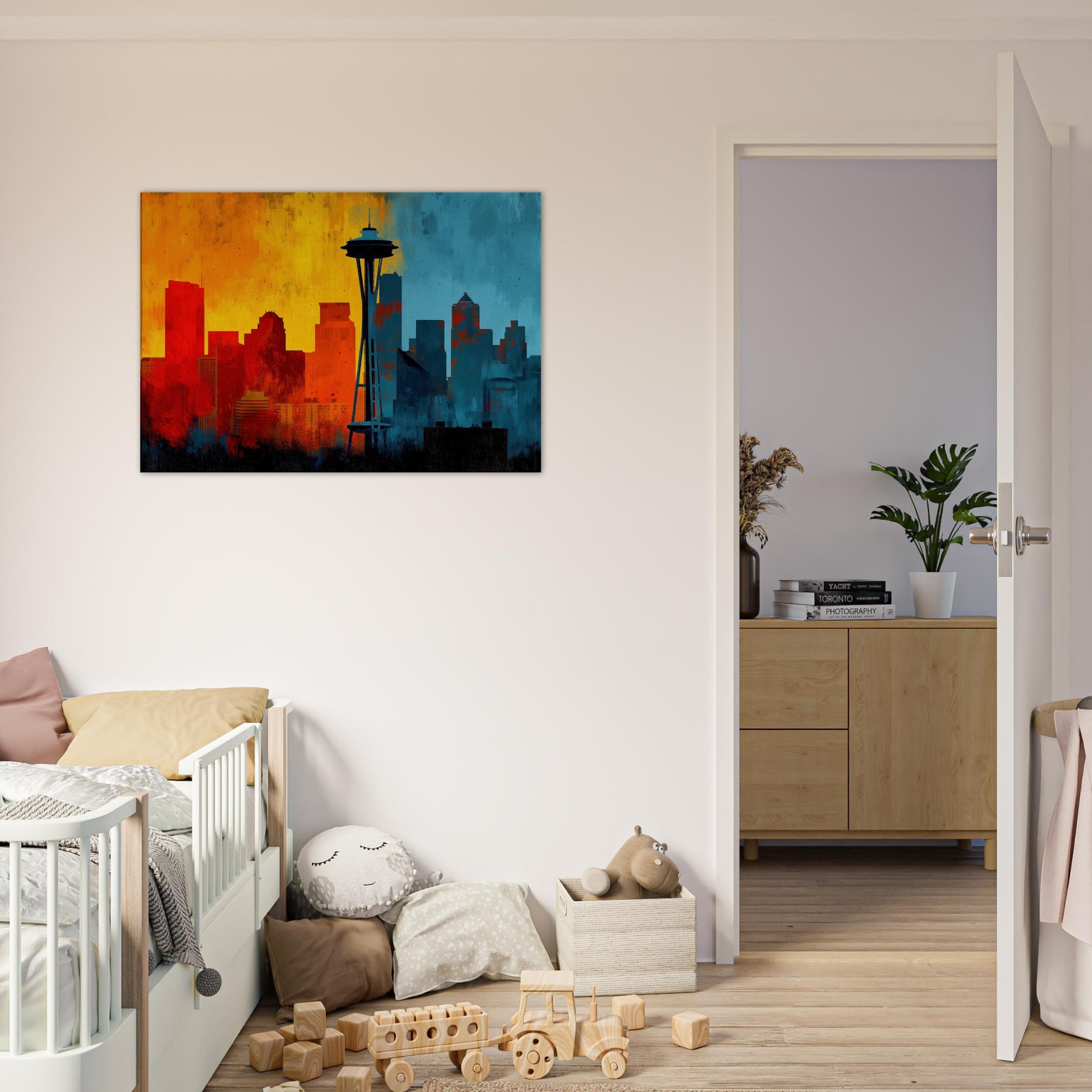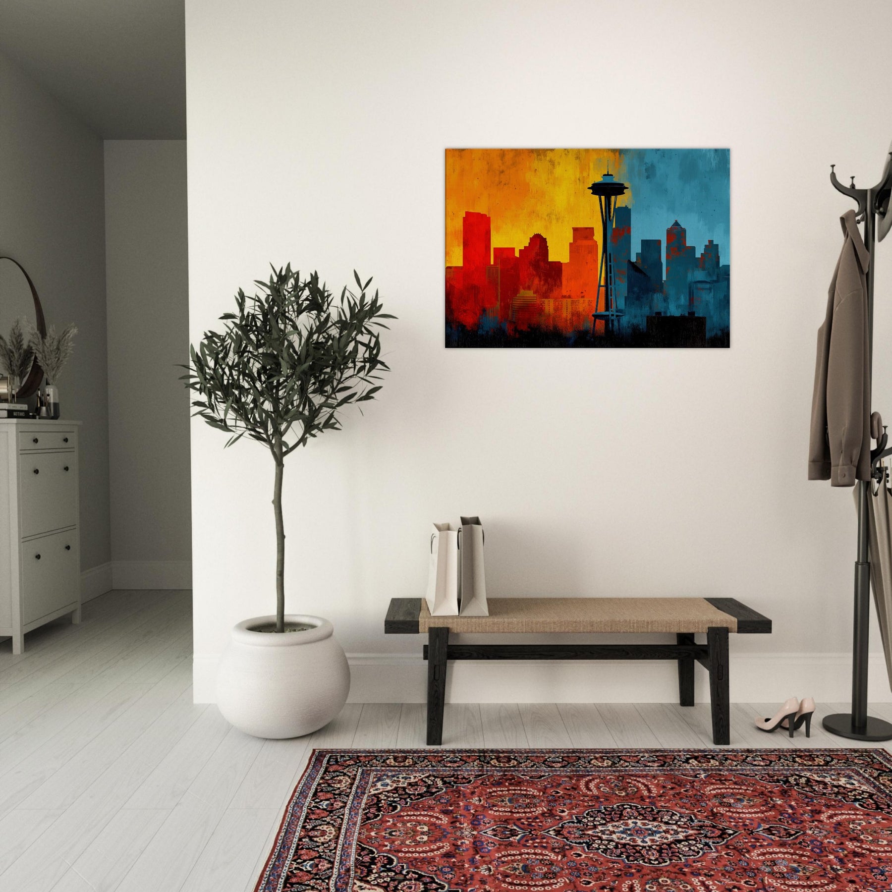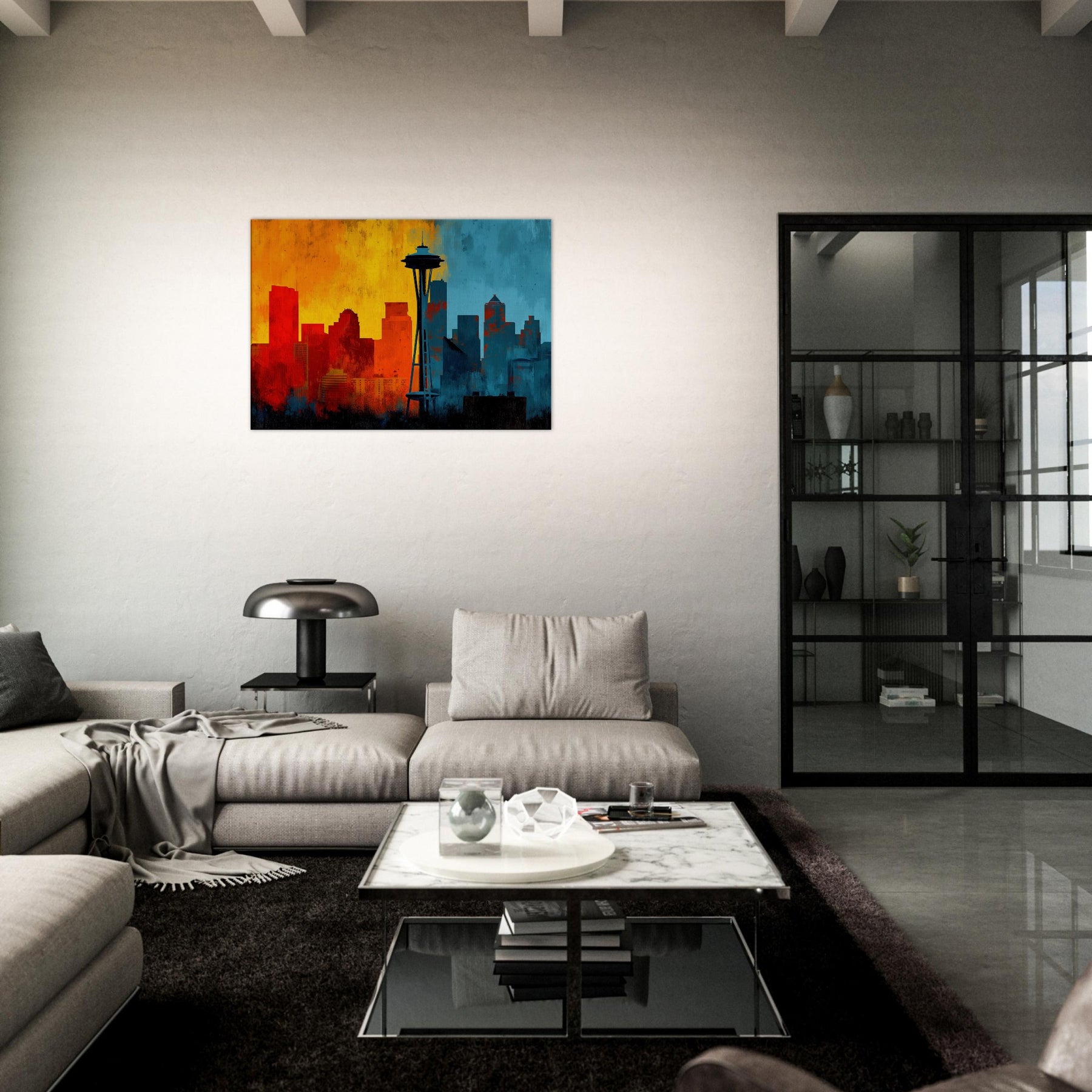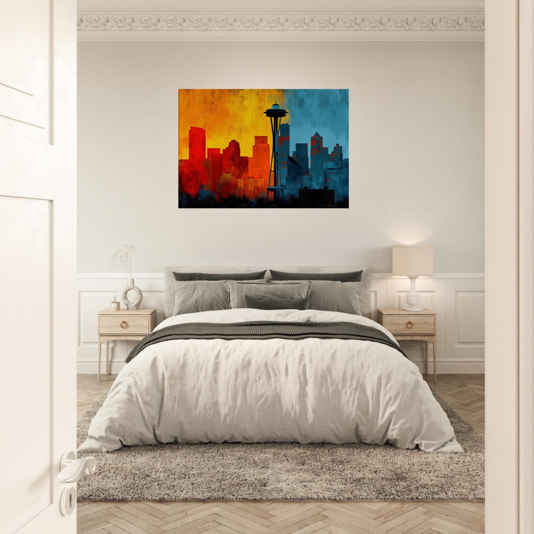 Experience the pulse of Seattle rendered in an abstract, wind swept silhouette. This painting invites warmth and urban breath into your living space, where sunrise oranges mingle with twilight blues across a skyline that feels both distant and intimate. The skyline's bold contrast becomes a chorus of mood cozy evenings, bright conversations, quiet mornings. Let this piece anchor a lounge or study, its layered textures and luminous gradient evoking horizons you return to after every city day.