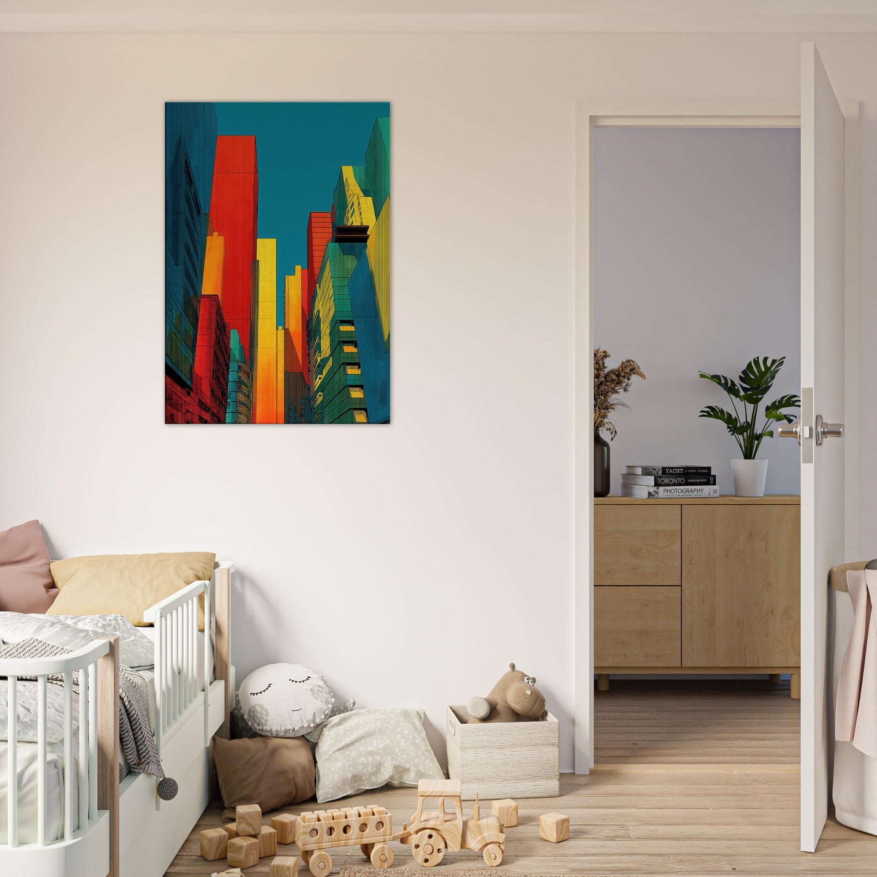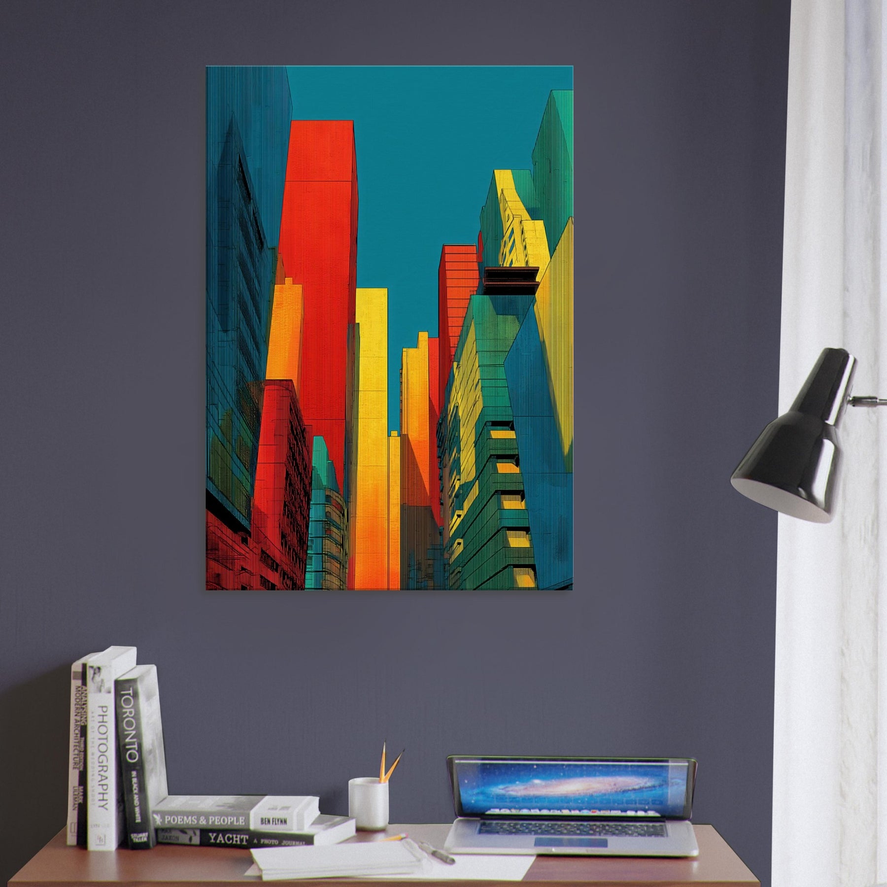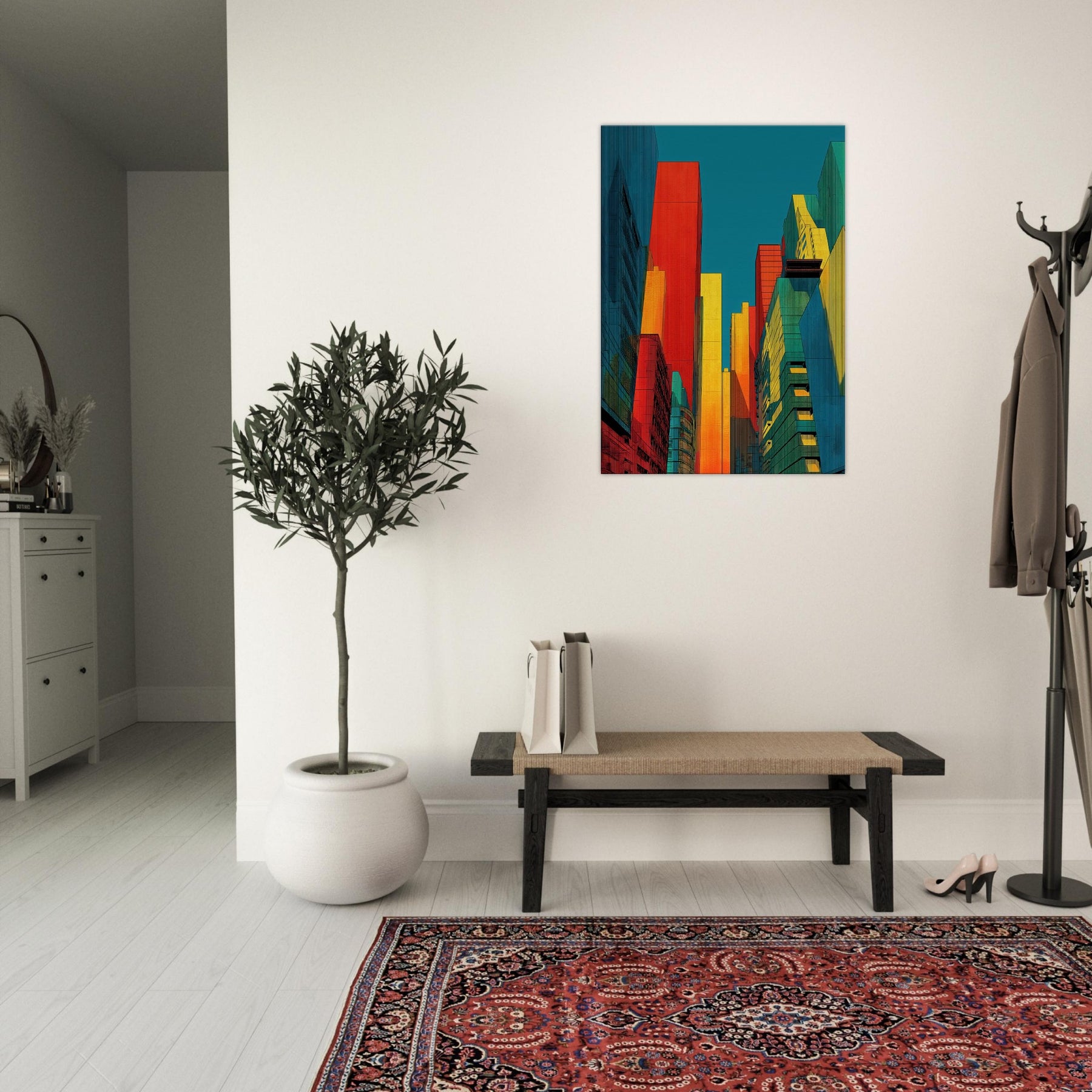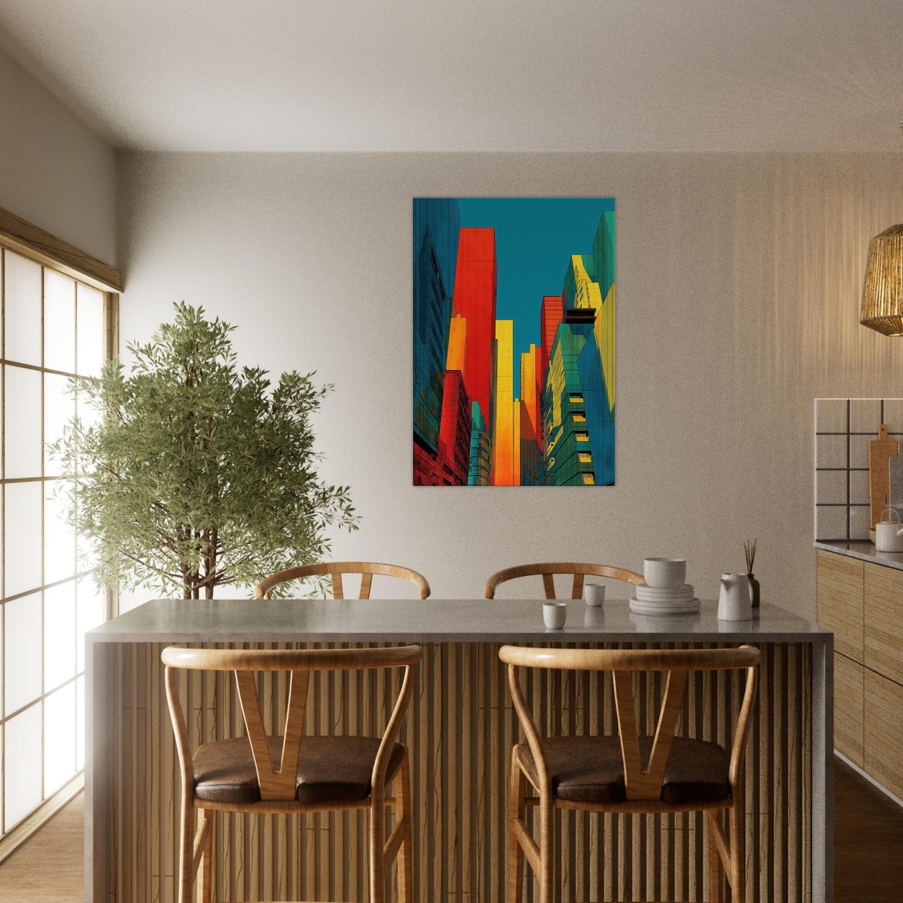 Tokyo unfurls in luminous blocks of color, an abstract city made of light and rhythm. This composition climbs with towering reds, yellows, teals, and greens that pulse like neon streets at night. The texture feels almost tactile sunlit glass, shadowed alleys, distant trains creating a sense of motion within stillness. Hung in a living space, it invites quiet awe and conversation, turning a wall into a window onto urban energy and serene, modern sophistication.