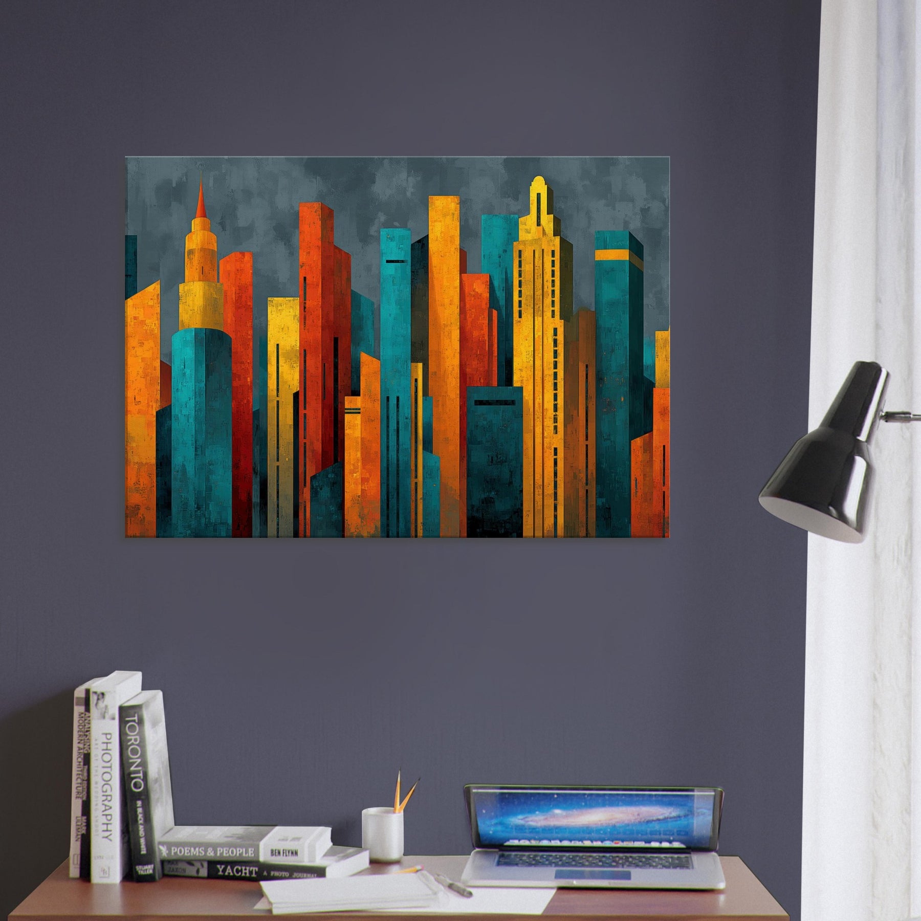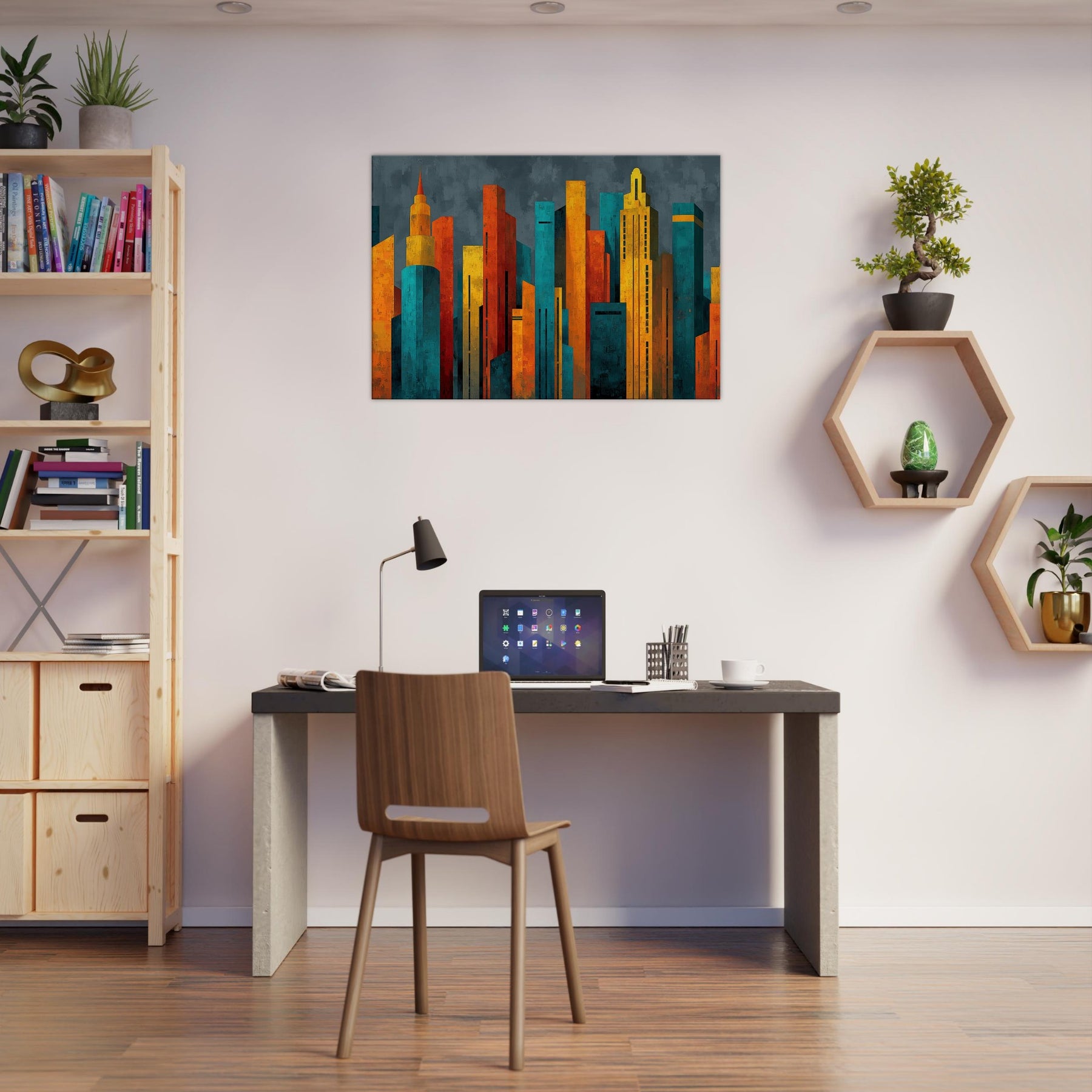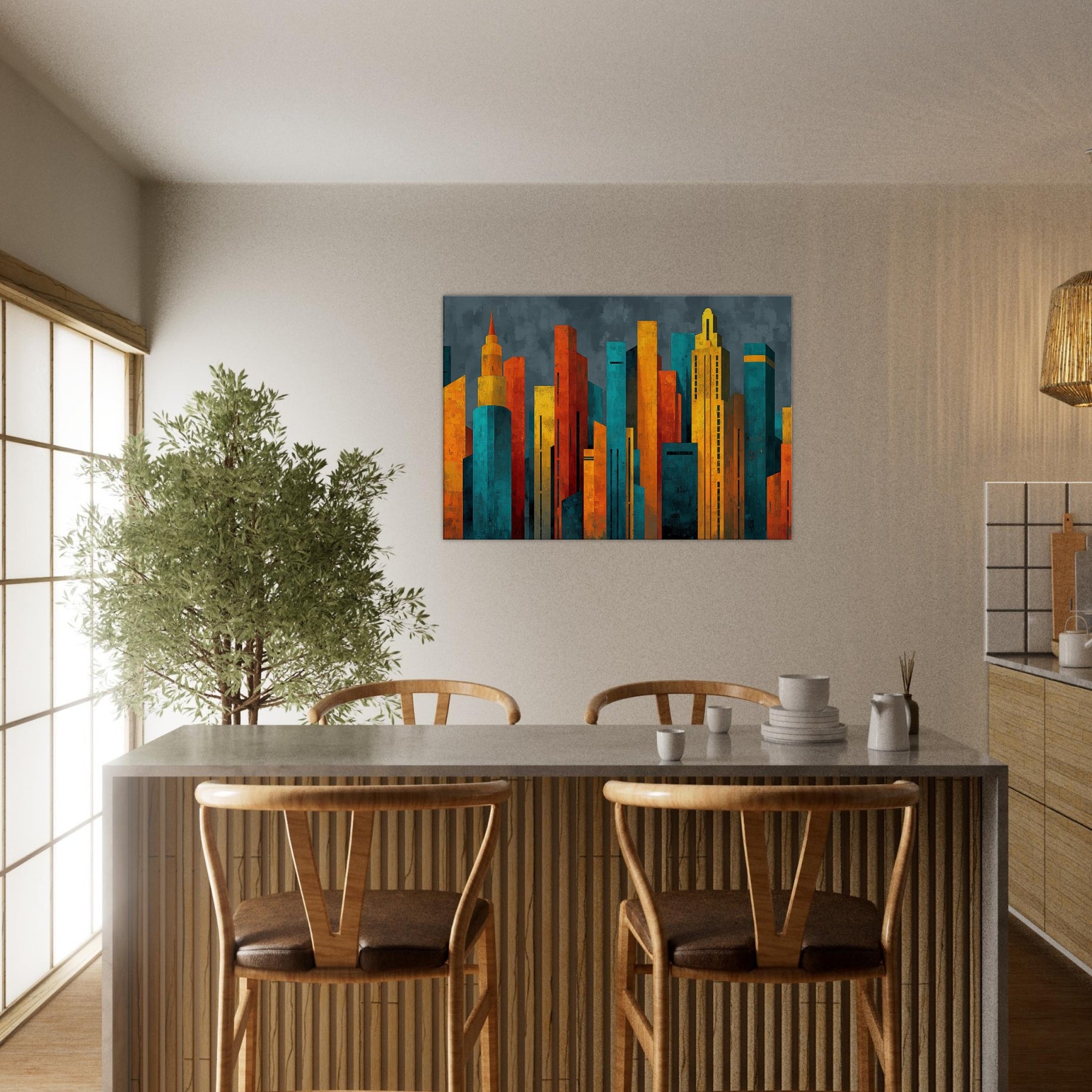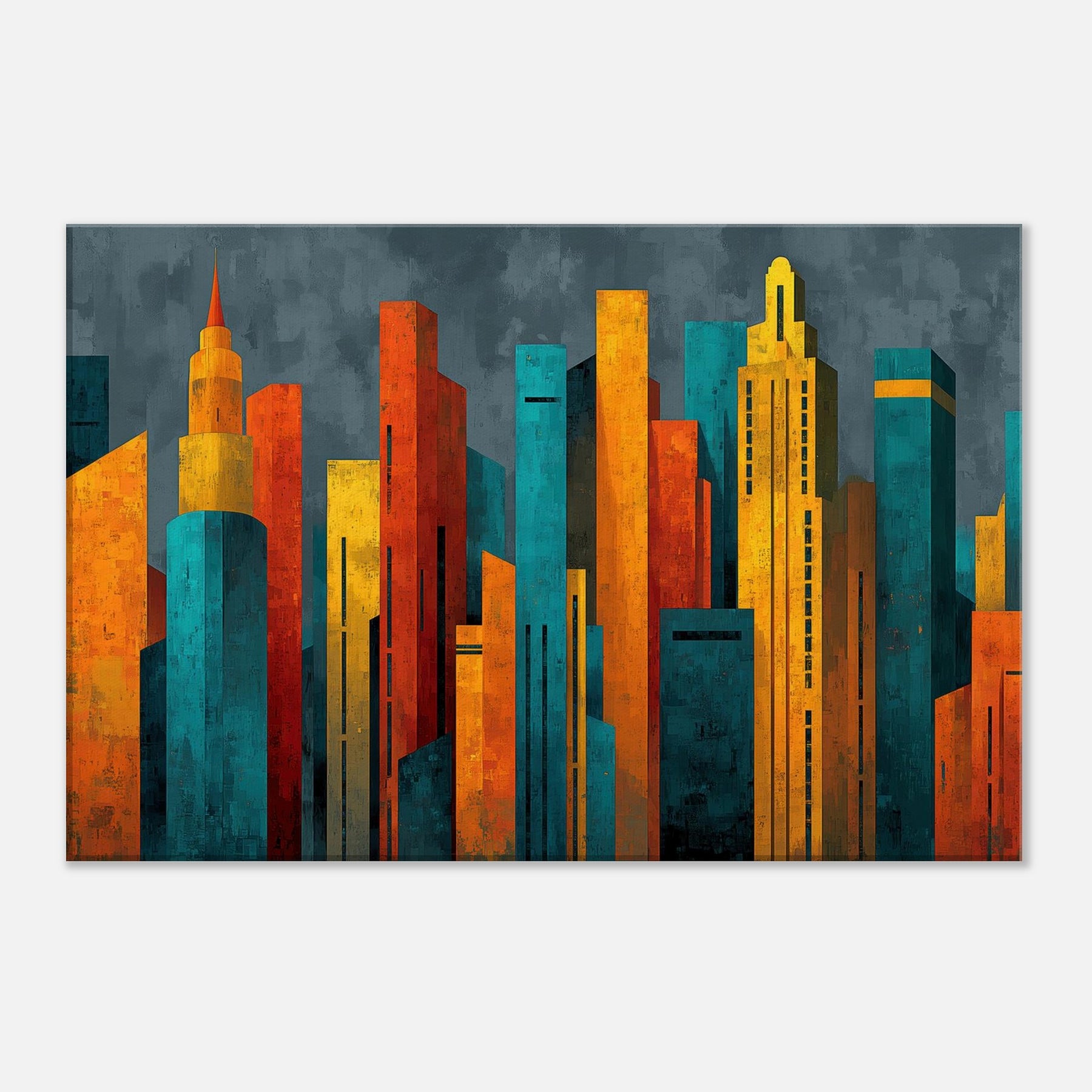 Step into a city of light and possibility. This abstract study of Futuristic Skyscrapers swells with electric color, as if sunrise poured into glass and steel. The textured surfaces catch and bend the room's shadows, while warm ambers contrast with cool teals to create a magnetic atmosphere. Hang it in a living room or hallway, and the piece pulses with energy, inviting conversation and contemplation. It softens daily rhythms into a cinematic moment, elevating space with modern elegance.