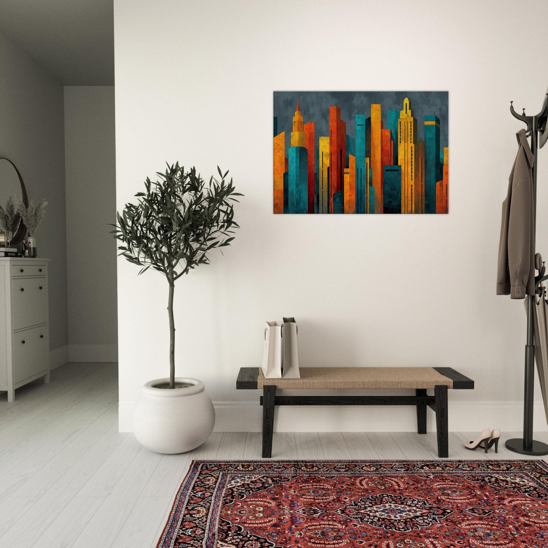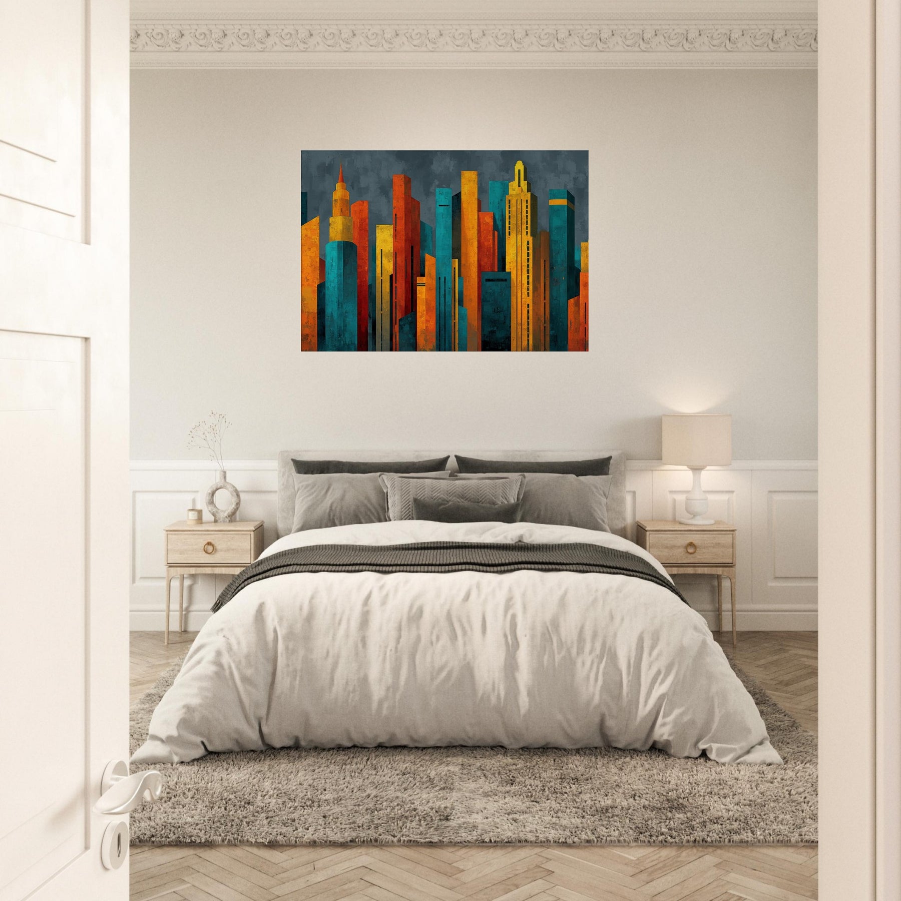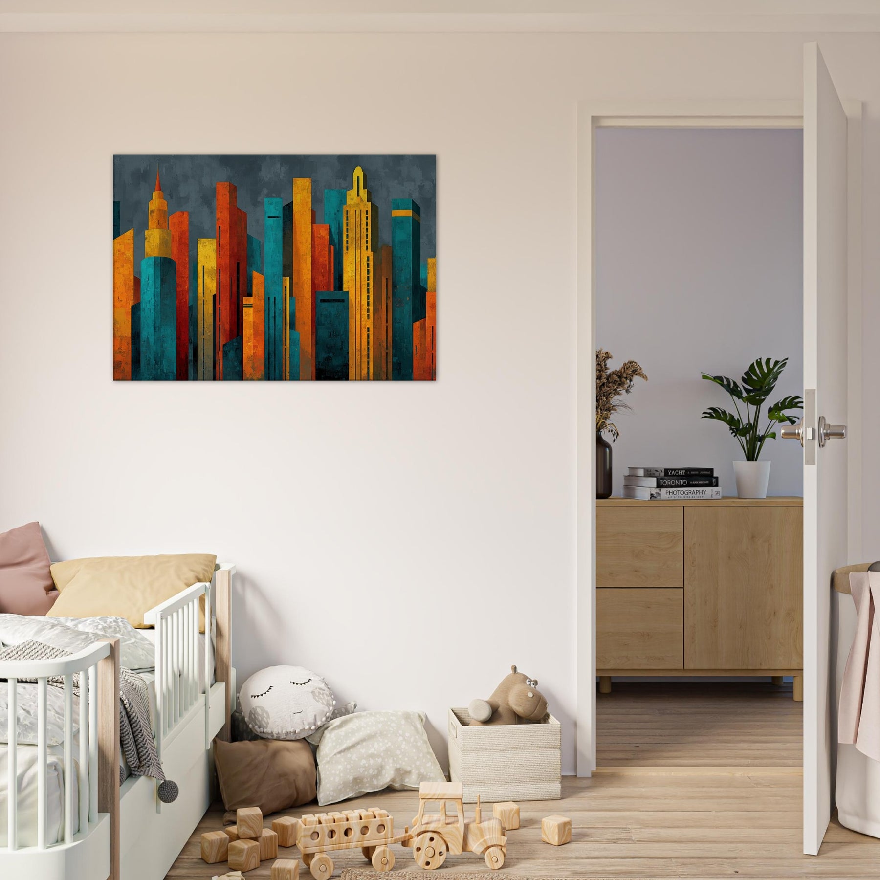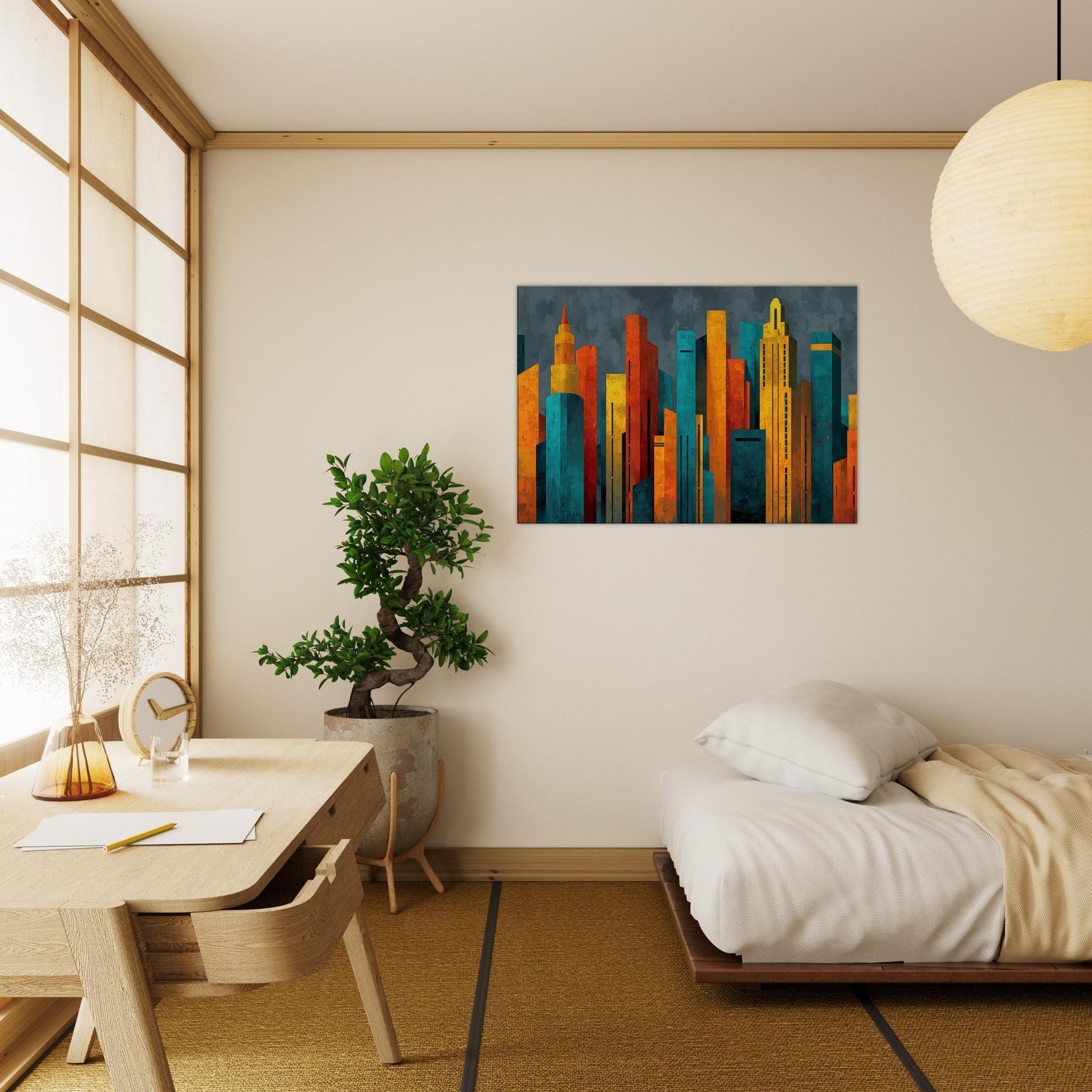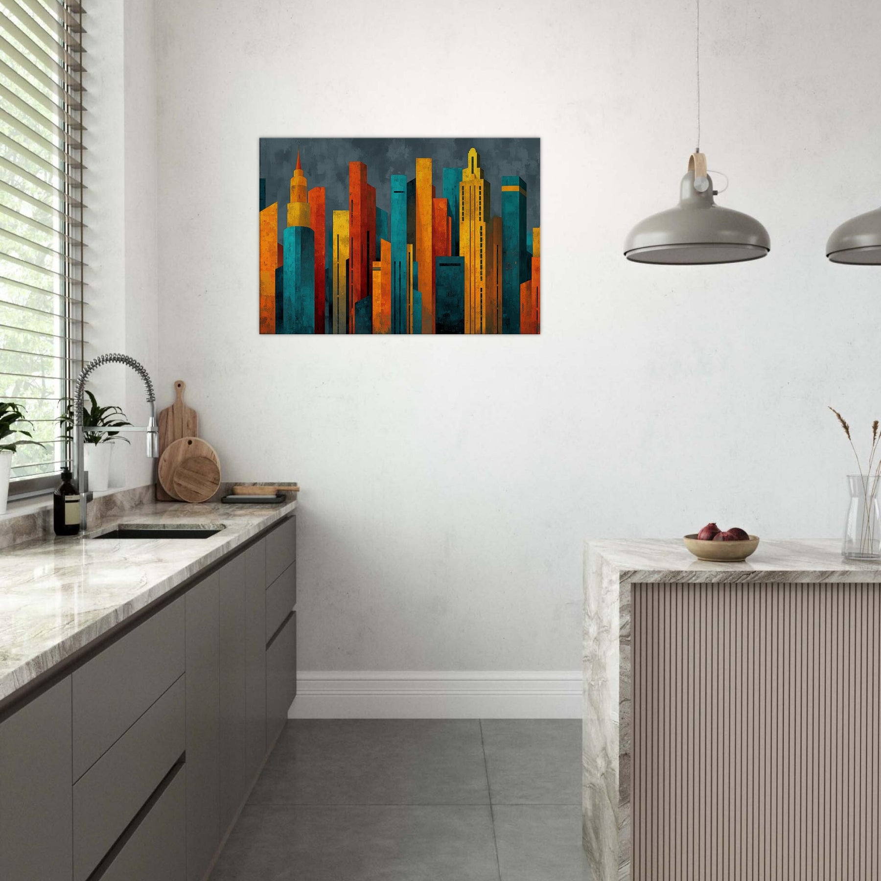 Step into a city of light and possibility. This abstract study of Futuristic Skyscrapers swells with electric color, as if sunrise poured into glass and steel. The textured surfaces catch and bend the room's shadows, while warm ambers contrast with cool teals to create a magnetic atmosphere. Hang it in a living room or hallway, and the piece pulses with energy, inviting conversation and contemplation. It softens daily rhythms into a cinematic moment, elevating space with modern elegance.
