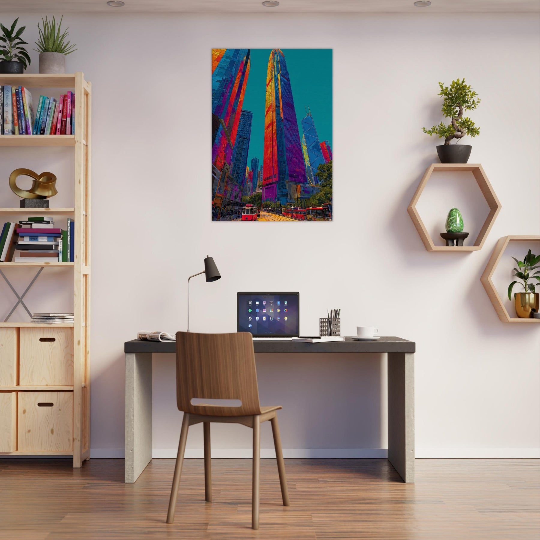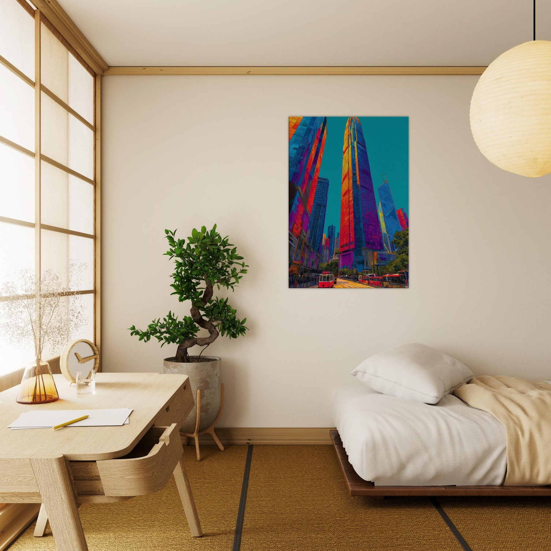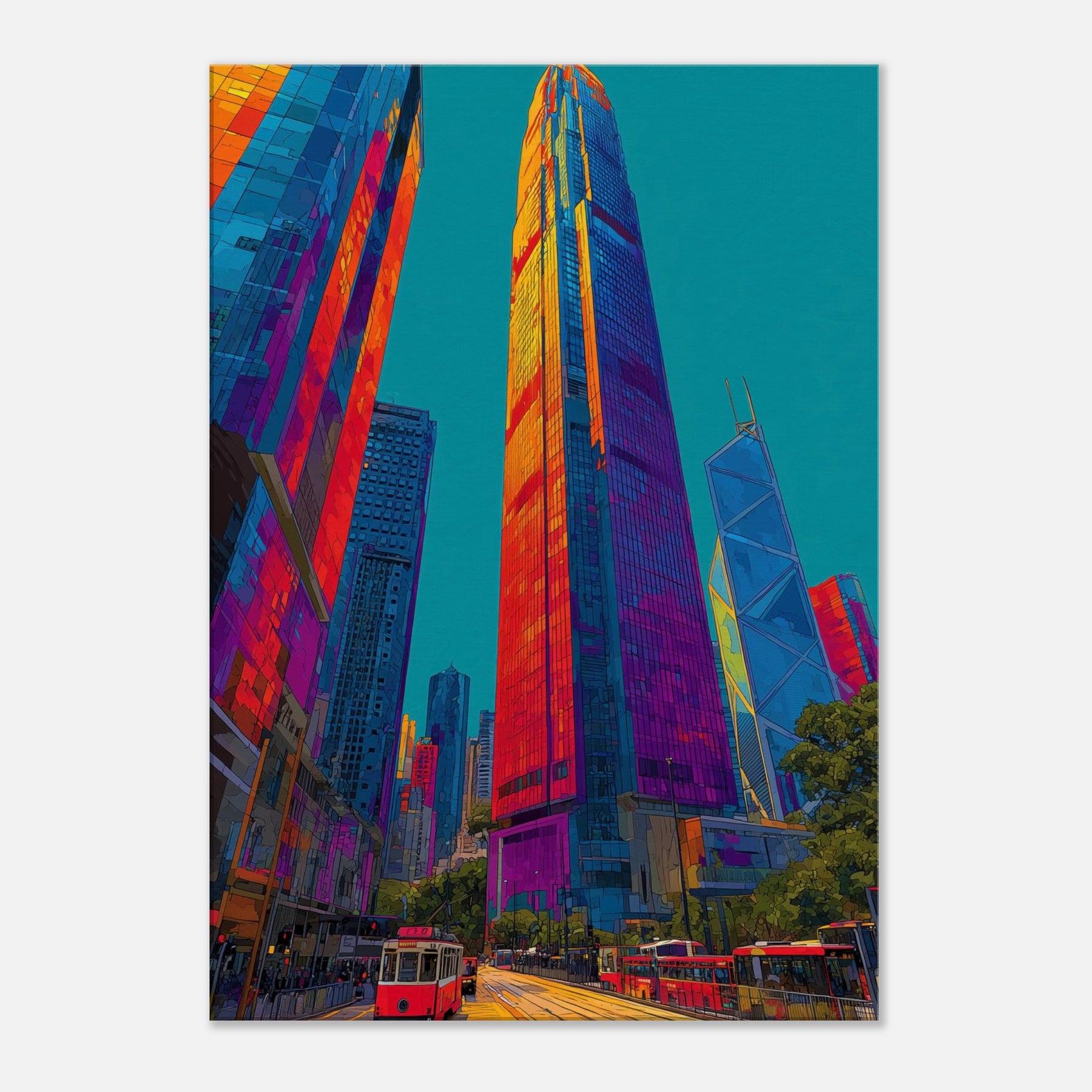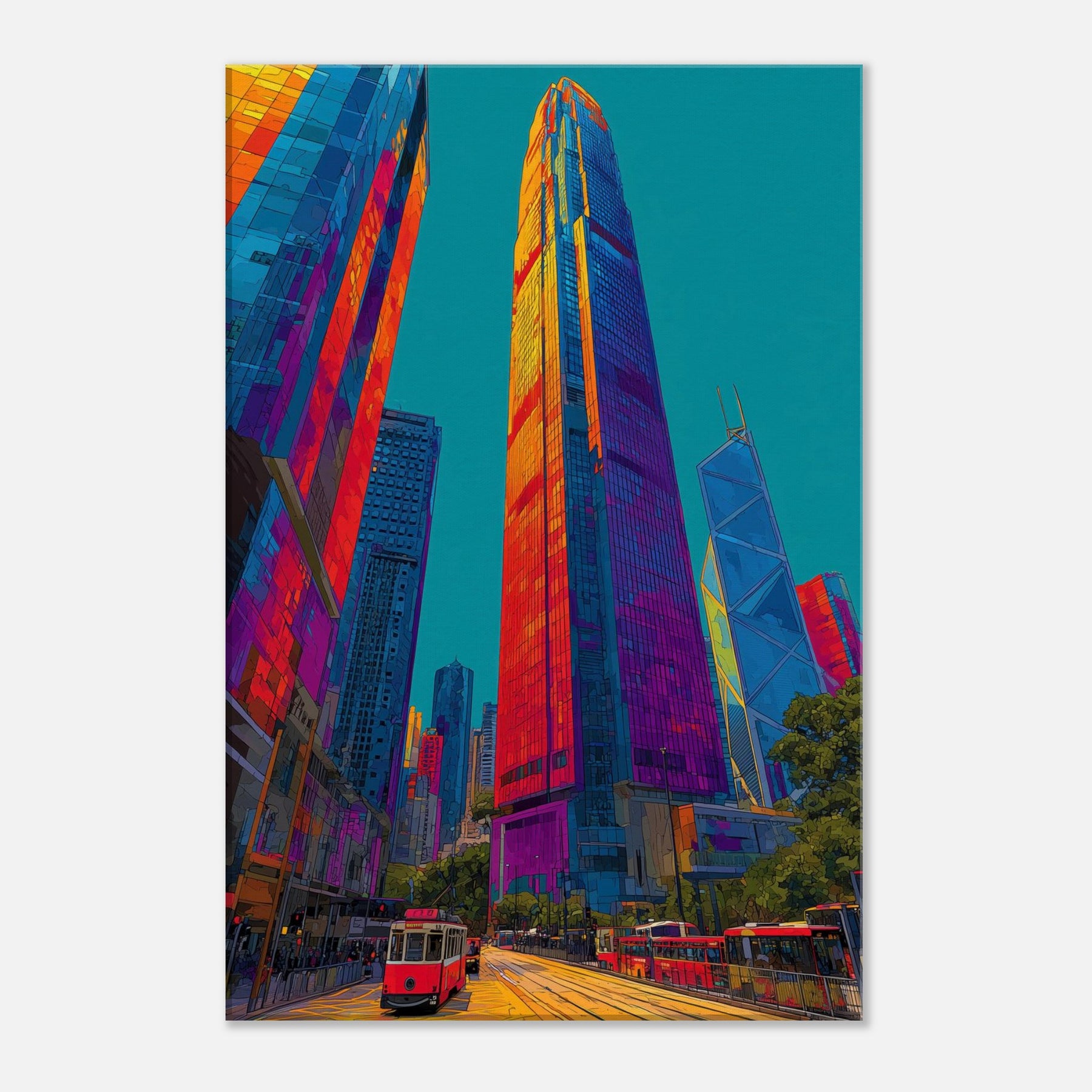 This work translates Hong Kong skyline into a luminous river of color. We see towering silhouettes bathed in fiery oranges, electric pinks, and deep blues that pulse with city life. The piece invites the eye to travel along glassy facades, tram tracks, and harbor light, turning a room into a nocturnal promenade. It brings drama and warmth in equal measure, enhancing modern living spaces with a sense of scale, motion, and urban magnetism.