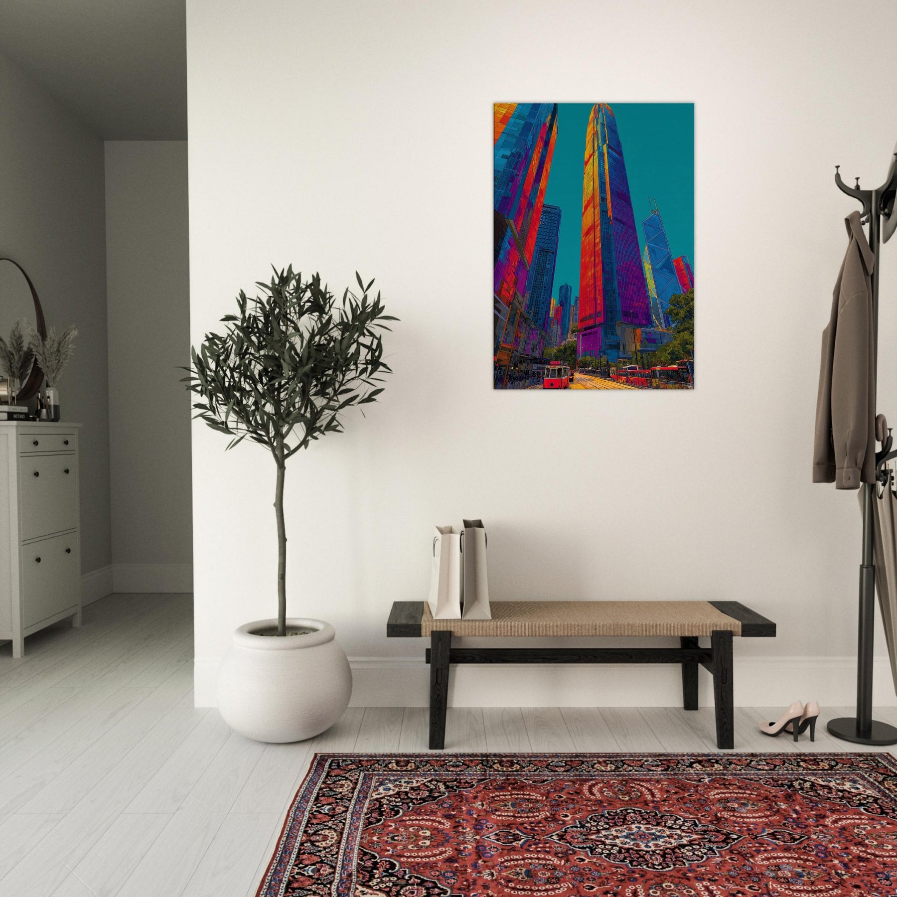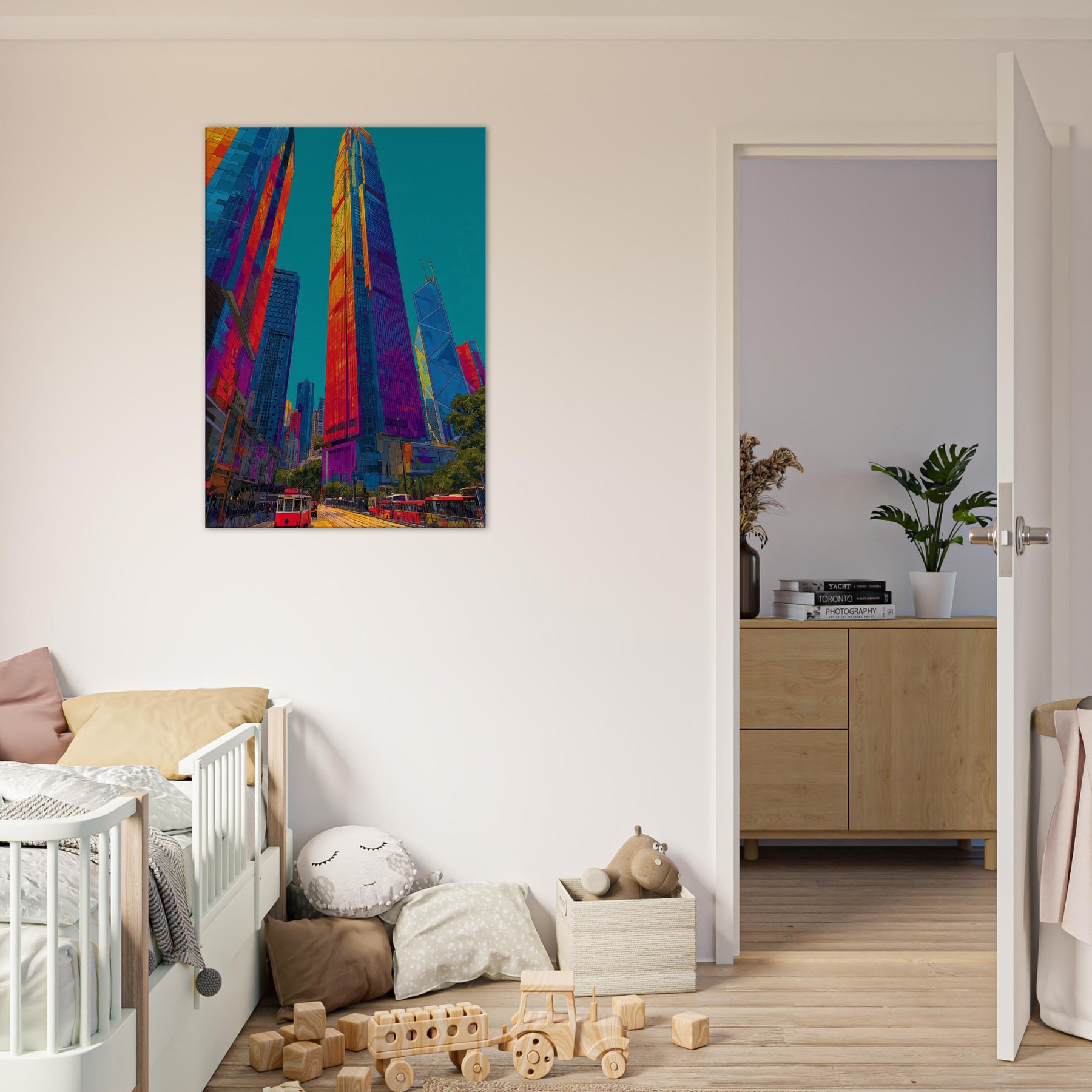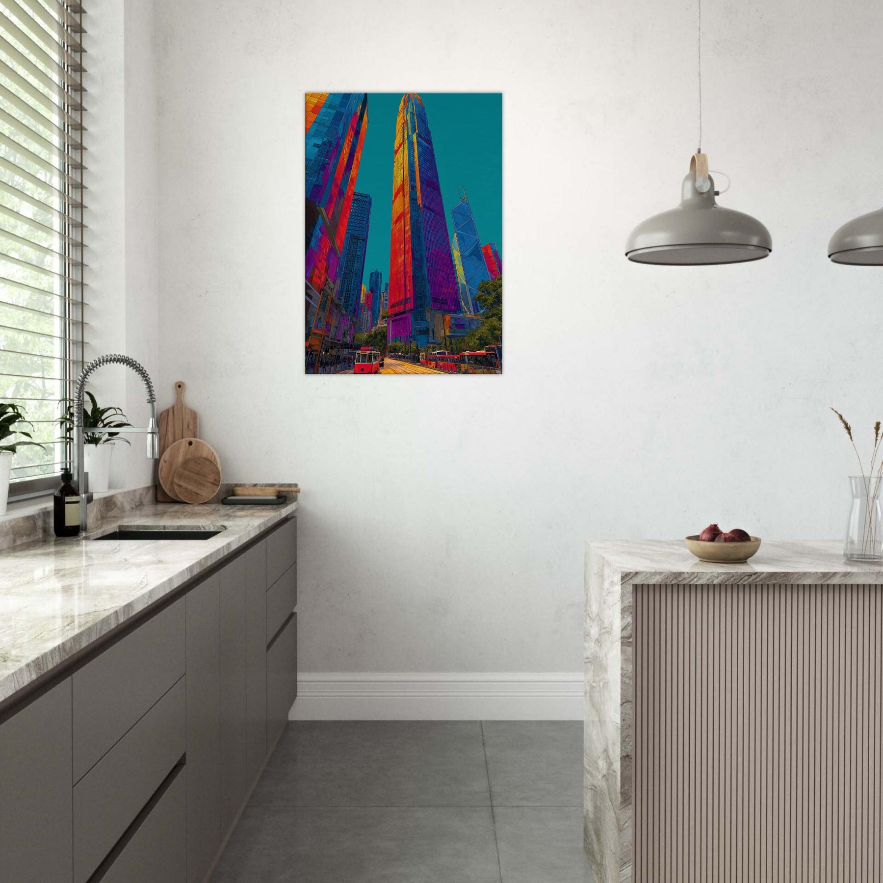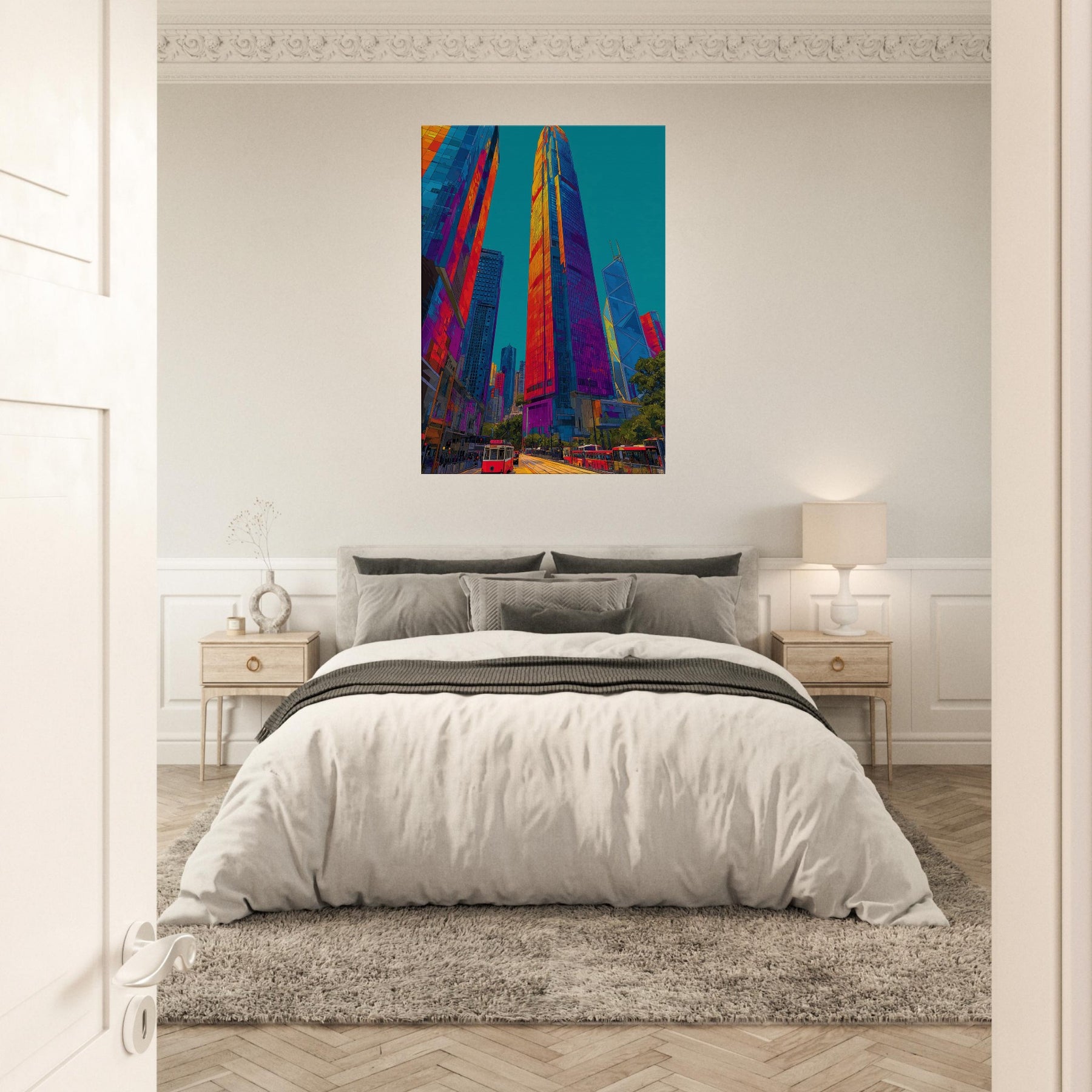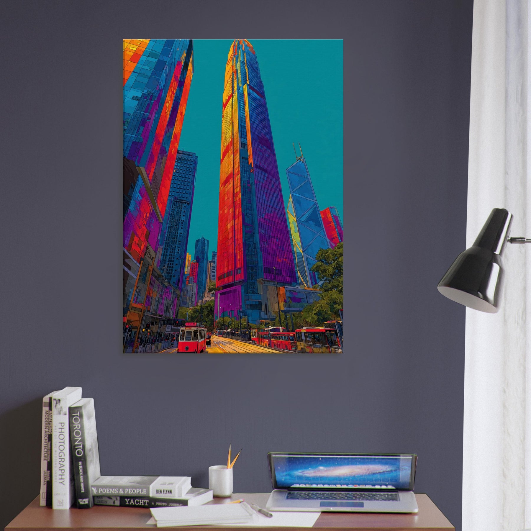 This work translates Hong Kong skyline into a luminous river of color. We see towering silhouettes bathed in fiery oranges, electric pinks, and deep blues that pulse with city life. The piece invites the eye to travel along glassy facades, tram tracks, and harbor light, turning a room into a nocturnal promenade. It brings drama and warmth in equal measure, enhancing modern living spaces with a sense of scale, motion, and urban magnetism.