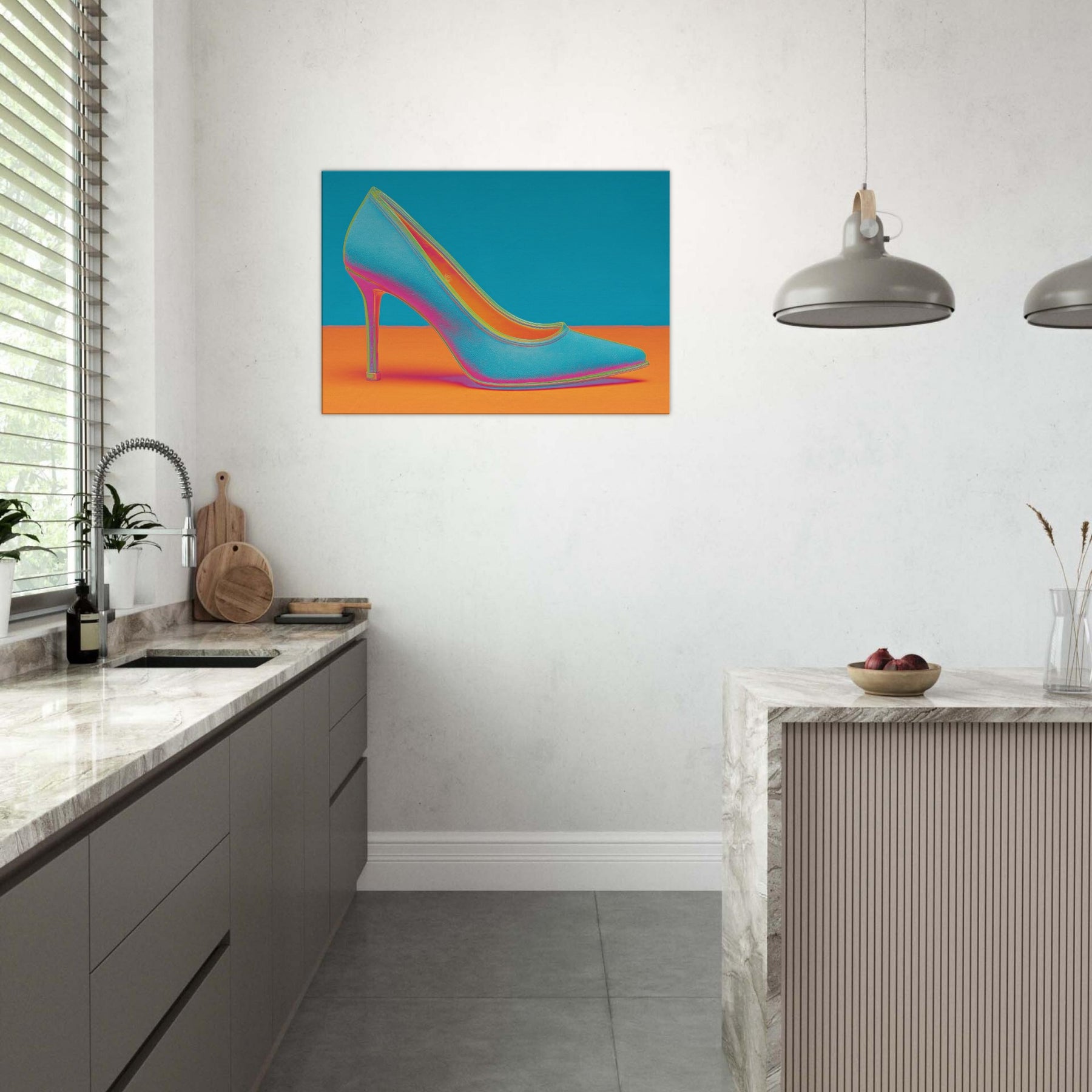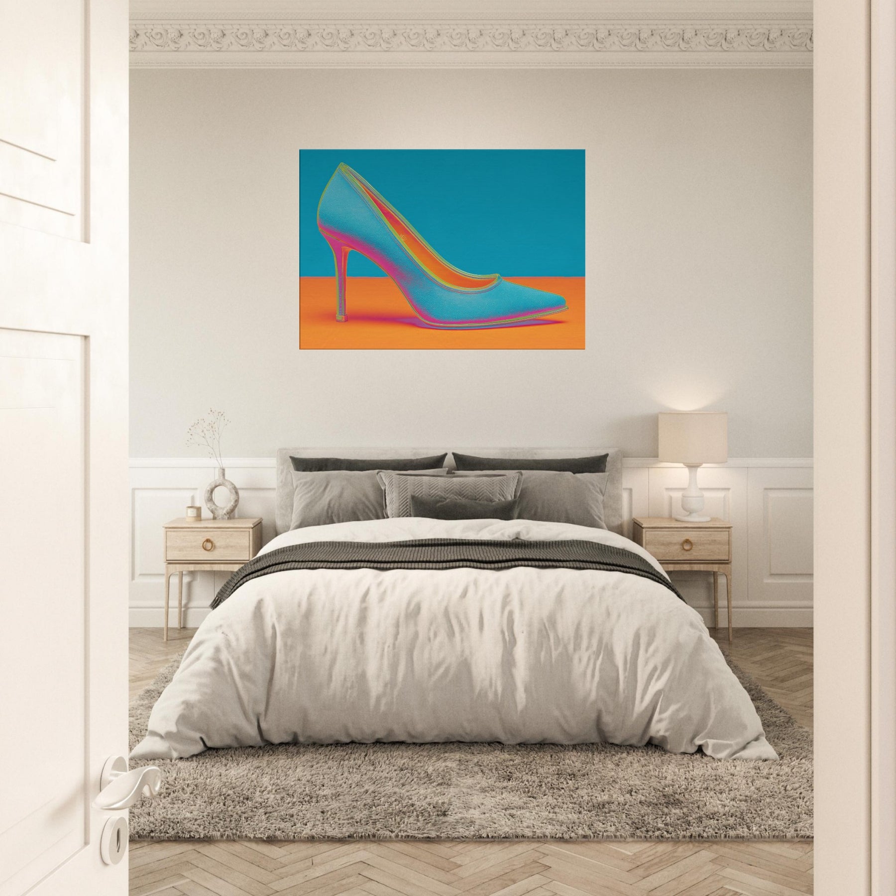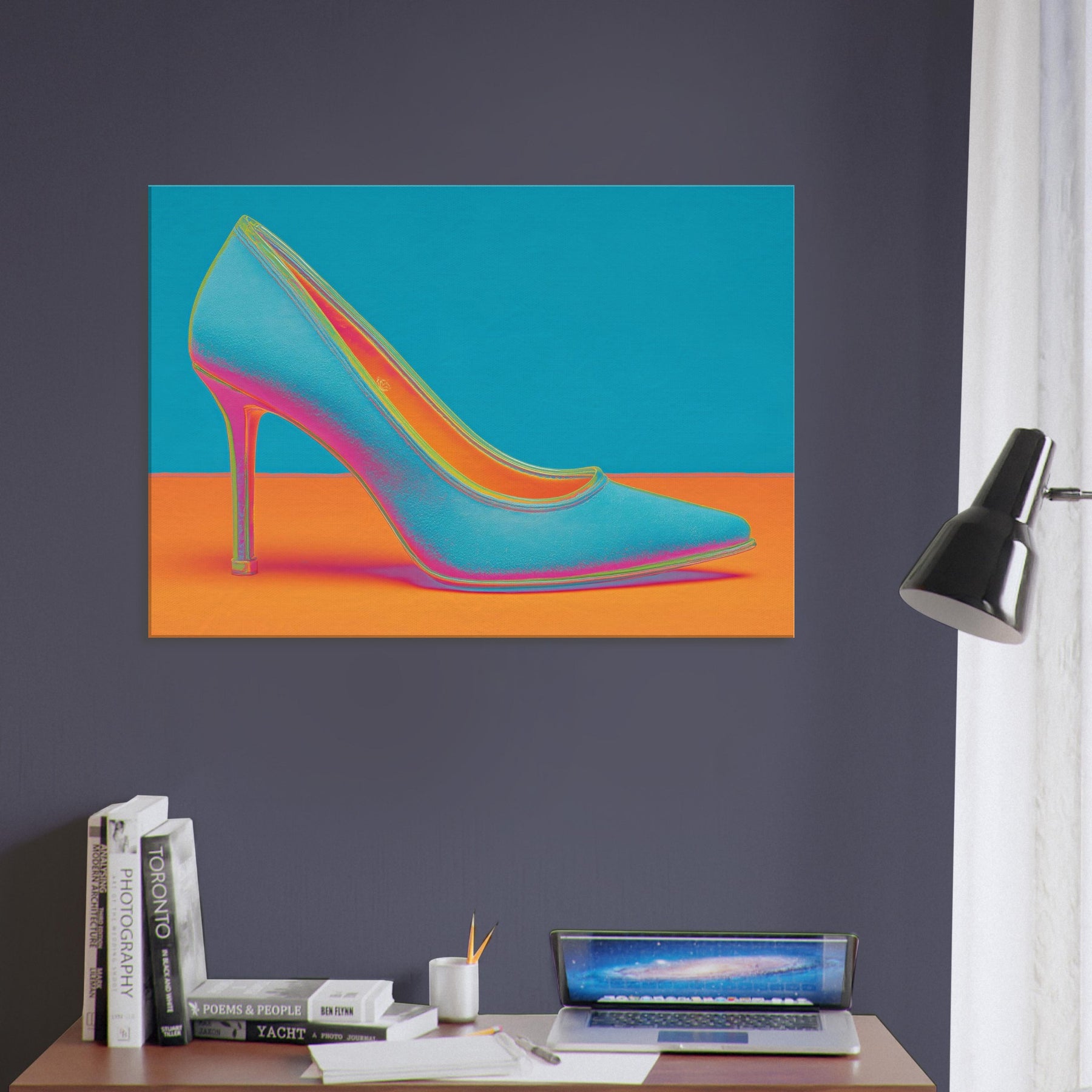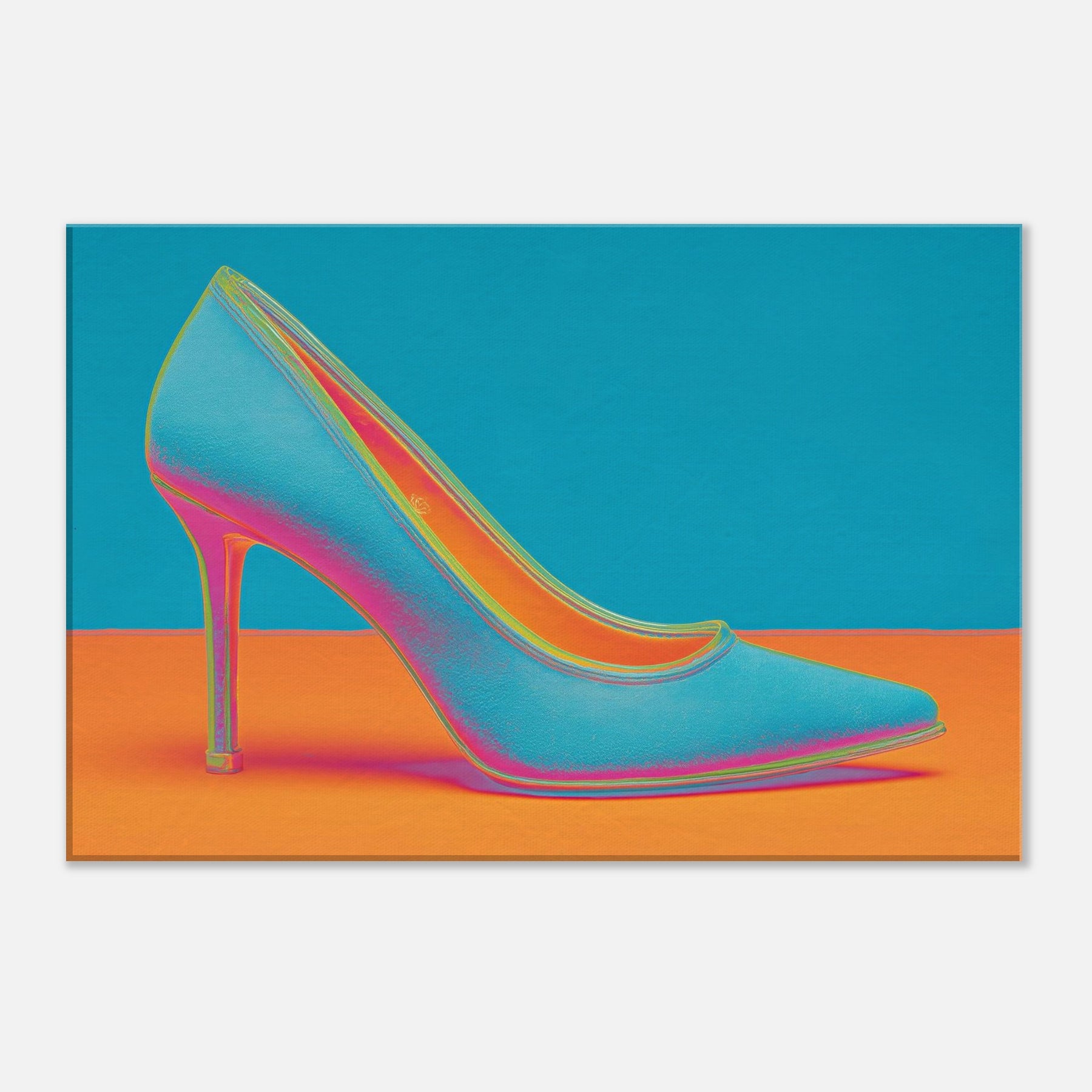 Let this High Heel shimmer through your space, a dynamic ode to movement and glamour. The abstract form dissolves into electric color, turning a single iconic silhouette into a mood of bold, unapologetic chic. This wall art invites conversation as light seems to bend around its curve, imbuing a living room or studio with kinetic energy and contemporary polish. Perfect for a statement wall, it pairs well with velvet textures and metallic accents, elevating any modern sanctuary.