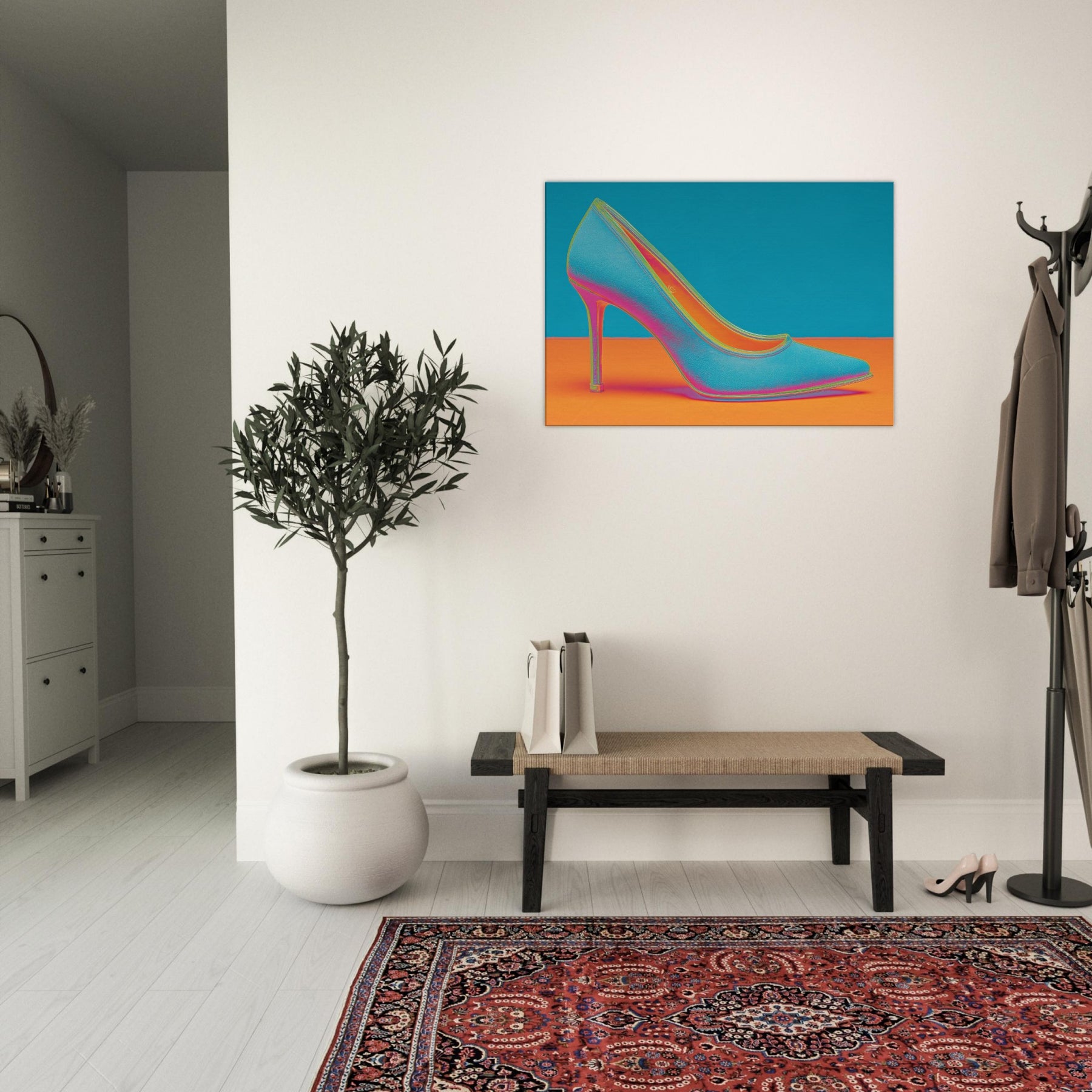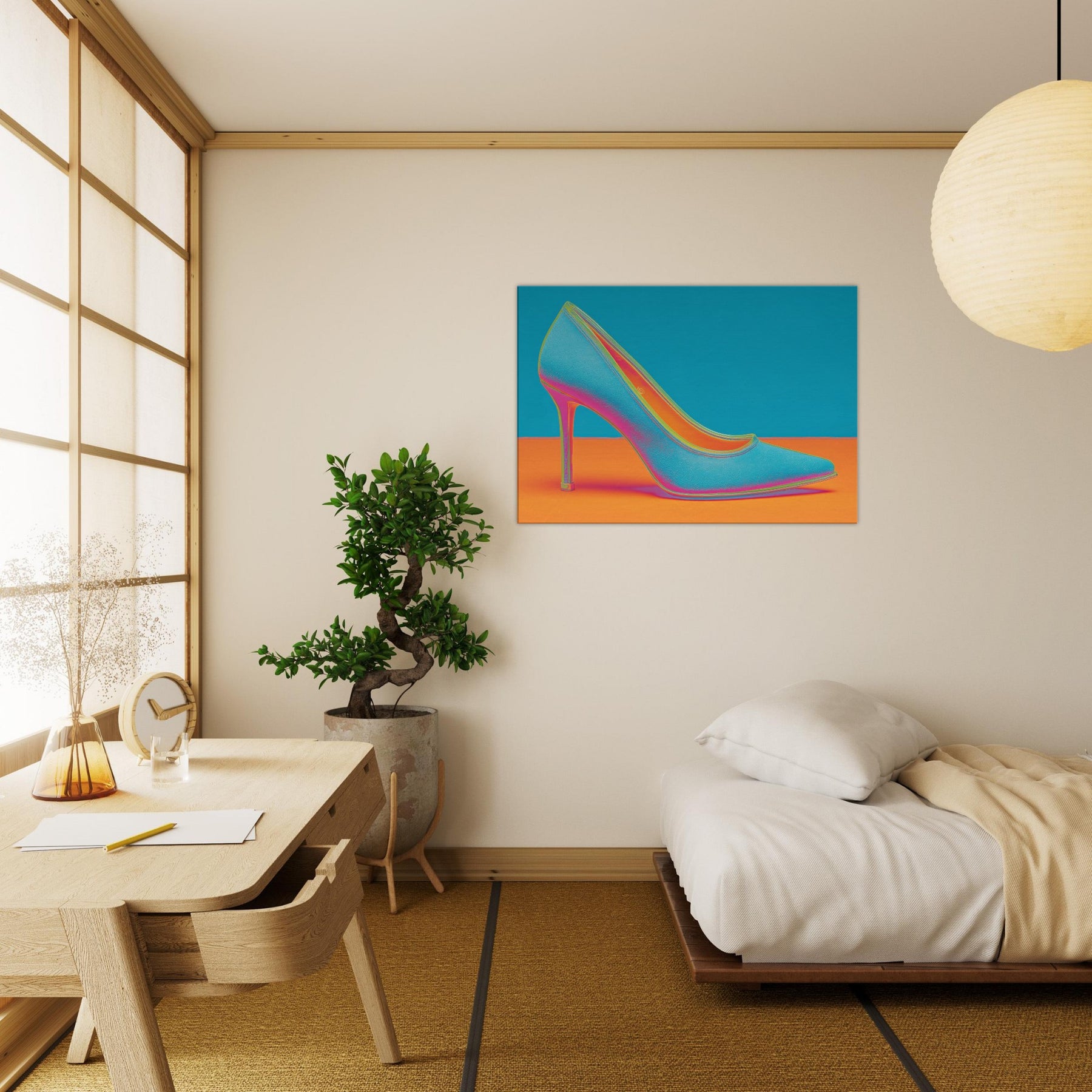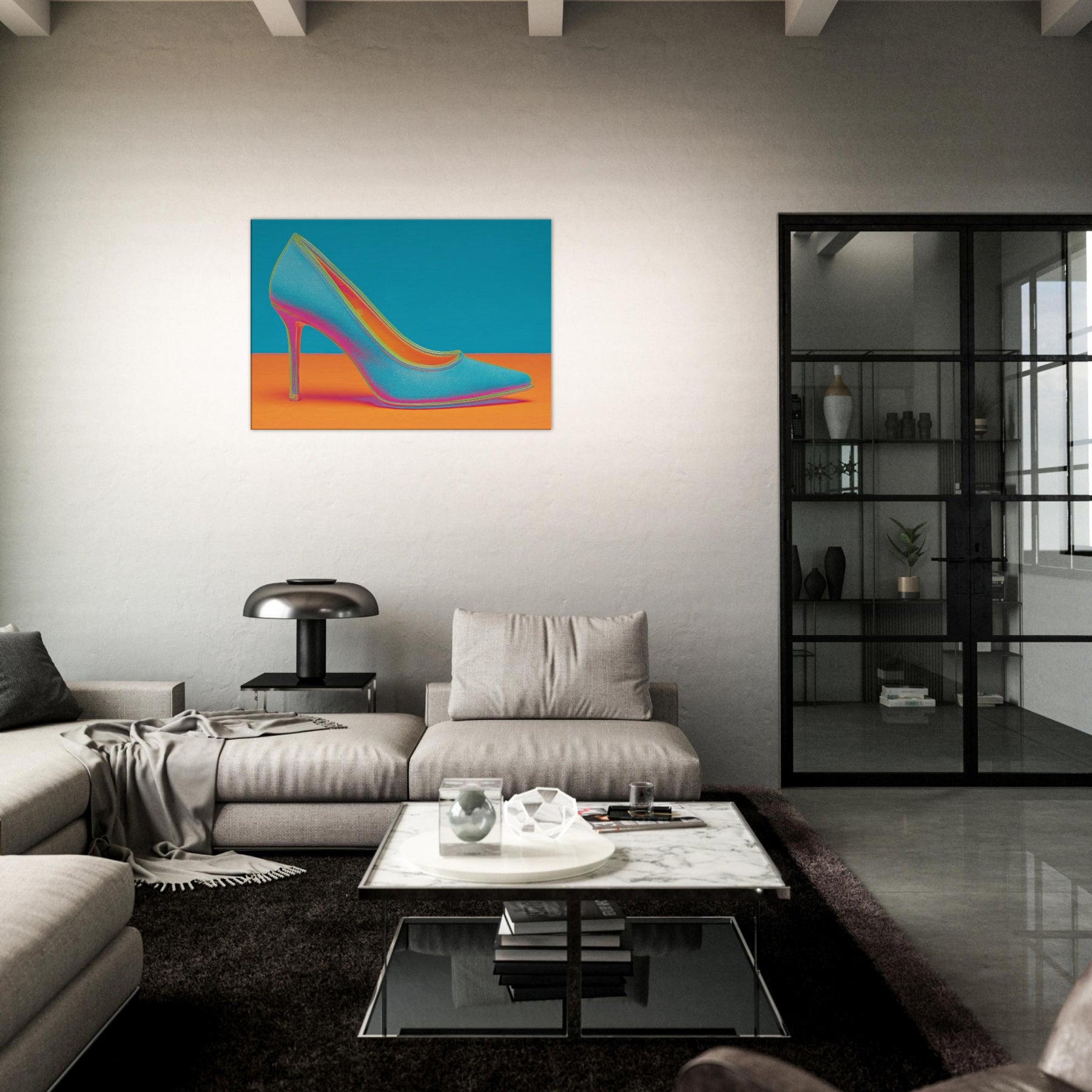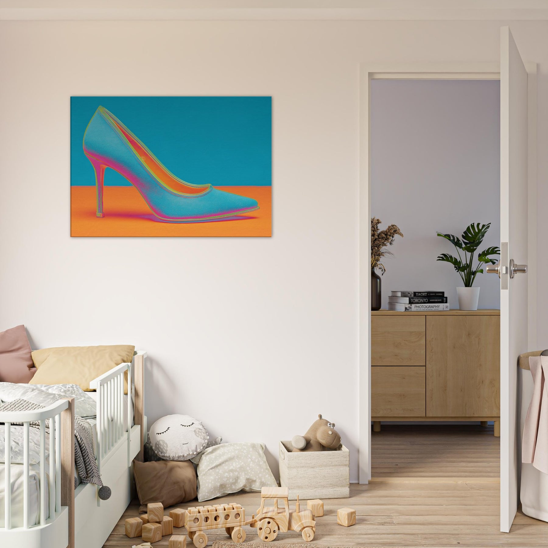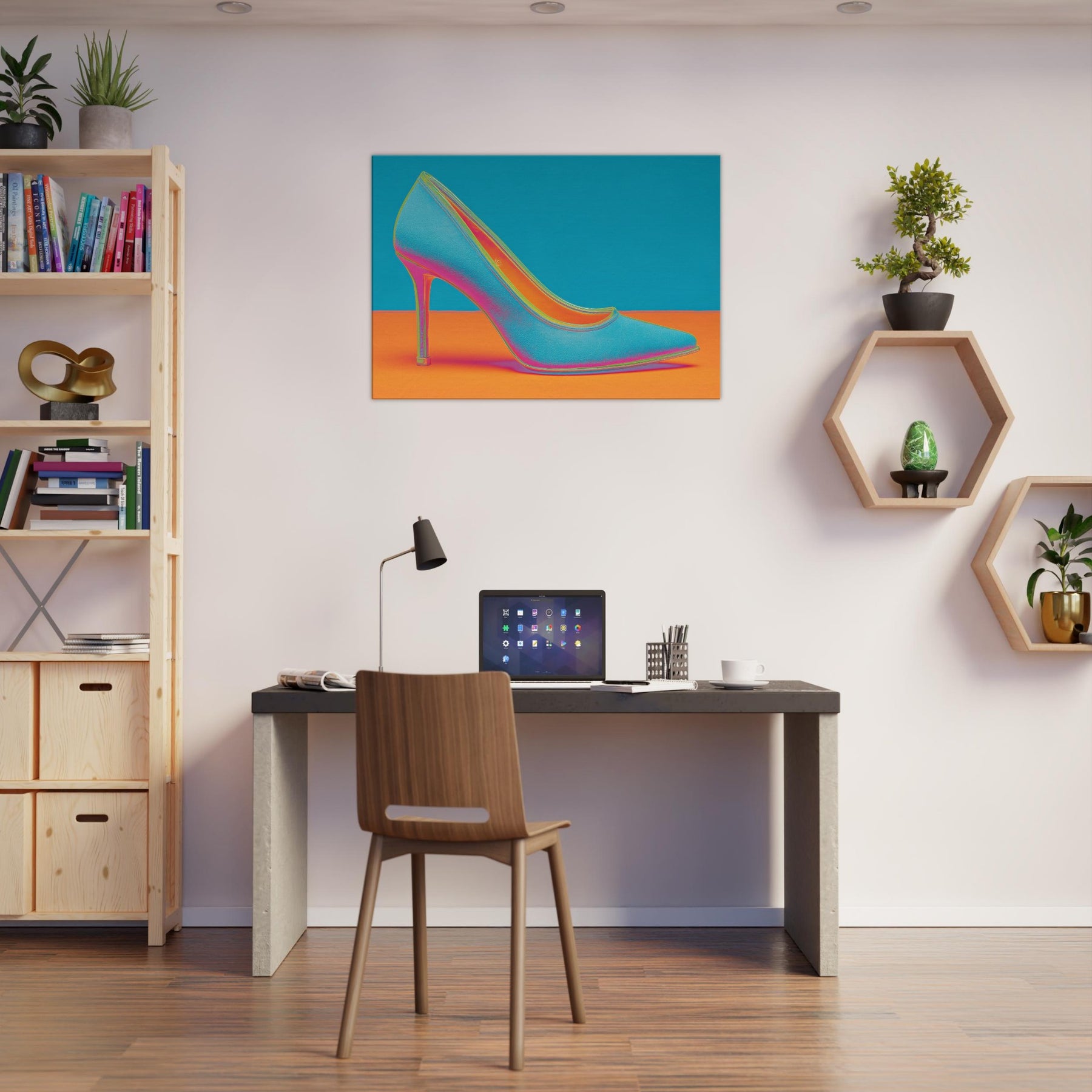 Let this High Heel shimmer through your space, a dynamic ode to movement and glamour. The abstract form dissolves into electric color, turning a single iconic silhouette into a mood of bold, unapologetic chic. This wall art invites conversation as light seems to bend around its curve, imbuing a living room or studio with kinetic energy and contemporary polish. Perfect for a statement wall, it pairs well with velvet textures and metallic accents, elevating any modern sanctuary.