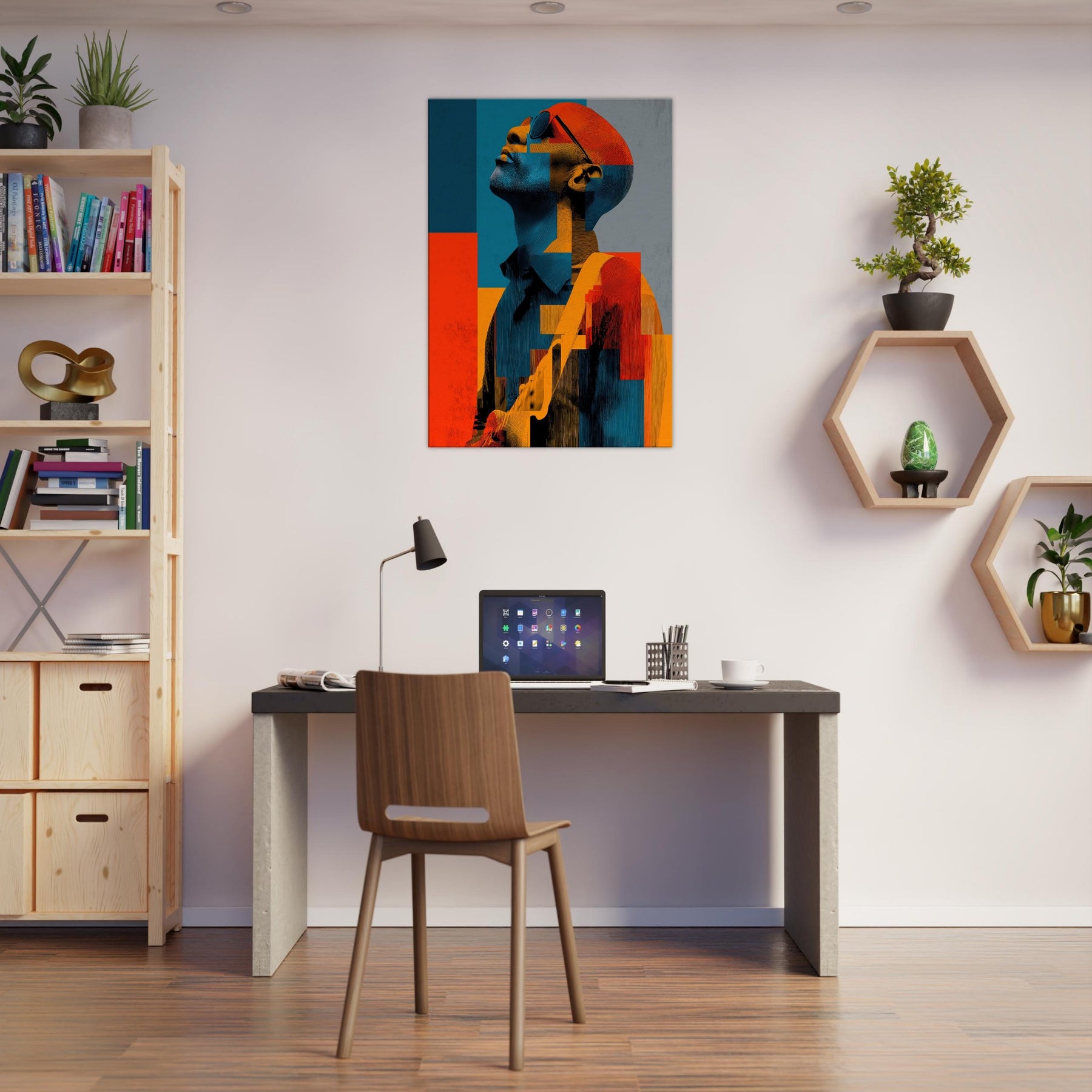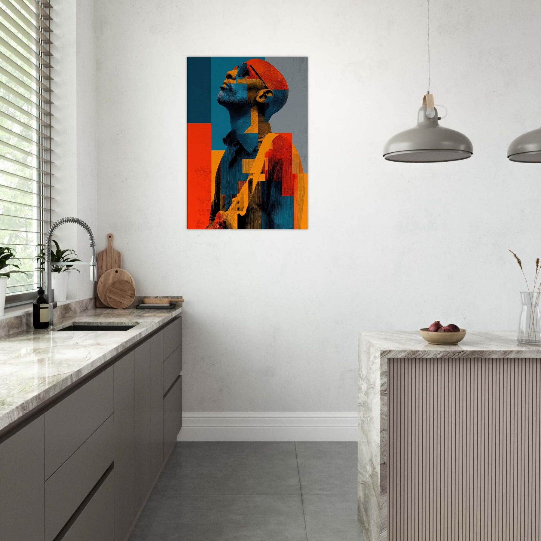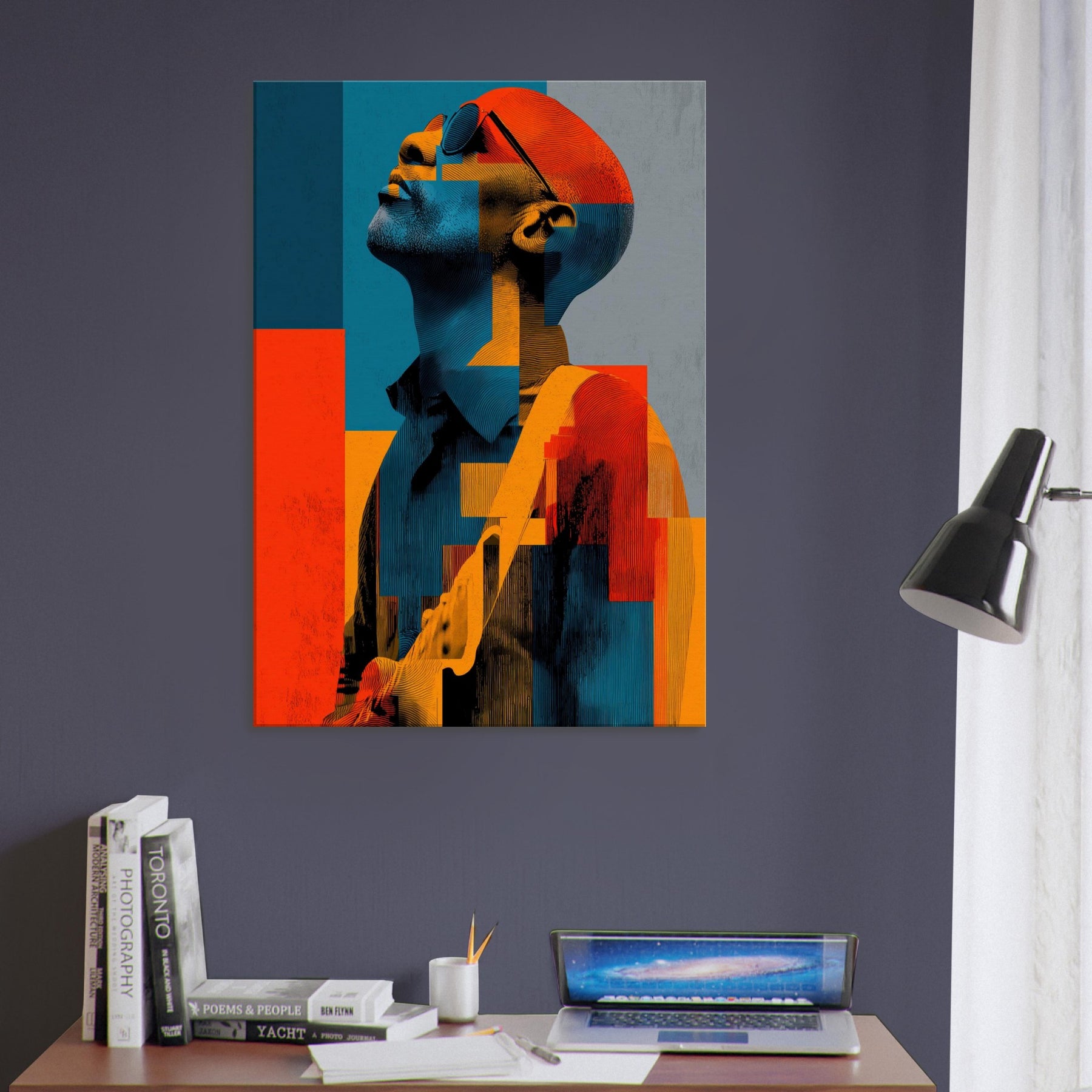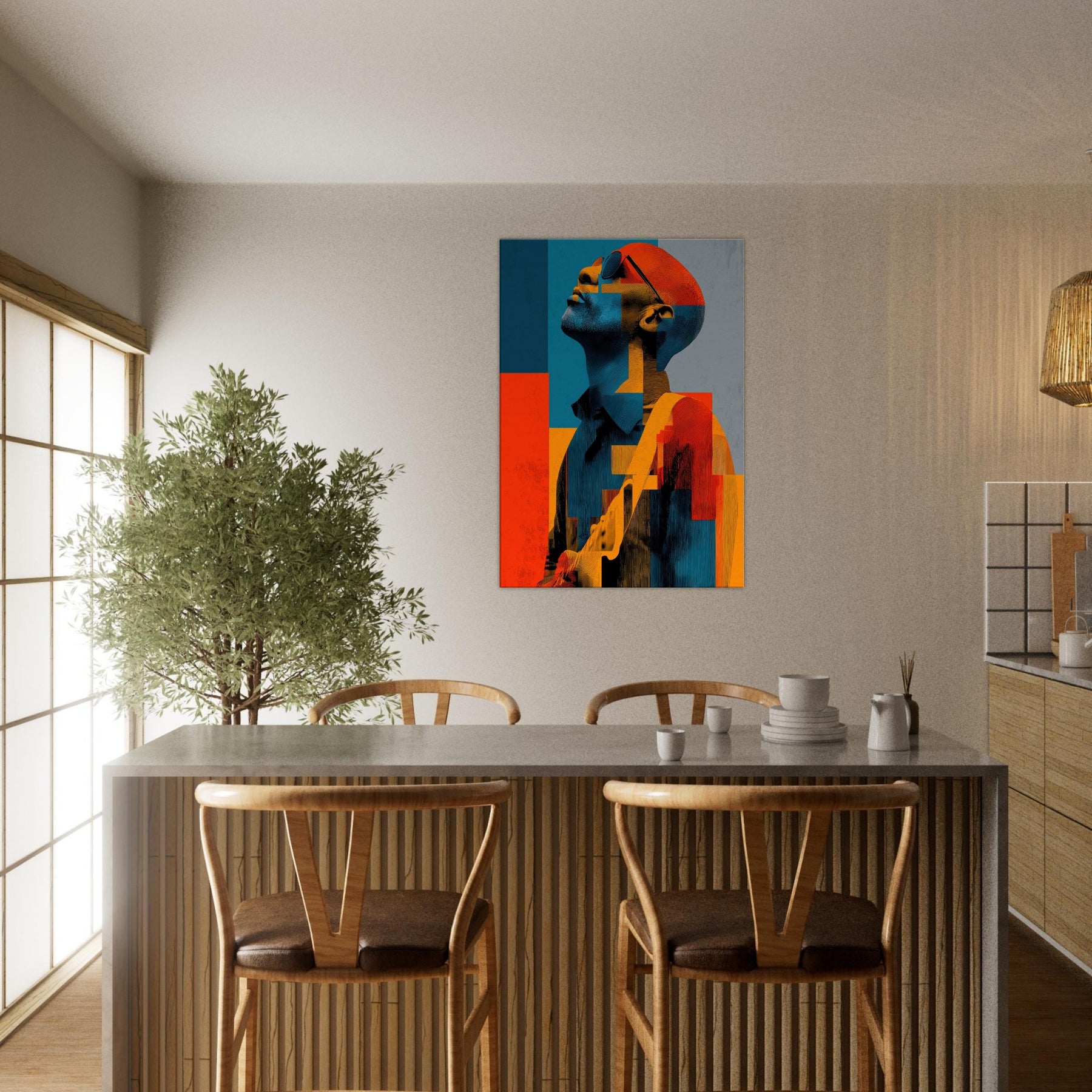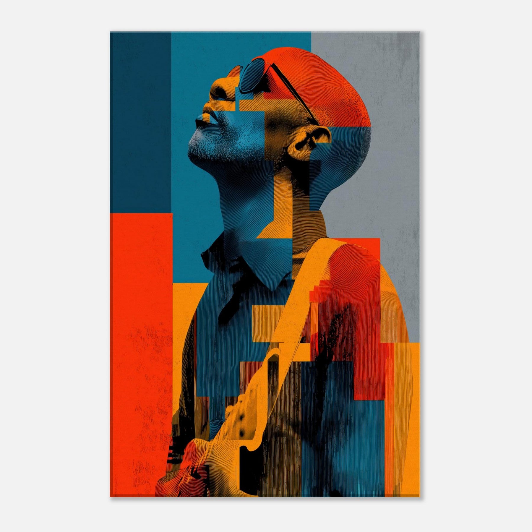 In this abstract , a Guitarist reaches toward the light, his features dissolving into painterly blocks of blue, orange, and charcoal. The mood is electric and contemplative, as if music were visible in color and shadow. Each geometric fragment catches a note, inviting the eye to glide across the surface and linger where warmth meets restraint. Placed in a living room or studio, it casts a luminous calm that stills time while amplifying conversation. The Guitarist becomes a chorus of form and feeling modern, intimate, endlessly magnetic.
