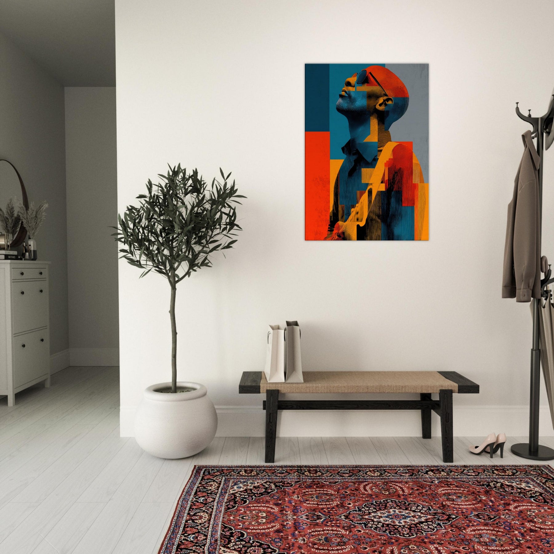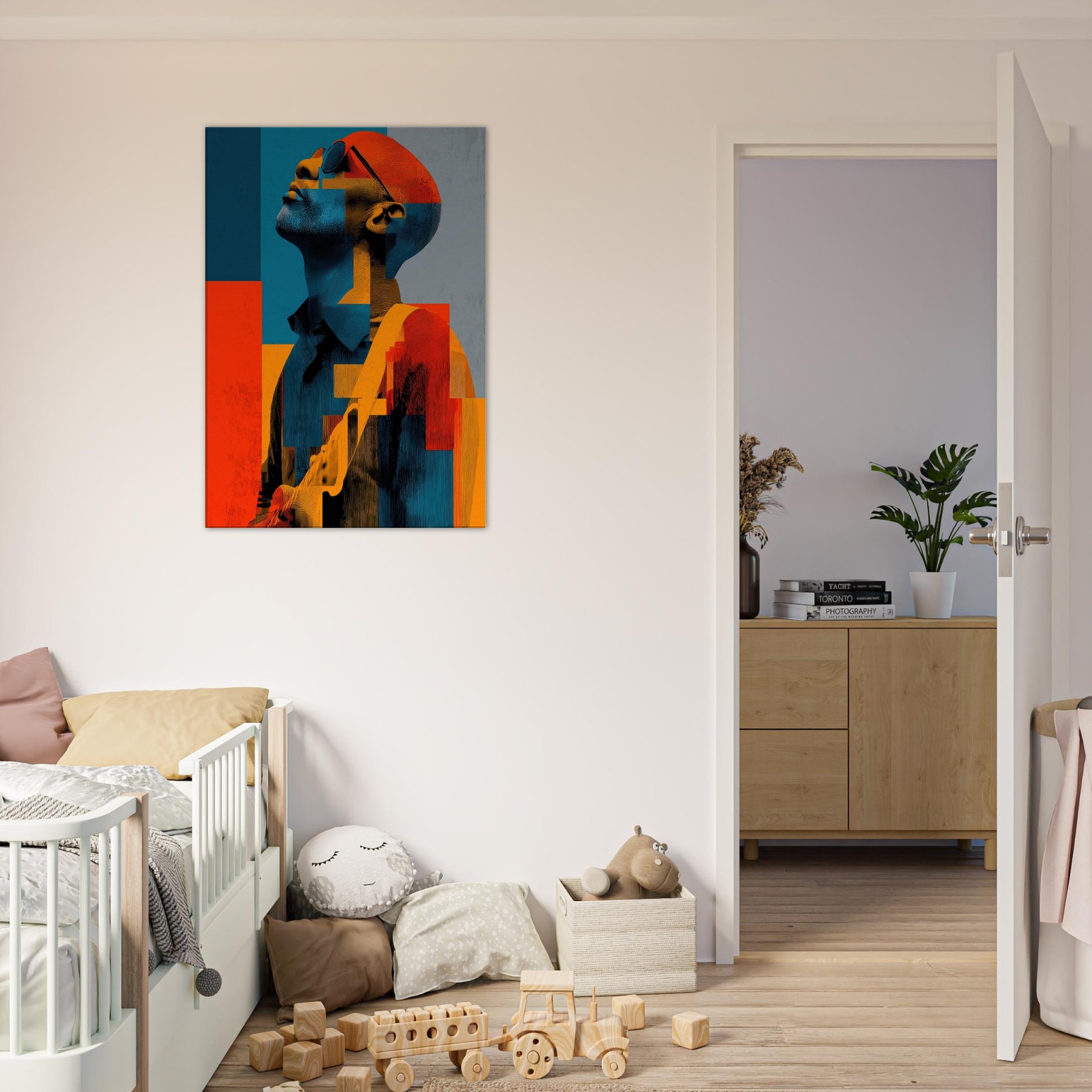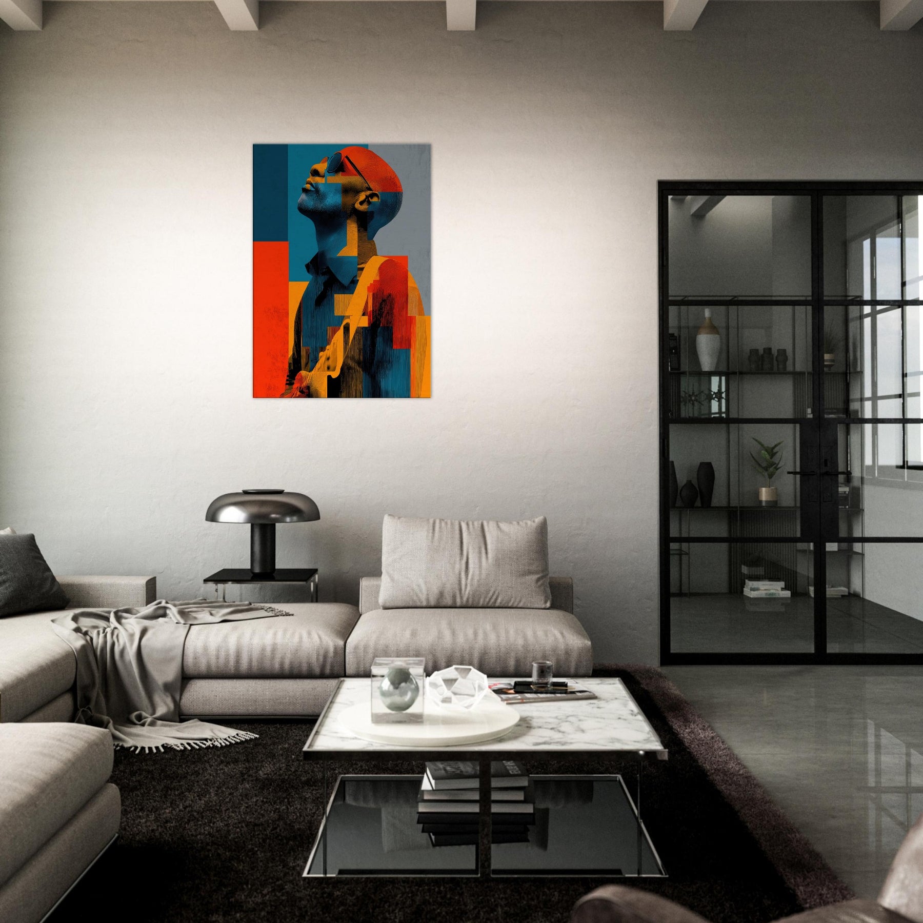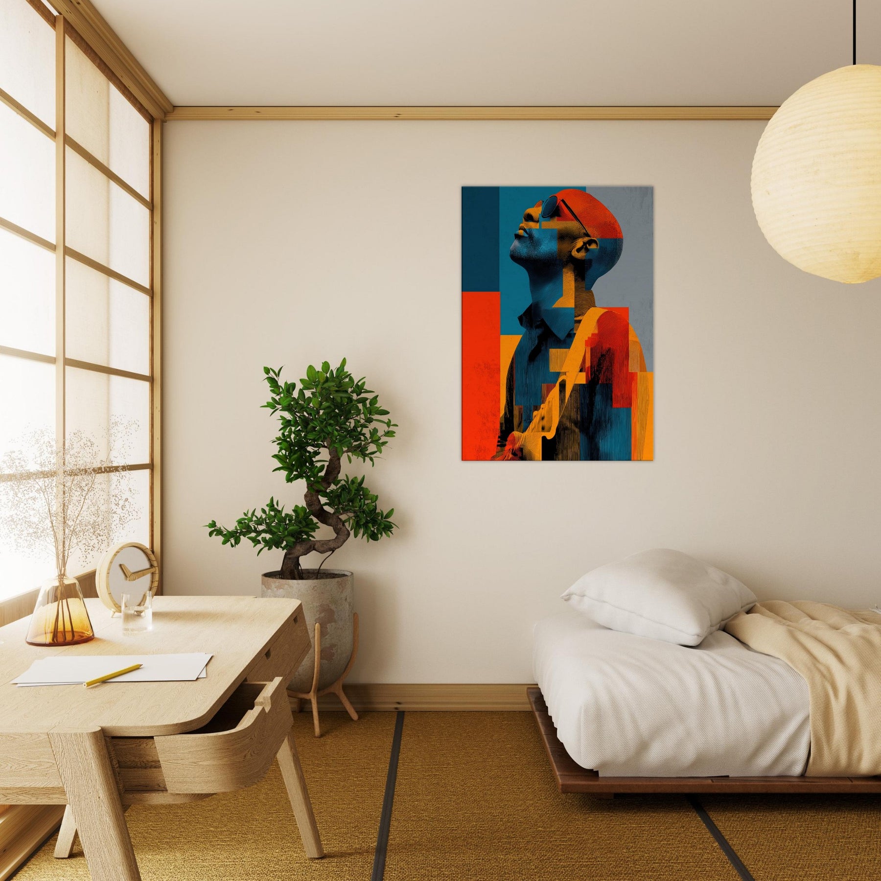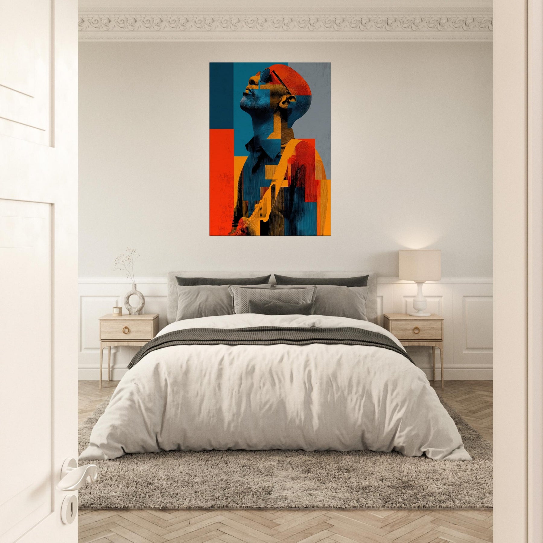 In this abstract , a Guitarist reaches toward the light, his features dissolving into painterly blocks of blue, orange, and charcoal. The mood is electric and contemplative, as if music were visible in color and shadow. Each geometric fragment catches a note, inviting the eye to glide across the surface and linger where warmth meets restraint. Placed in a living room or studio, it casts a luminous calm that stills time while amplifying conversation. The Guitarist becomes a chorus of form and feeling modern, intimate, endlessly magnetic.