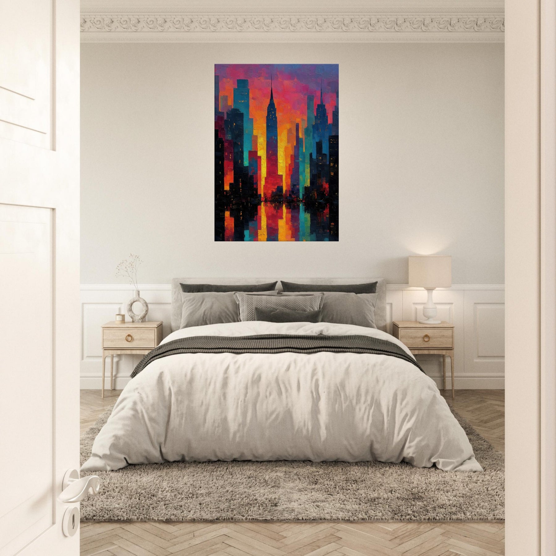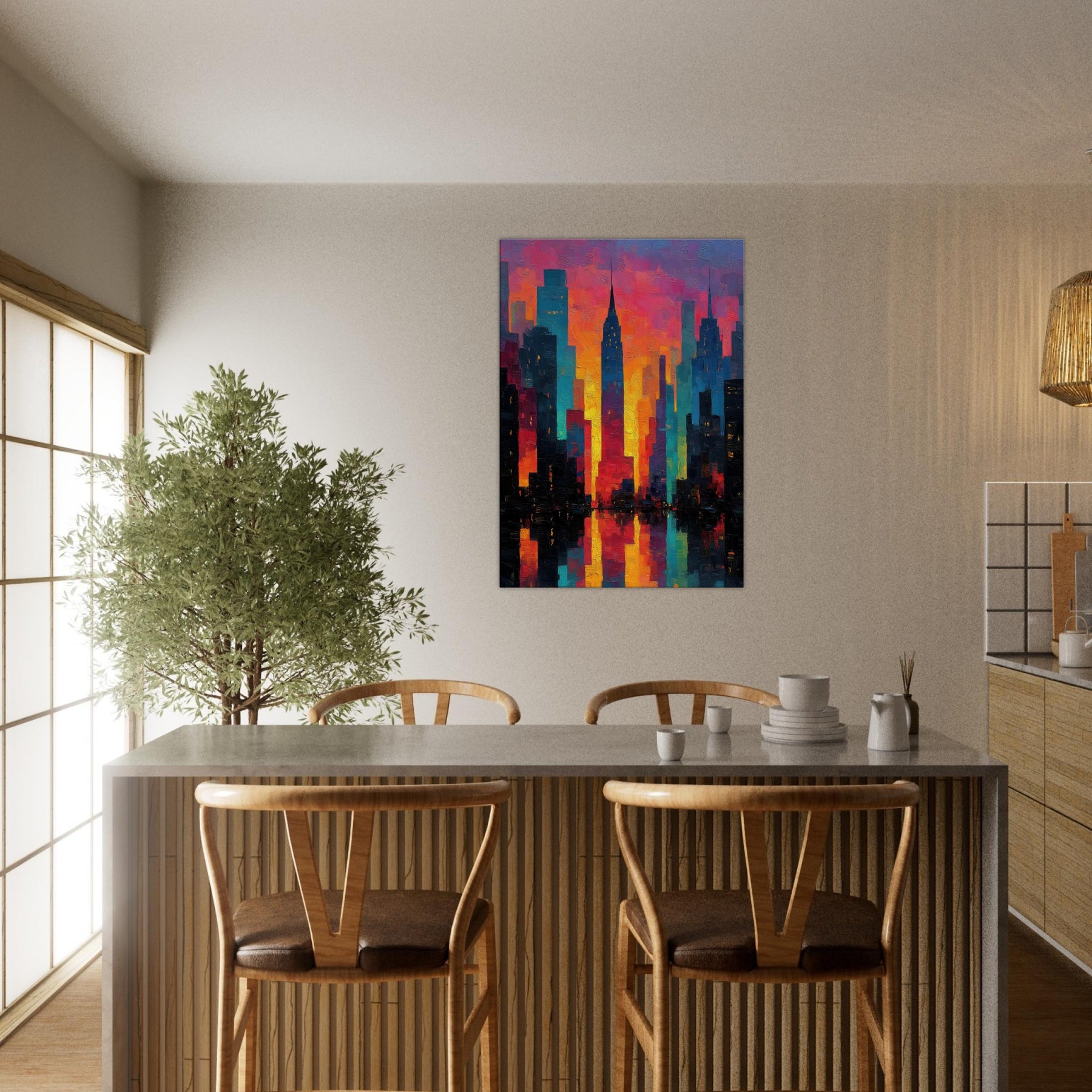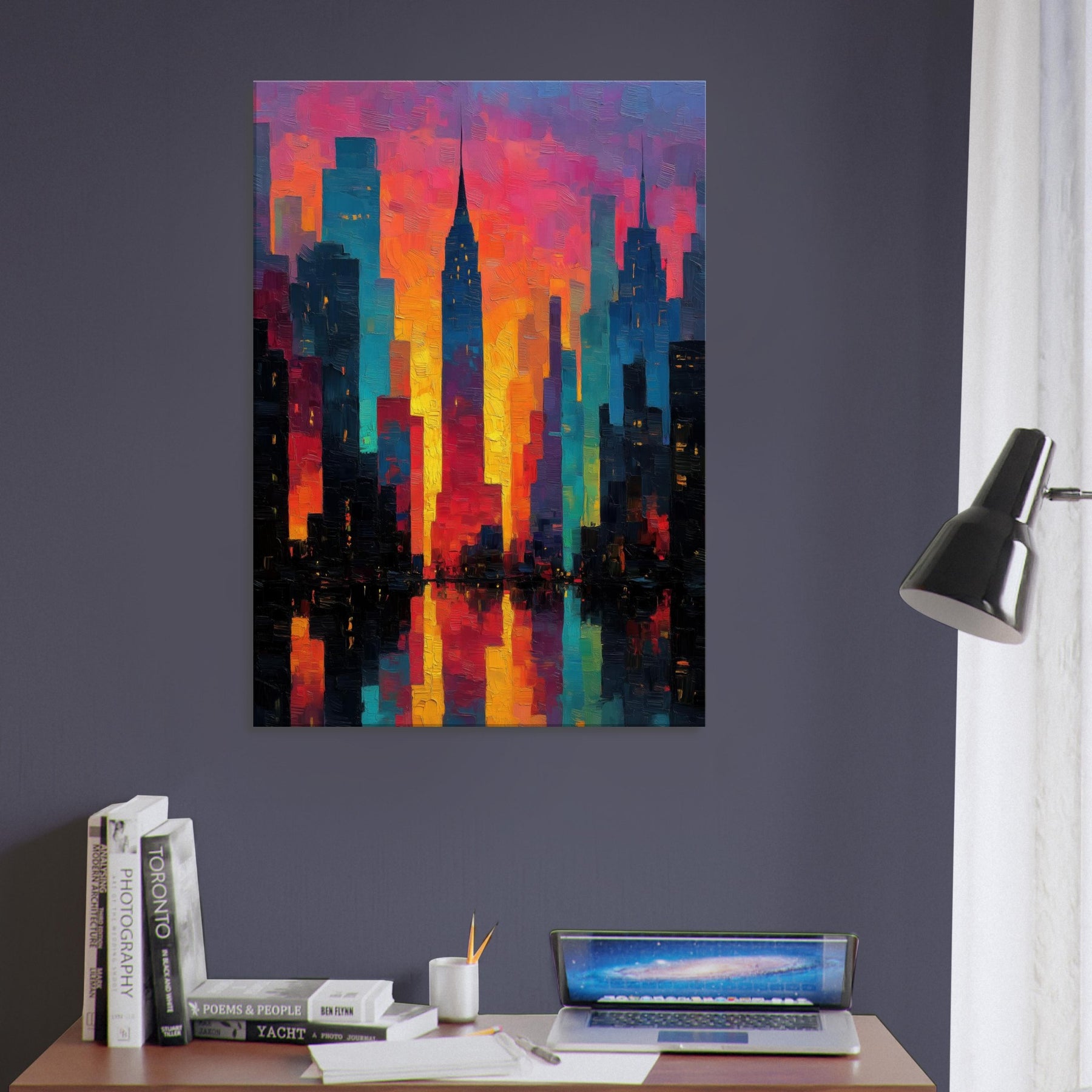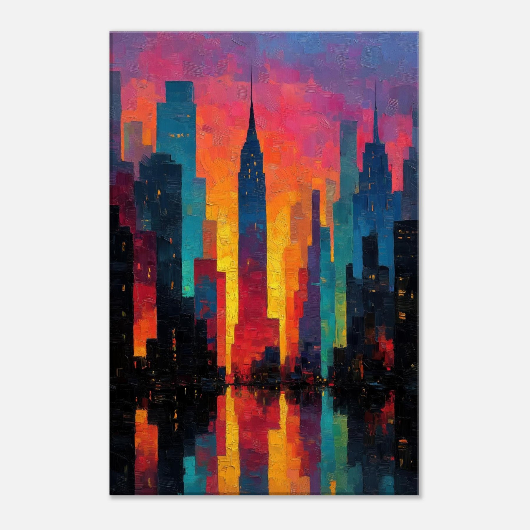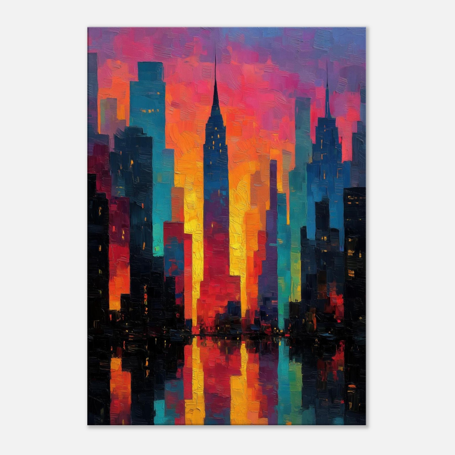 Let New York rise in a carnival of color across your wall. This abstract cityscape hums with electric light and heat, where skyscrapers dissolve into ribbons of magenta, saffron, and teal. The piece invites the room to breathe the glow seems to pulse with every evening sigh, the soft reflections on a midnight coffee table. It pairs with modern furnishings to create a city at dawn mood: dramatic yet welcoming, bold yet approachable, turning a living space into a curious, luminous atrium of memory and possibility.