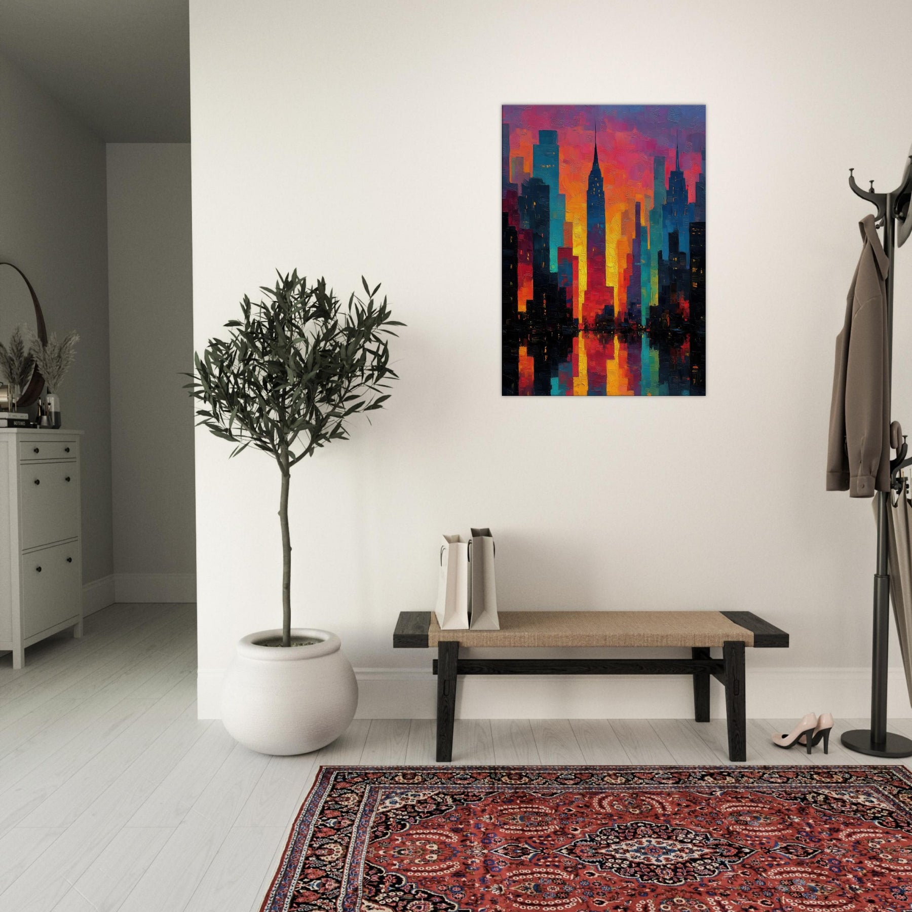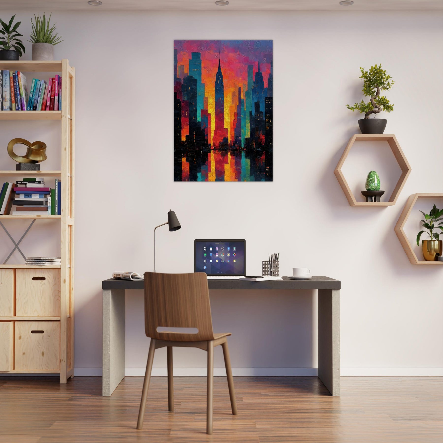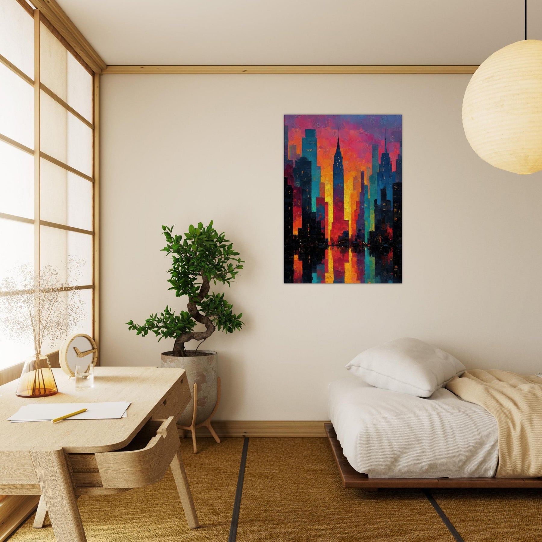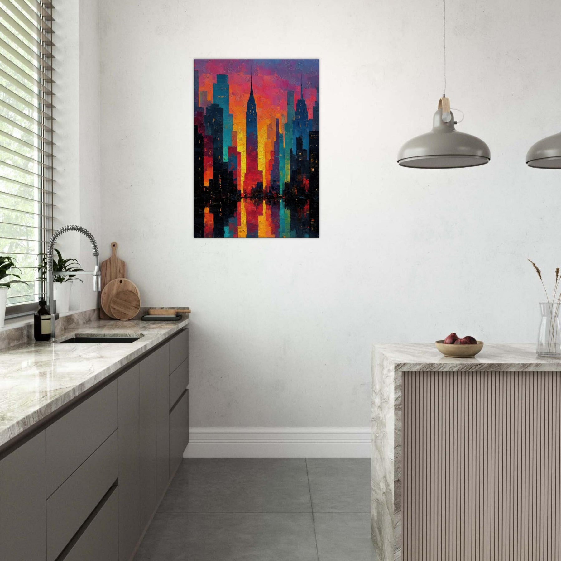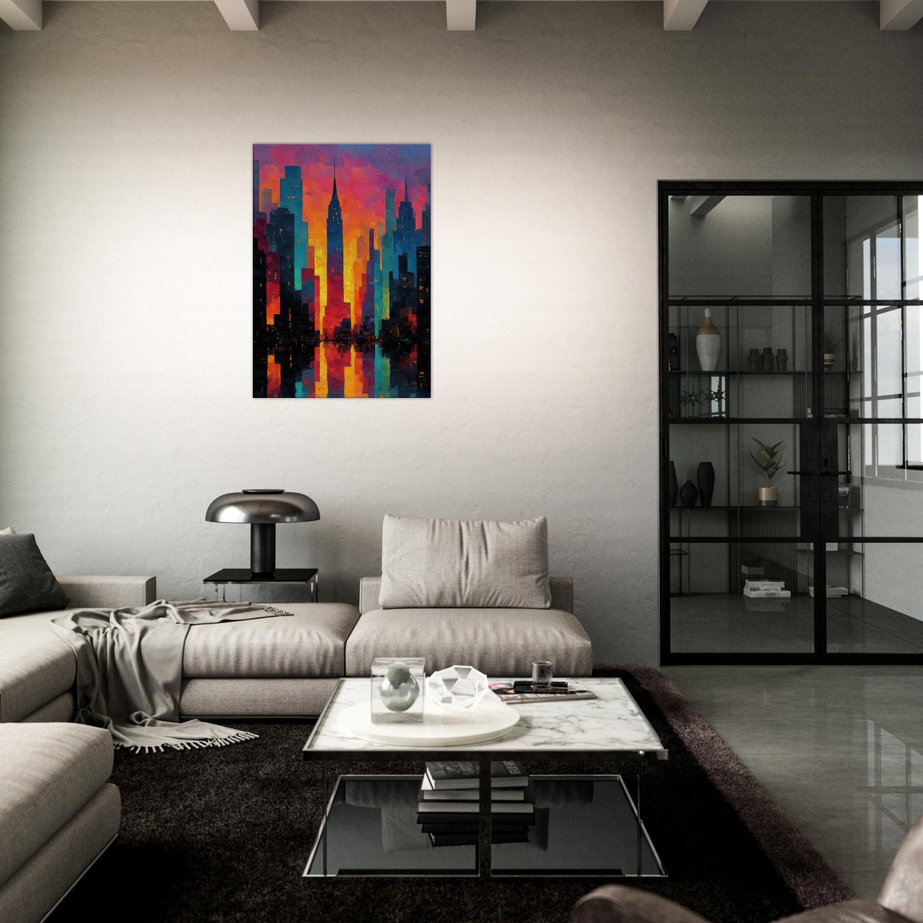 Let New York rise in a carnival of color across your wall. This abstract cityscape hums with electric light and heat, where skyscrapers dissolve into ribbons of magenta, saffron, and teal. The piece invites the room to breathe the glow seems to pulse with every evening sigh, the soft reflections on a midnight coffee table. It pairs with modern furnishings to create a city at dawn mood: dramatic yet welcoming, bold yet approachable, turning a living space into a curious, luminous atrium of memory and possibility.