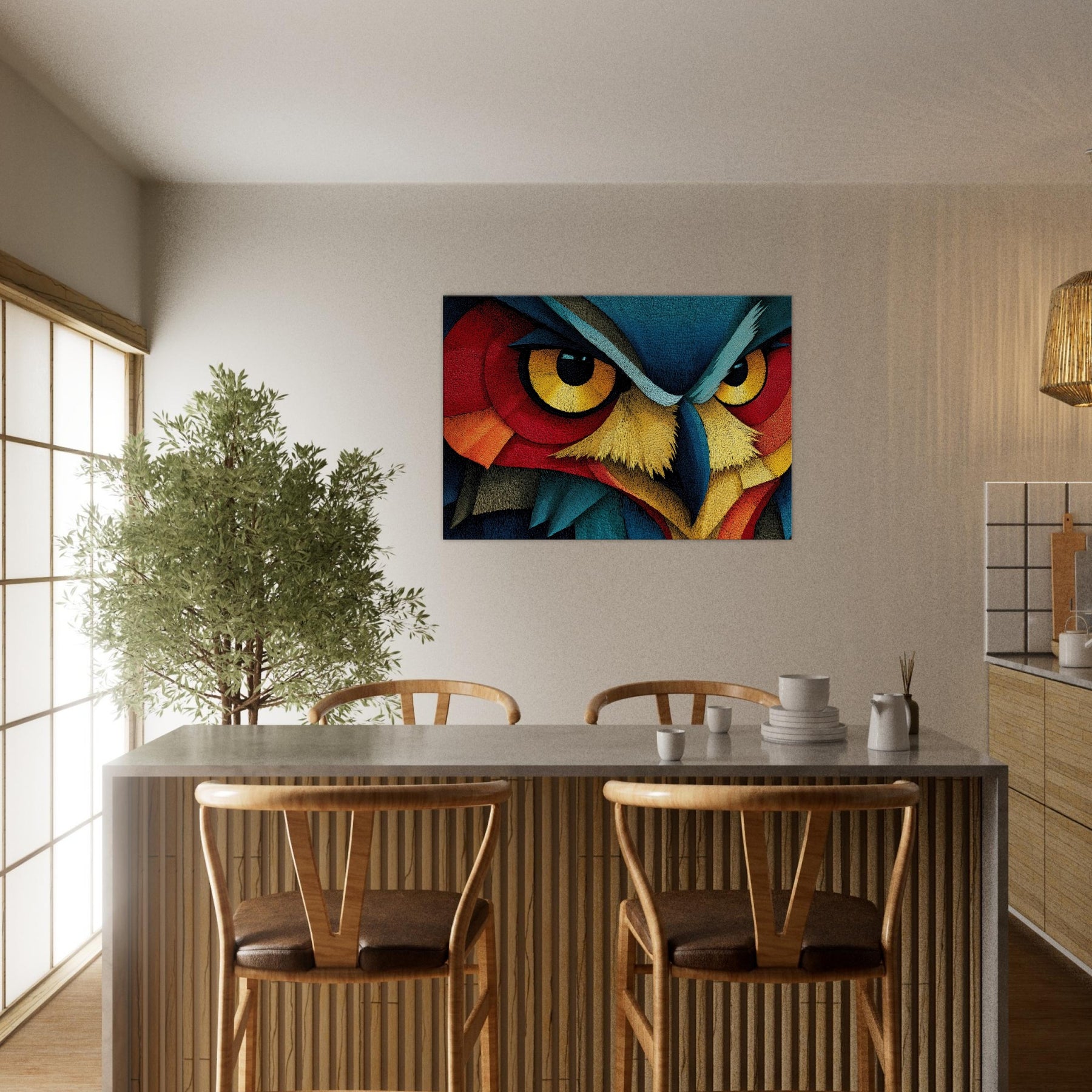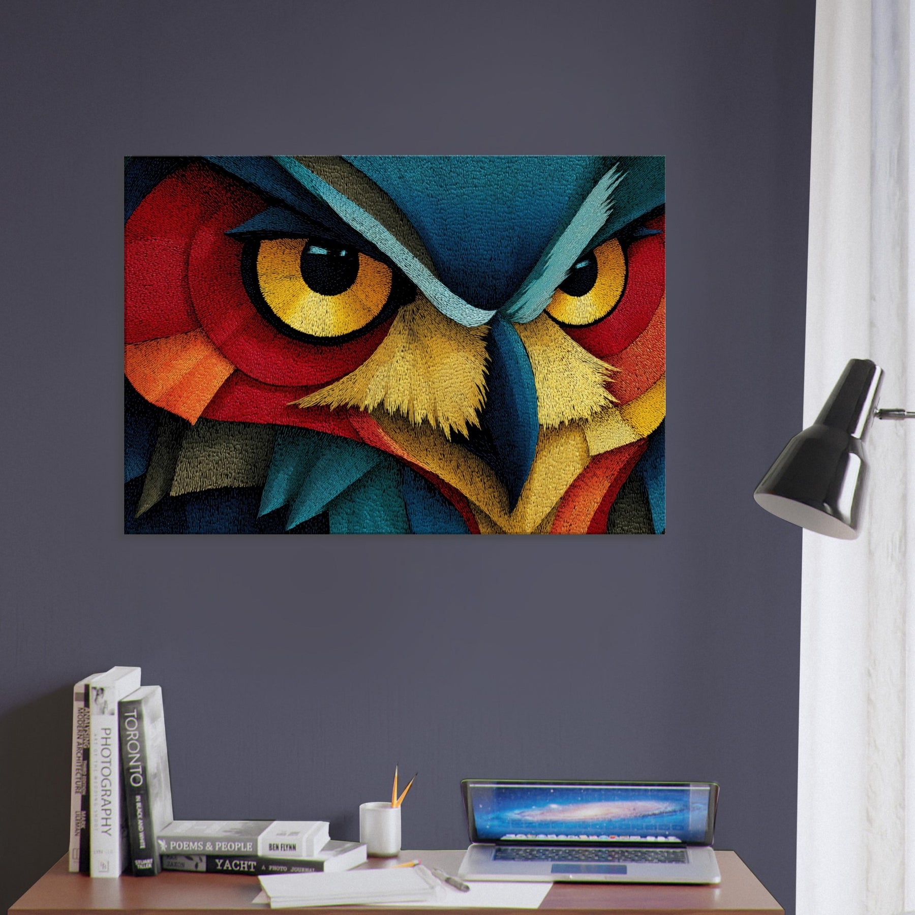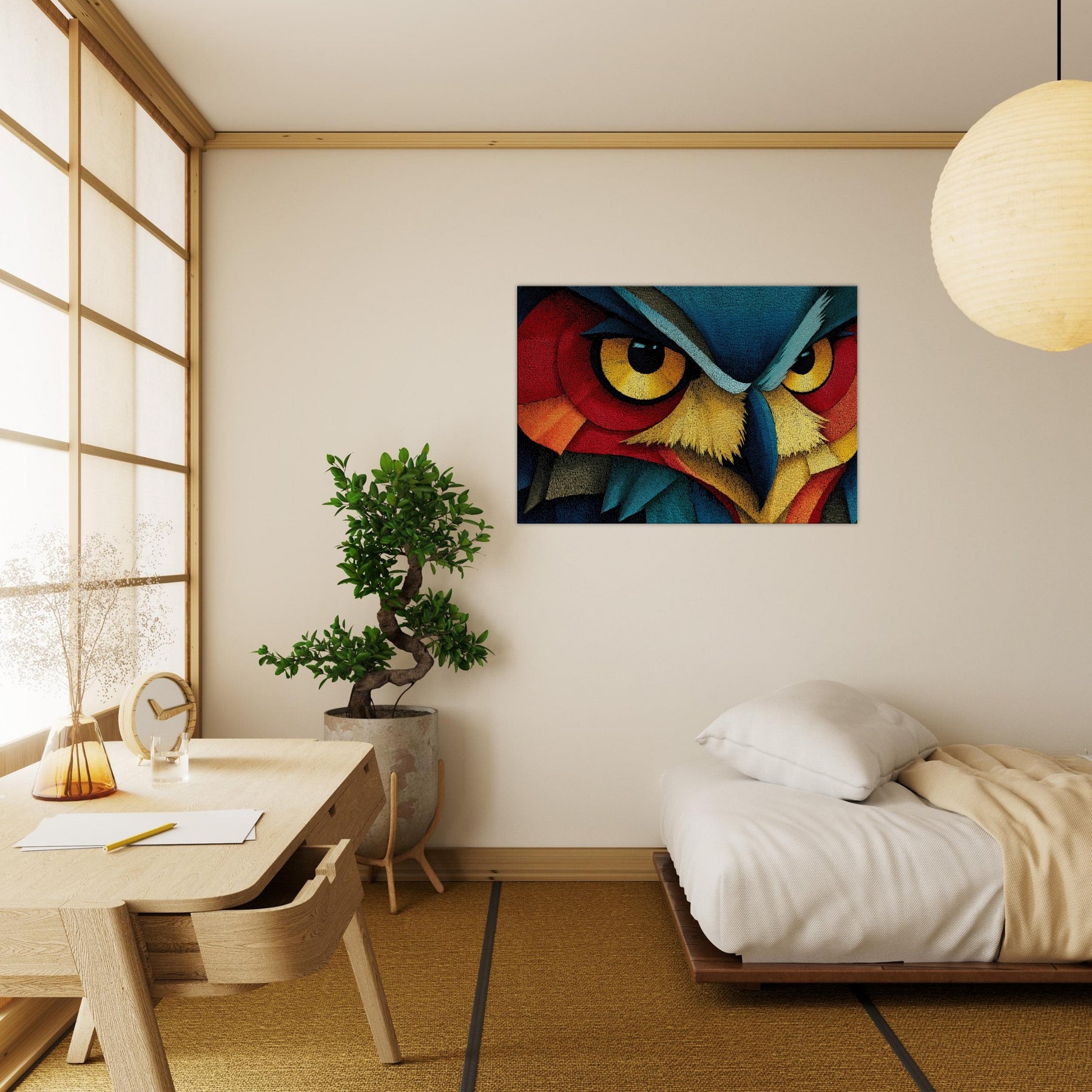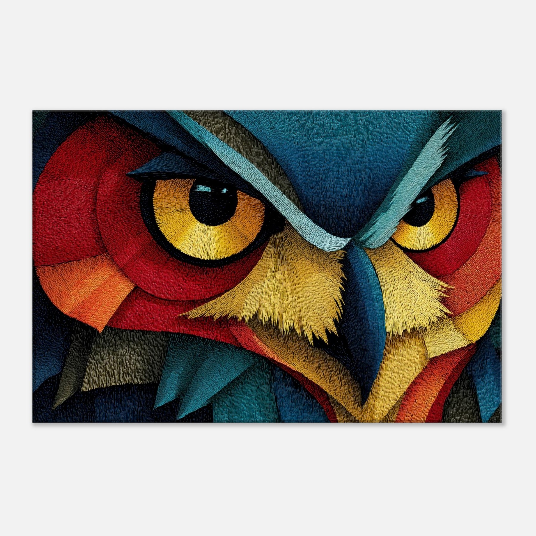 An Owl emerges as a surge of color and line, where feather textures become a tapestry of light. This abstract composition wraps the room in a quiet, pulsing atmosphere the owl's watchful gaze framed by electric blues, saffron beaks, and copper reds. Printed on high quality archival paper, it invites slow, atmospheric contemplation and pairs effortlessly with neutral or bold palettes alike. Hang it where morning light can awaken the hues or near a reading nook to deepen the sense of calm and wonder.