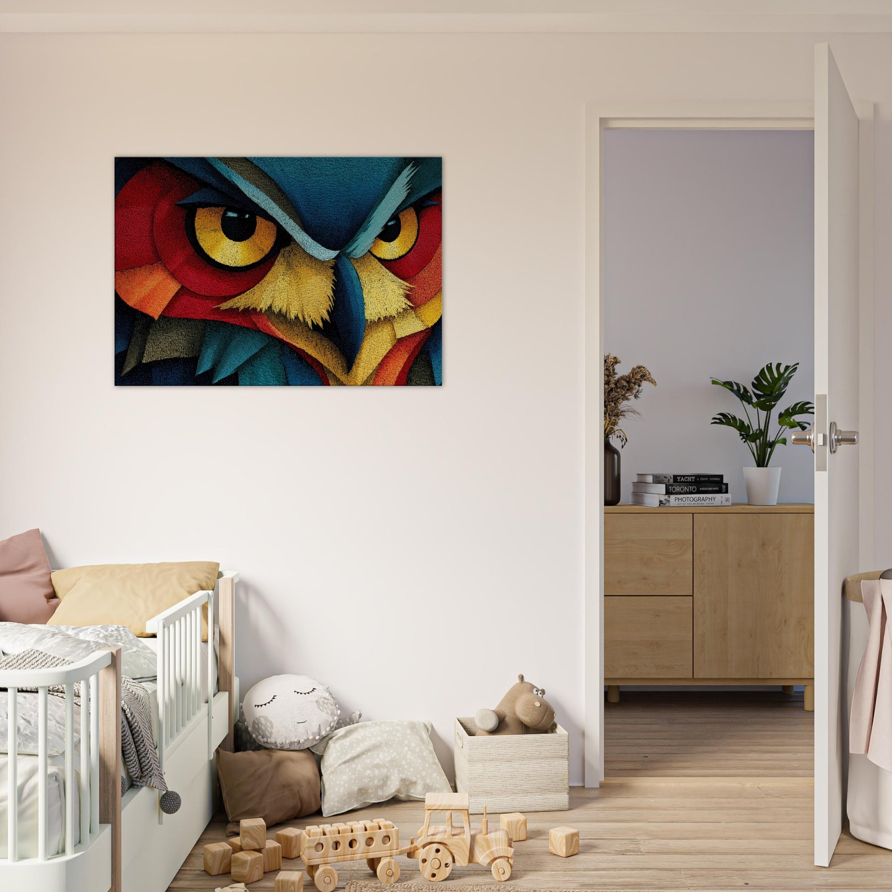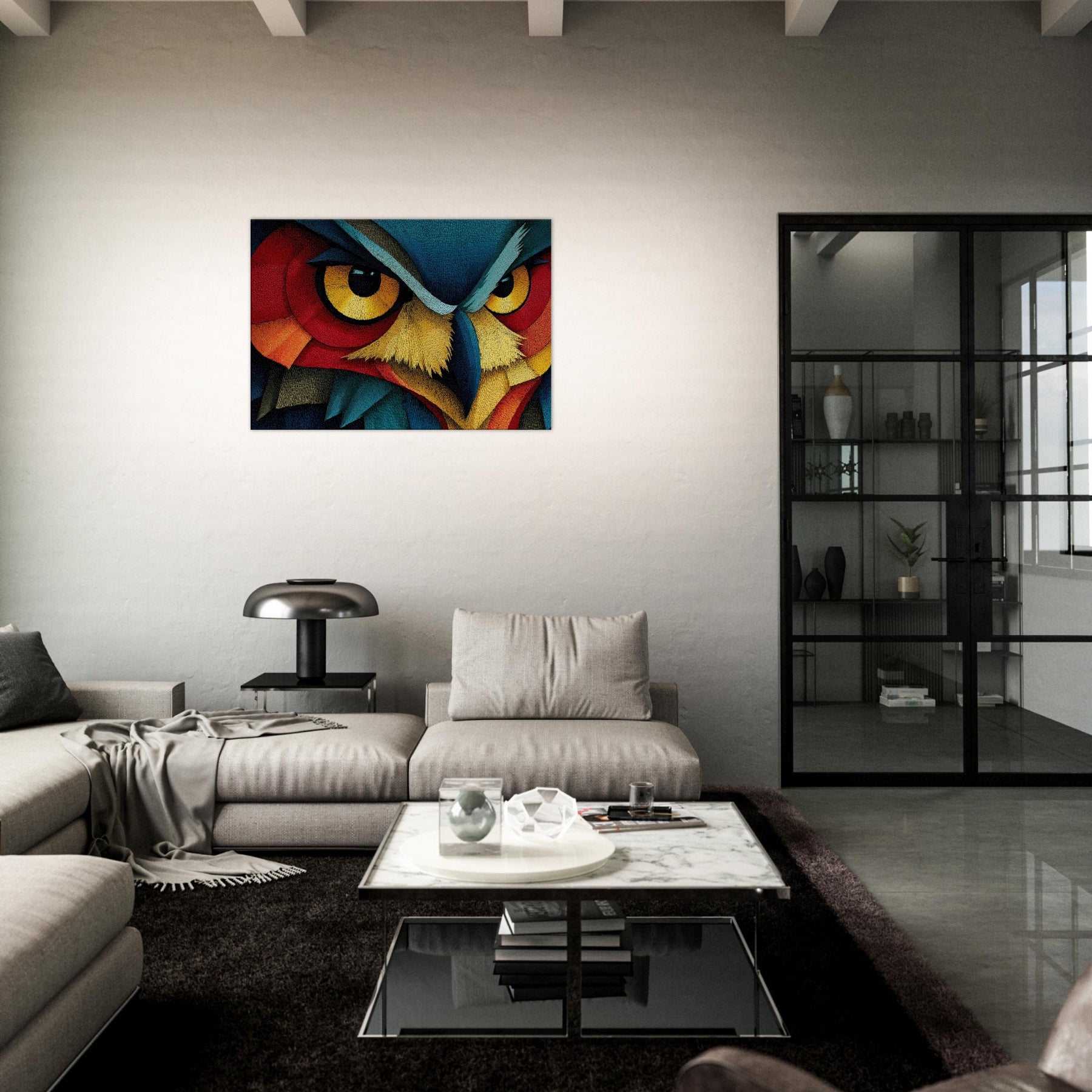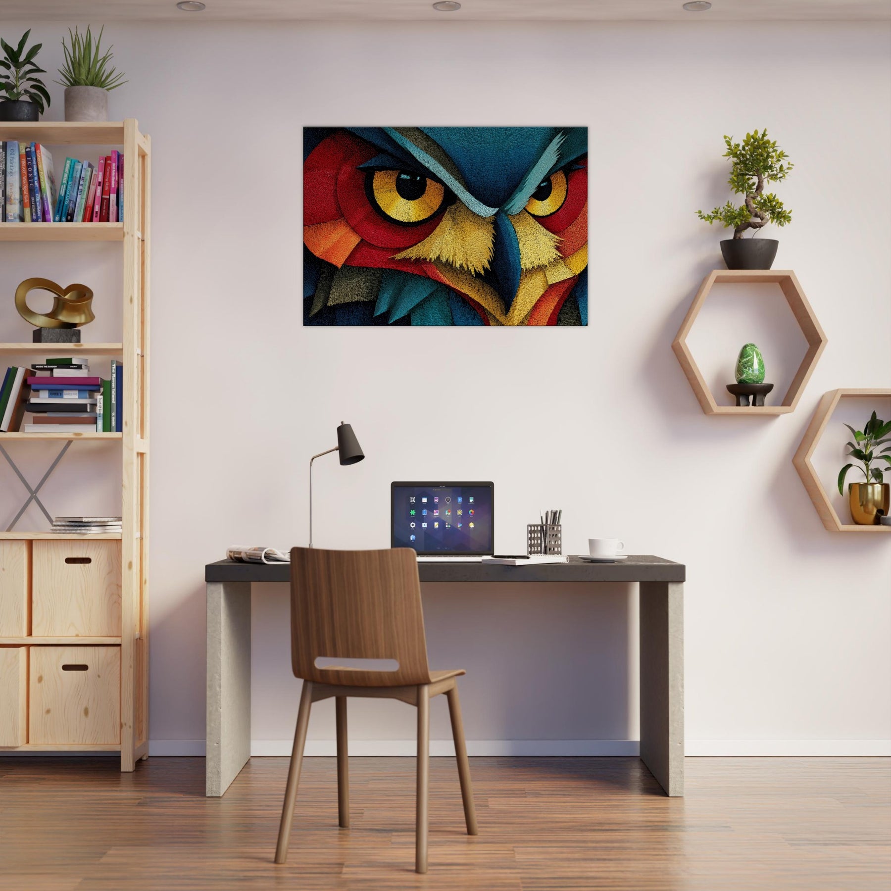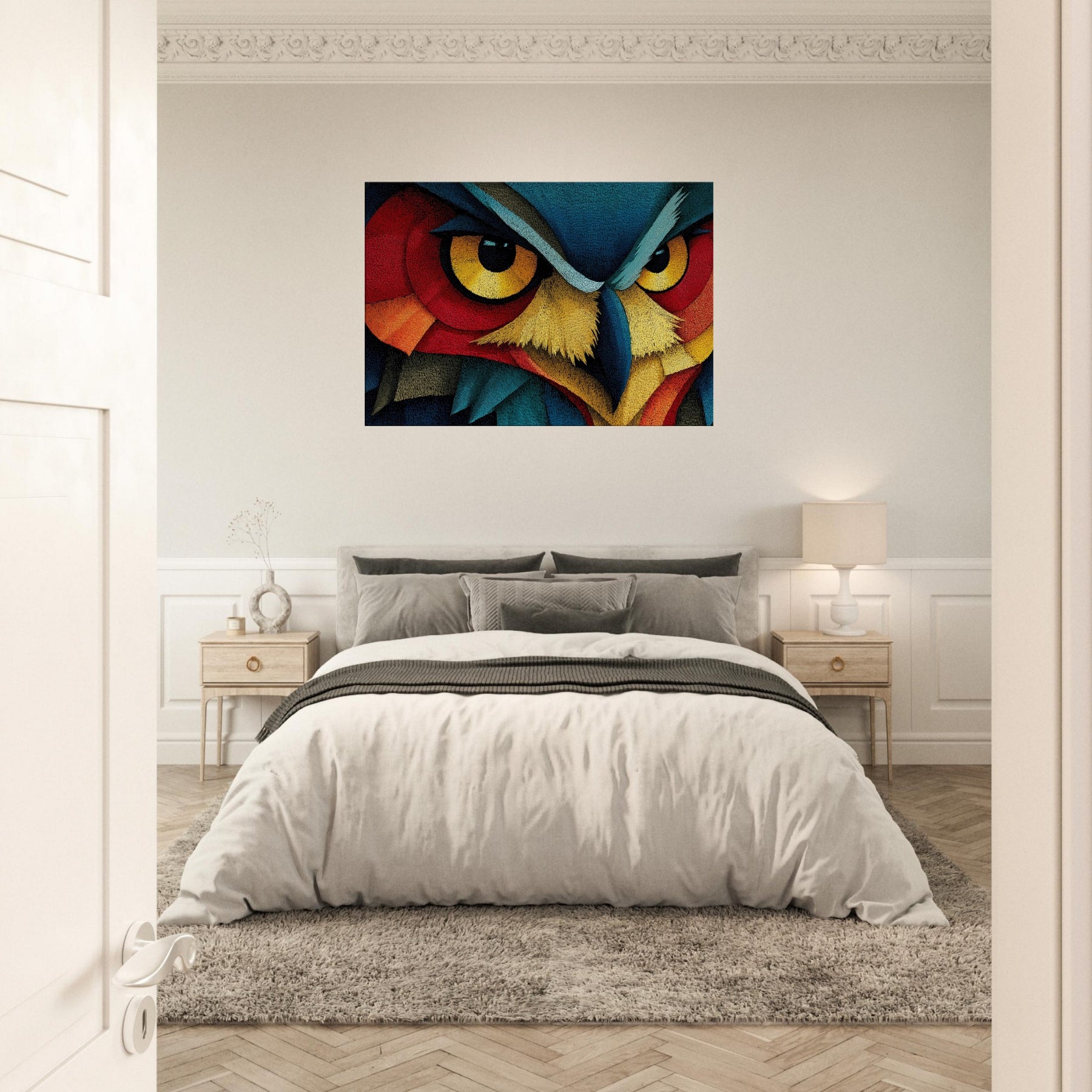 An Owl emerges as a surge of color and line, where feather textures become a tapestry of light. This abstract composition wraps the room in a quiet, pulsing atmosphere the owl's watchful gaze framed by electric blues, saffron beaks, and copper reds. Printed on high quality archival paper, it invites slow, atmospheric contemplation and pairs effortlessly with neutral or bold palettes alike. Hang it where morning light can awaken the hues or near a reading nook to deepen the sense of calm and wonder.