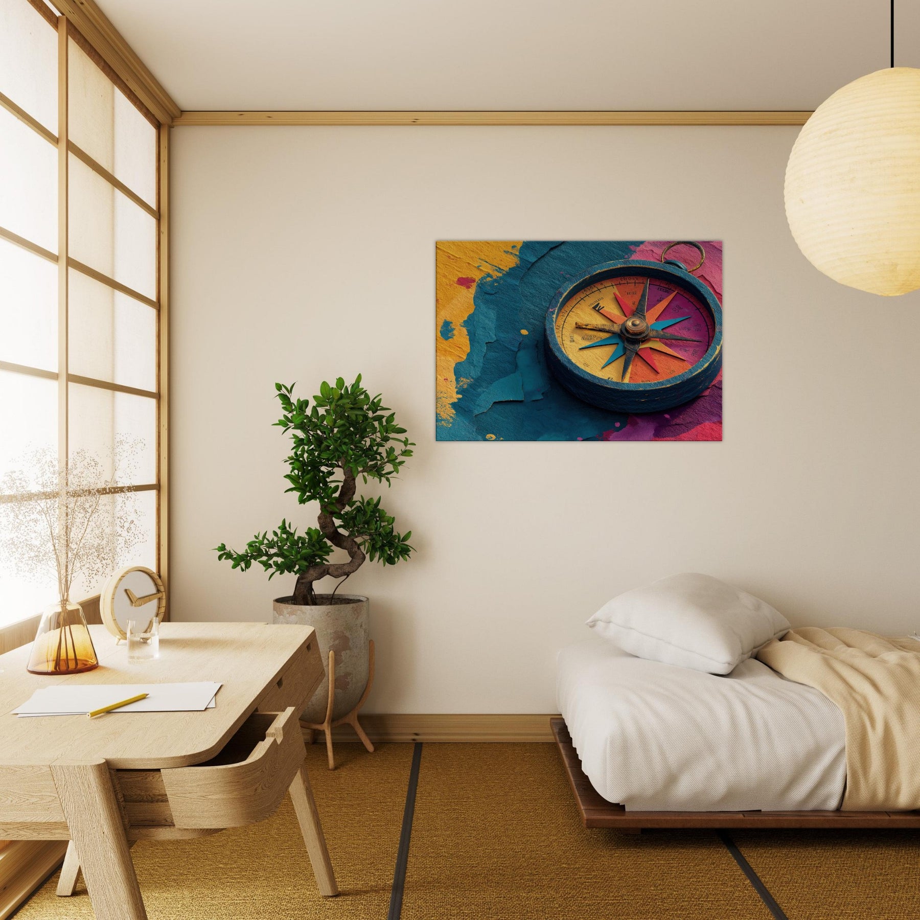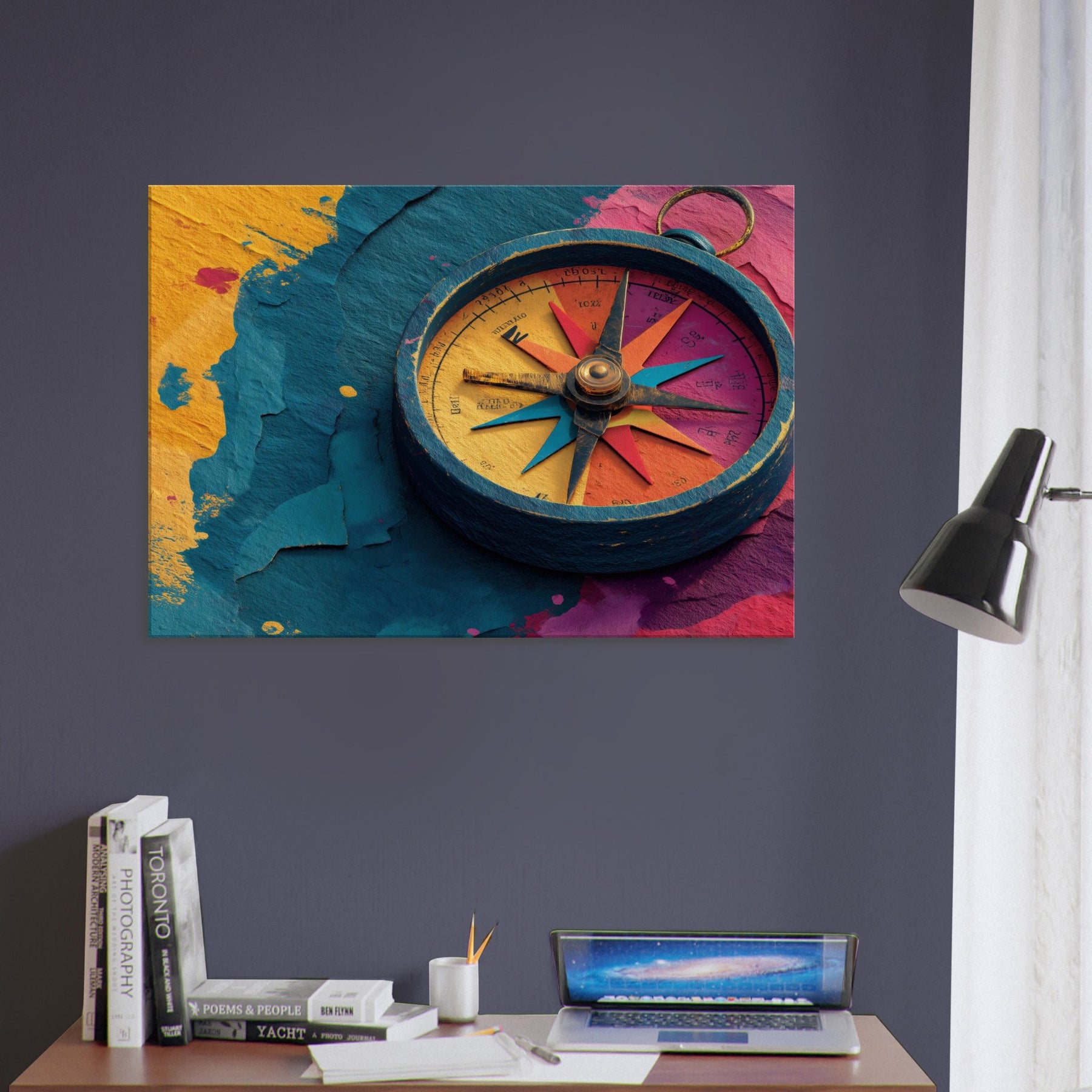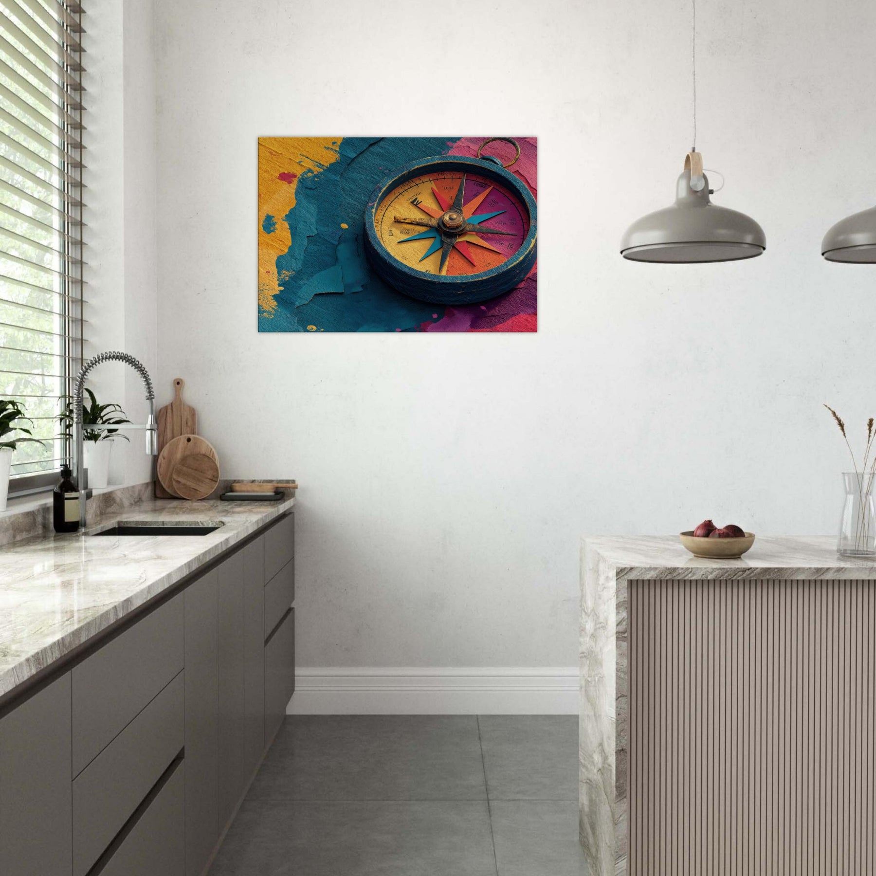 Let the Compass guide your room into a harbor of color and curiosity. This abstract composition pairs a weathered, windswept circle with luminous spokes of turquoise, coral, and saffron, tracing a quiet map across your wall. The tactile textures and layered hues invite light to play, turning empty corners into a meditation on motion and memory. Hang it in a living room or hallway to anchor a colorful palette, spark conversation, and transform everyday space into a mindful, wandering gallery.