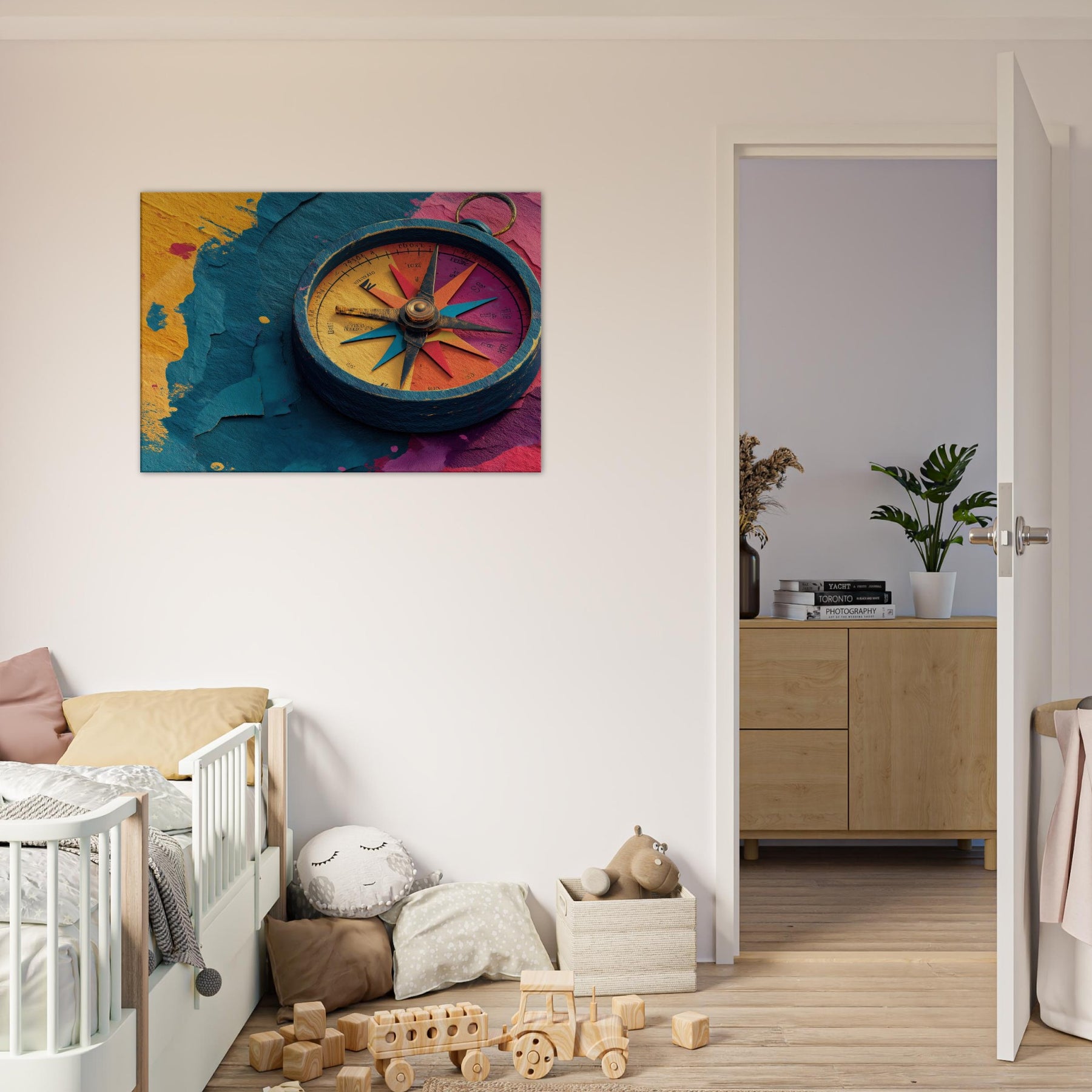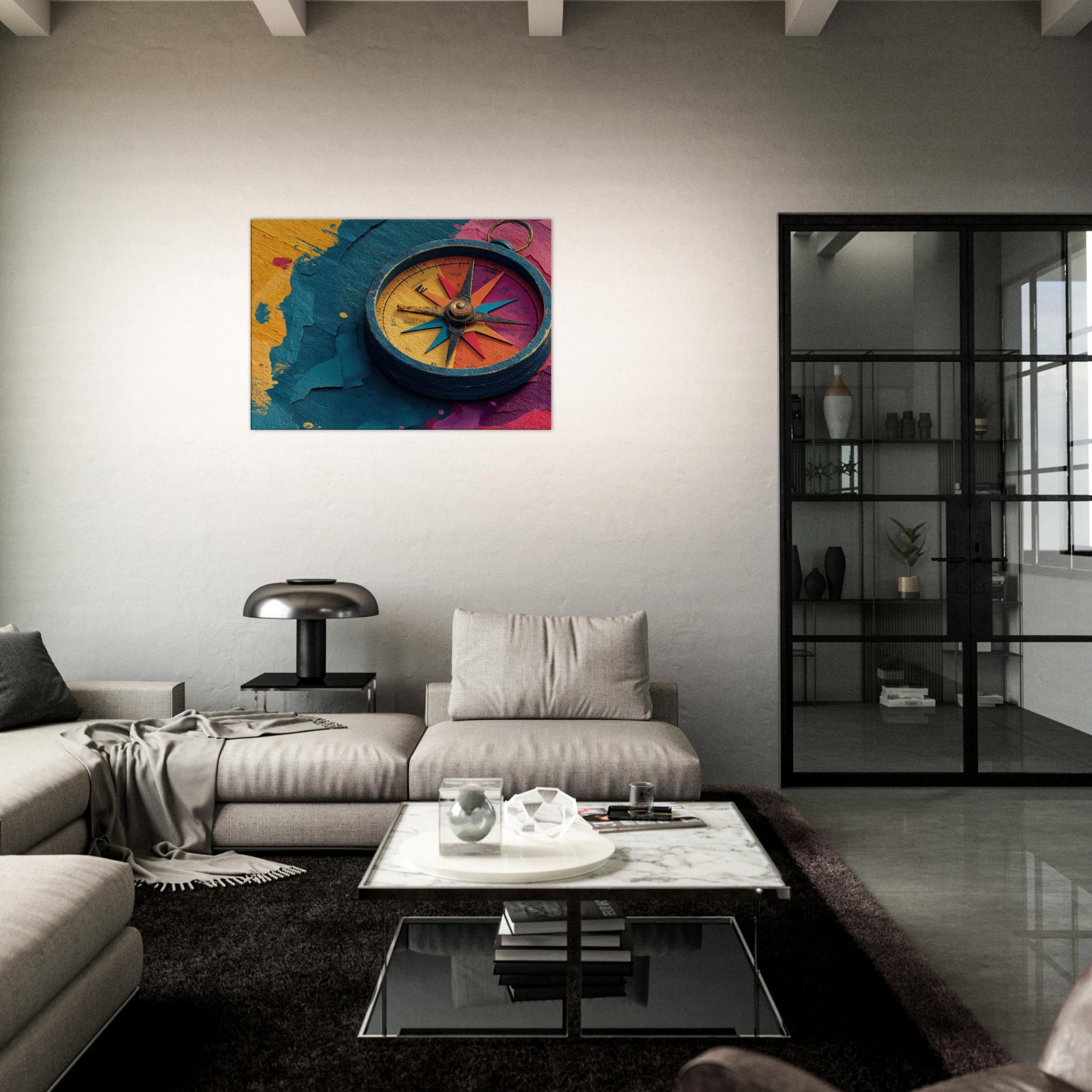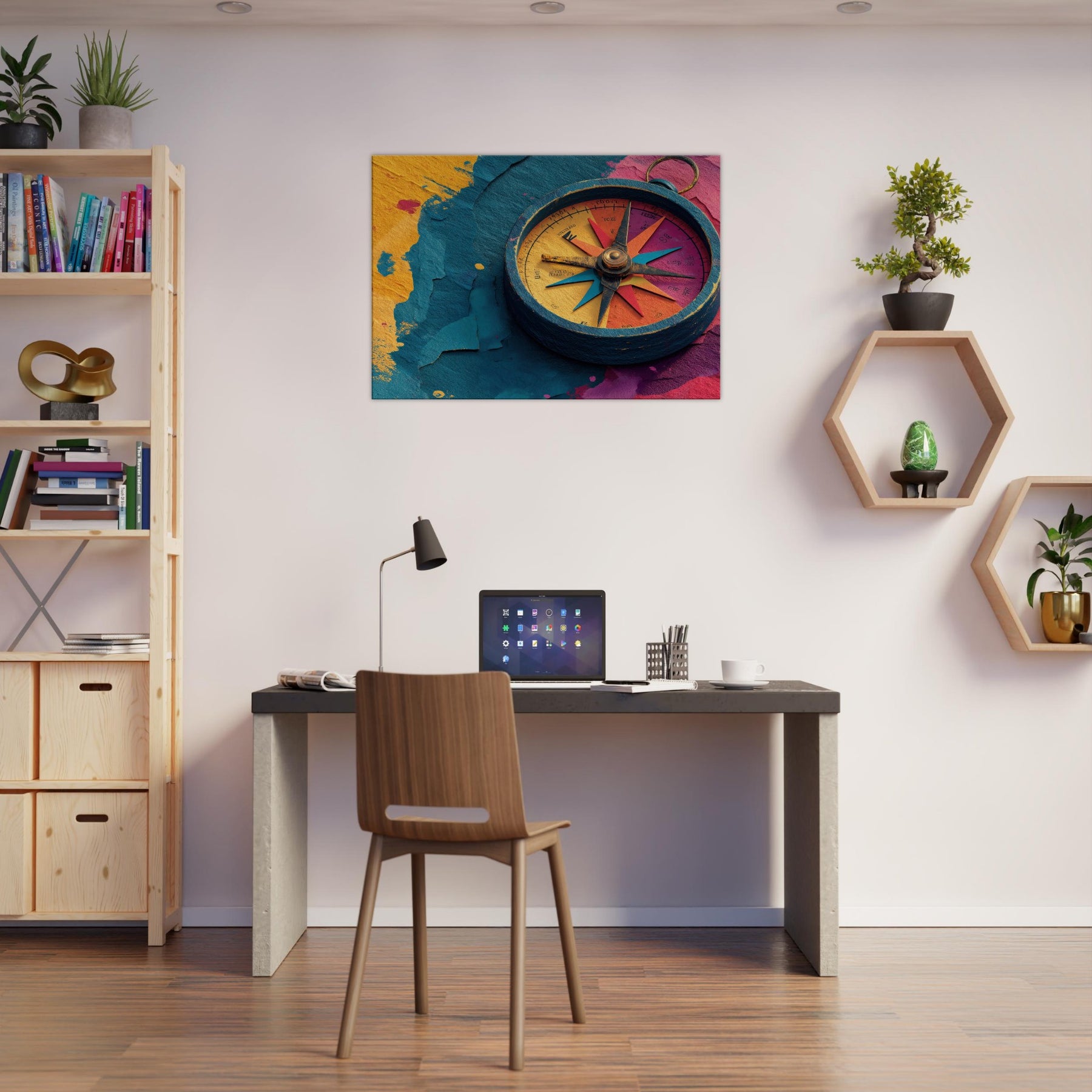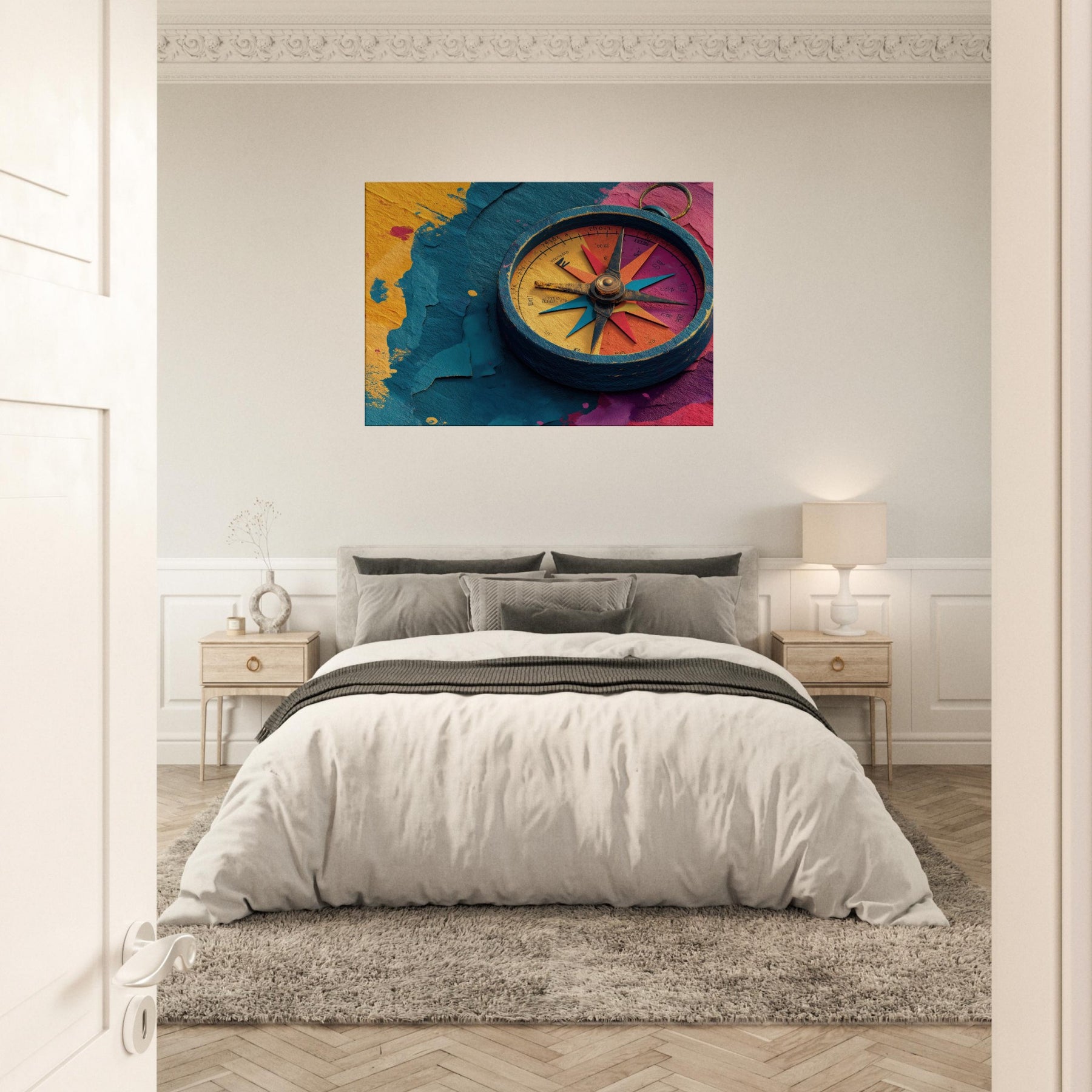 Let the Compass guide your room into a harbor of color and curiosity. This abstract composition pairs a weathered, windswept circle with luminous spokes of turquoise, coral, and saffron, tracing a quiet map across your wall. The tactile textures and layered hues invite light to play, turning empty corners into a meditation on motion and memory. Hang it in a living room or hallway to anchor a colorful palette, spark conversation, and transform everyday space into a mindful, wandering gallery.