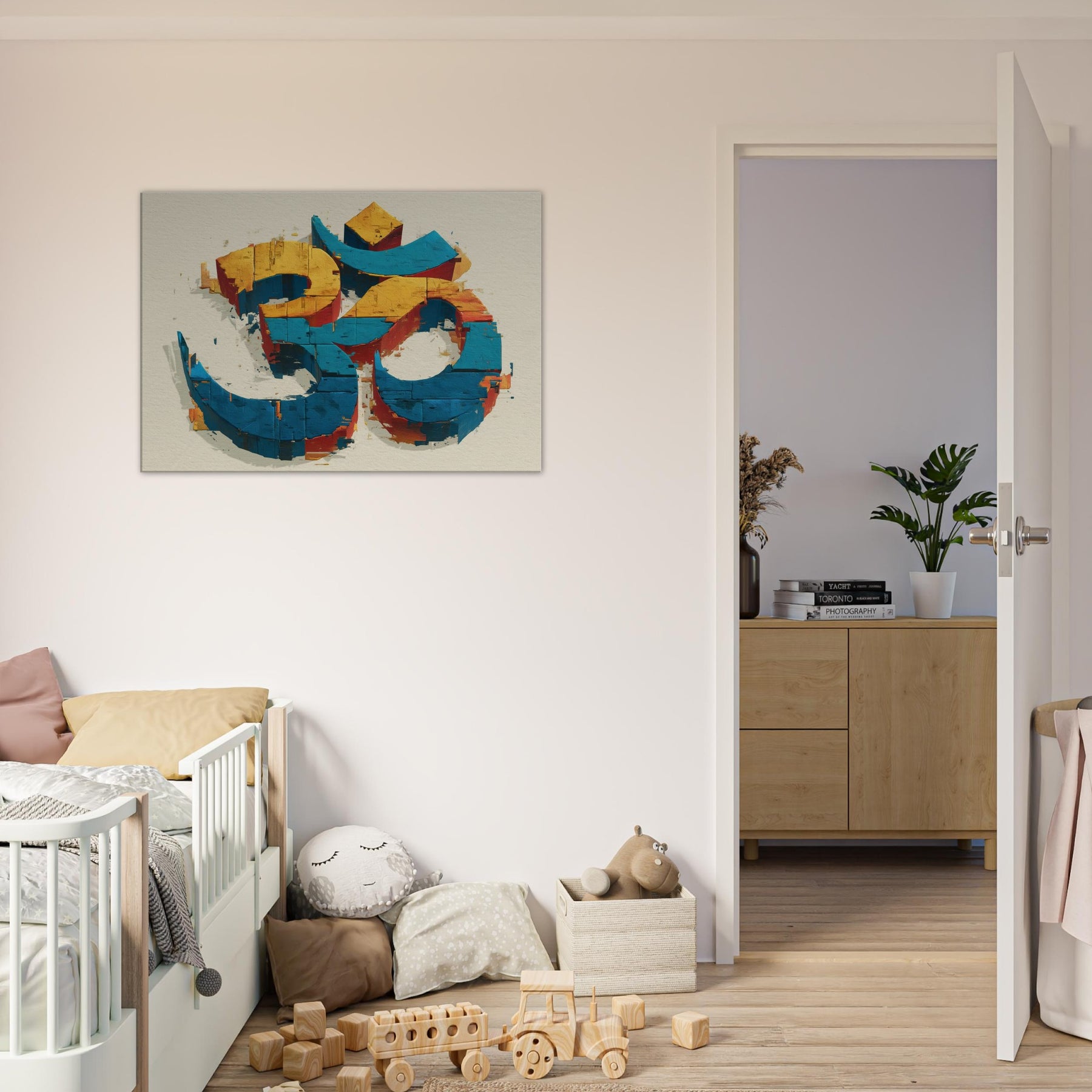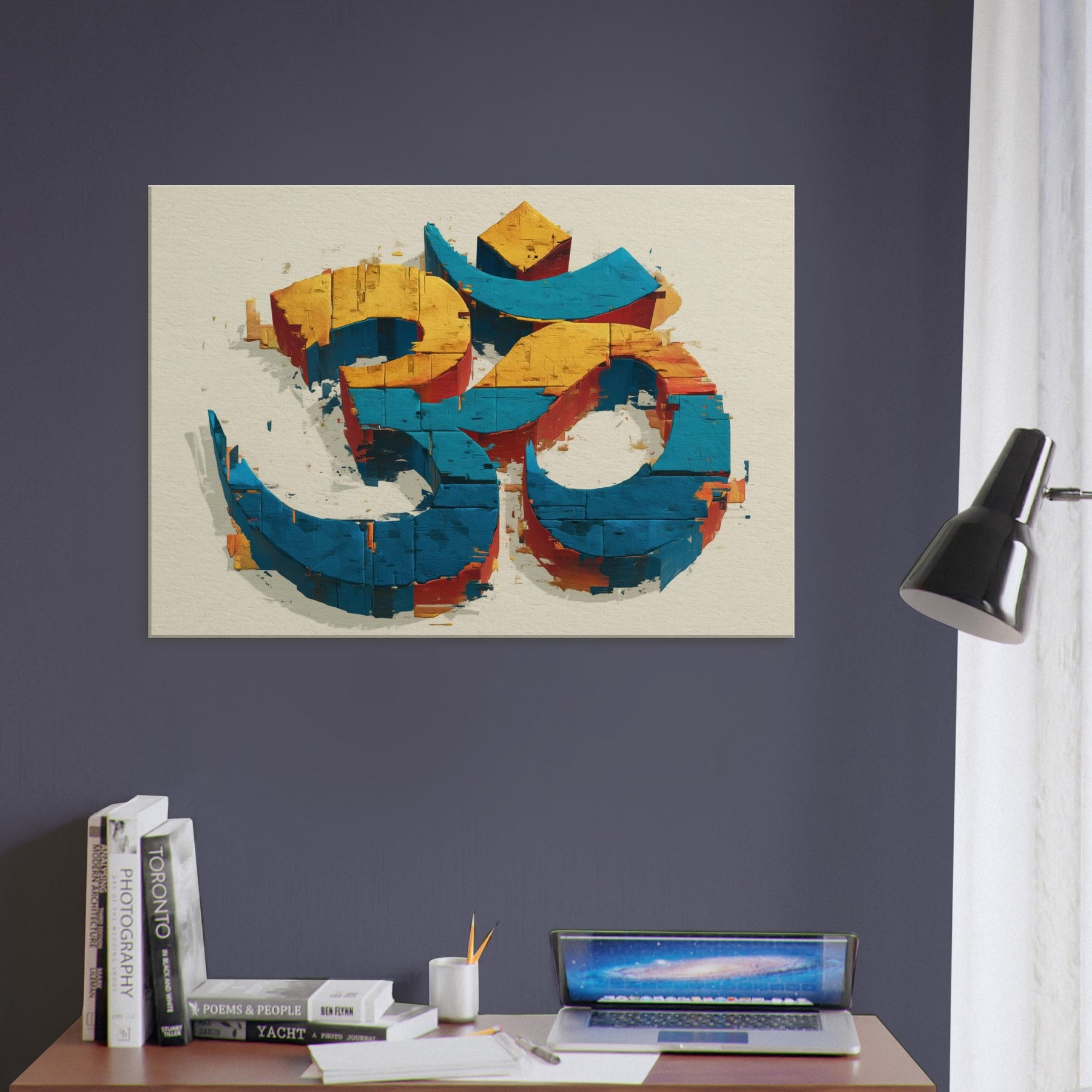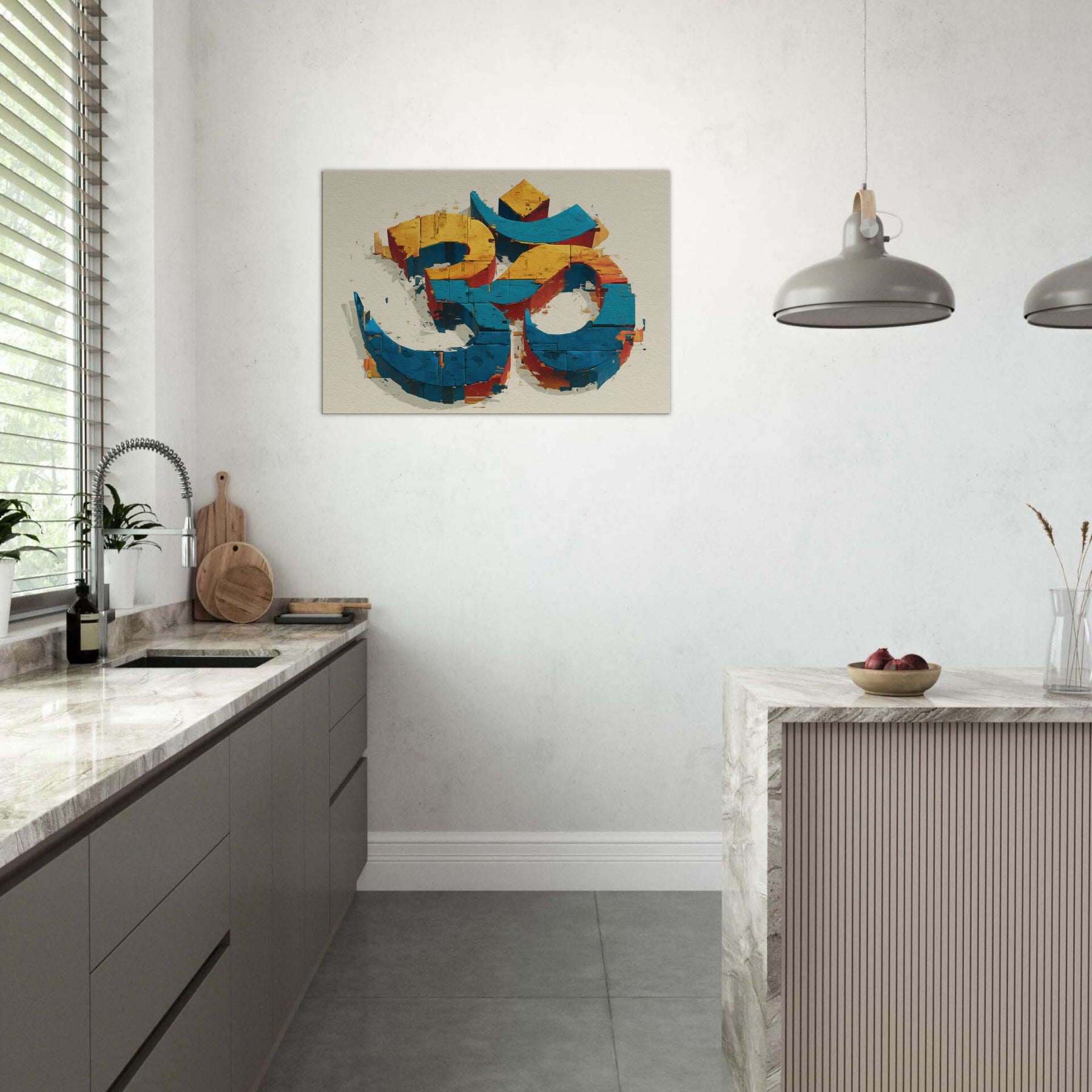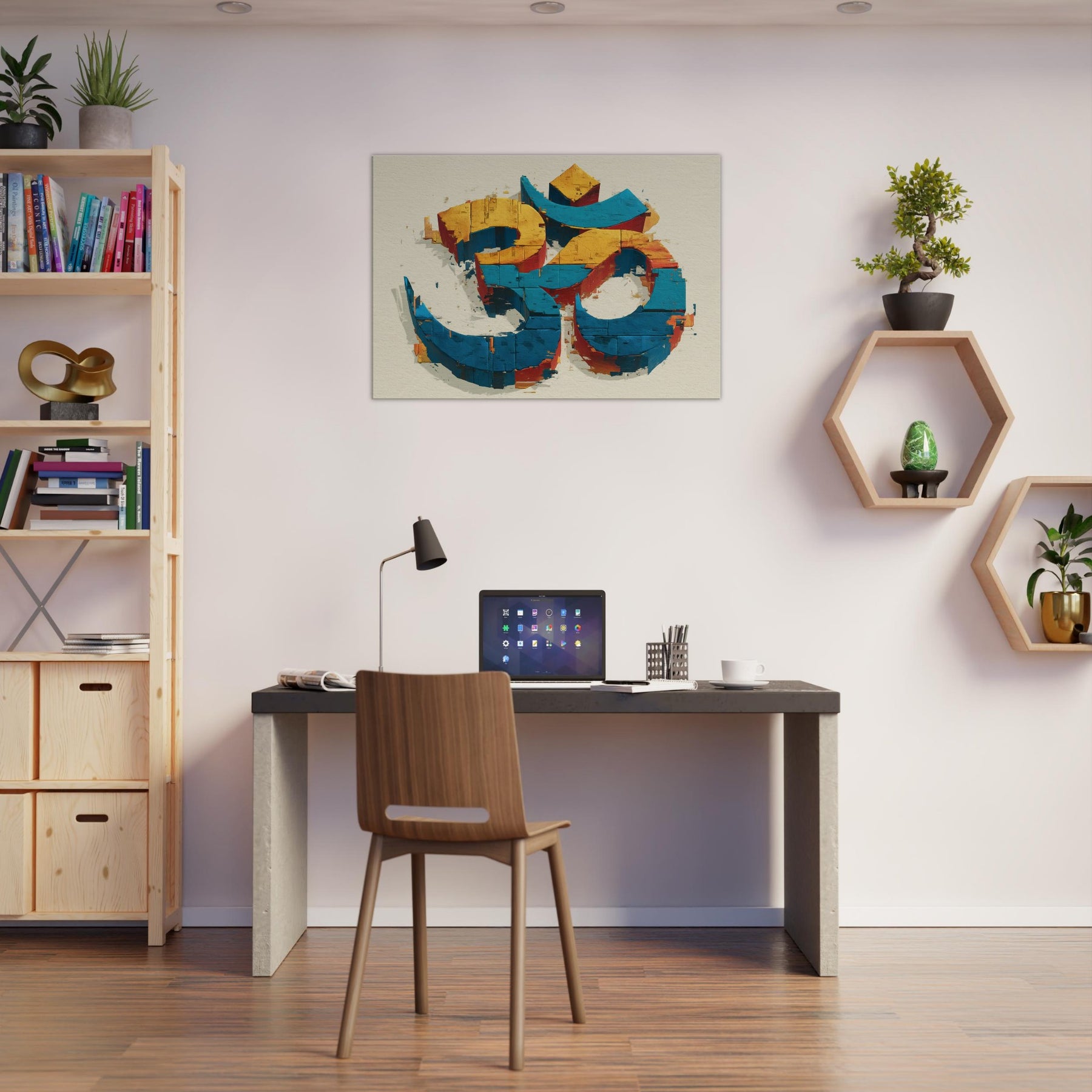 In this wall sculpture, the Om symbol rises from color streaked blocks in electric blue, sunlit yellow, and warm cinnamon an abstract meditation made tangible. The piece invites a quiet inhale, a slow exhale, as light skims its chipped surfaces, throwing subtle shadows across walls. Hang it where morning sun or evening lamp can play across its edges; it becomes a serene focal point that anchors a room with mystical calm. The central subject is Om (Aum Symbol).