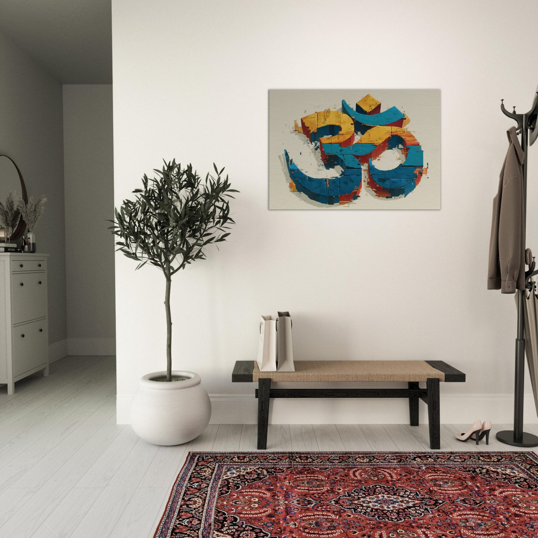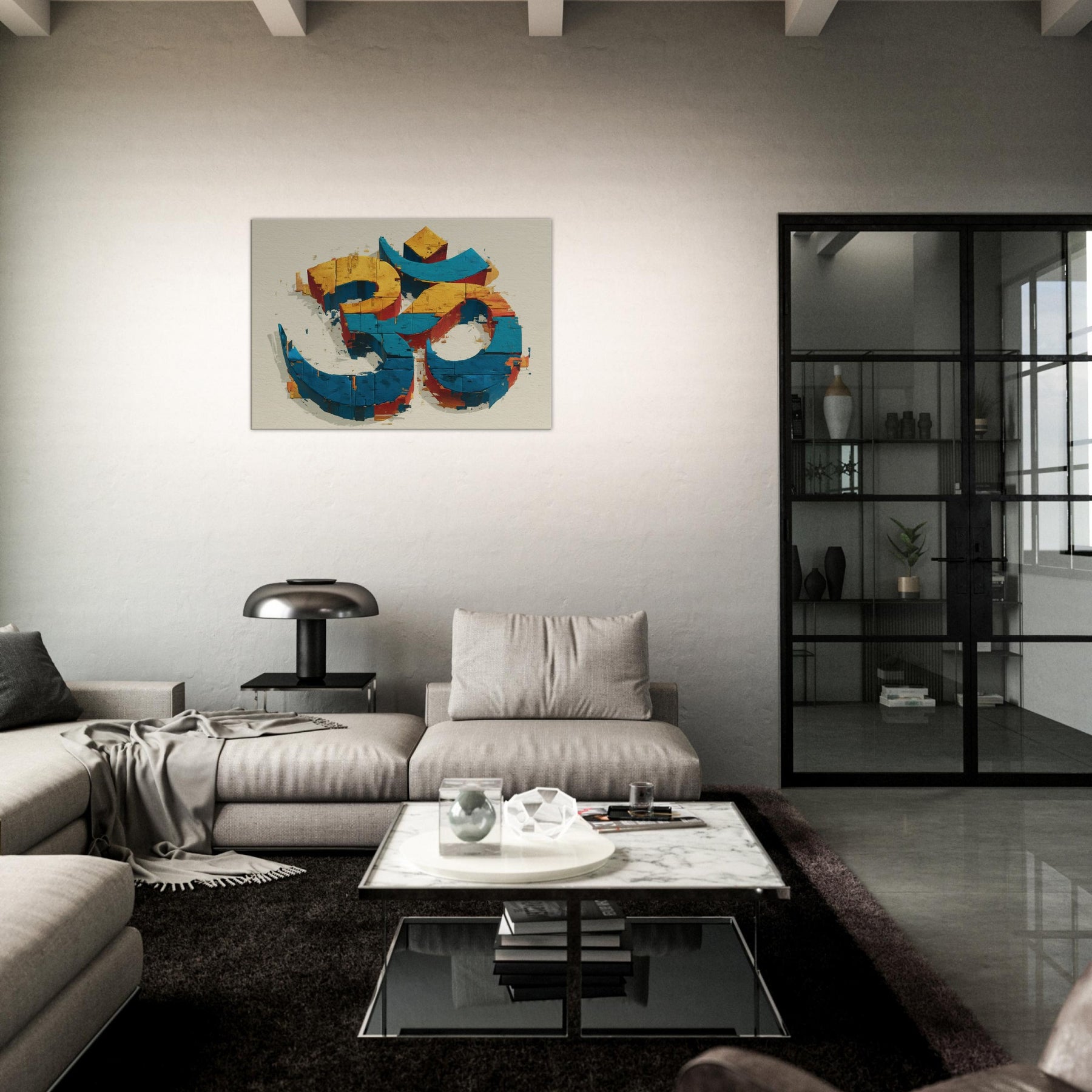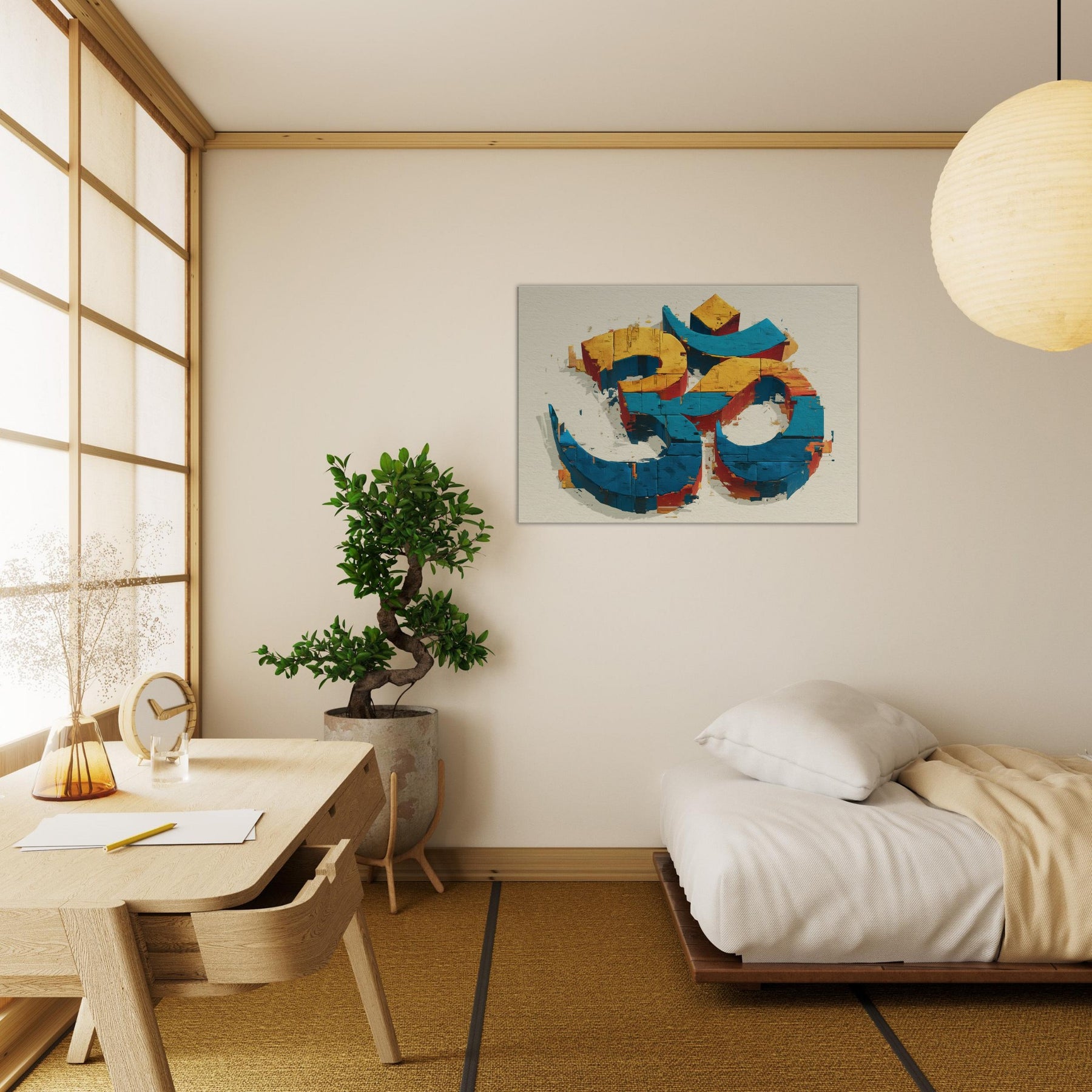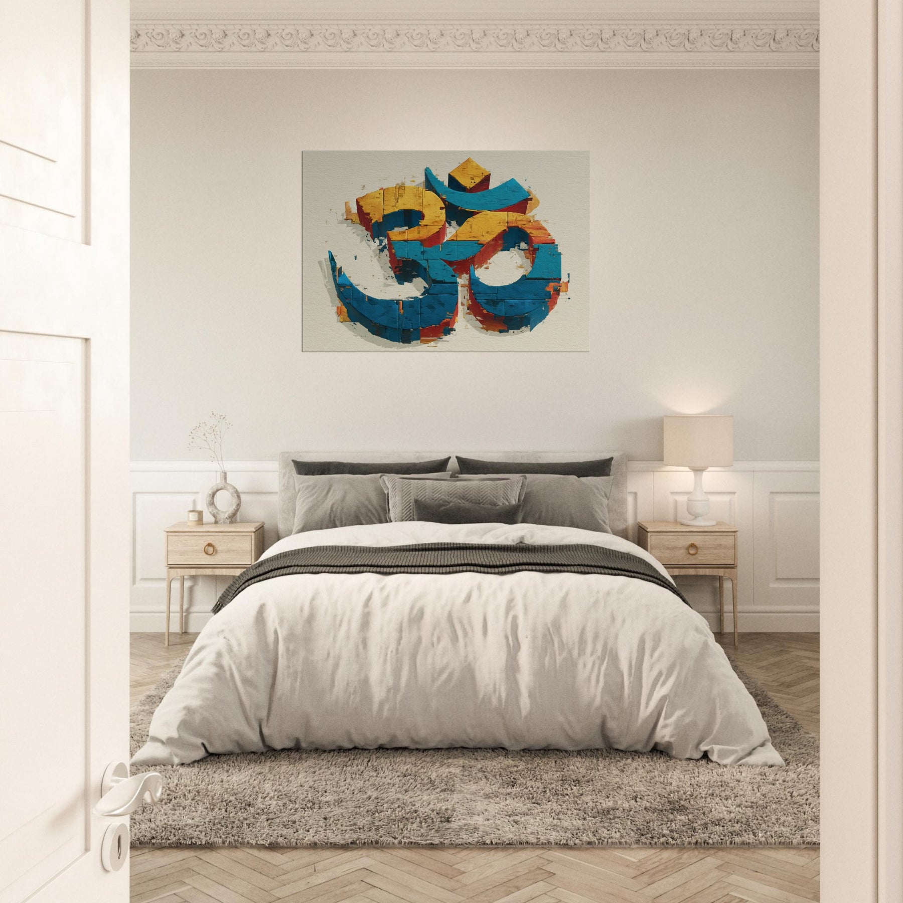 In this wall sculpture, the Om symbol rises from color streaked blocks in electric blue, sunlit yellow, and warm cinnamon an abstract meditation made tangible. The piece invites a quiet inhale, a slow exhale, as light skims its chipped surfaces, throwing subtle shadows across walls. Hang it where morning sun or evening lamp can play across its edges; it becomes a serene focal point that anchors a room with mystical calm. The central subject is Om (Aum Symbol).
