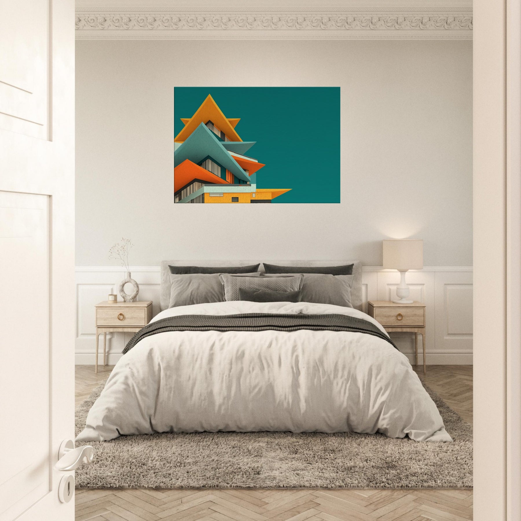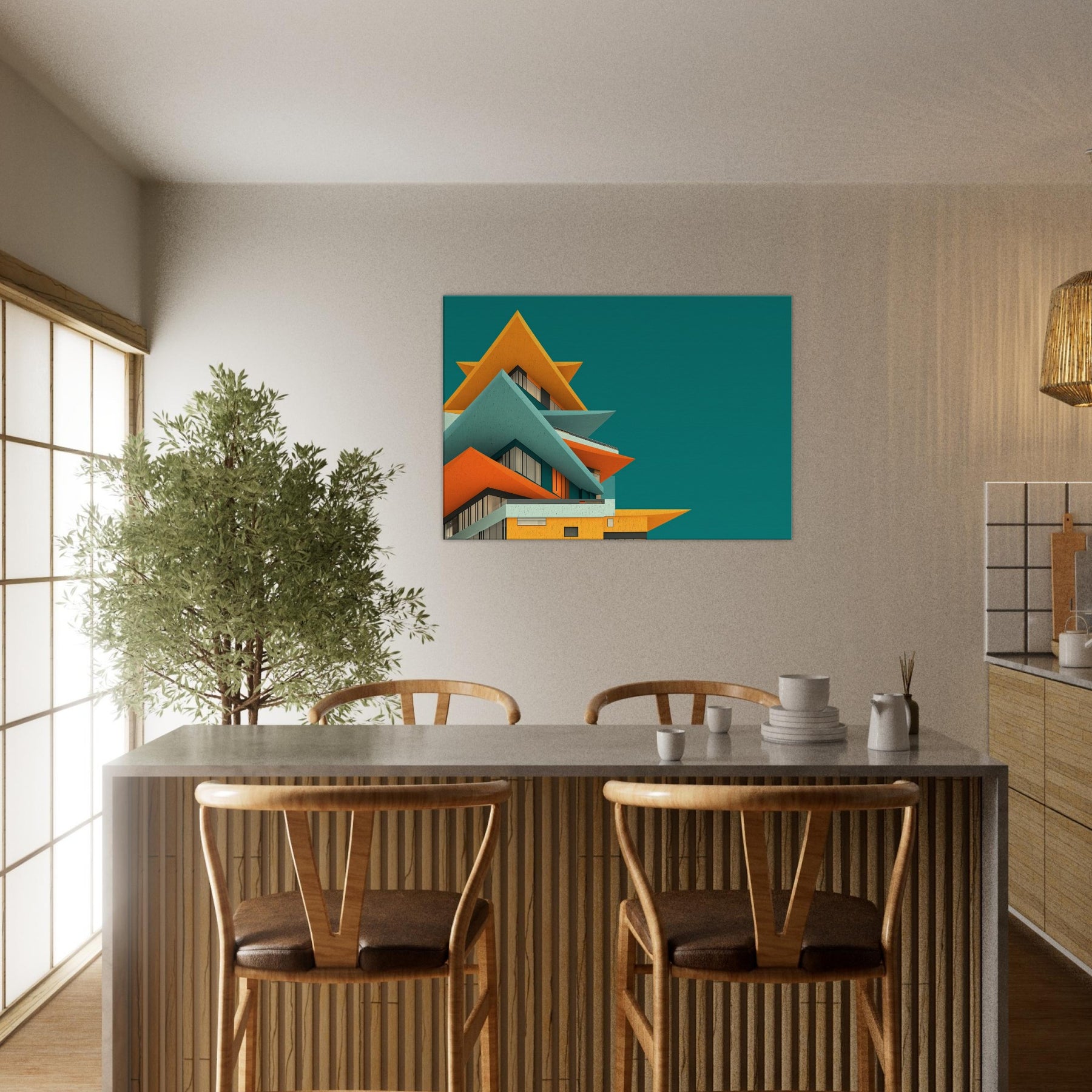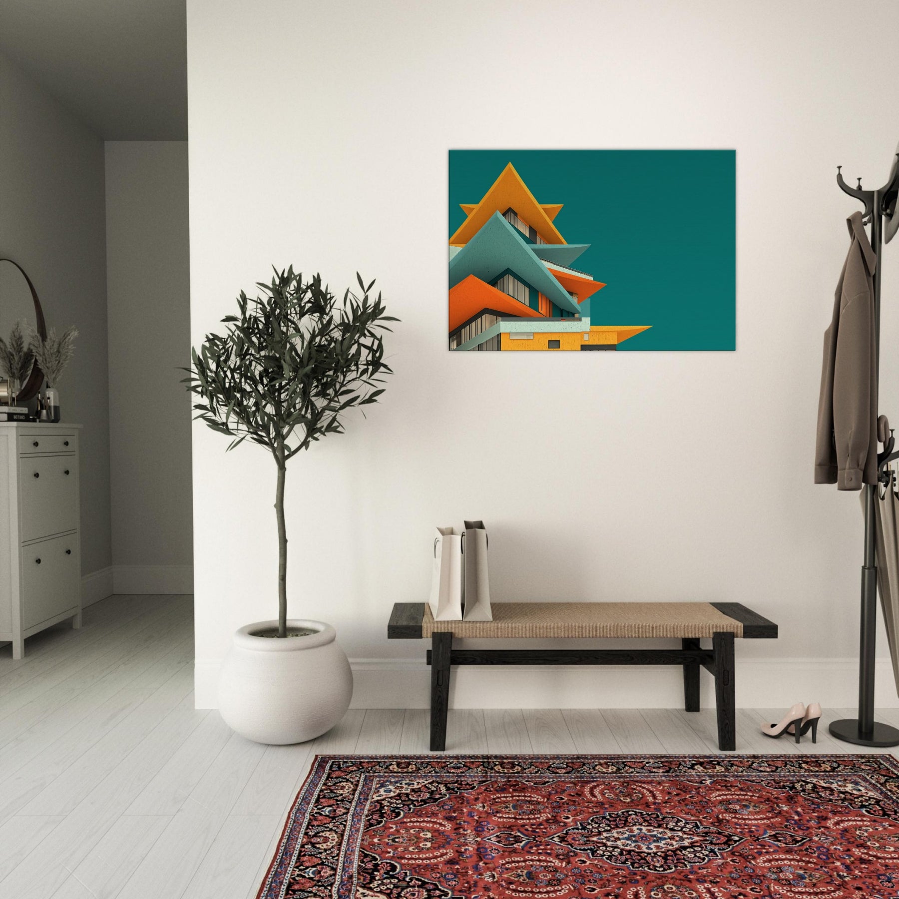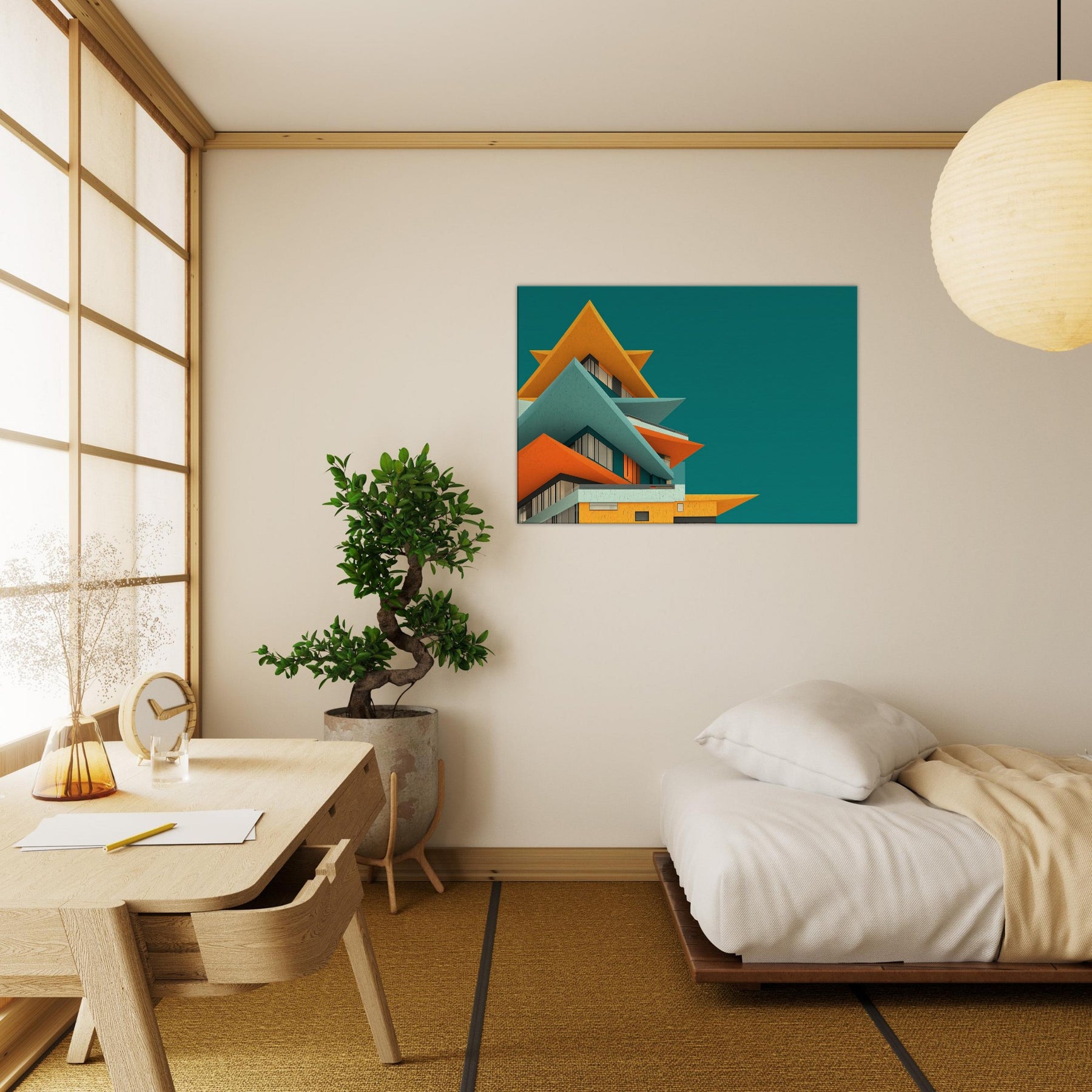 Step into a cityscape reimagined as a luminous dance of geometry. The Pagoda Roofline unfolds in bold teal and sunlit orange, its stacked planes catching light and casting kinetic shadows across your wall. This abstract composition blends architecture with emotion, a calm, outdoor spaces in a room mood that invites lingering gaze and quiet inspiration. Perfect above a sofa or desk, it adds a sculptural focal point, elevating both color and mood, while harmonizing with modern textures and daily rituals.