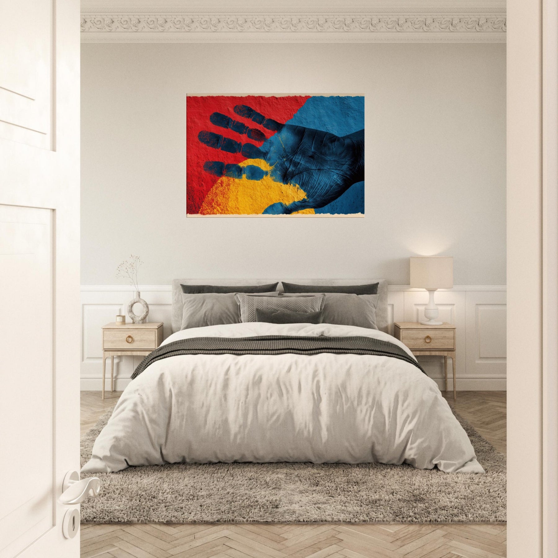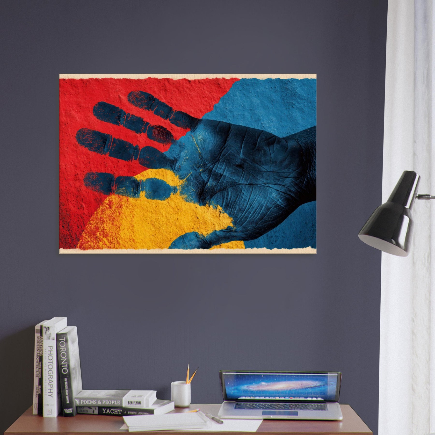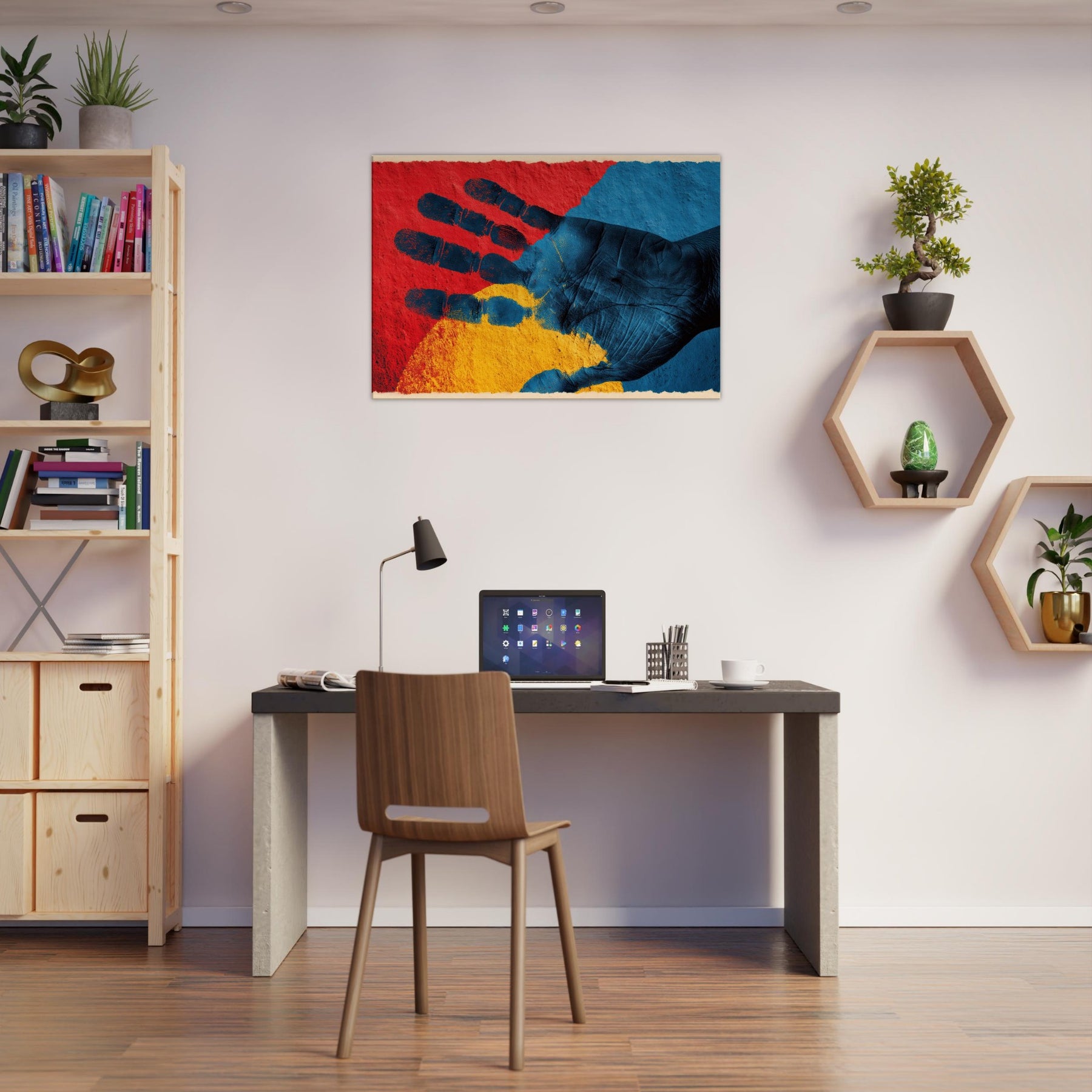 Let your space inhale with the quiet power of a Palmistry Hand rendered in abstract dreamlight. This piece threads crimson, cobalt, and sun kissed gold into a tactile palm, where texture and shadow invite touch and imagination. It radiates a mystical mood that warms a living room or study, turning walls into a portal for intuition and calm. With its poetic rhythm and sensorial depth, the artwork breathes personality into any corner, making everyday moments feel generously dramatic.