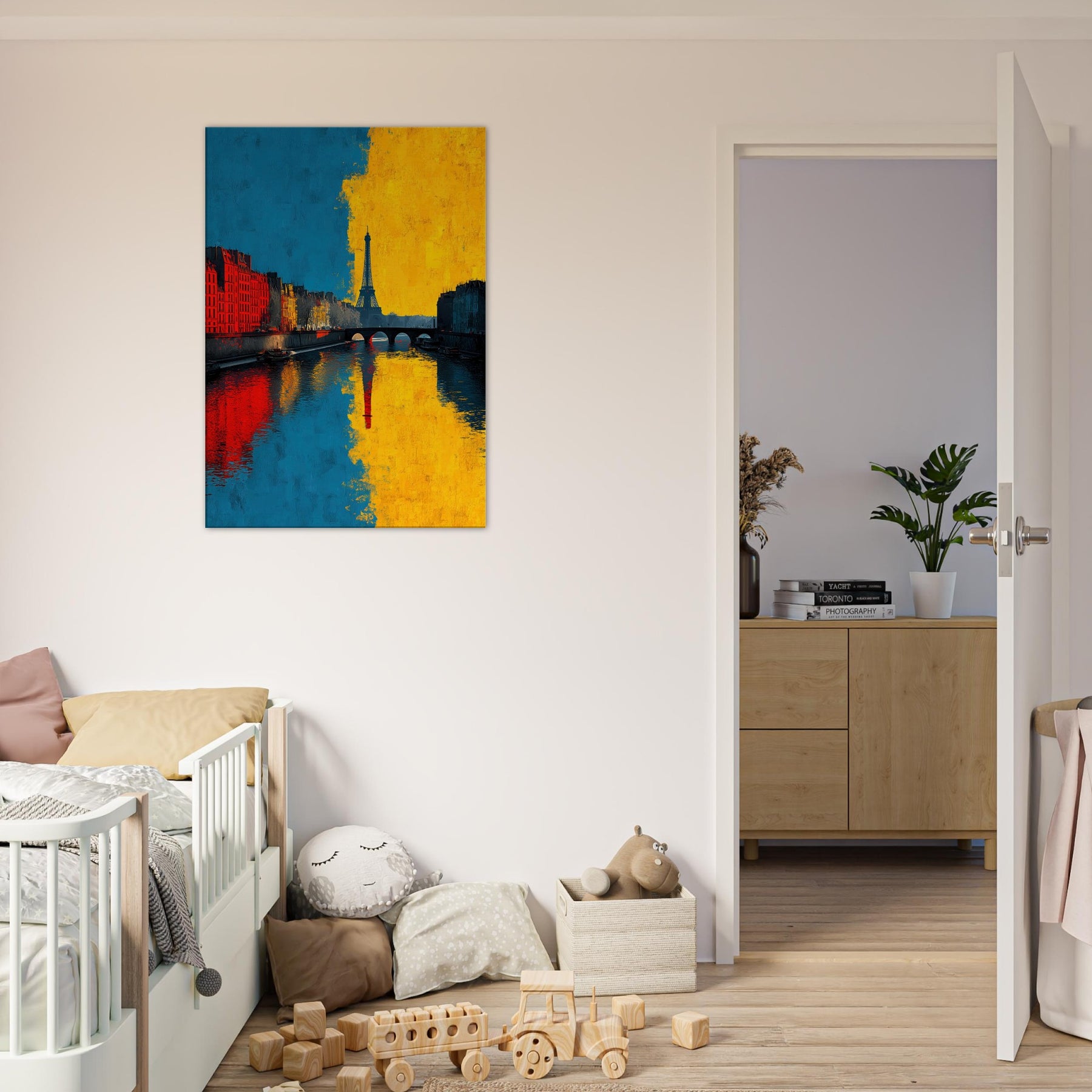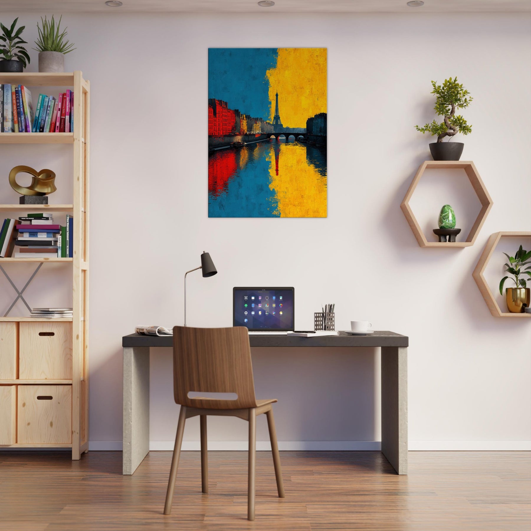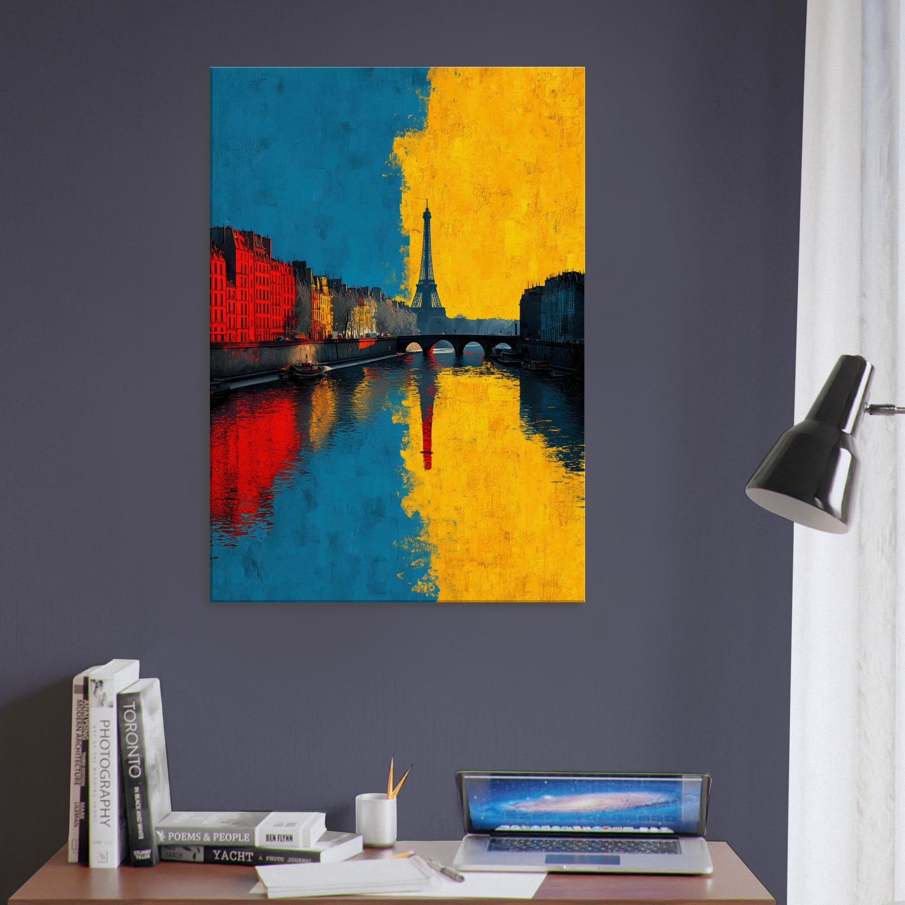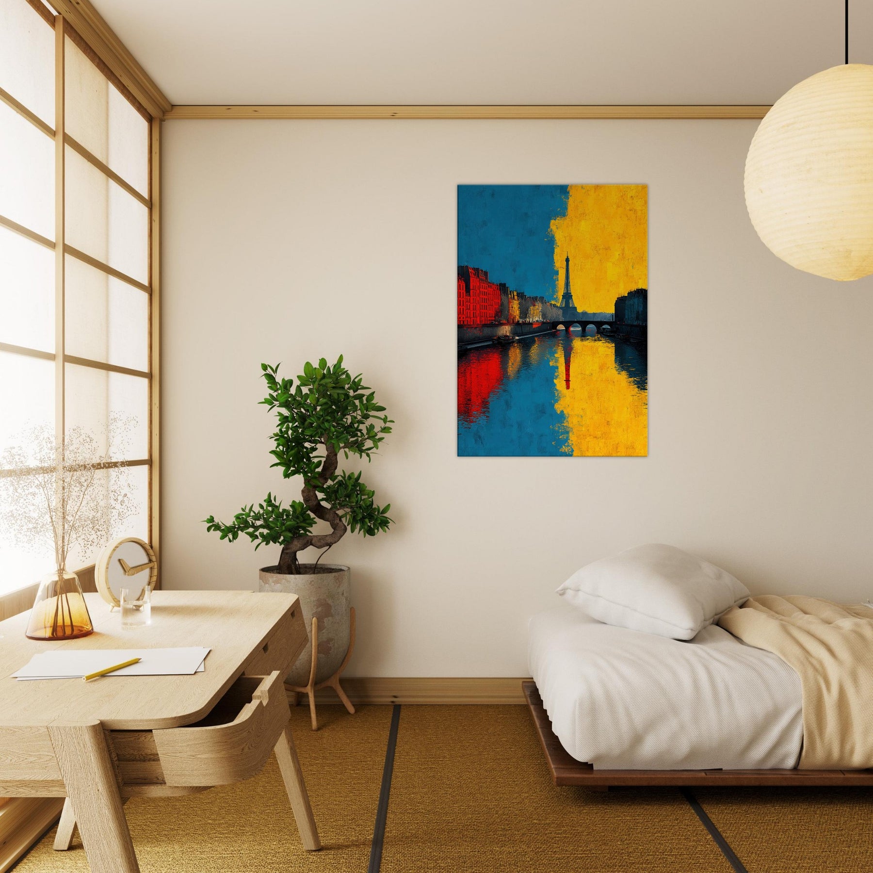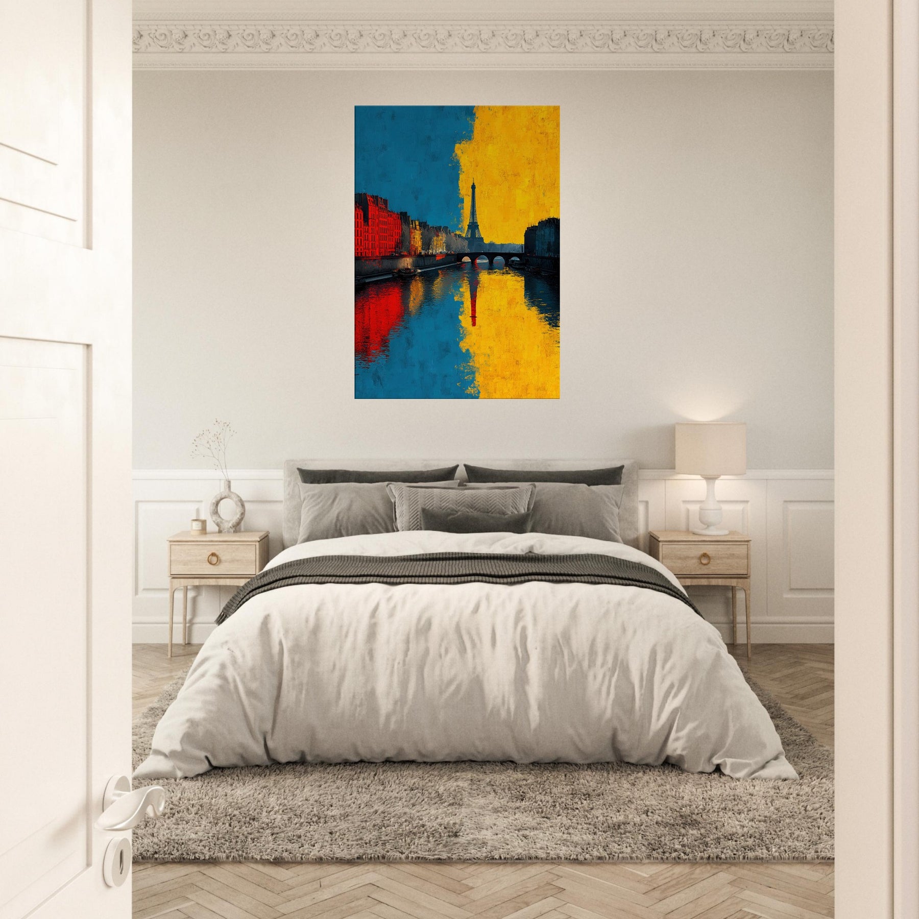 Immerse your space in a Paris dreamscape where night and day collide in bold color. This abstract city scene washes the Seine in cobalt, red, and sunlit gold, with the Eiffel Tower rising as a quiet beacon. The layered texture and luminous reflections invite lingering attention, turning walls into a window where conversations begin and moods shift from intimate dusk to electric midday. Perfect for a living room or study, it lends drama, warmth, and a chic, urbane rhythm to any contemporary interior.